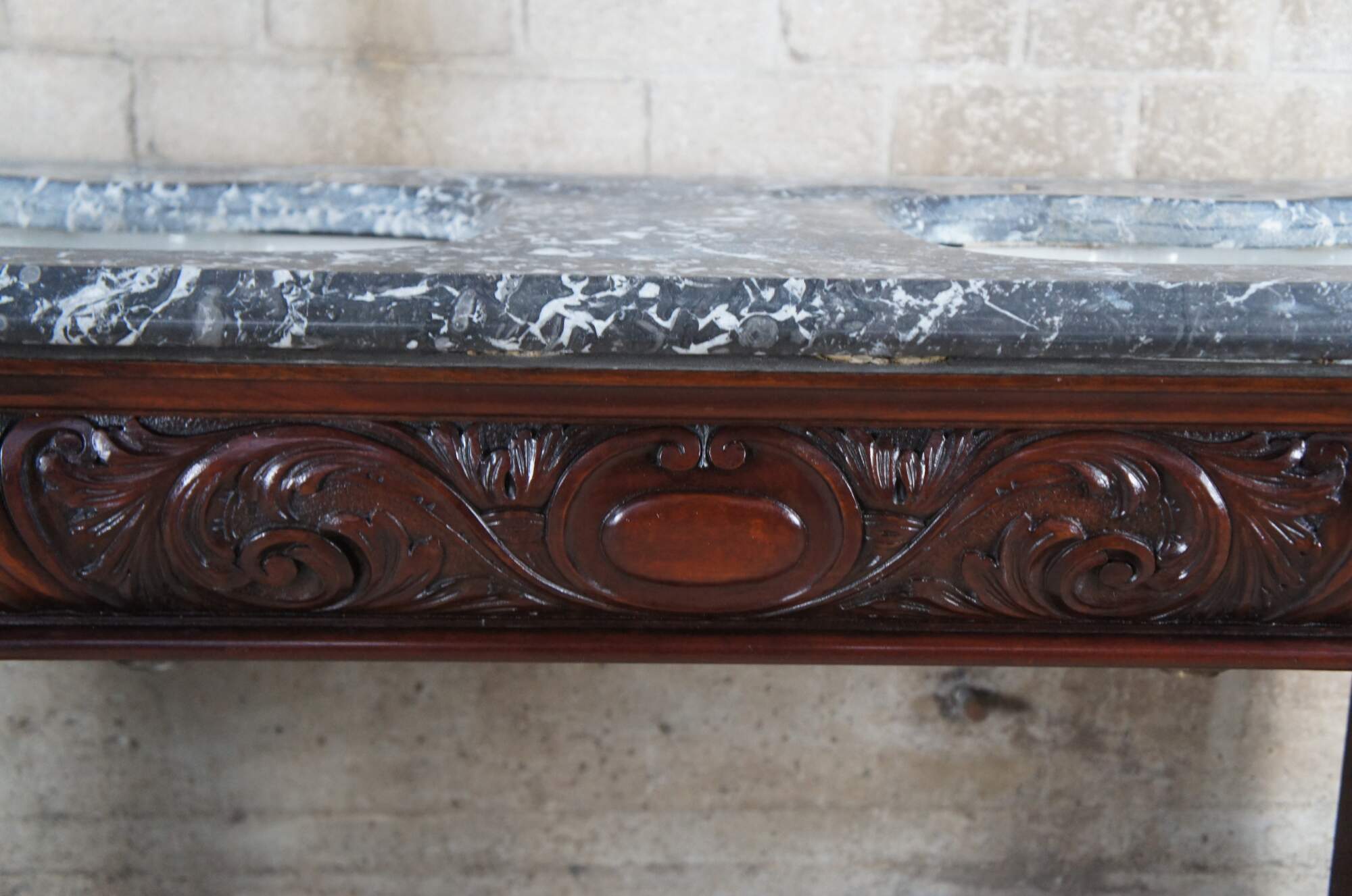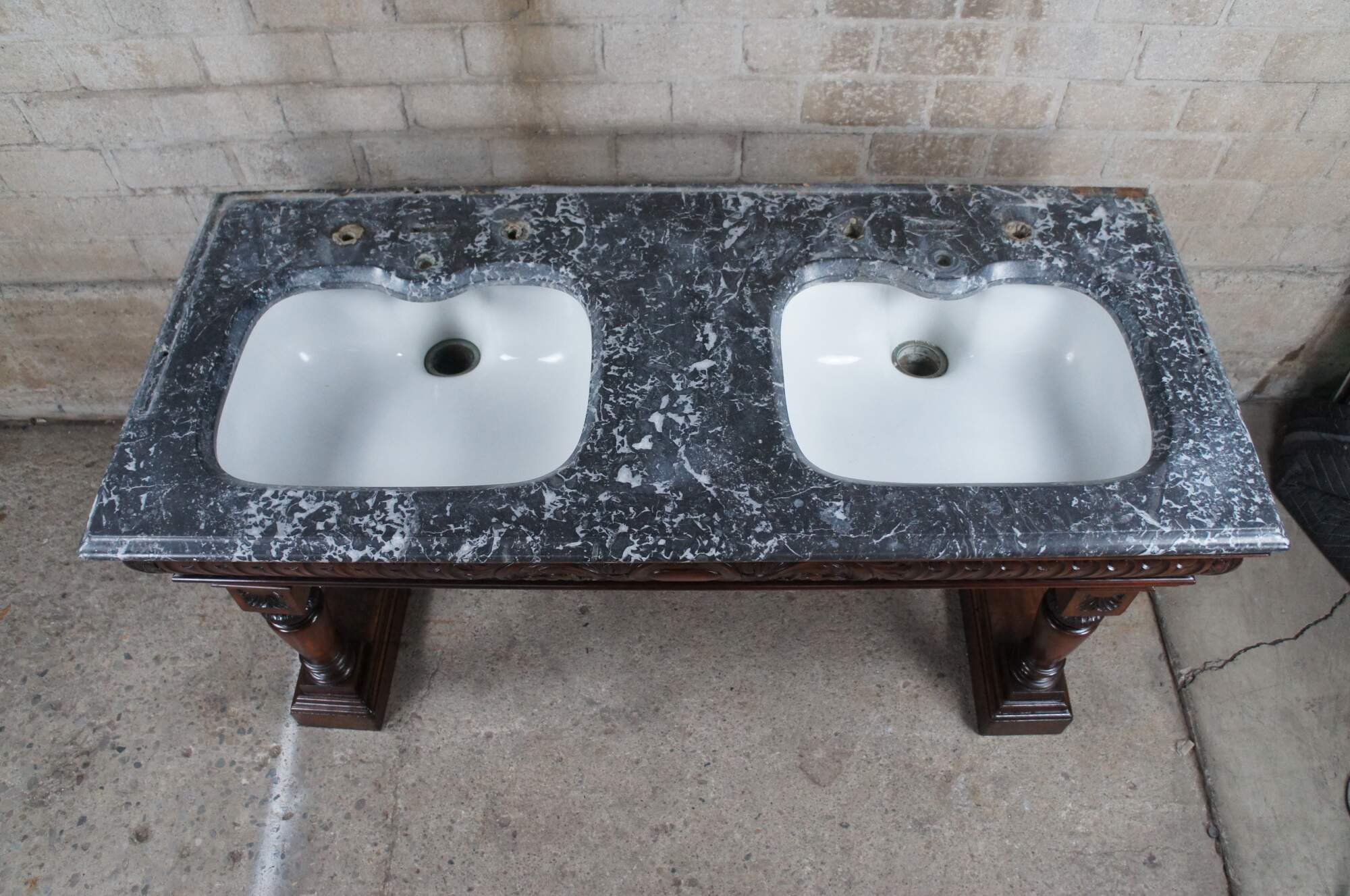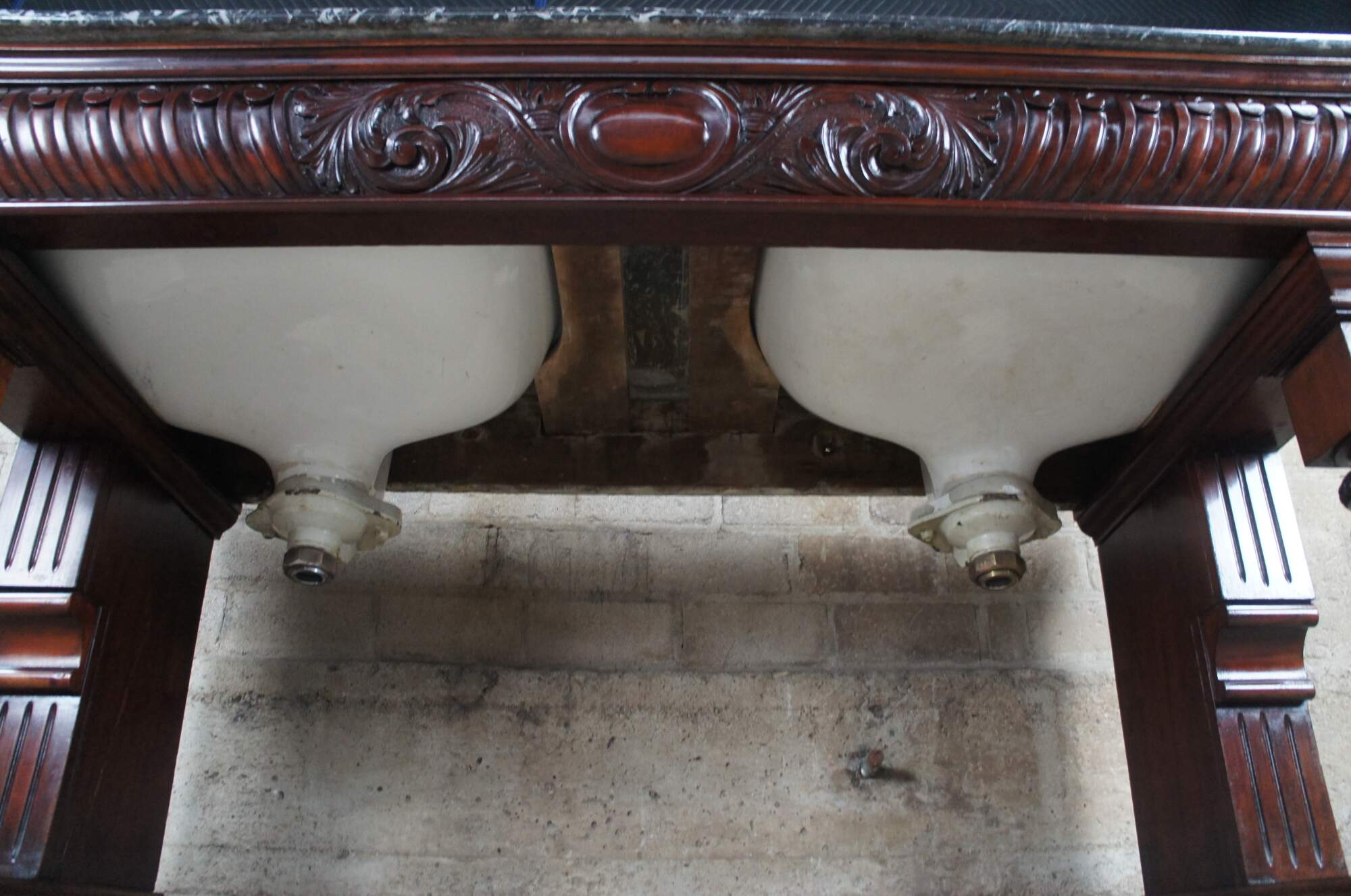 An exquisite English Victorian Era bathroom double vanity. Features a gray and white vein marble top with scallopped soap holders and two porcelain sink basins by John Shanks (Britain). The spectacular mahogany base features a central carved medallion with "S" scrolled accents and ornate gadrooning throughout. The corners are acanthus carved and poised over square blocked, carved baluster pillars. The pillars are set on a plinth base with fluted rear support and shapely spandrels.