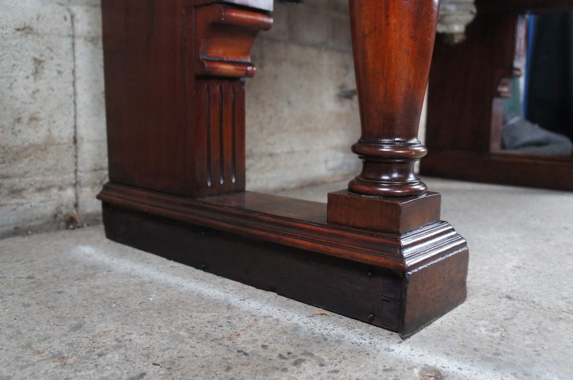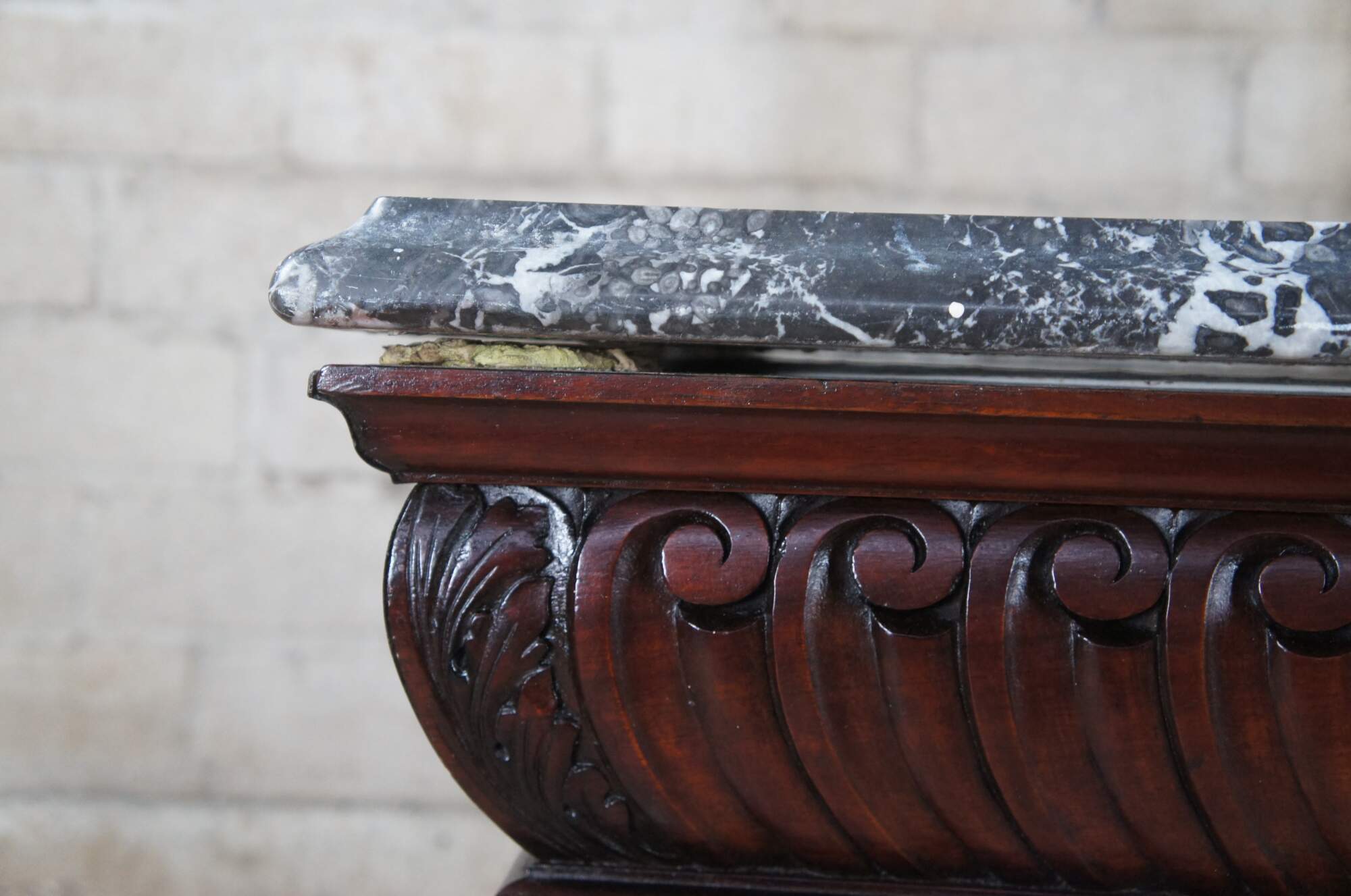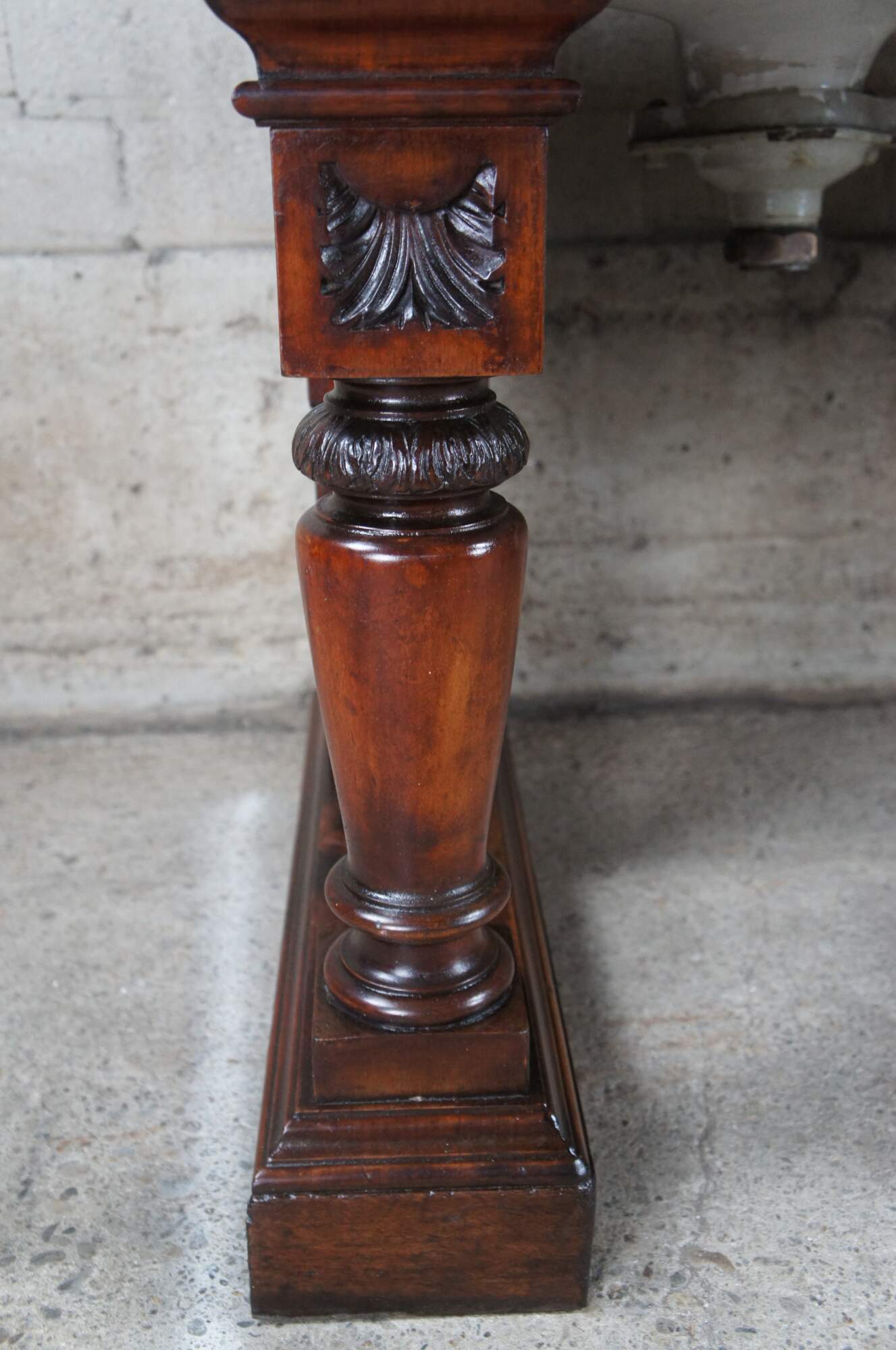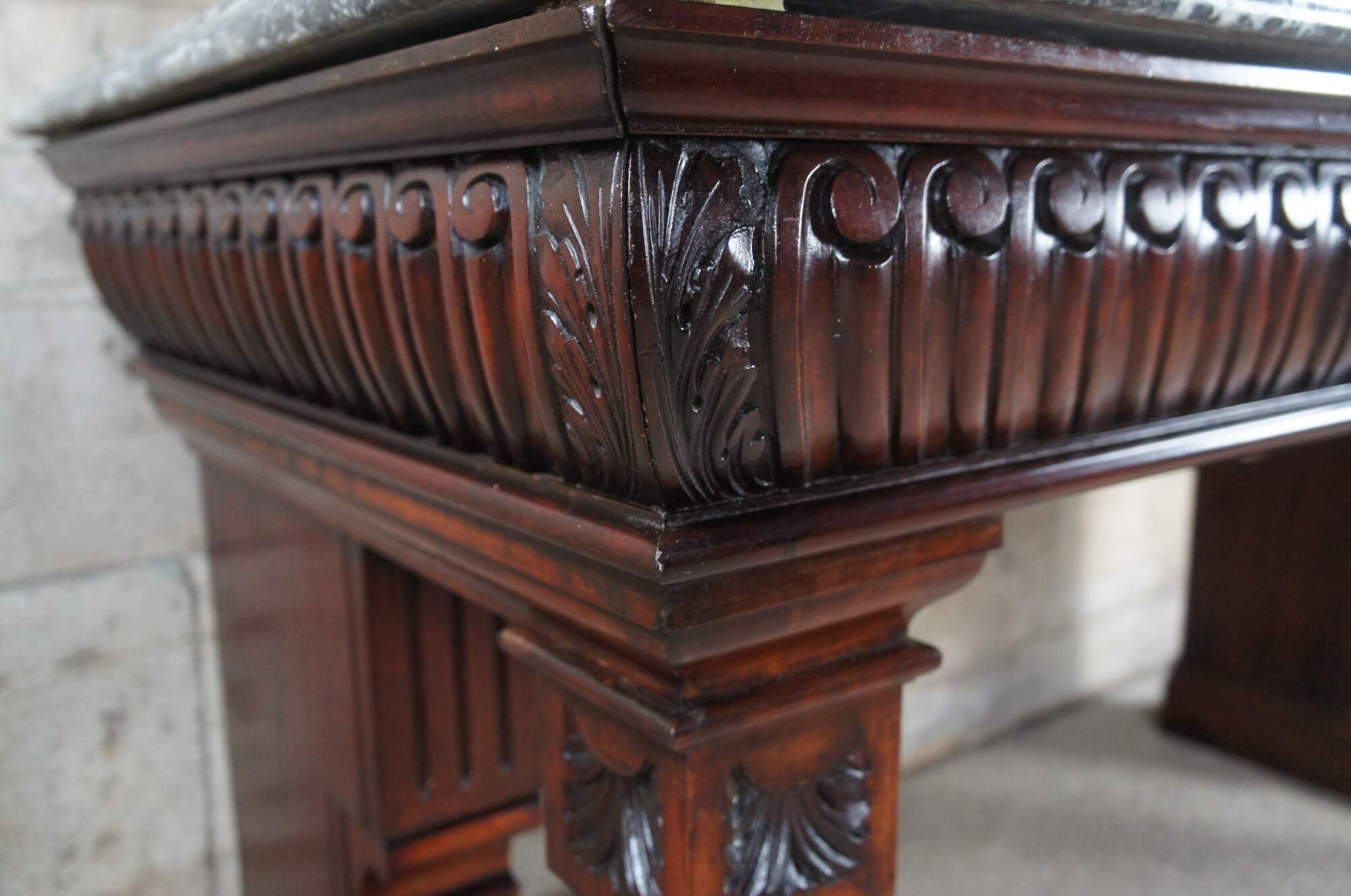 An exquisite English Victorian Era bathroom double vanity. Features a gray and white vein marble top with scallopped soap holders and two porcelain sink basins by John Shanks (Britain). The spectacular mahogany base features a central carved medallion with "S" scrolled accents and ornate gadrooning throughout. The corners are acanthus carved and poised over square blocked, carved baluster pillars. The pillars are set on a plinth base with fluted rear support and shapely spandrels.