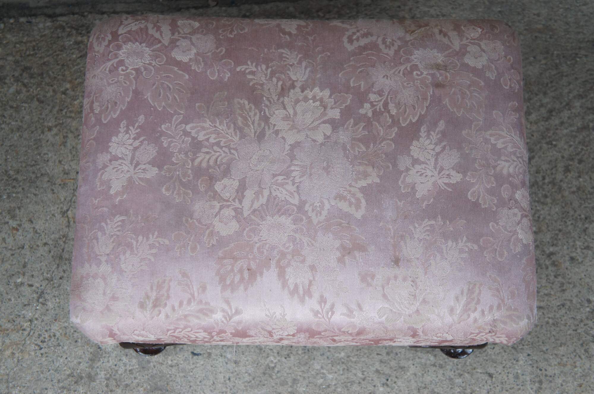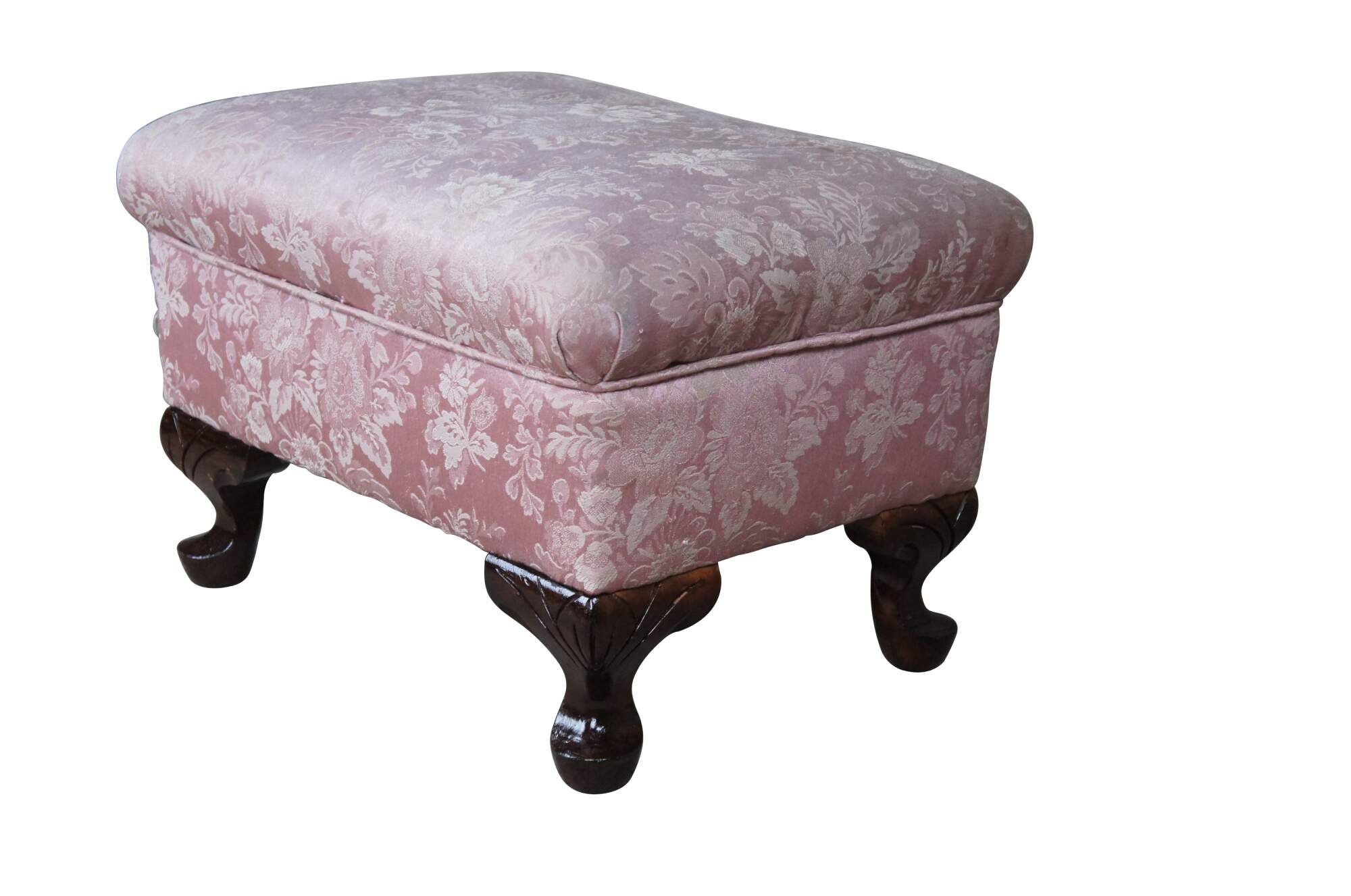 Mid 20th Century footstool with floral upholstered seat. Features a rectangular form with short carved cabriole legs.