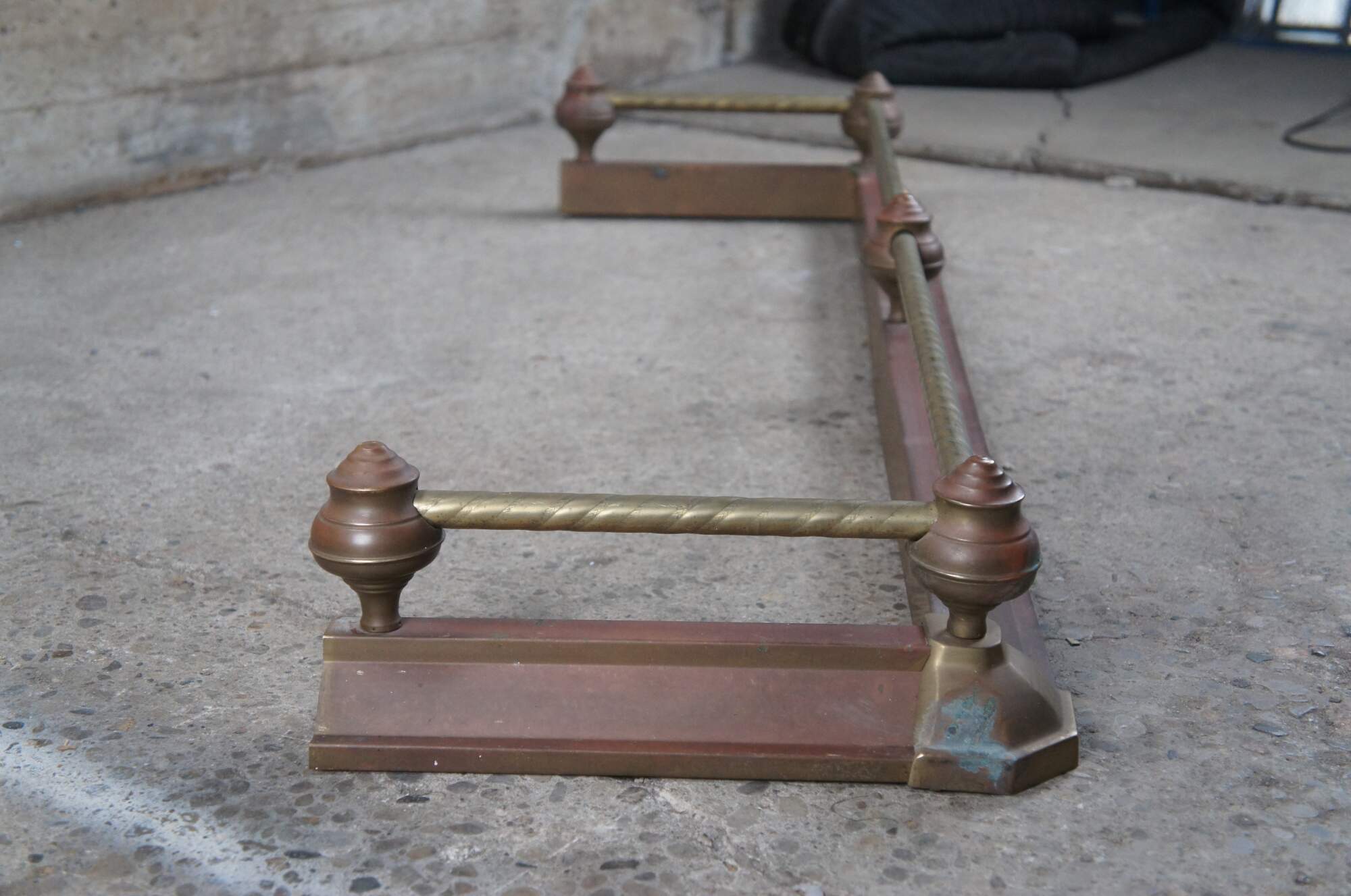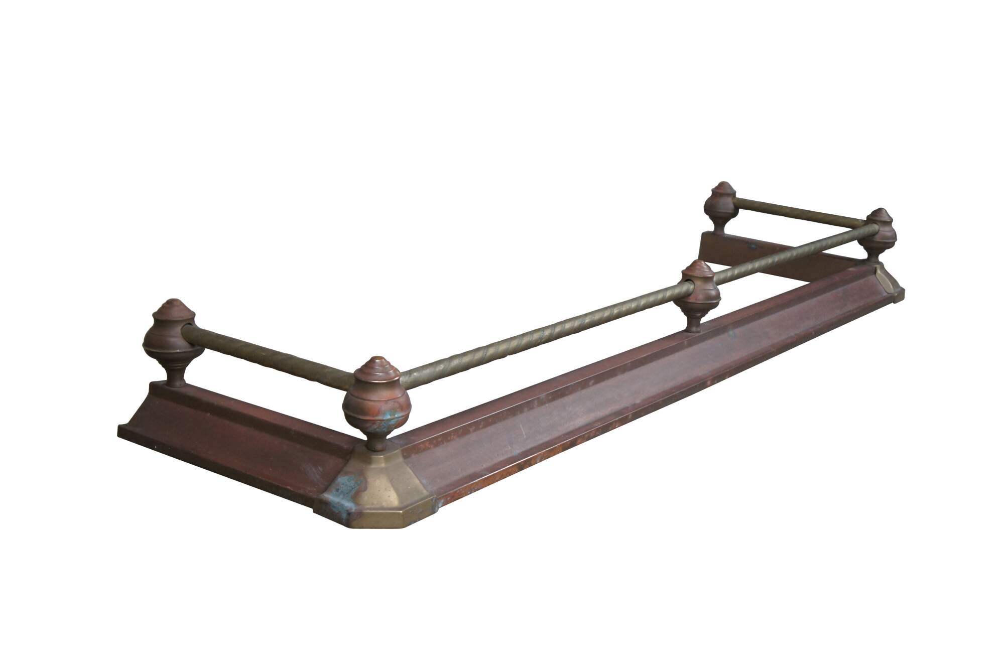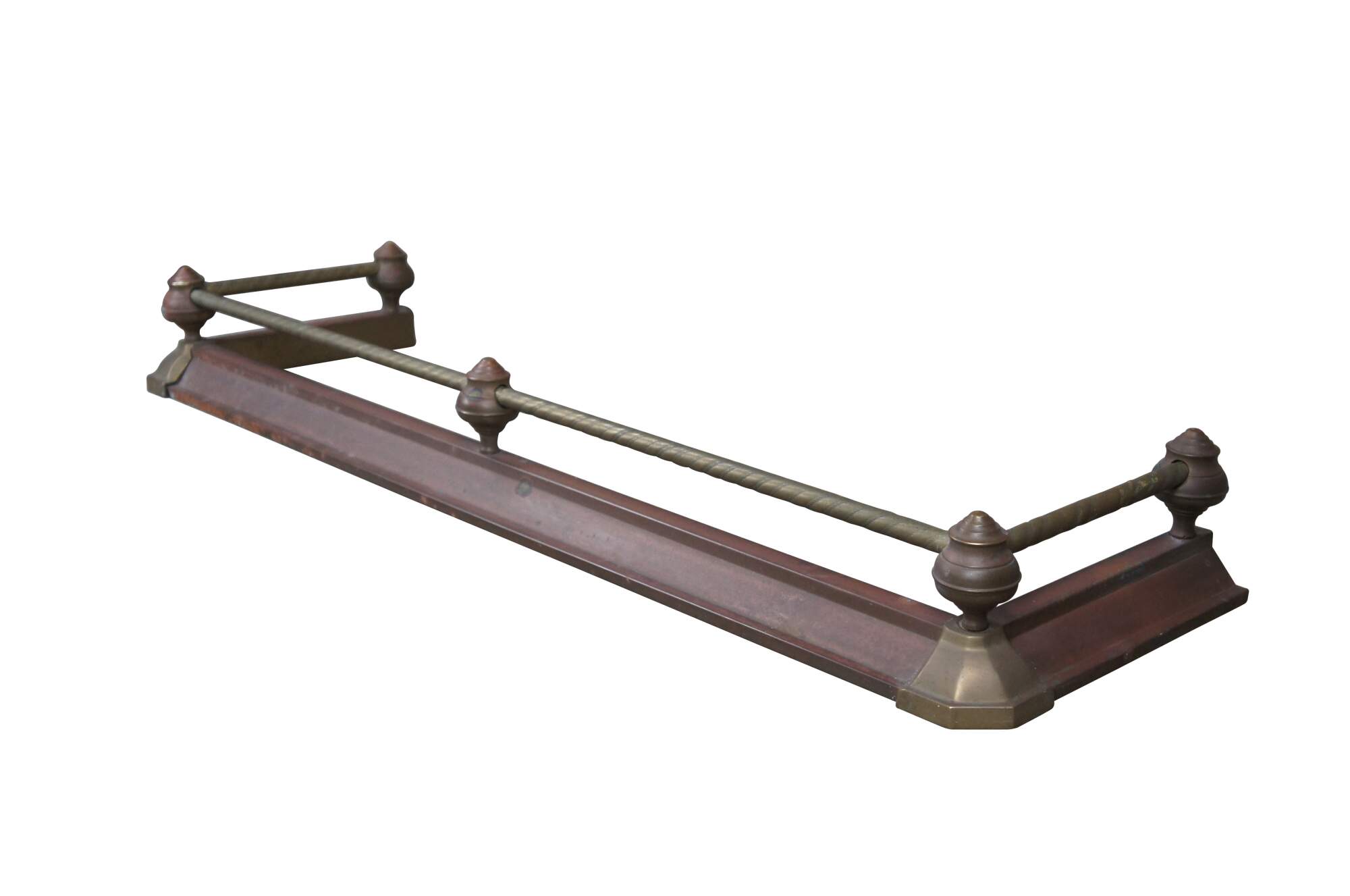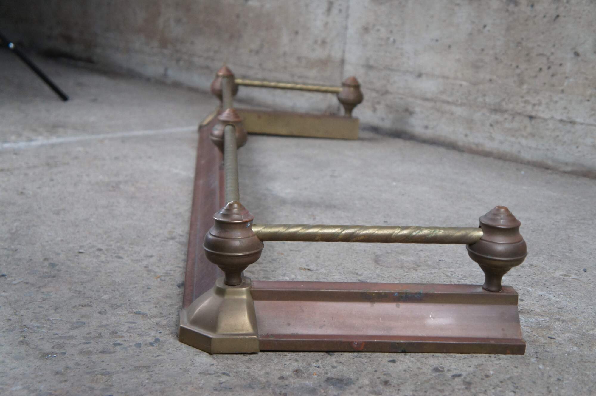 Vintage Decorative Crafts Inc brass fireplace fender. Styled in Victorian manner with ball and stick styling, a rope twisted rod and copper patina.