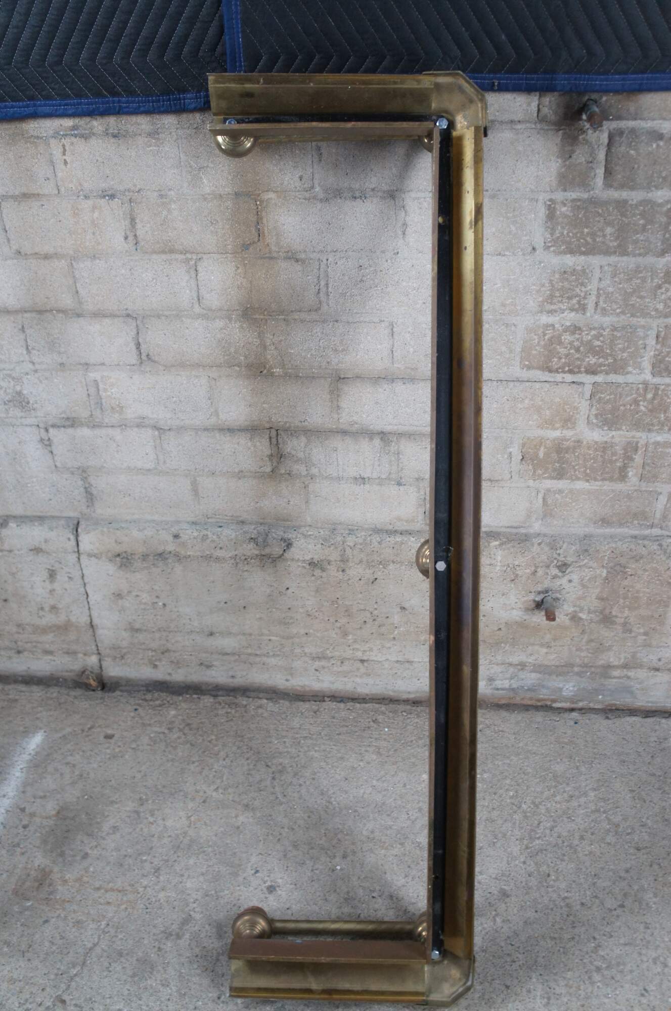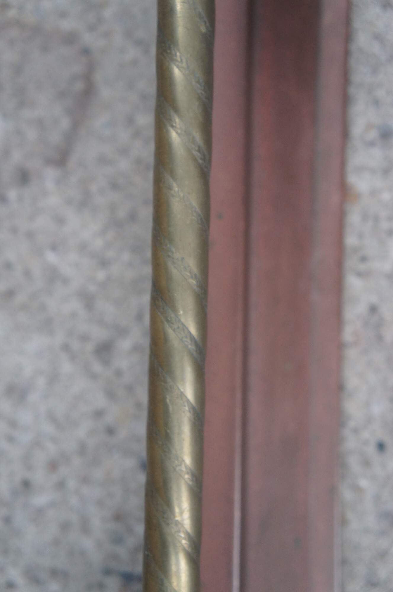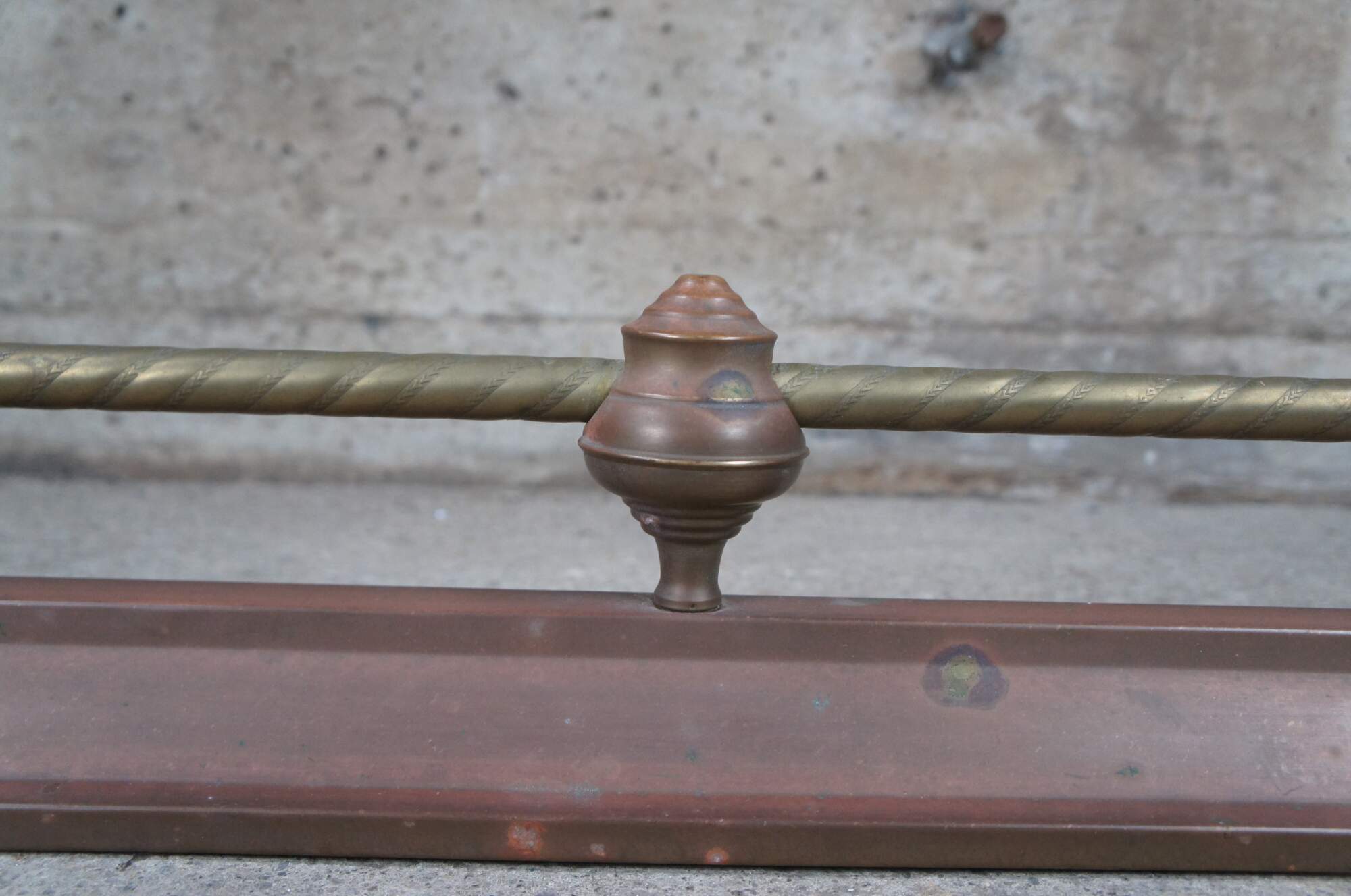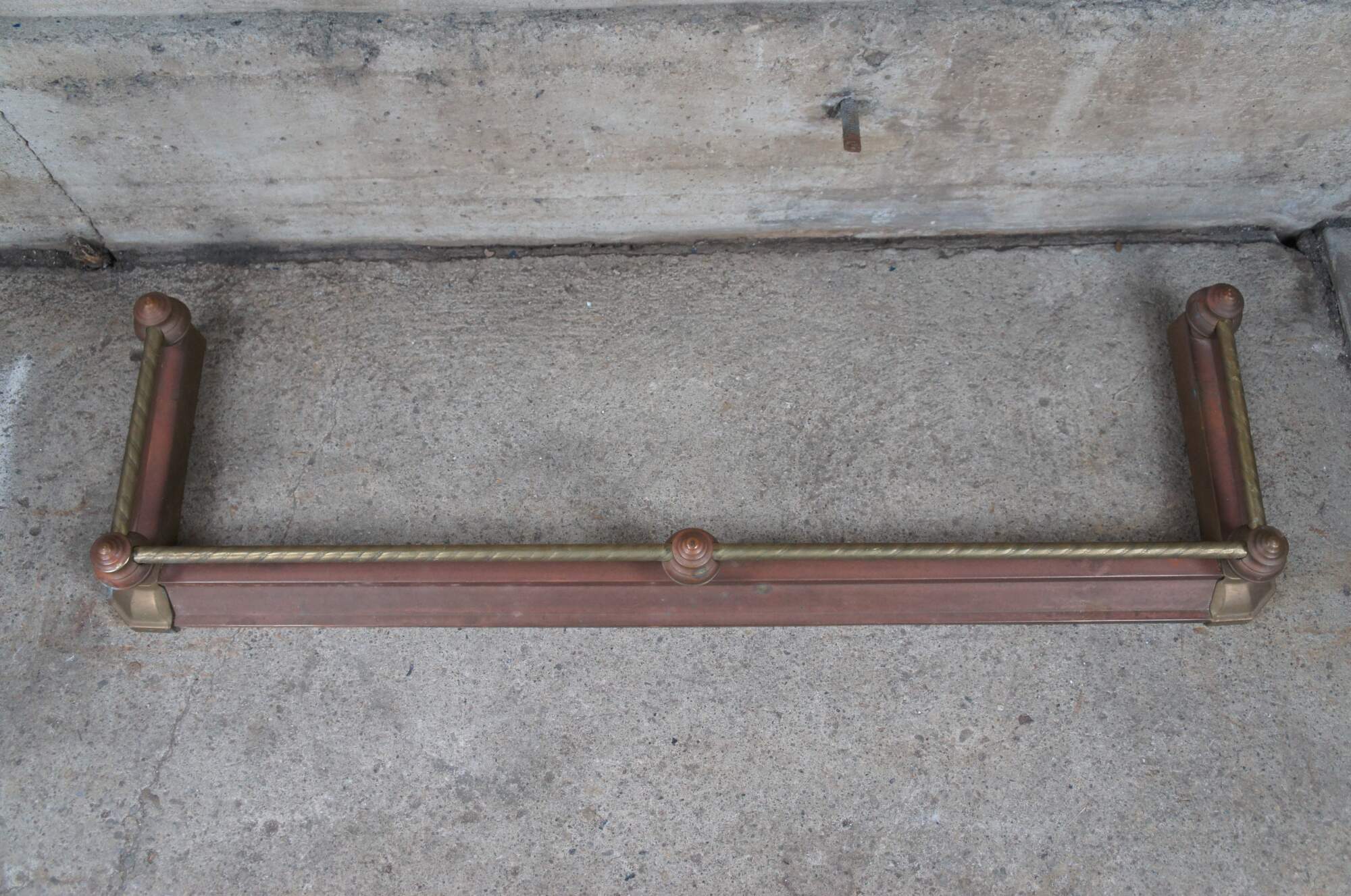 Vintage Decorative Crafts Inc brass fireplace fender. Styled in Victorian manner with ball and stick styling, a rope twisted rod and copper patina.