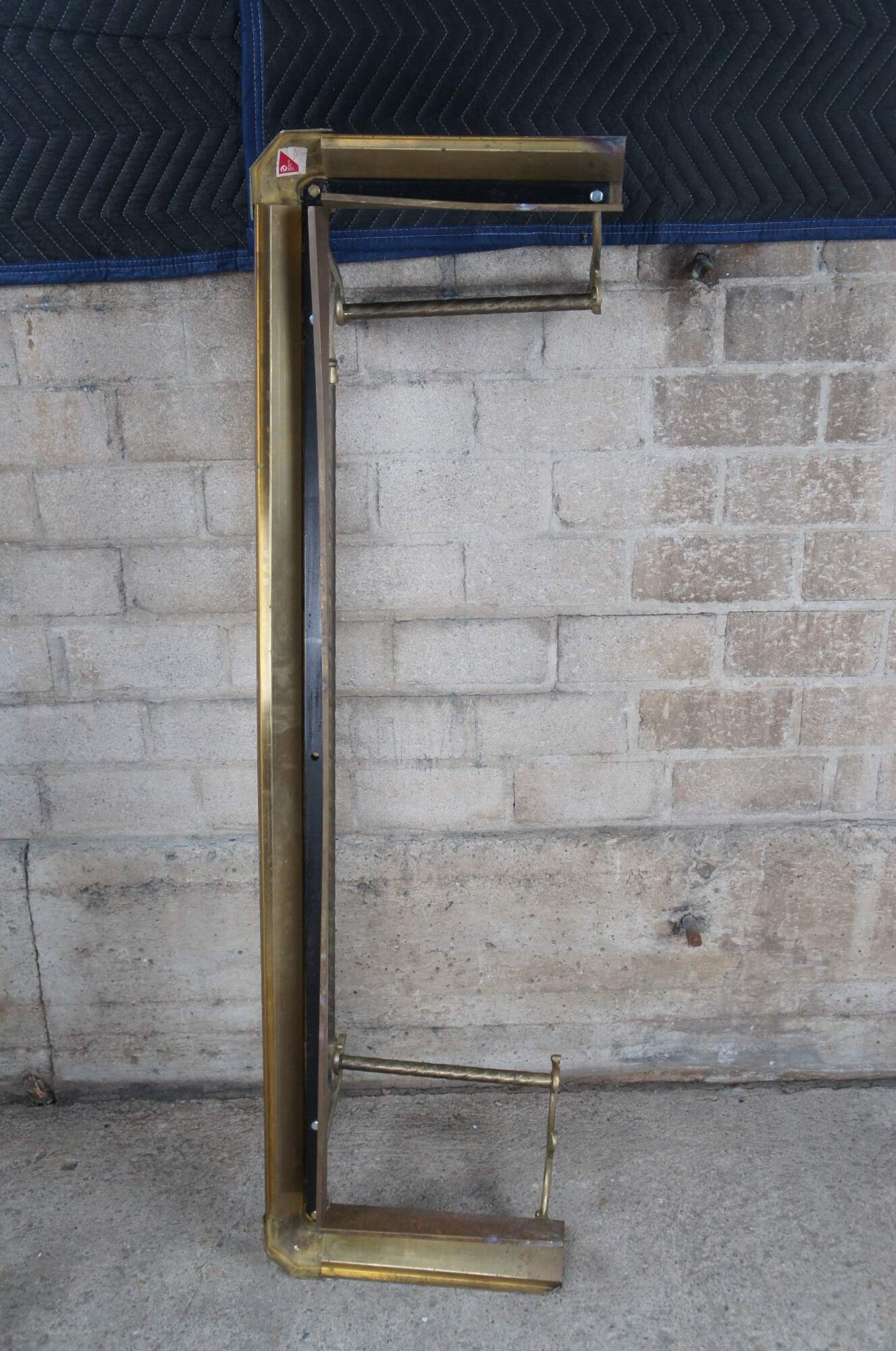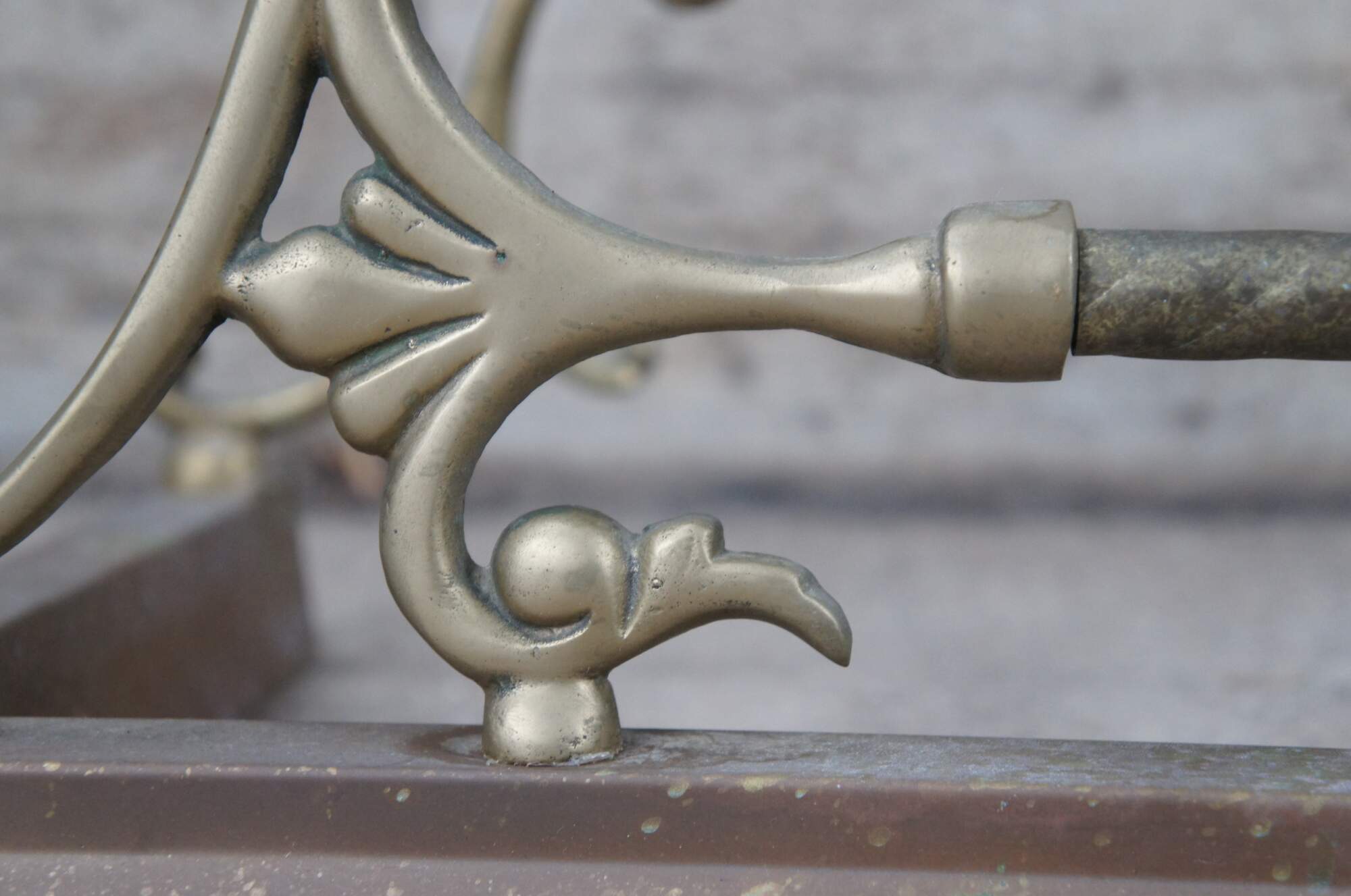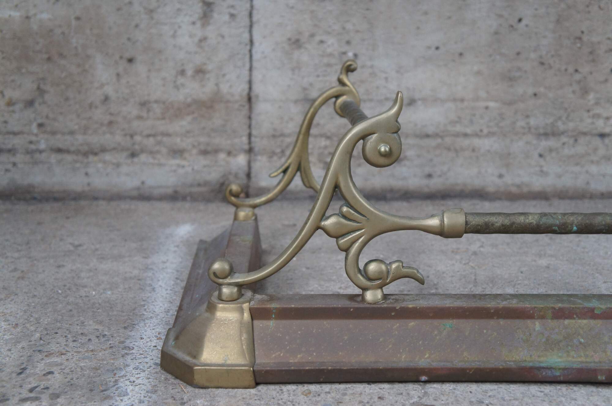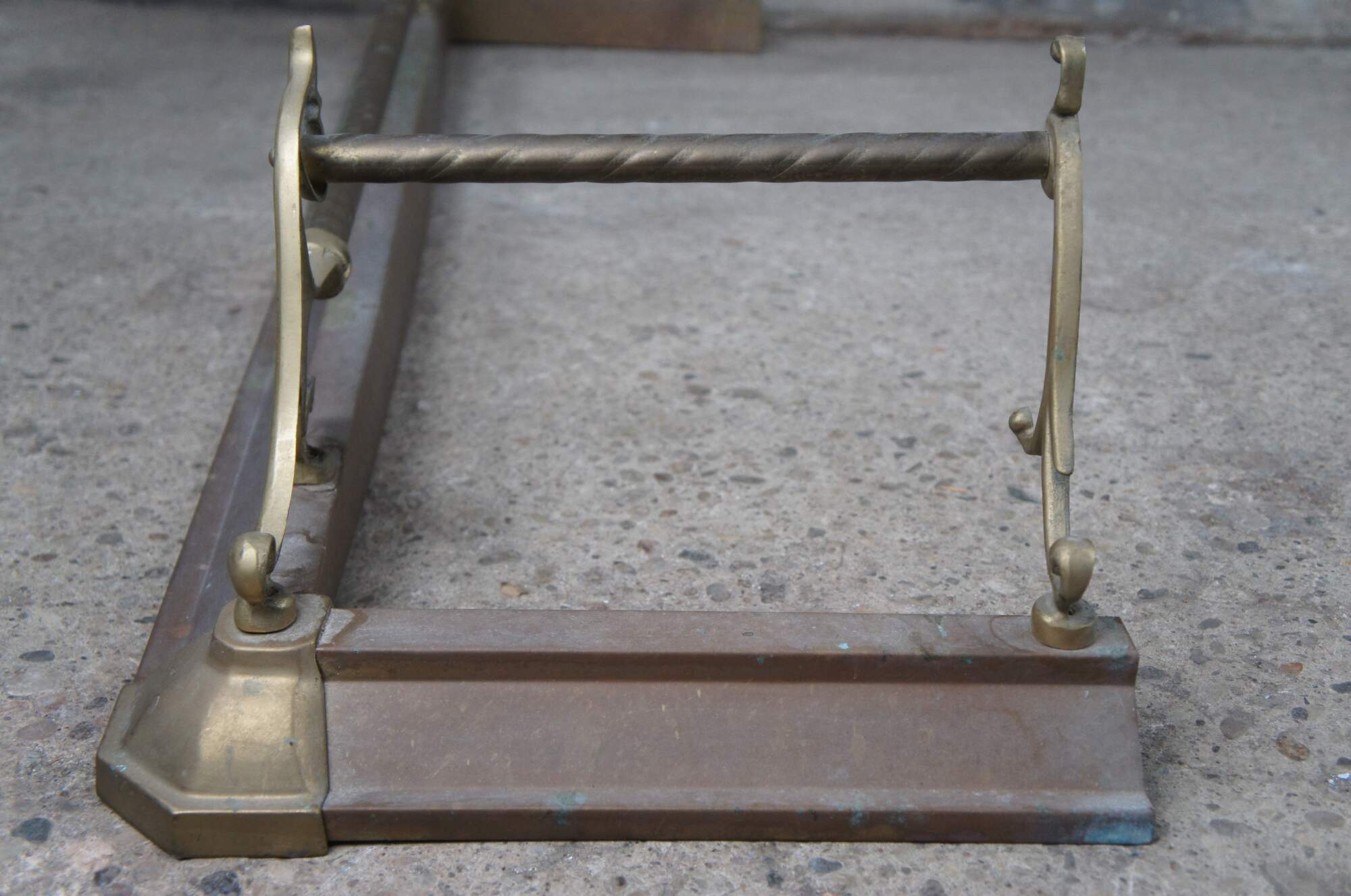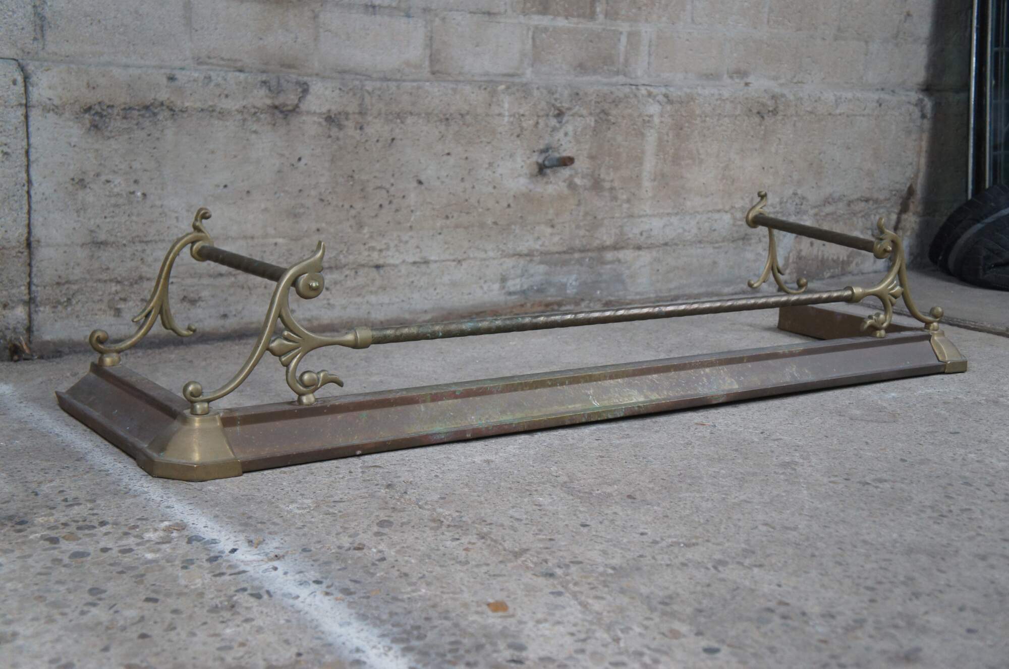 Vintage Decorative Crafts Inc brass fireplace fender. Styled in Victorian manner with ornated S scroll supports with rope twist rods and Fleur De Lis accents.