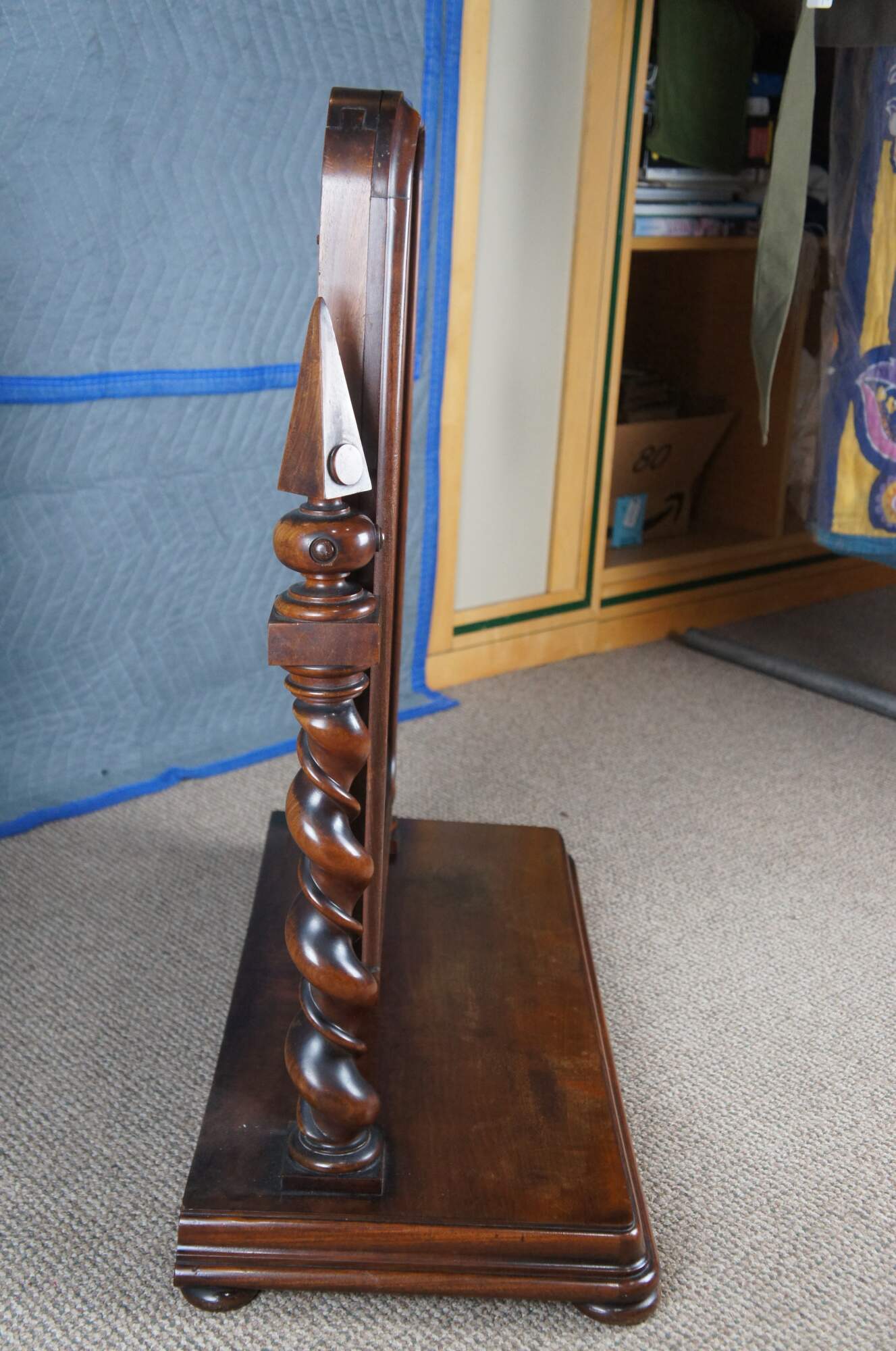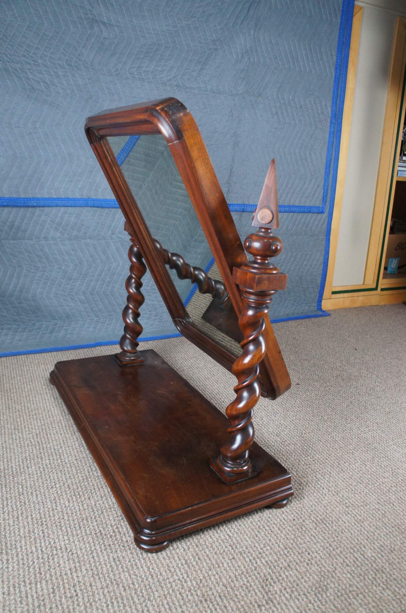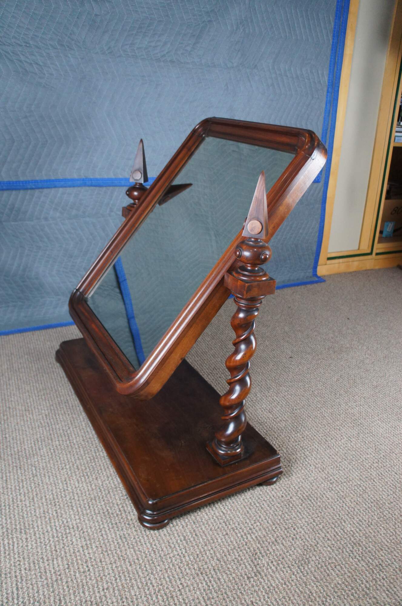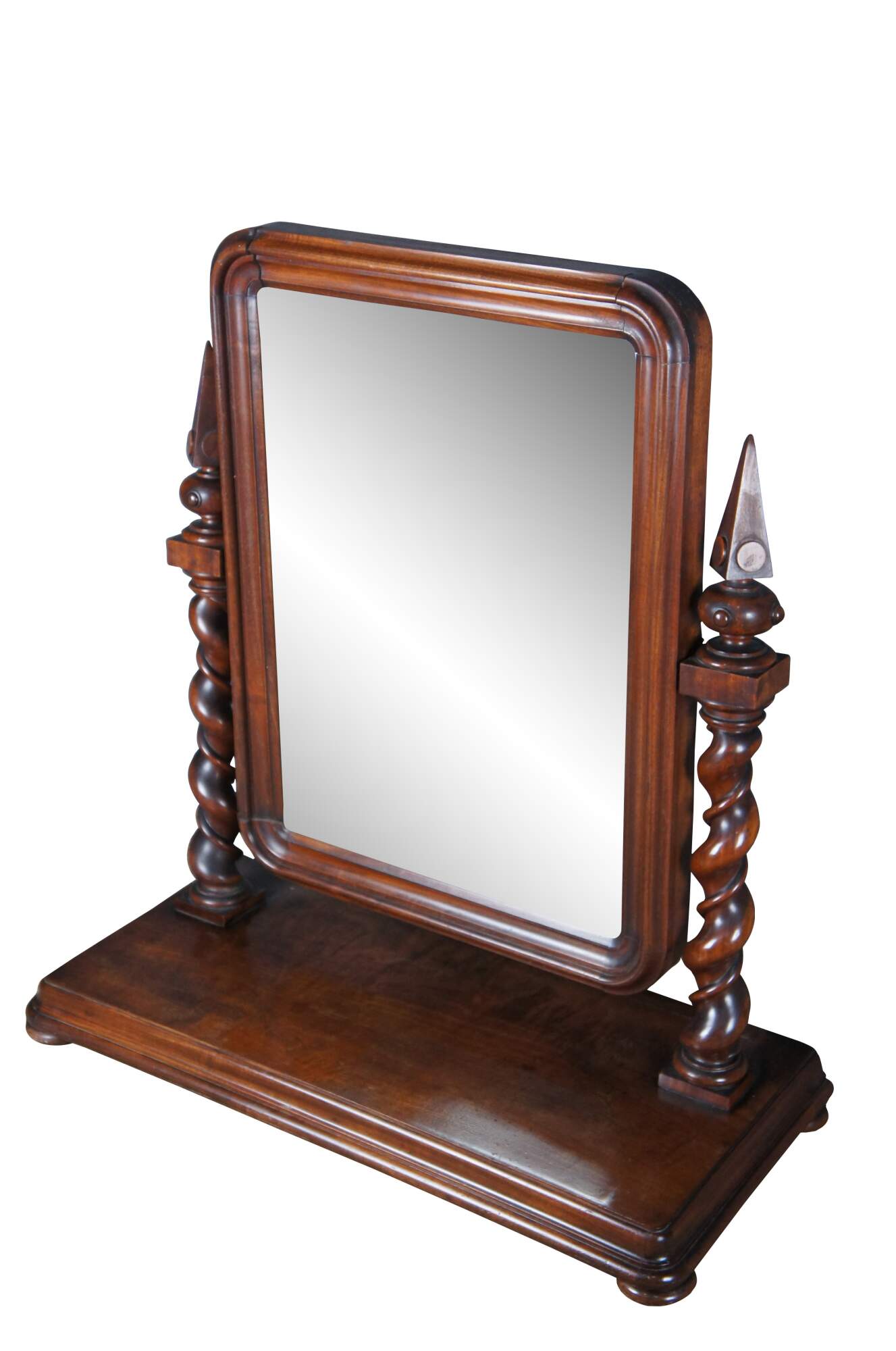 Impressive antique 19th century (circa 1880s) English Empire gentleman's dressing mirror. Made from mahogany with a beveled wooden frame supported by exceptional barley twist uprights with pyramid shaped finials. The rectangular base is raised over bun feet. Mirror tilts for ease of use.