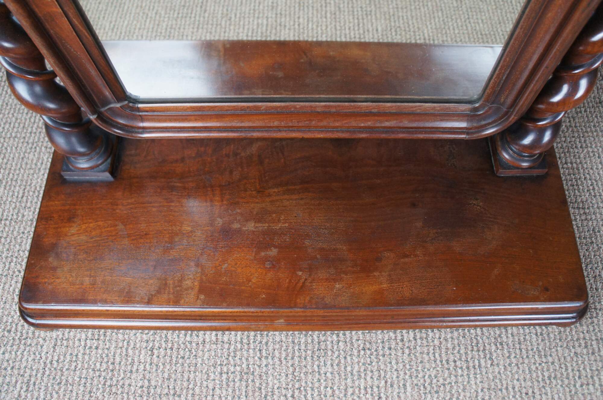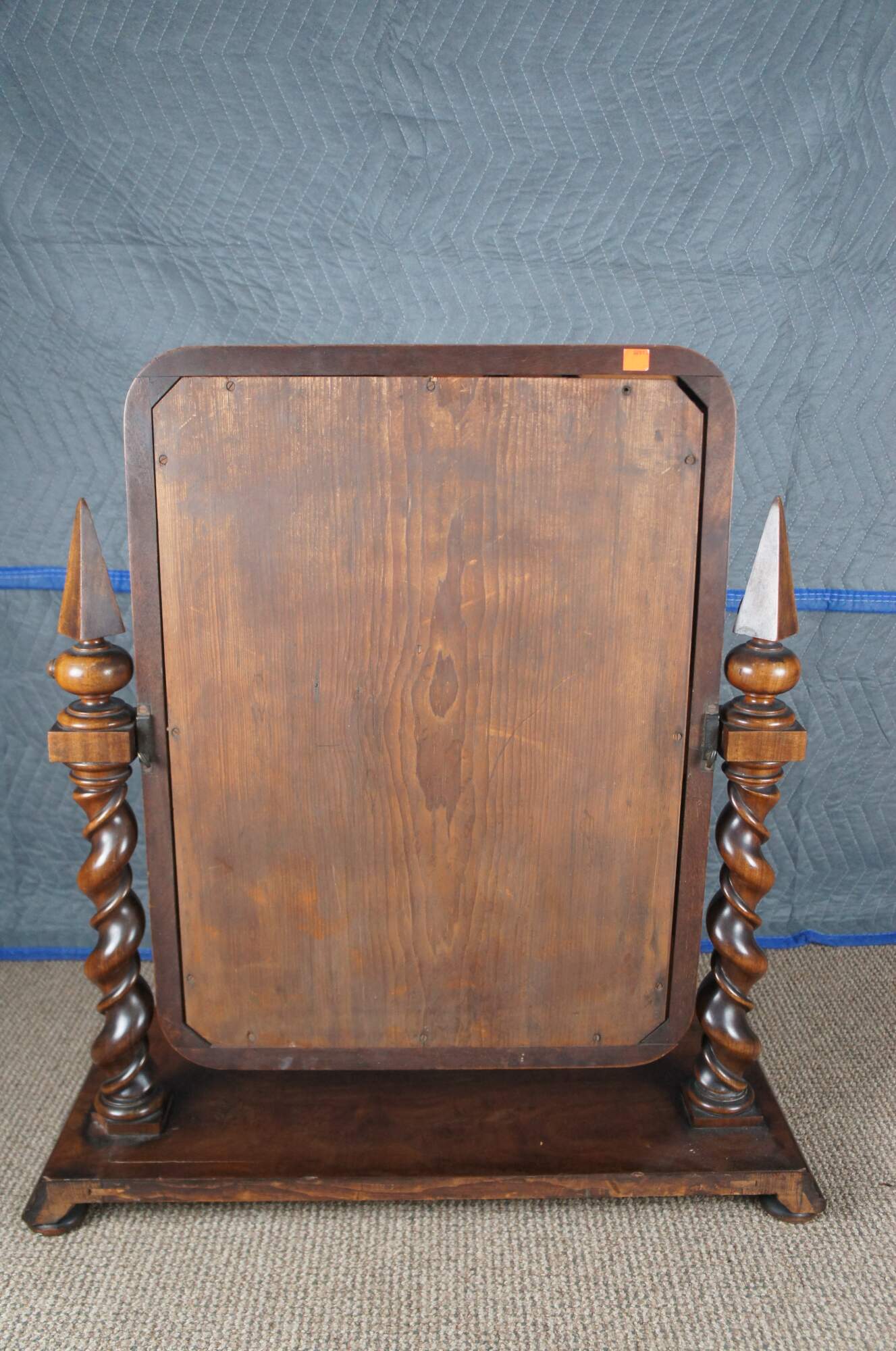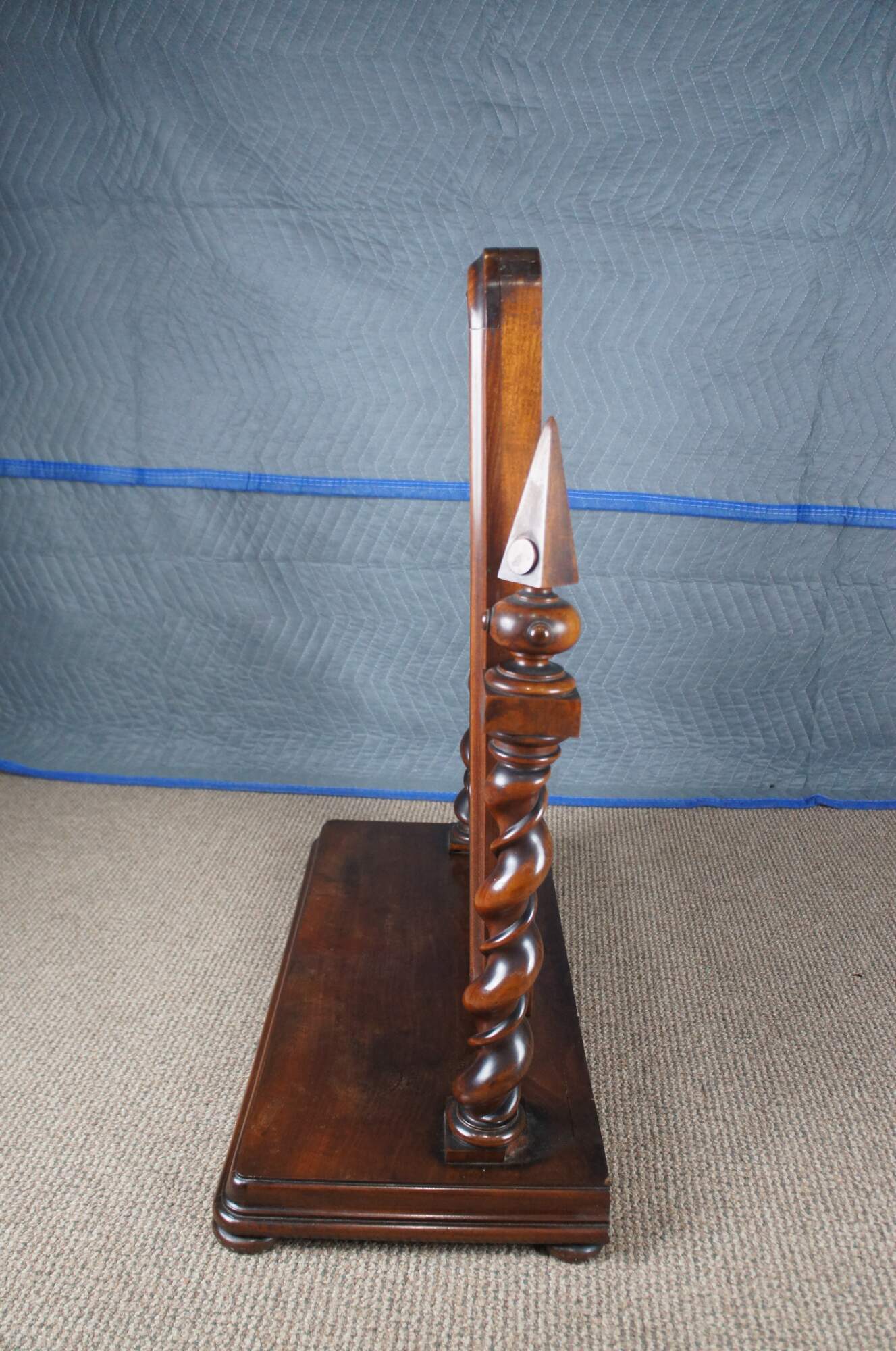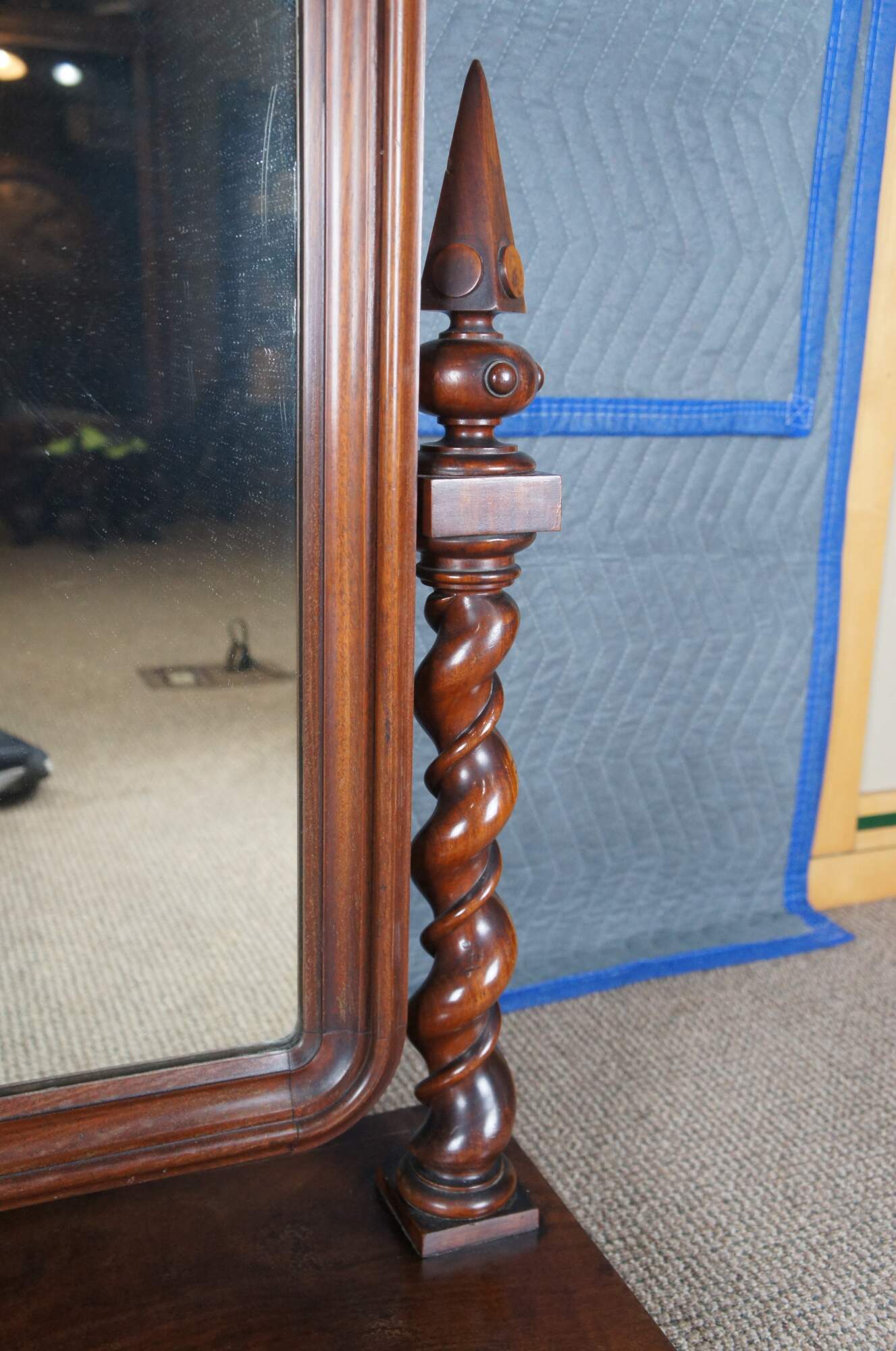 Impressive antique 19th century (circa 1880s) English Empire gentleman's dressing mirror. Made from mahogany with a beveled wooden frame supported by exceptional barley twist uprights with pyramid shaped finials. The rectangular base is raised over bun feet. Mirror tilts for ease of use.