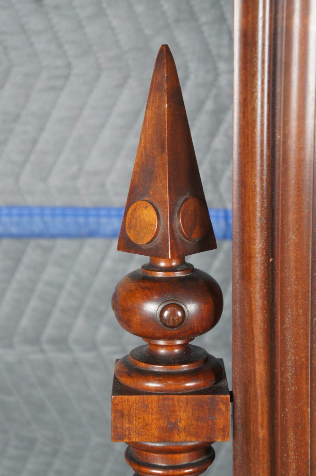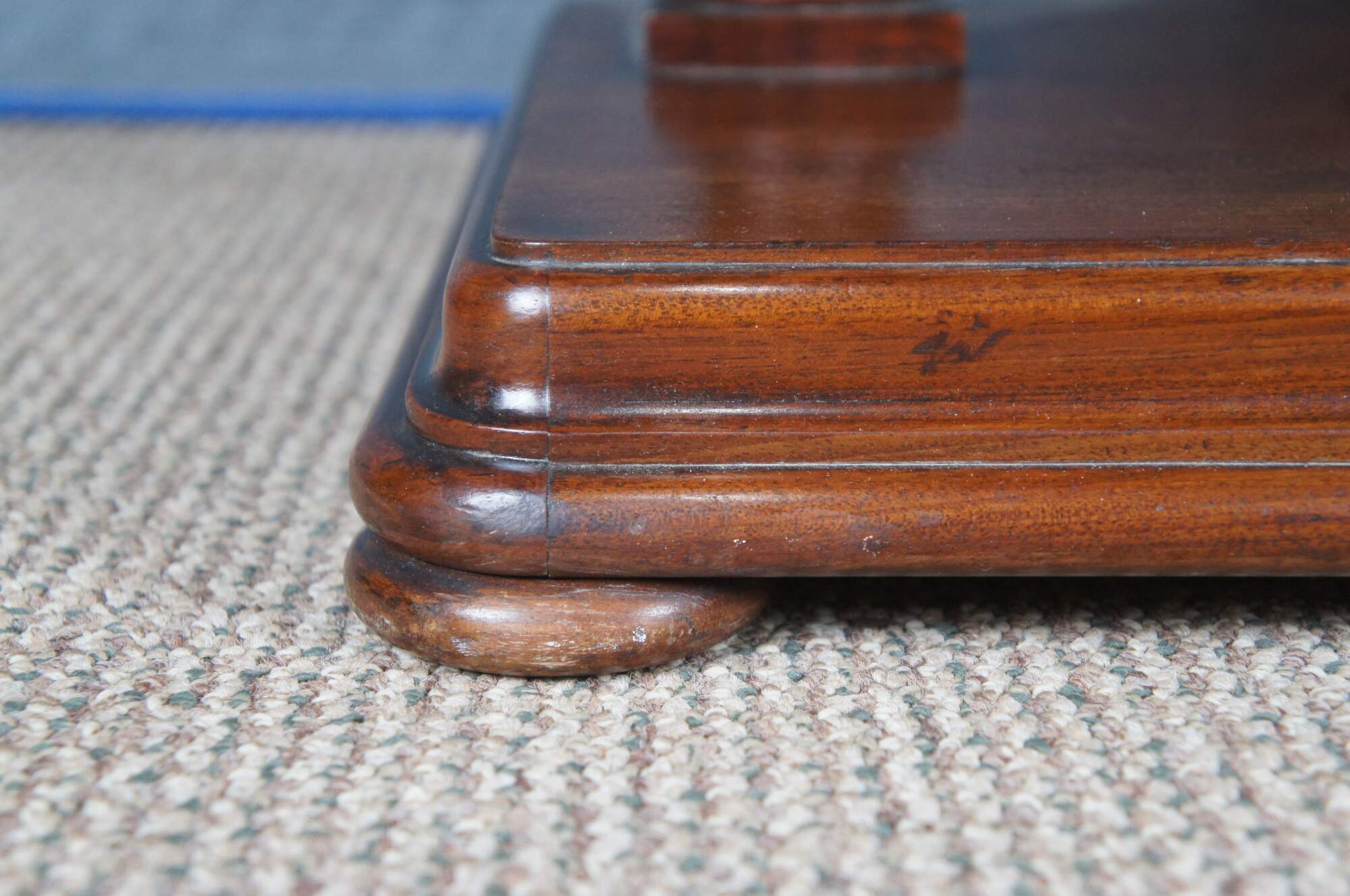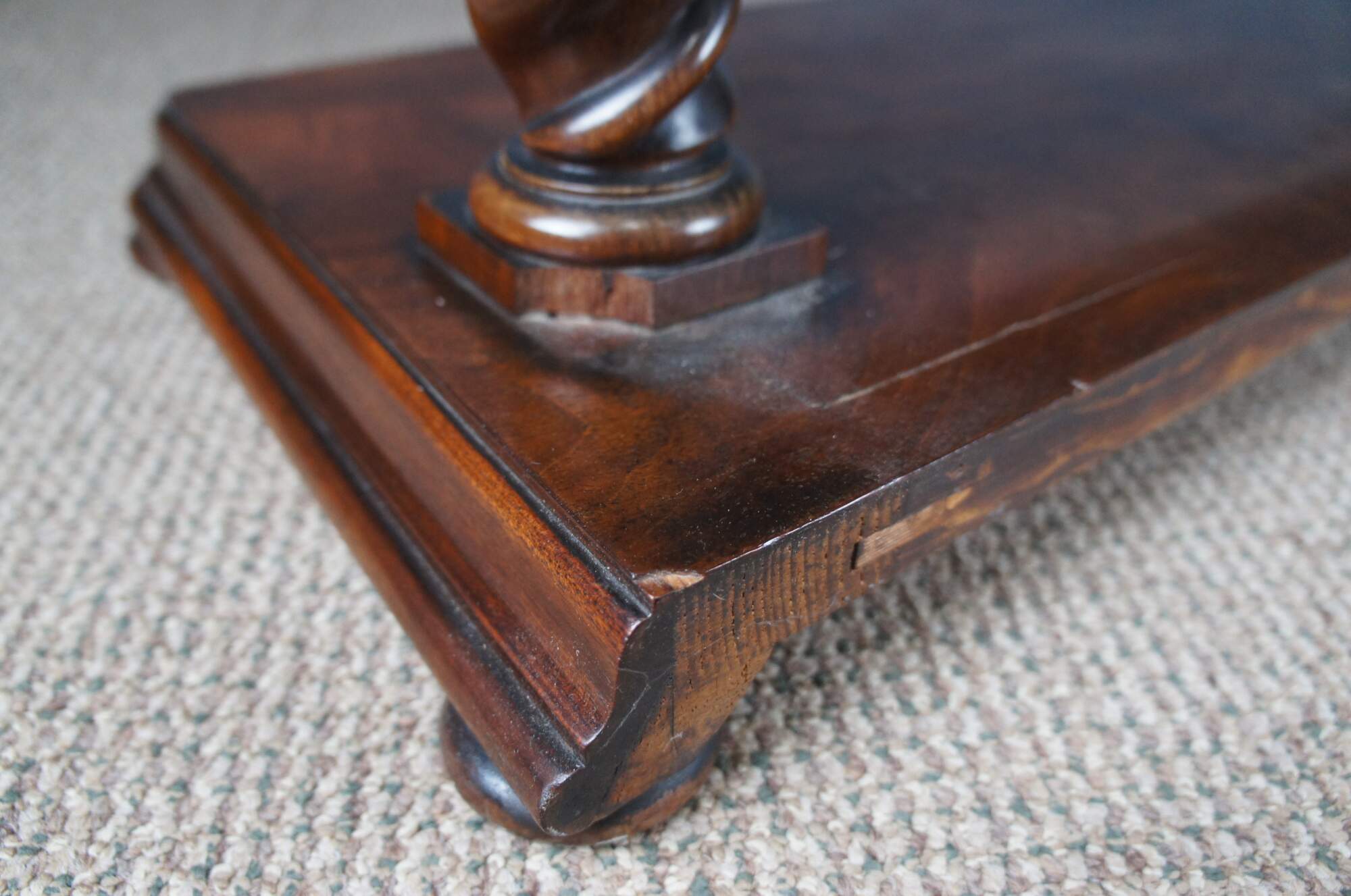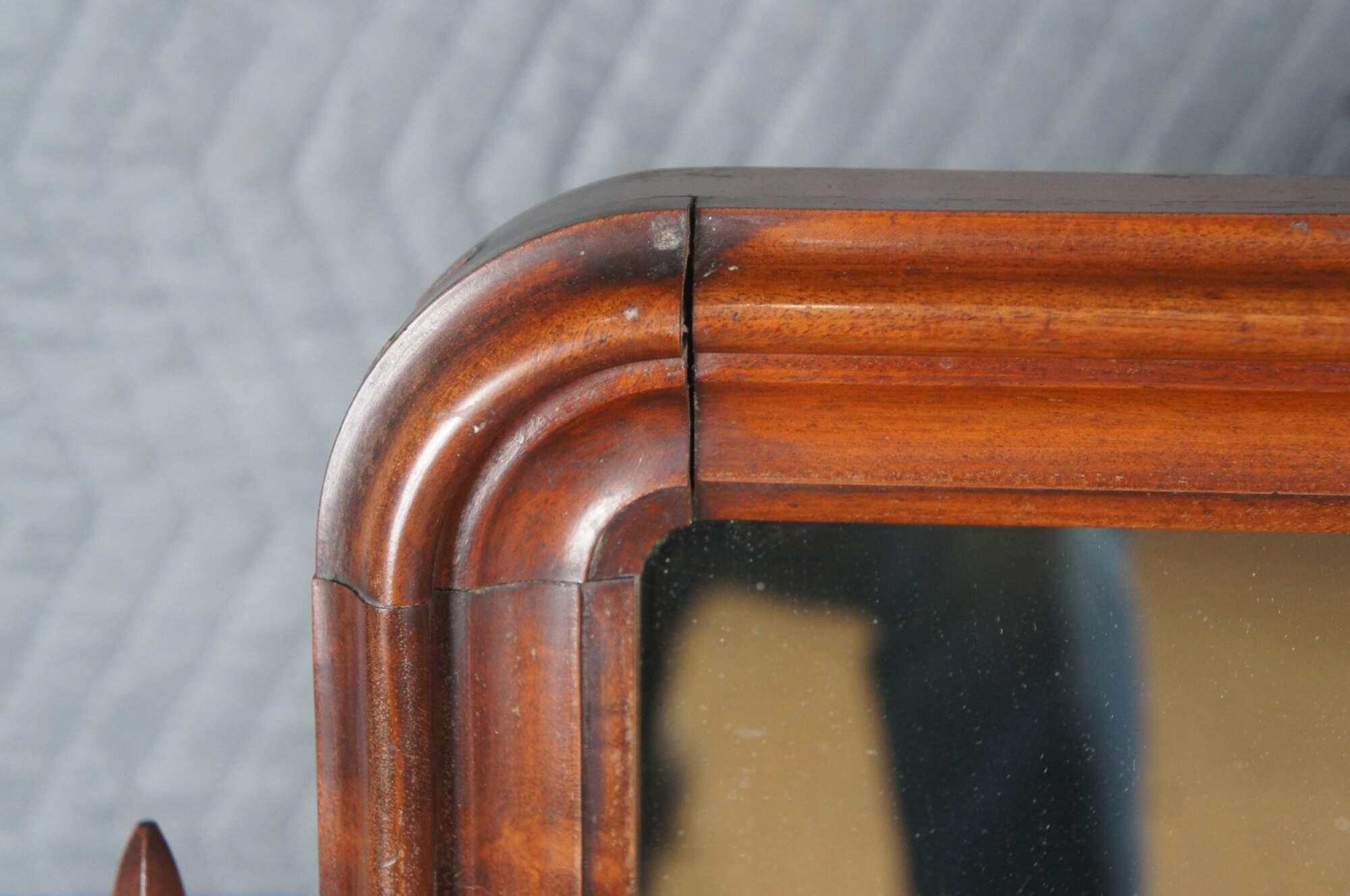 Impressive antique 19th century (circa 1880s) English Empire gentleman's dressing mirror. Made from mahogany with a beveled wooden frame supported by exceptional barley twist uprights with pyramid shaped finials. The rectangular base is raised over bun feet. Mirror tilts for ease of use.