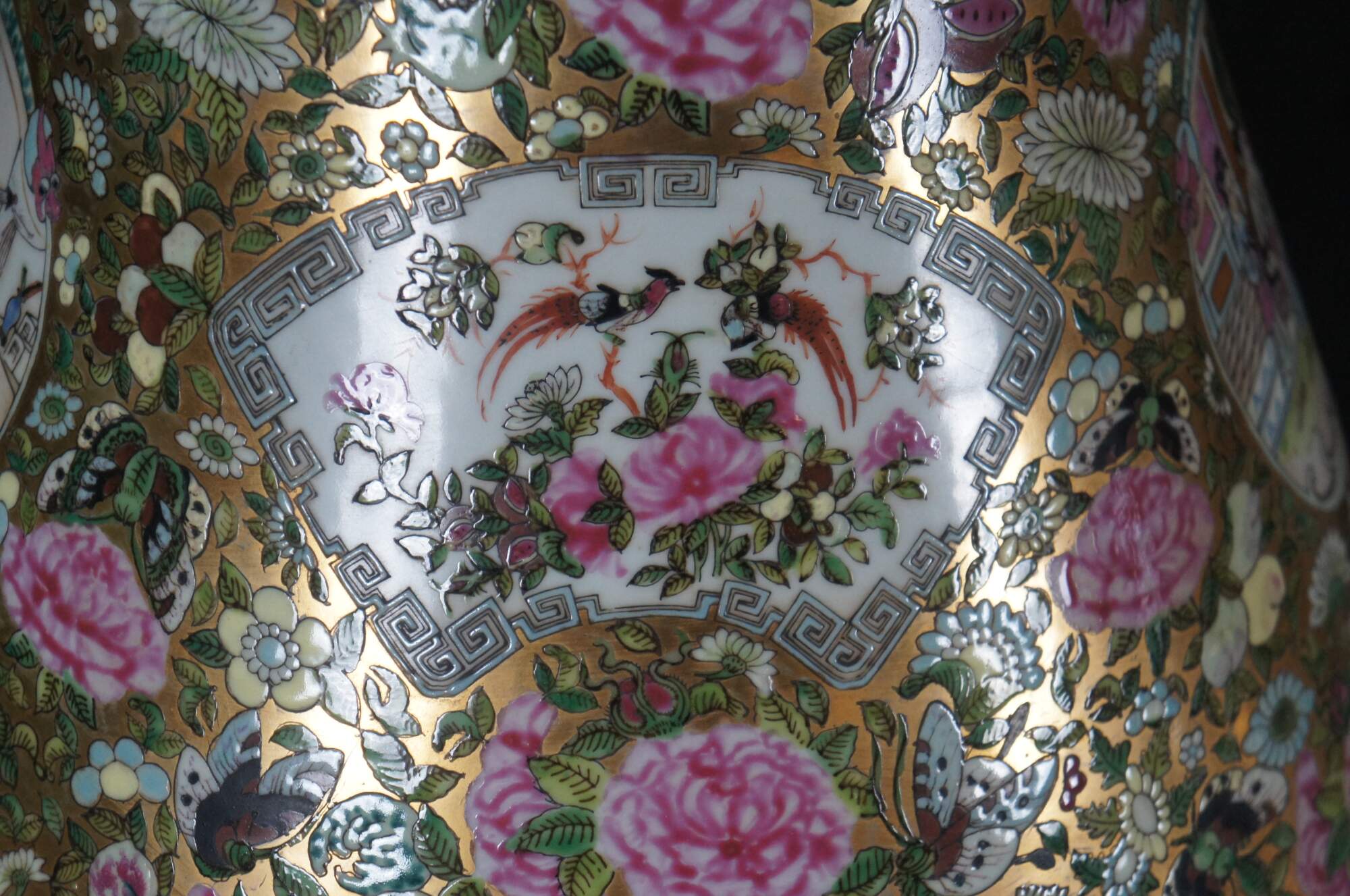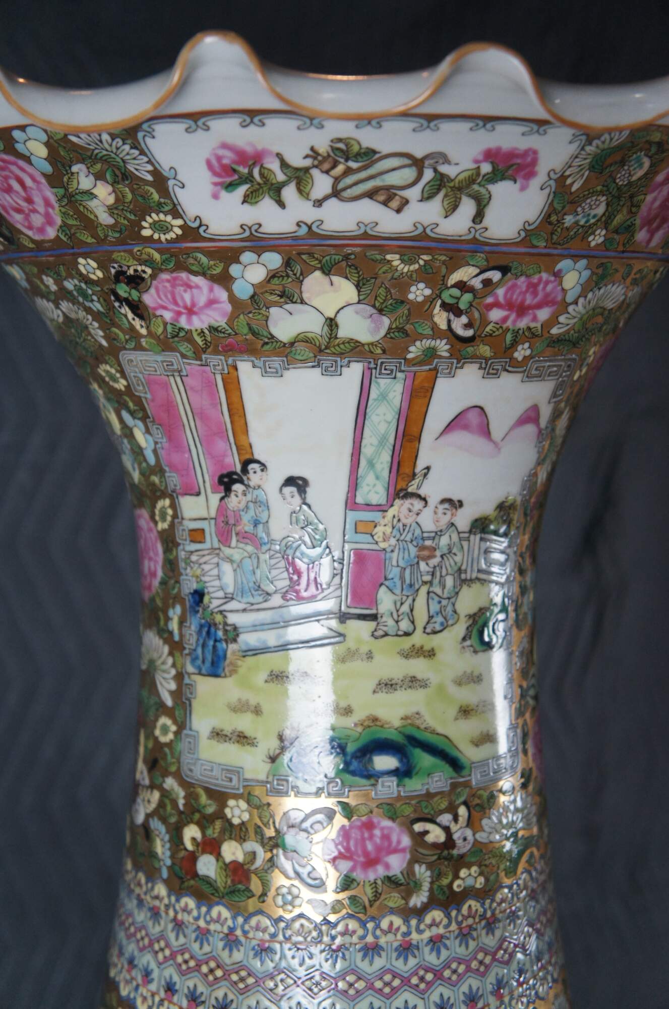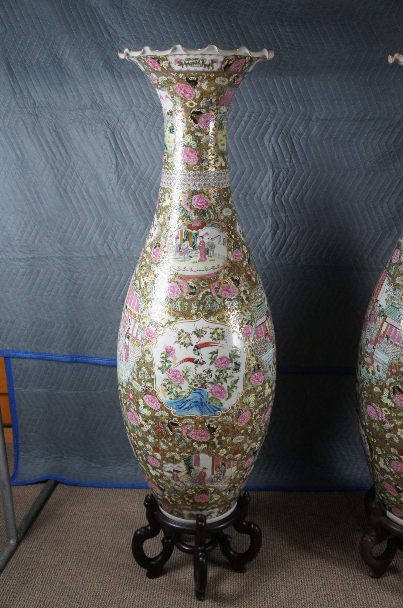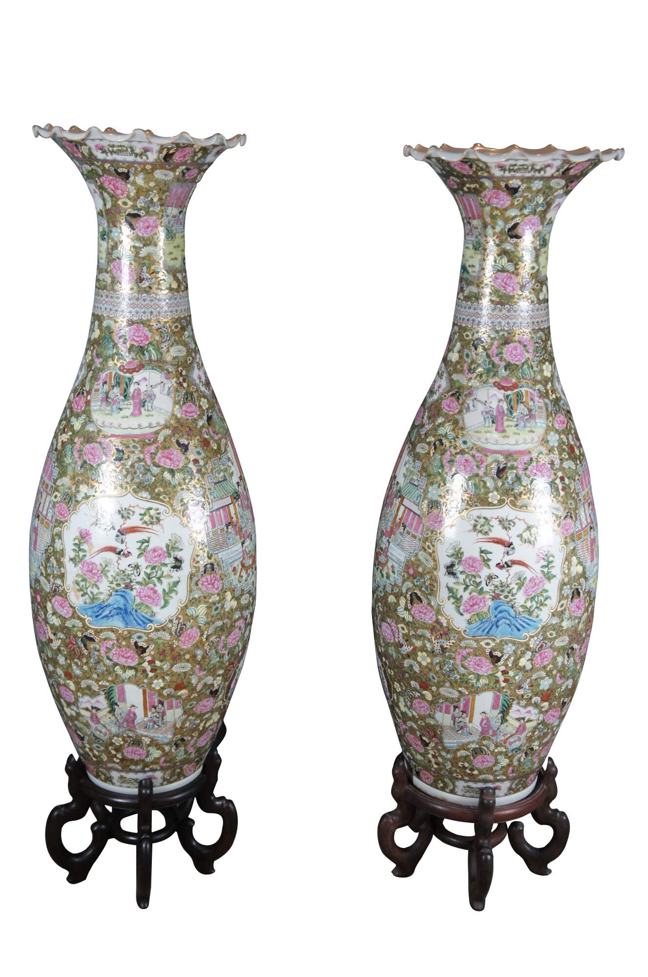 Rare pair of two monumental antique Chinese Qing Dynasty palace urns or temple vases, circa 1900s. Made of porcelain featuring chinoiserie Canton Famille Rose and medallion design with ruffled serpentine edge, baluster shaped body, and ornate stands. Each is adorned with elaborate scenes of Geishas, Lily Ponds, and Pagodas with birds, butterflies and floral Chrysanthemum accents set against a gold field. Each vessel is stamped along the underside with Qianlong mark and rests on a traditional stand with scrolled supports.