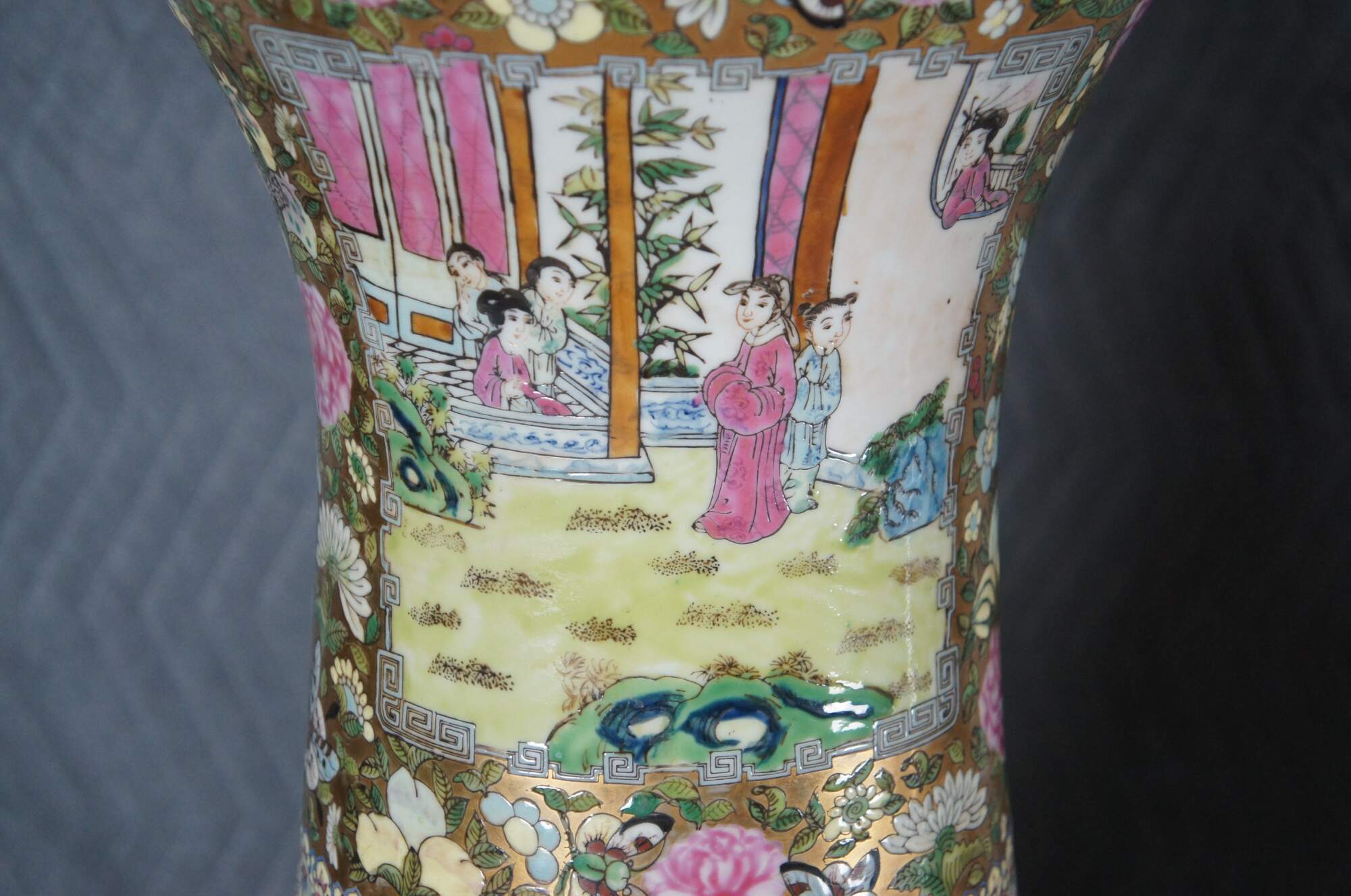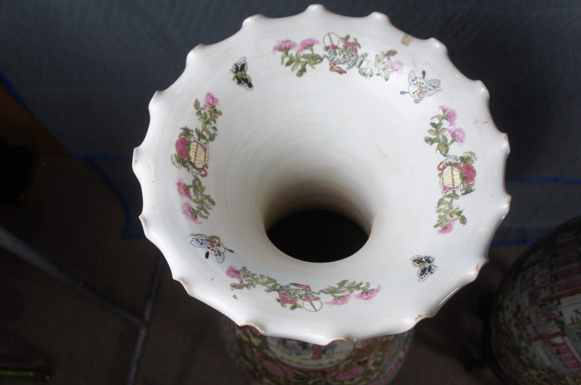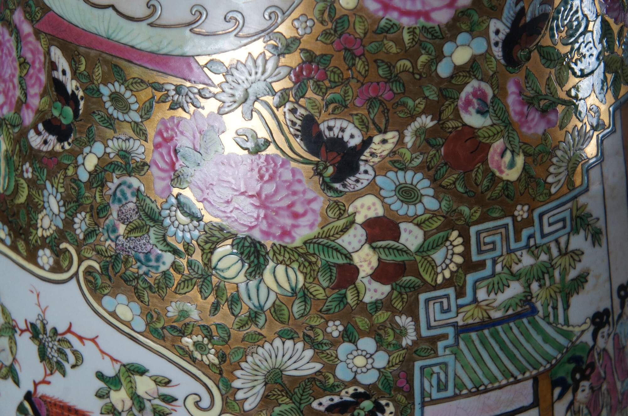 Rare pair of two monumental antique Chinese Qing Dynasty palace urns or temple vases, circa 1900s. Made of porcelain featuring chinoiserie Canton Famille Rose and medallion design with ruffled serpentine edge, baluster shaped body, and ornate stands. Each is adorned with elaborate scenes of Geishas, Lily Ponds, and Pagodas with birds, butterflies and floral Chrysanthemum accents set against a gold field. Each vessel is stamped along the underside with Qianlong mark and rests on a traditional stand with scrolled supports.