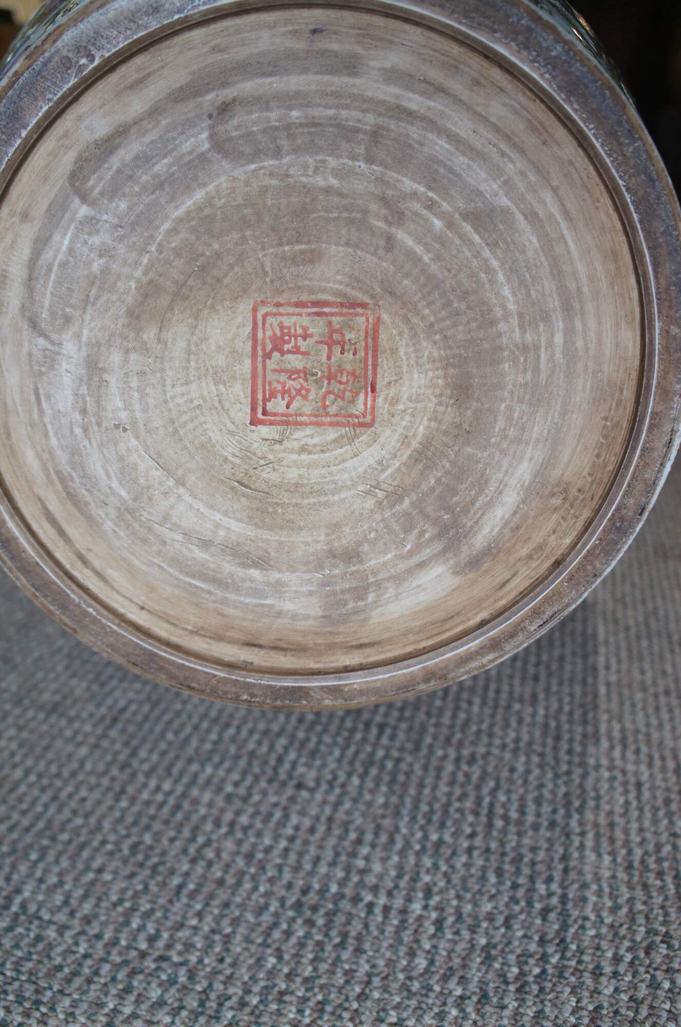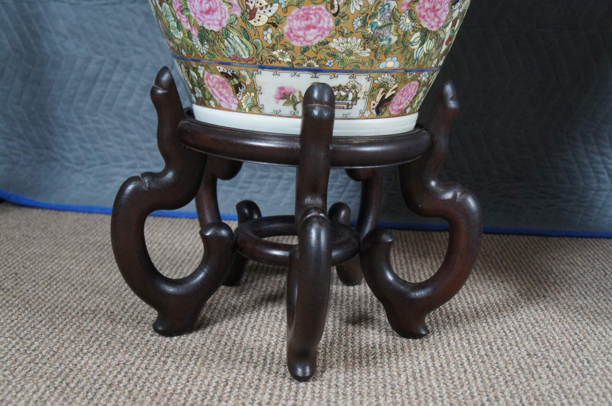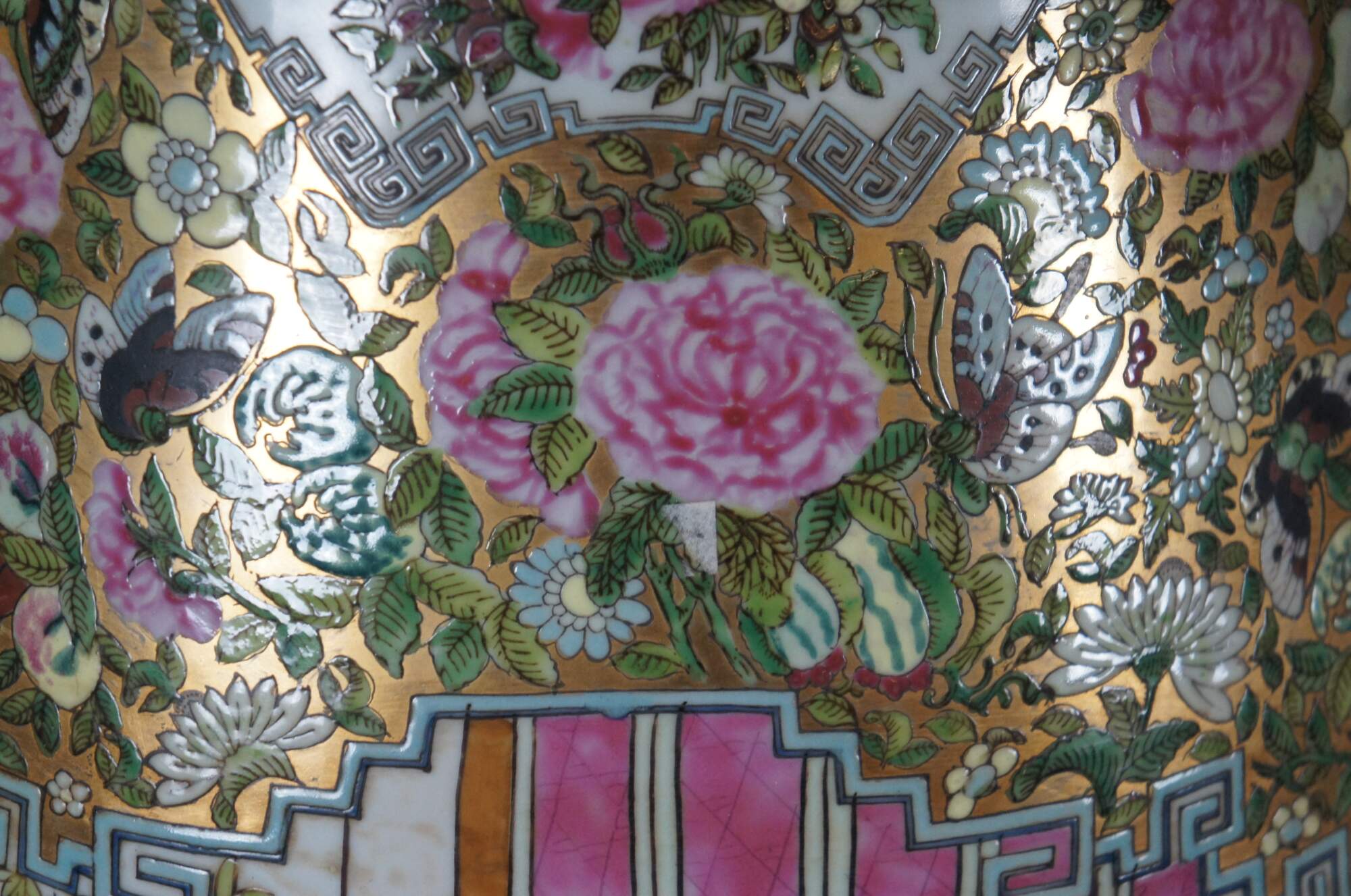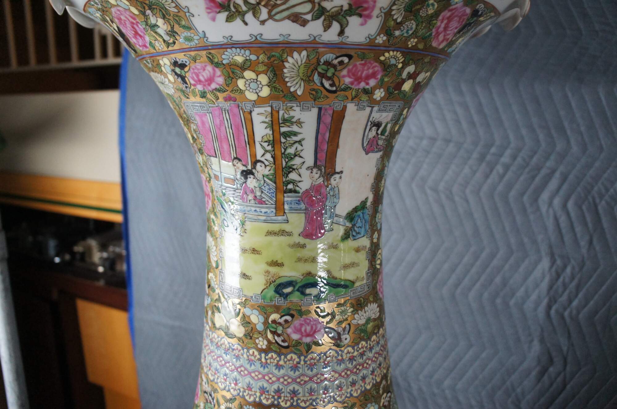 Rare pair of two monumental antique Chinese Qing Dynasty palace urns or temple vases, circa 1900s. Made of porcelain featuring chinoiserie Canton Famille Rose and medallion design with ruffled serpentine edge, baluster shaped body, and ornate stands. Each is adorned with elaborate scenes of Geishas, Lily Ponds, and Pagodas with birds, butterflies and floral Chrysanthemum accents set against a gold field. Each vessel is stamped along the underside with Qianlong mark and rests on a traditional stand with scrolled supports.