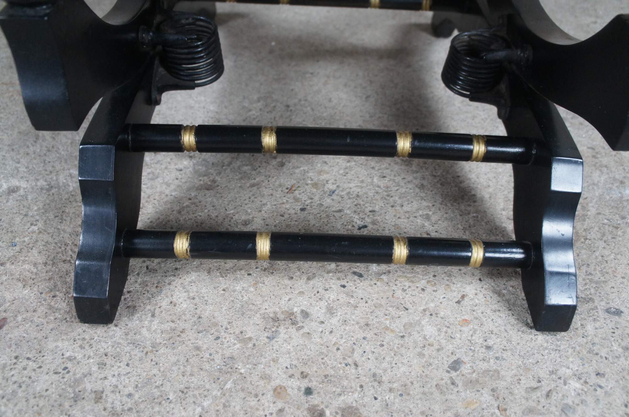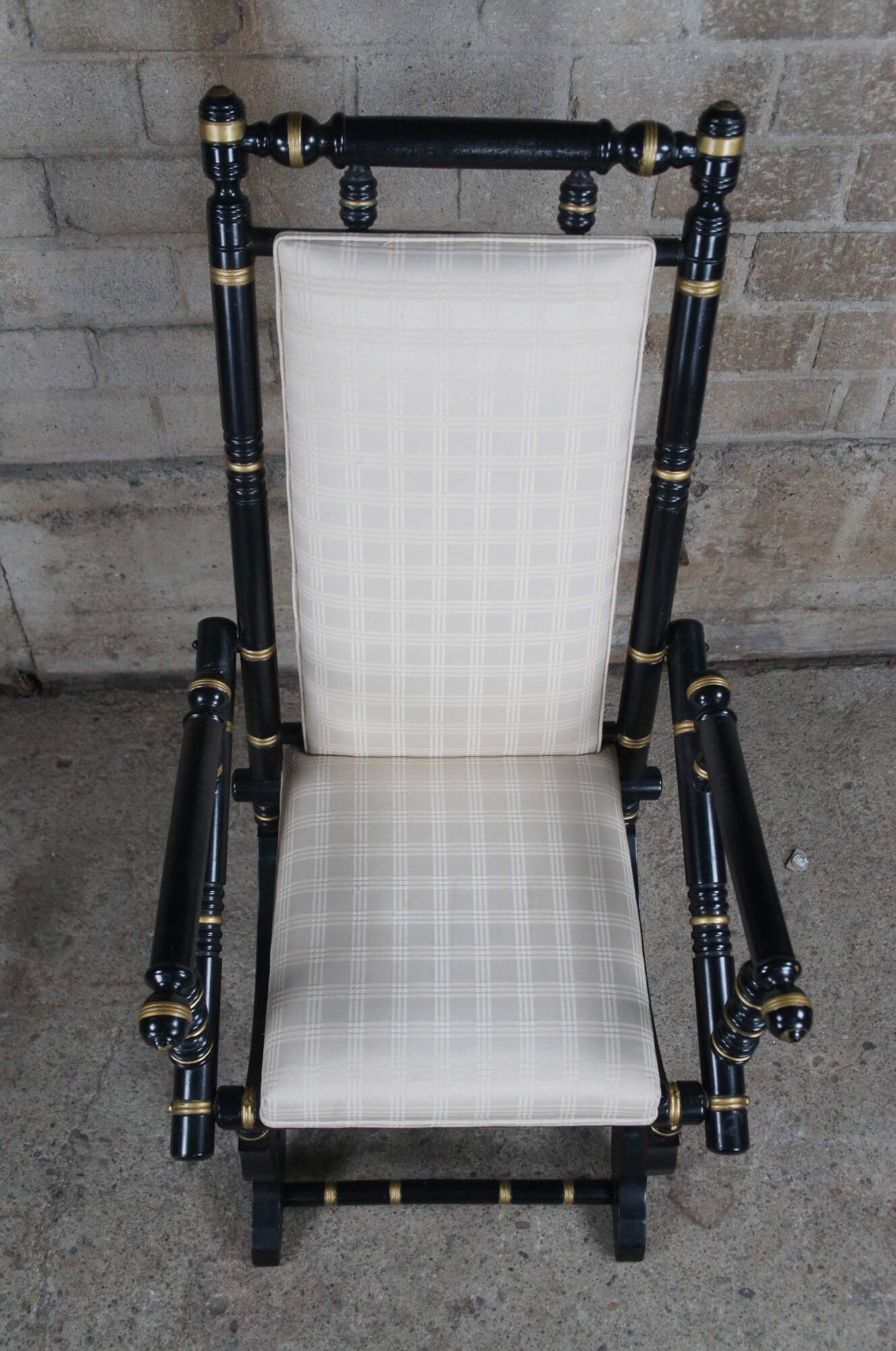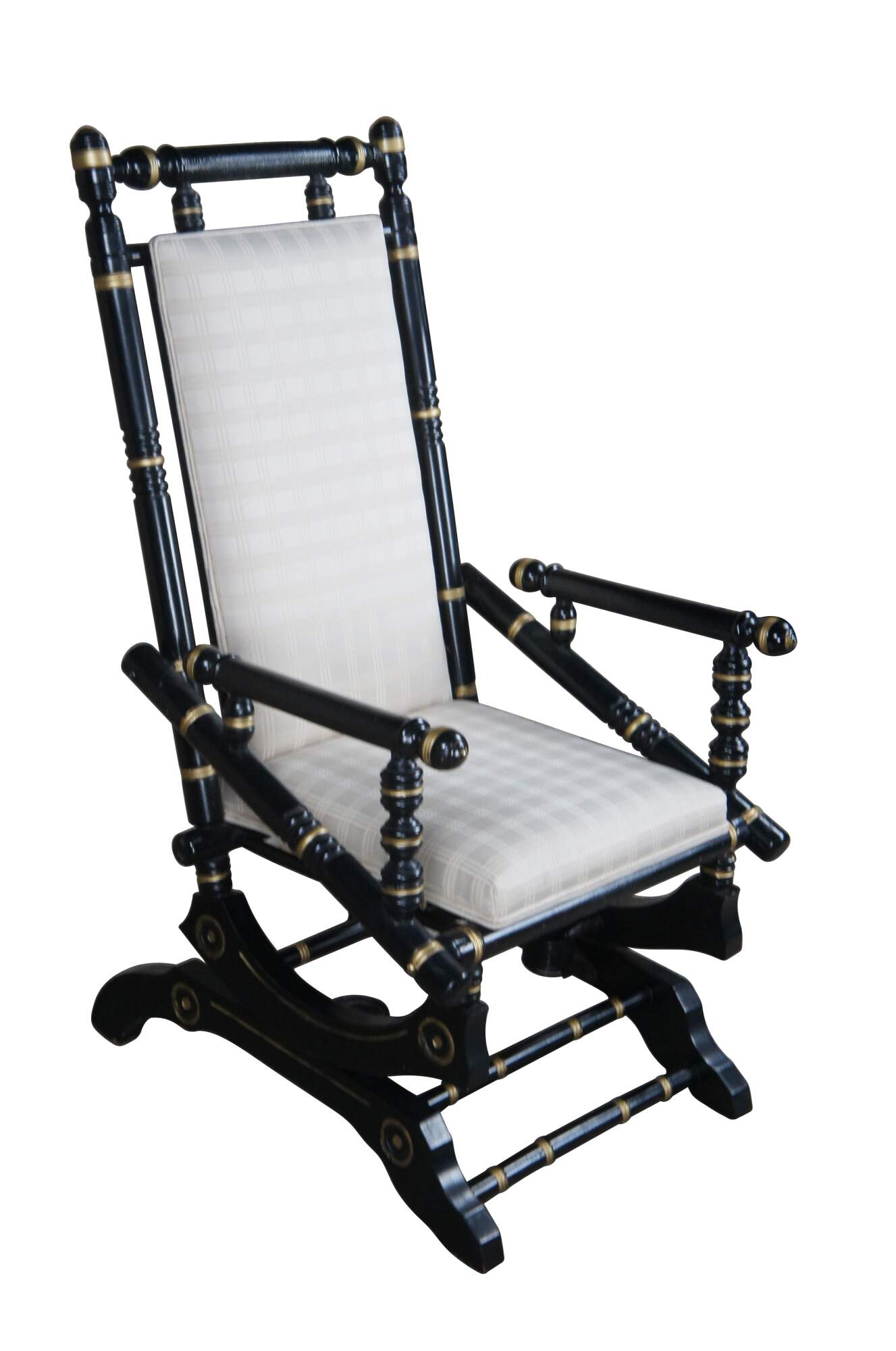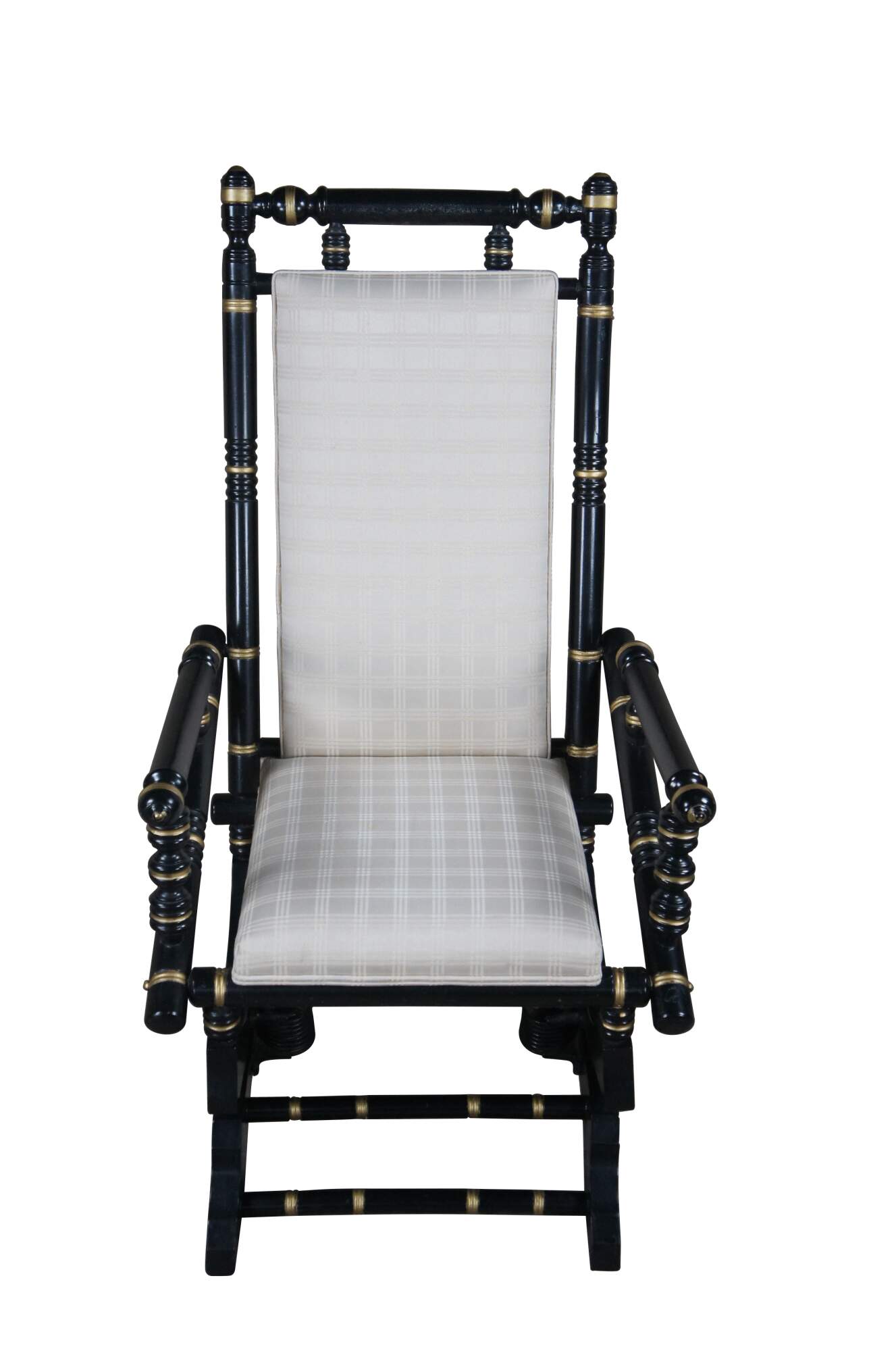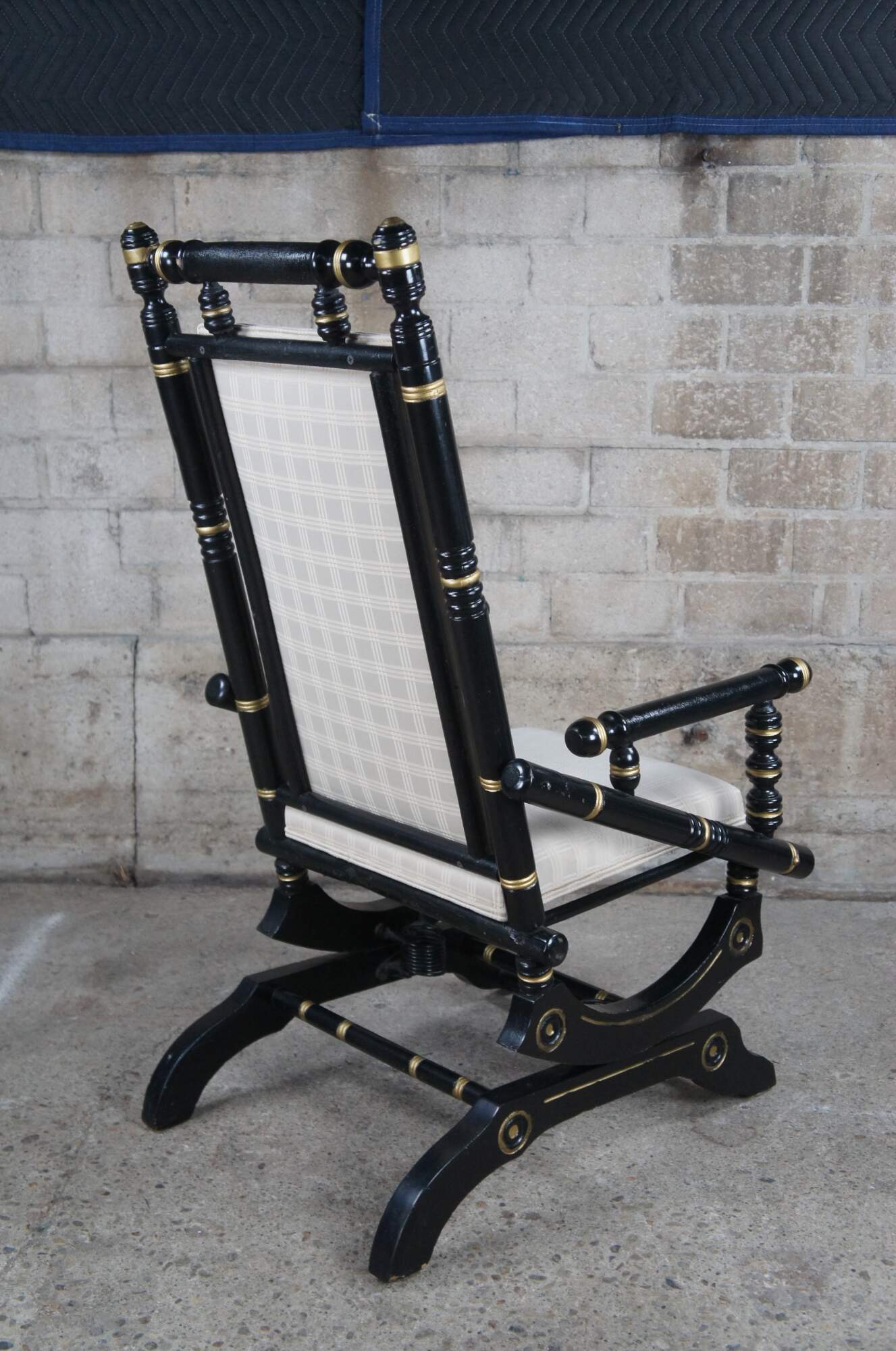 Late 19th century Victorian platform rocking chair. Features a hardwood ebonized frame with gold trim and striped upholstery.