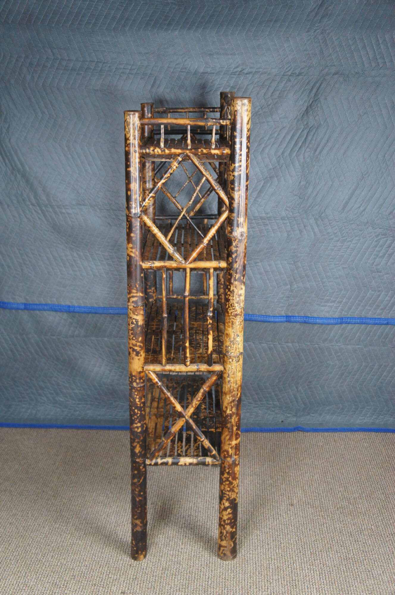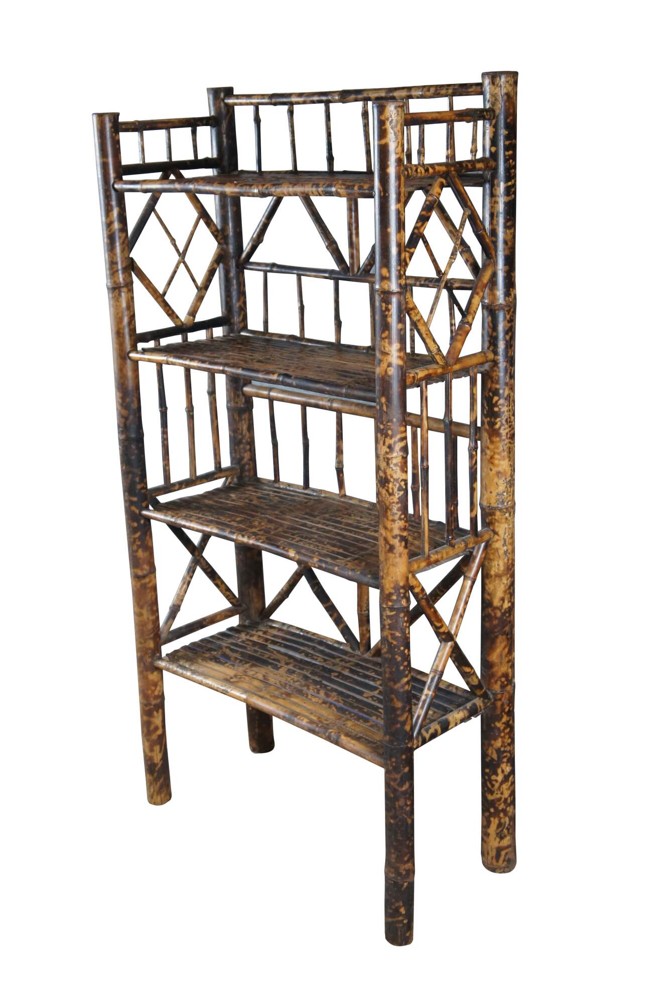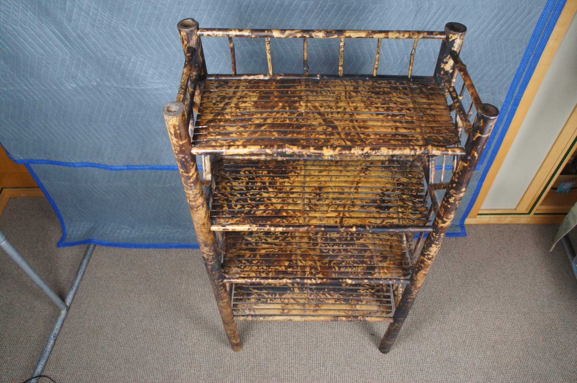 Antique Victorian bamboo library bookcase / etagere stand. Made of bamboo featuring a scorched / tortoise shell finish with four shelves, columns, and geometric pattern slats.