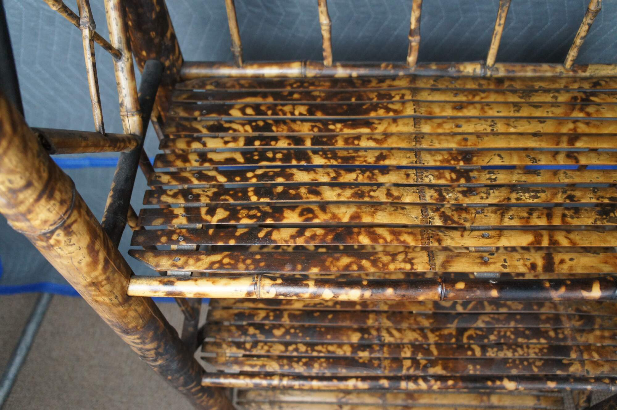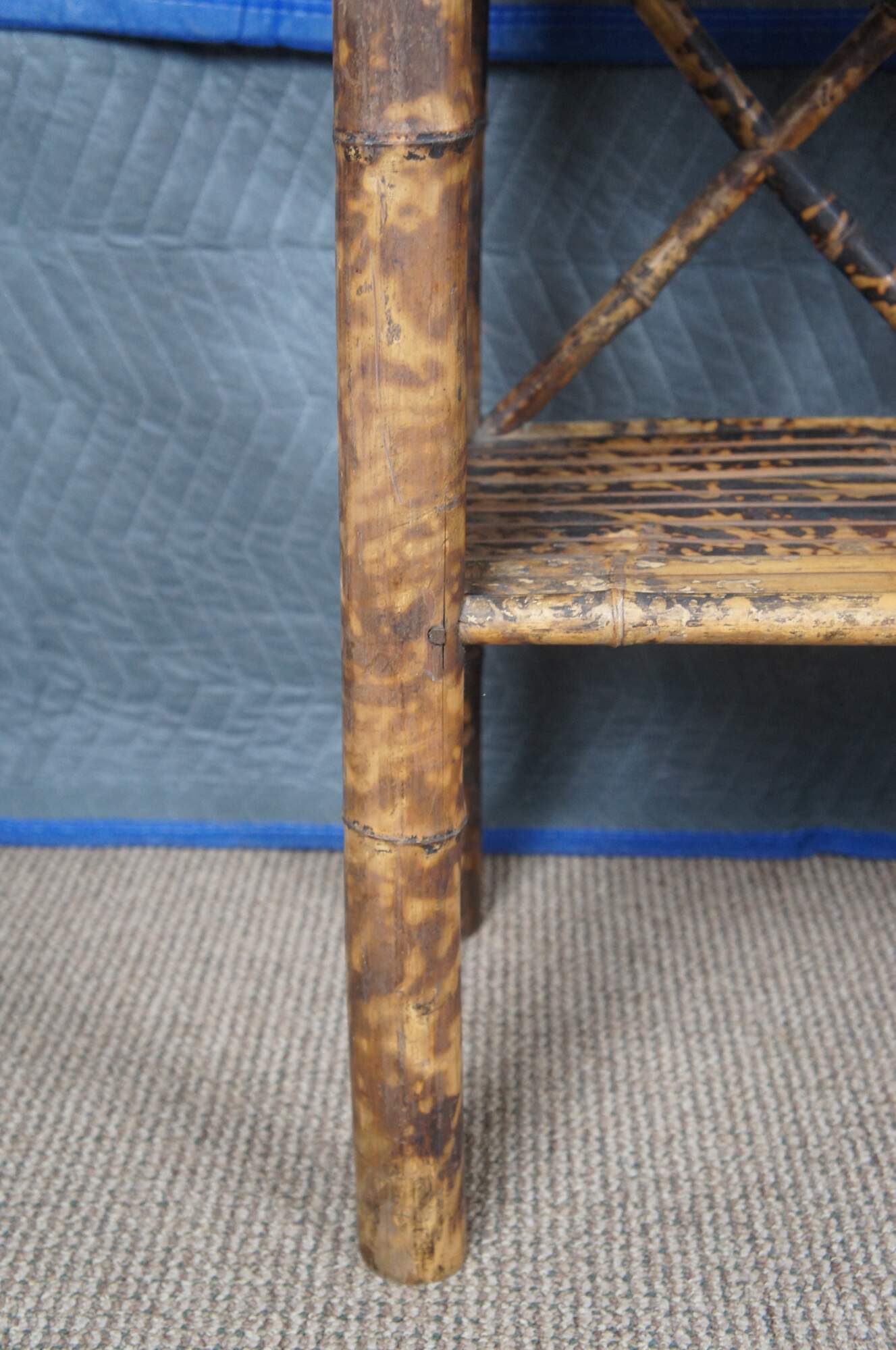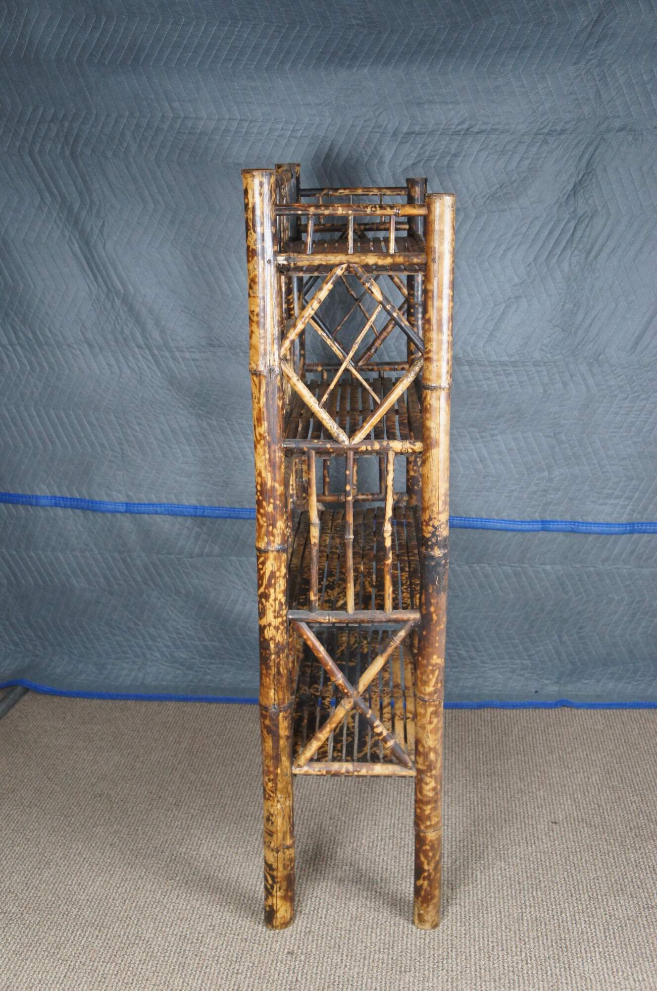 Antique Victorian bamboo library bookcase / etagere stand. Made of bamboo featuring a scorched / tortoise shell finish with four shelves, columns, and geometric pattern slats.