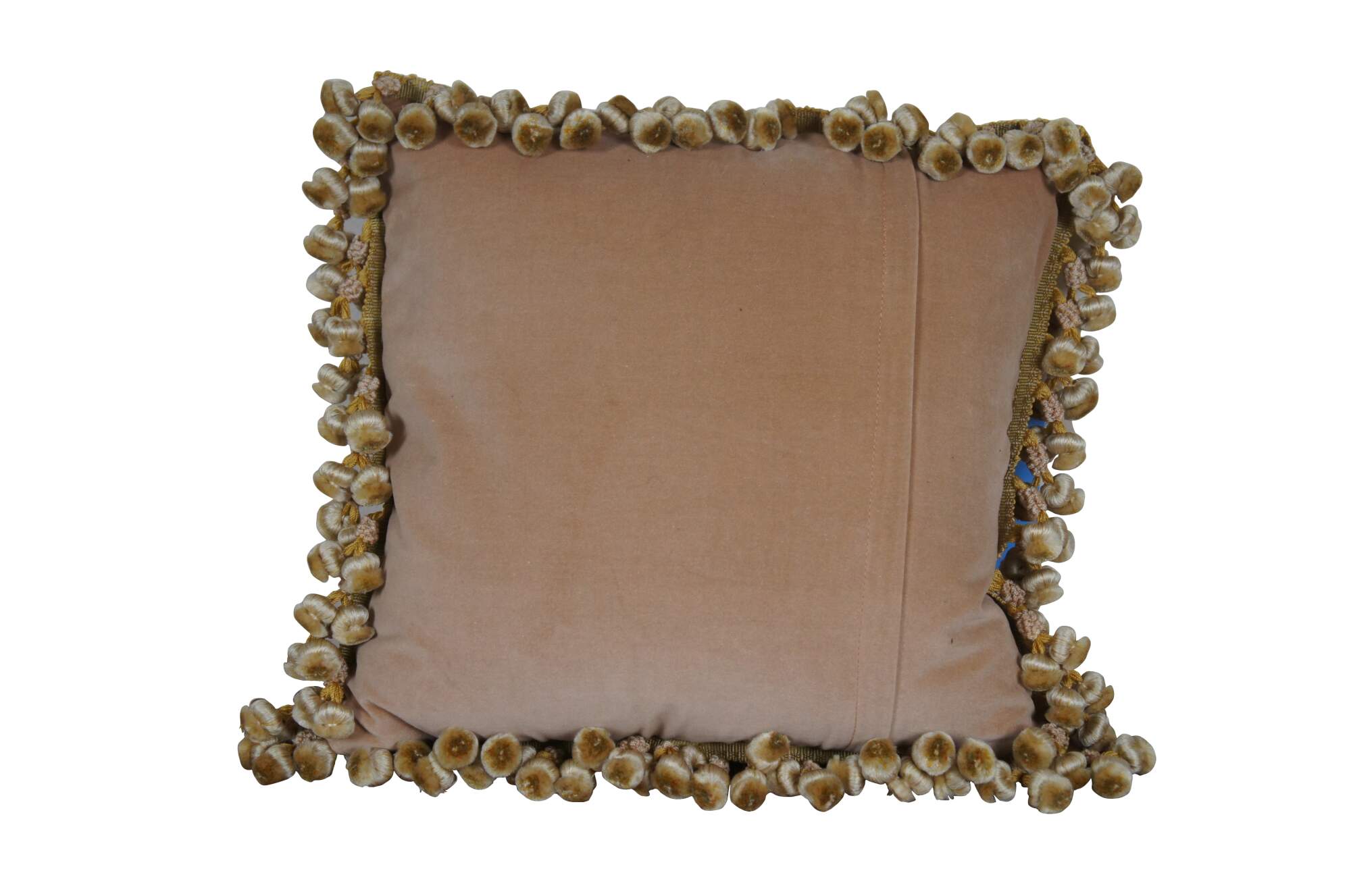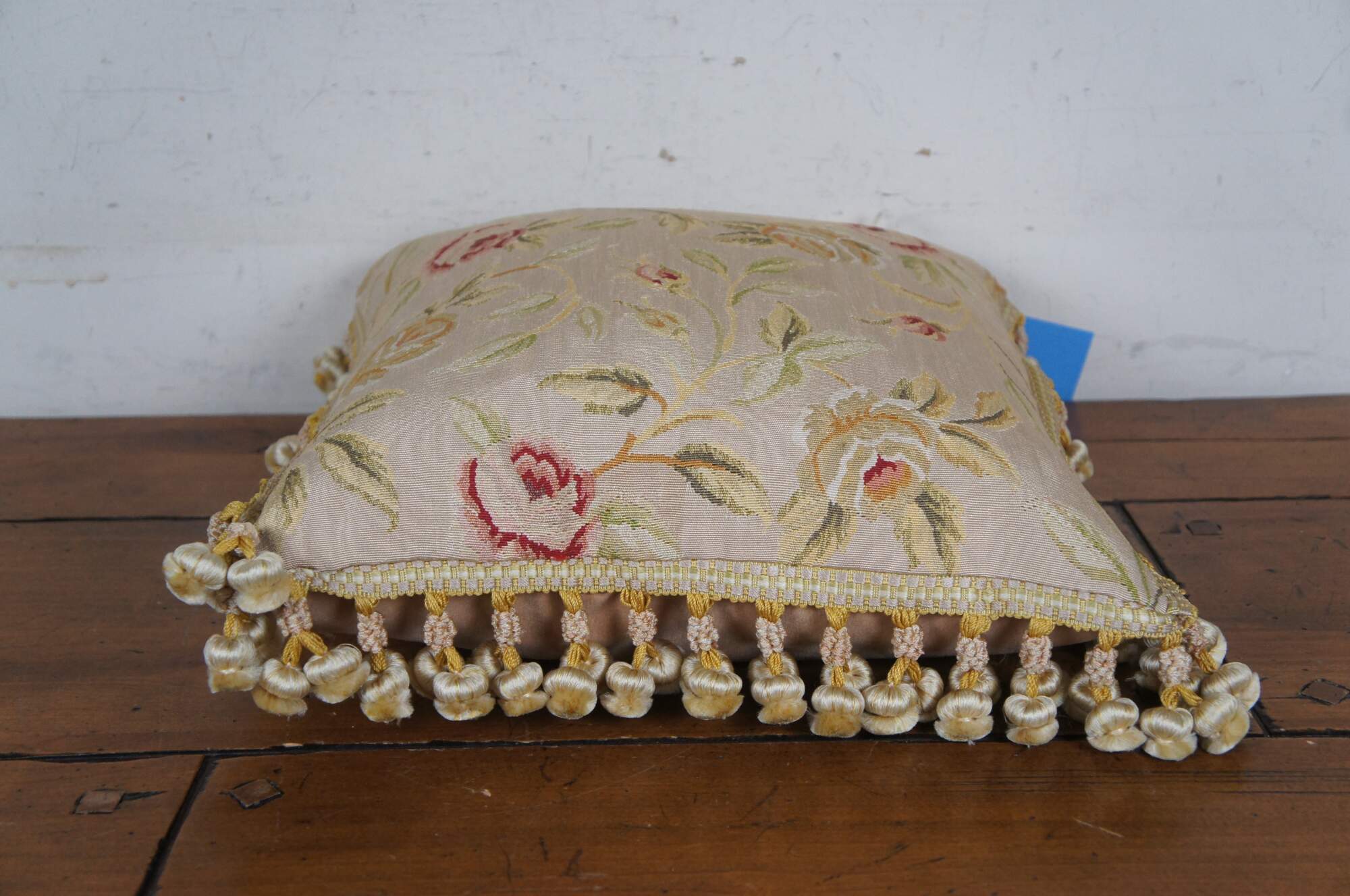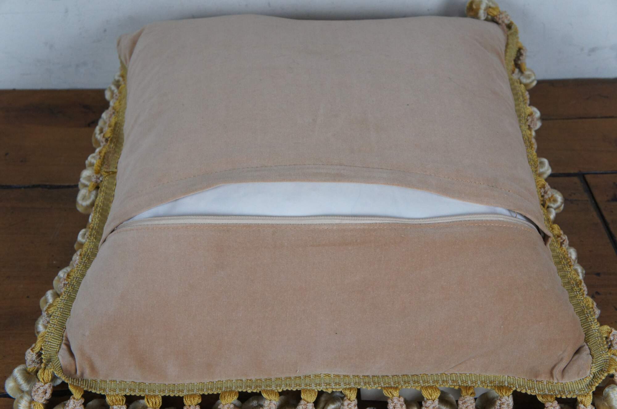 20th century square throw pillow, embroidered in silk with leafy stems of large yellow and pink roses. Cream and gold ball tassel trim. Light brown velour back with zipper closure.