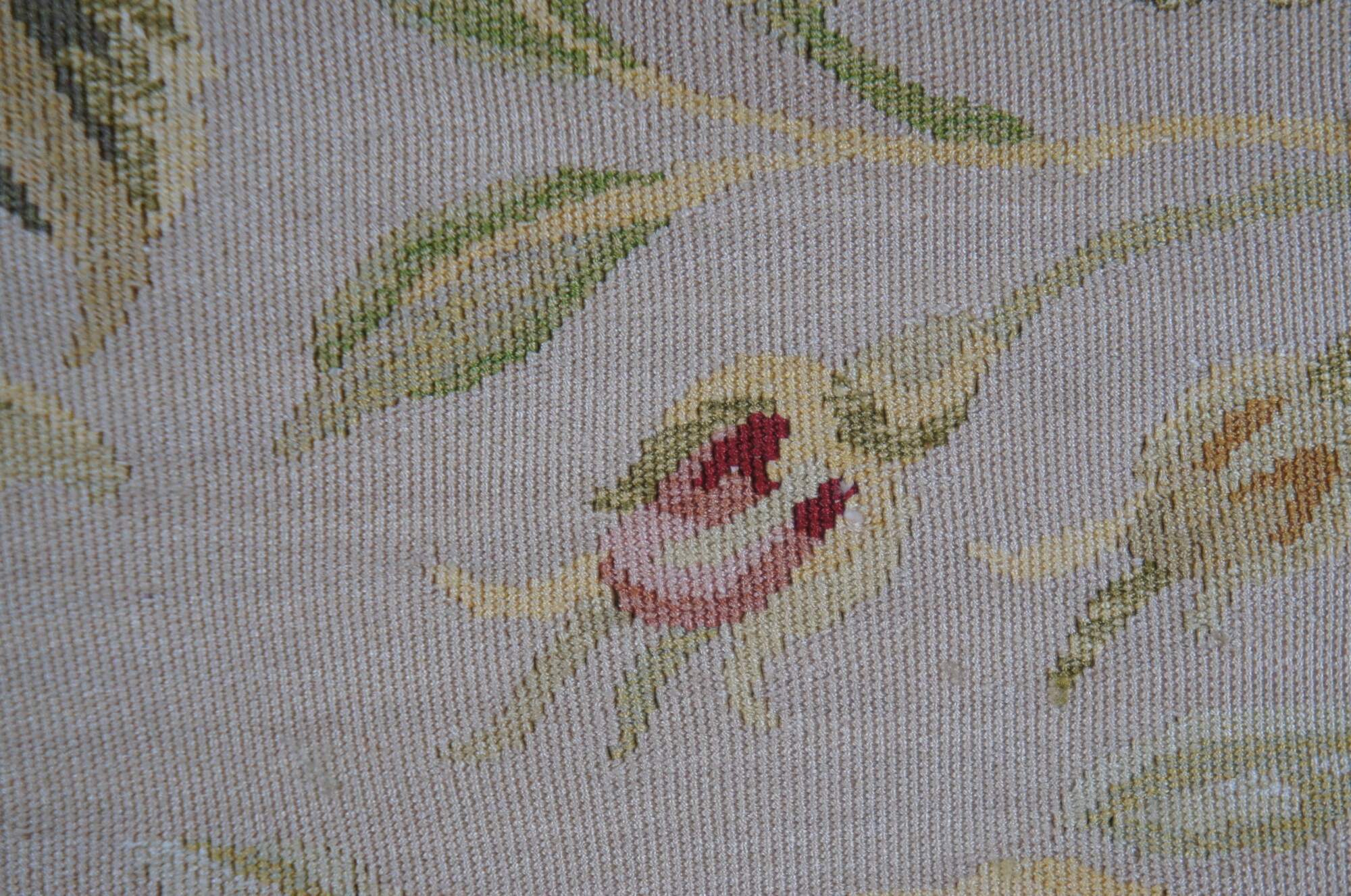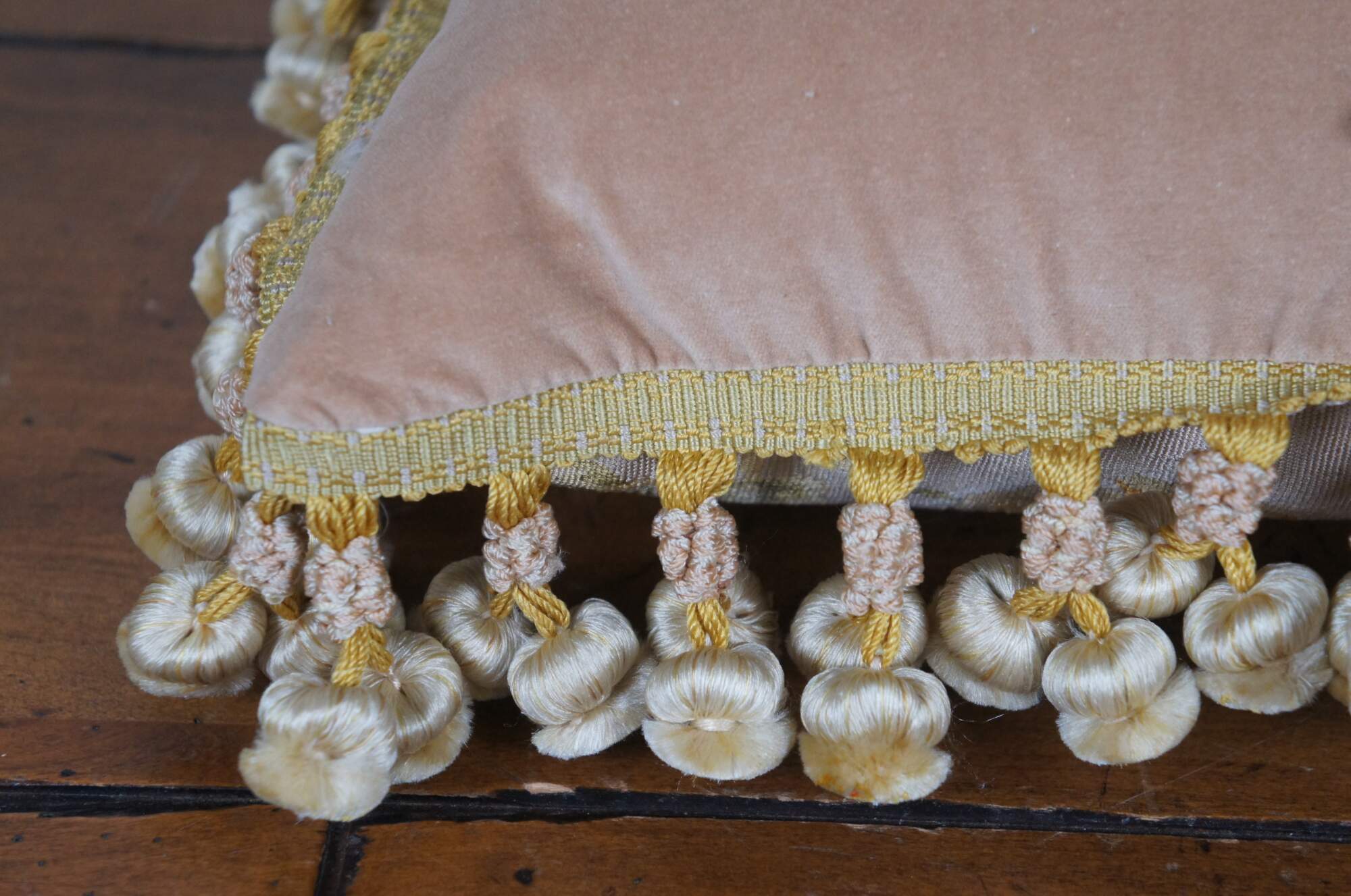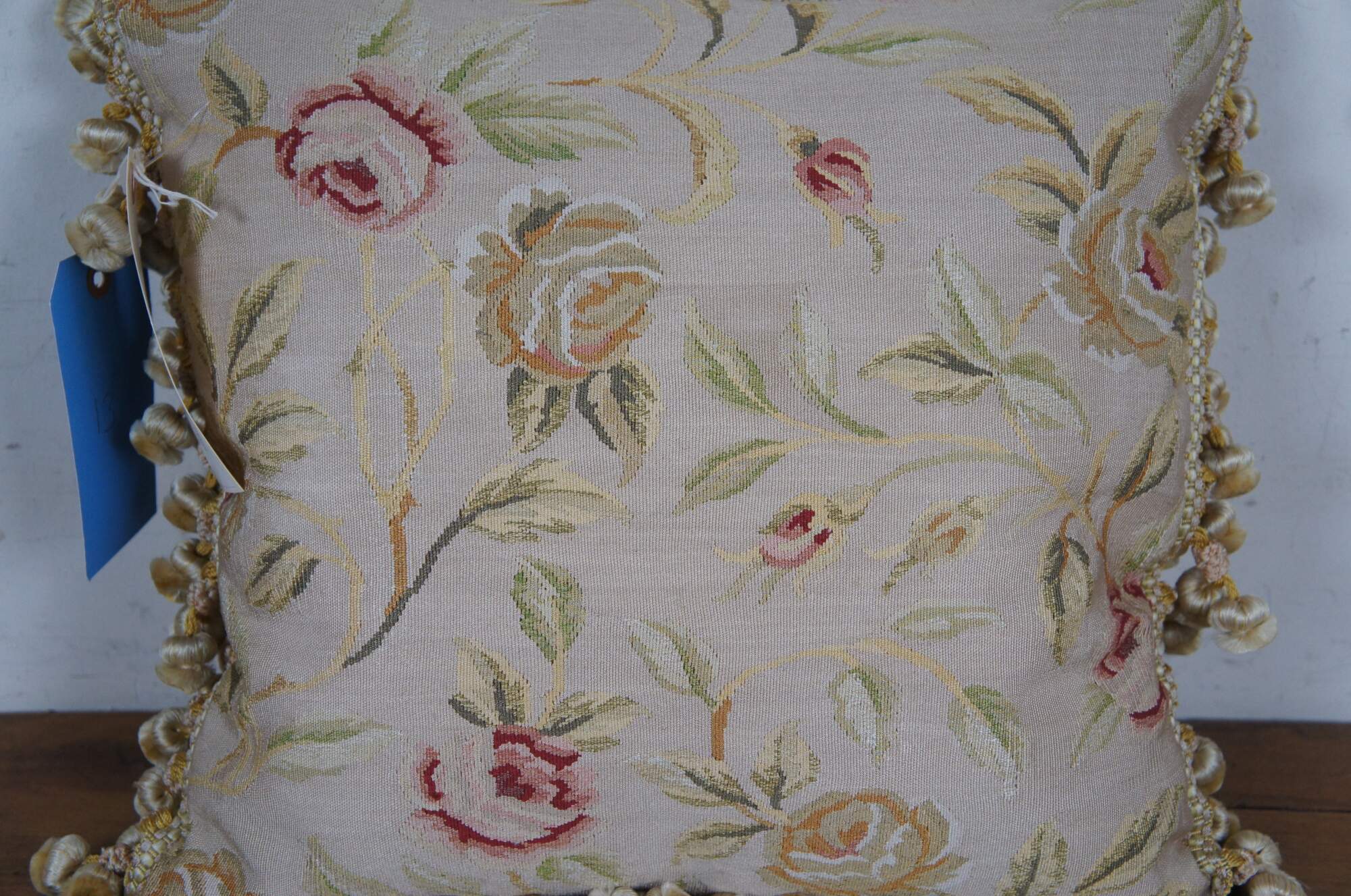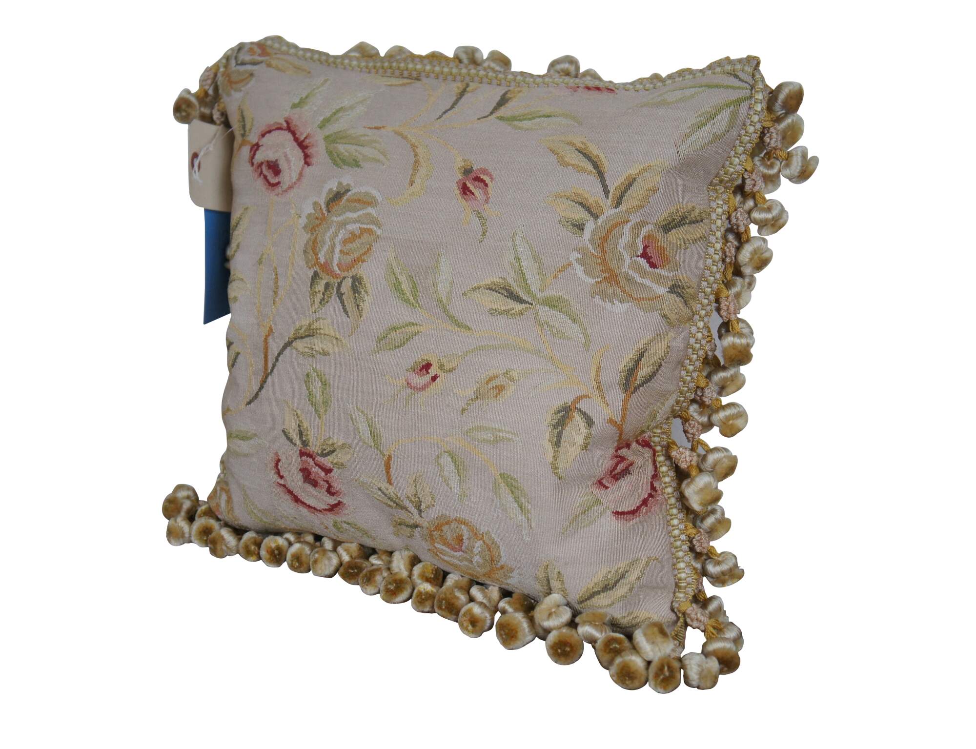 20th century square throw pillow, embroidered in silk with leafy stems of large yellow and pink roses. Cream and gold ball tassel trim. Light brown velour back with zipper closure.