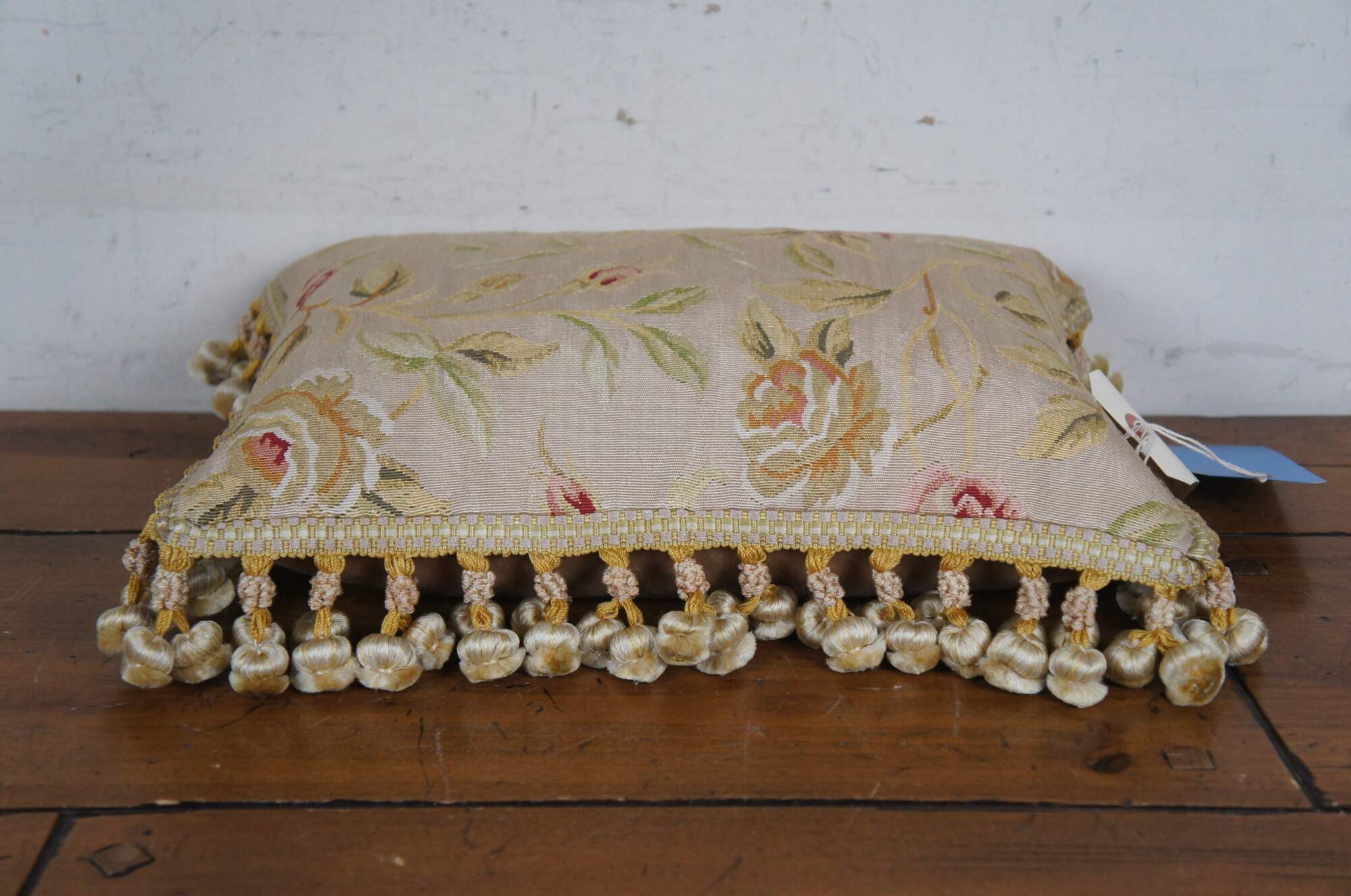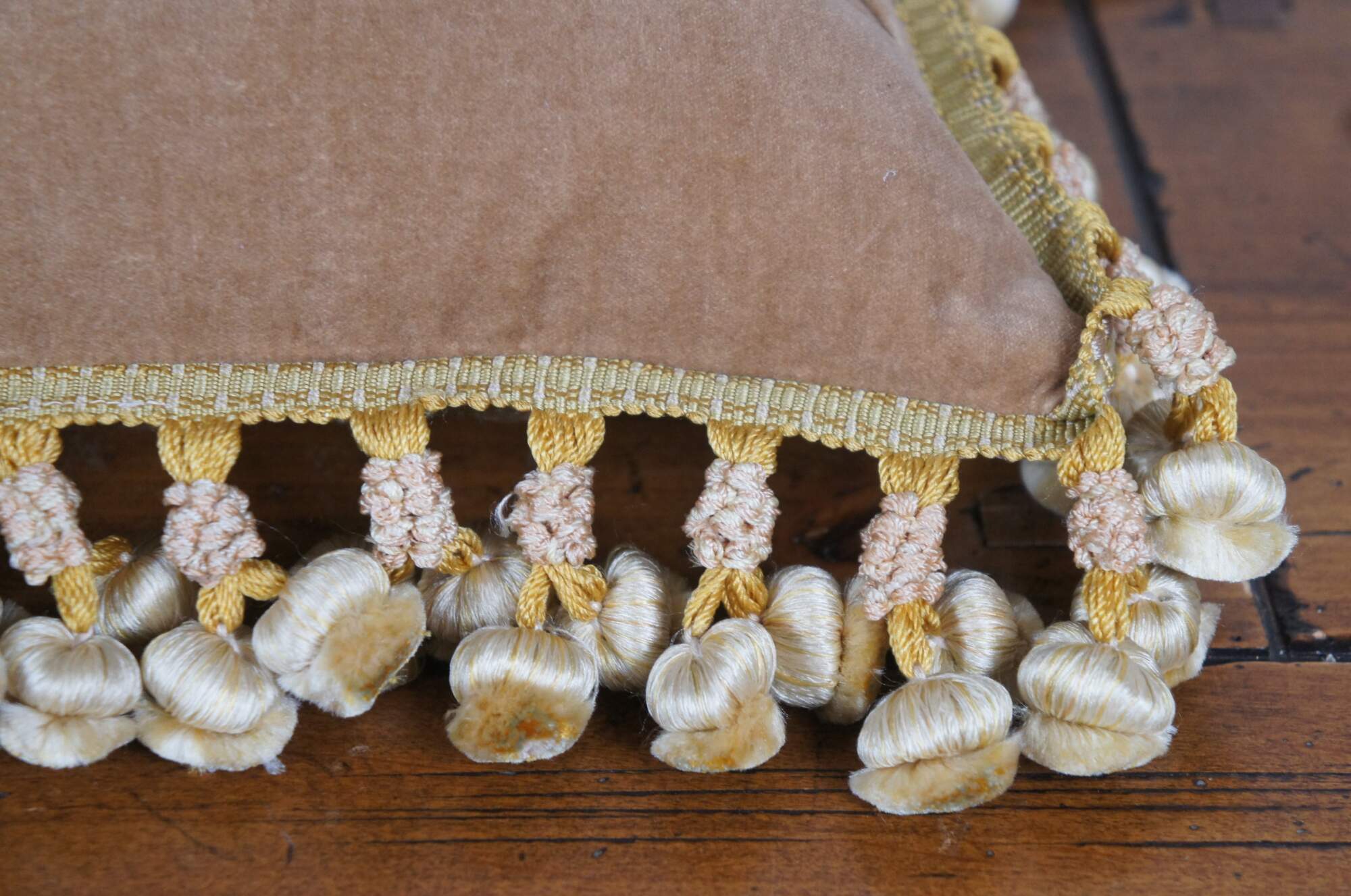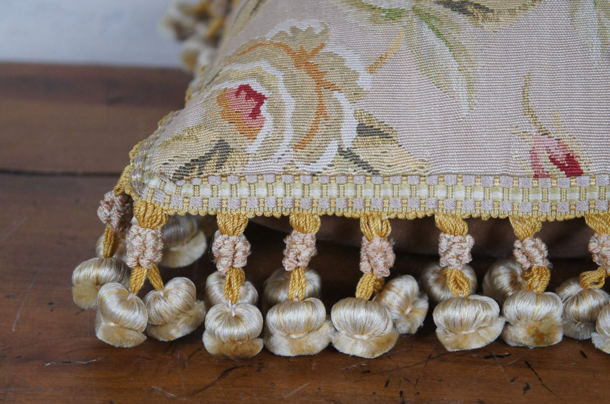 2 Available - 20th century square throw pillow, embroidered in silk with leafy stems of large yellow and pink roses. Cream and gold ball tassel trim. Light brown velour back with zipper closure.