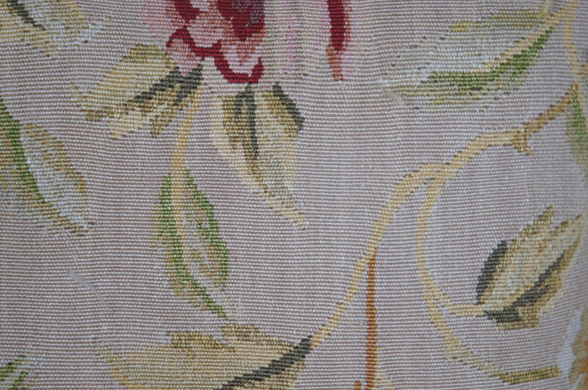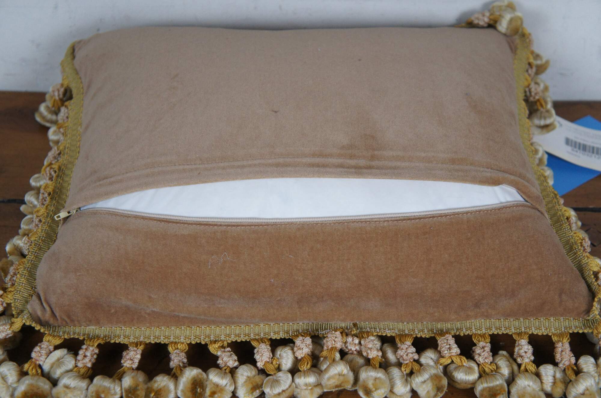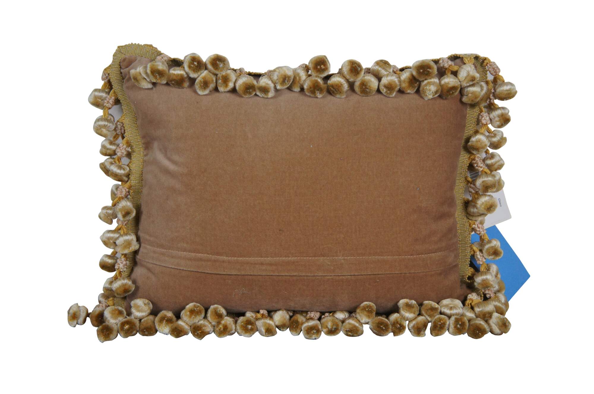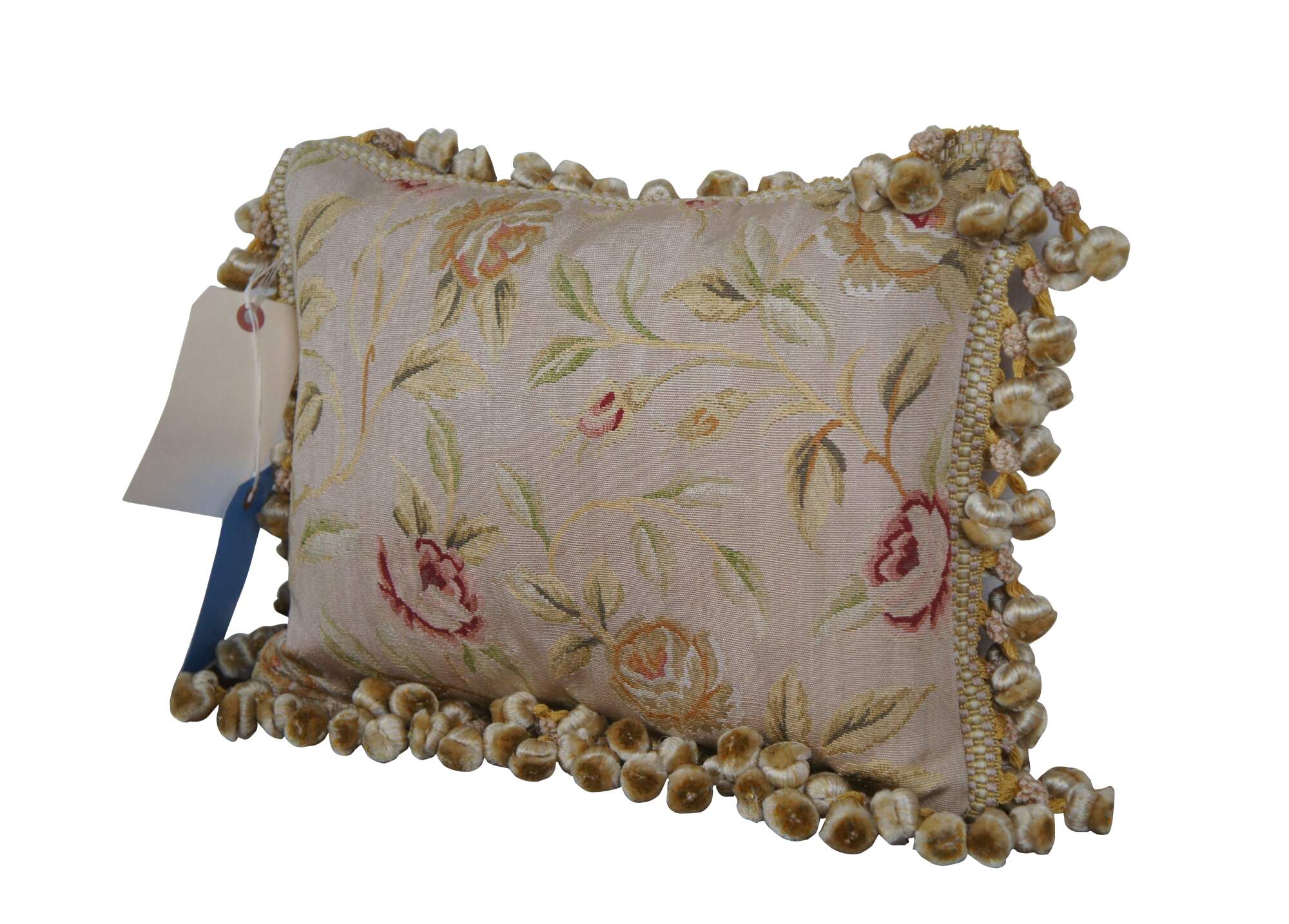 2 Available - 20th century square throw pillow, embroidered in silk with leafy stems of large yellow and pink roses. Cream and gold ball tassel trim. Light brown velour back with zipper closure.