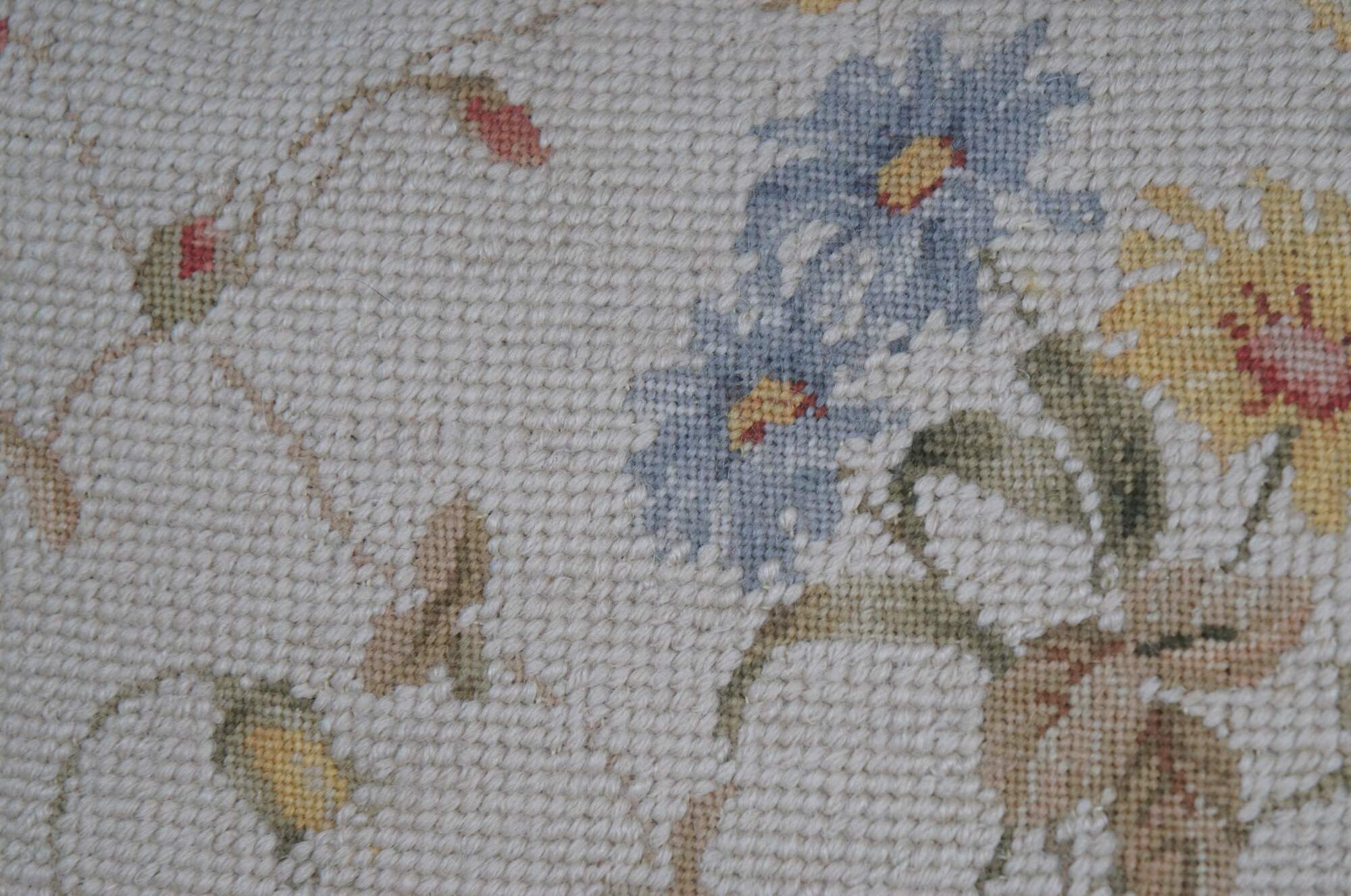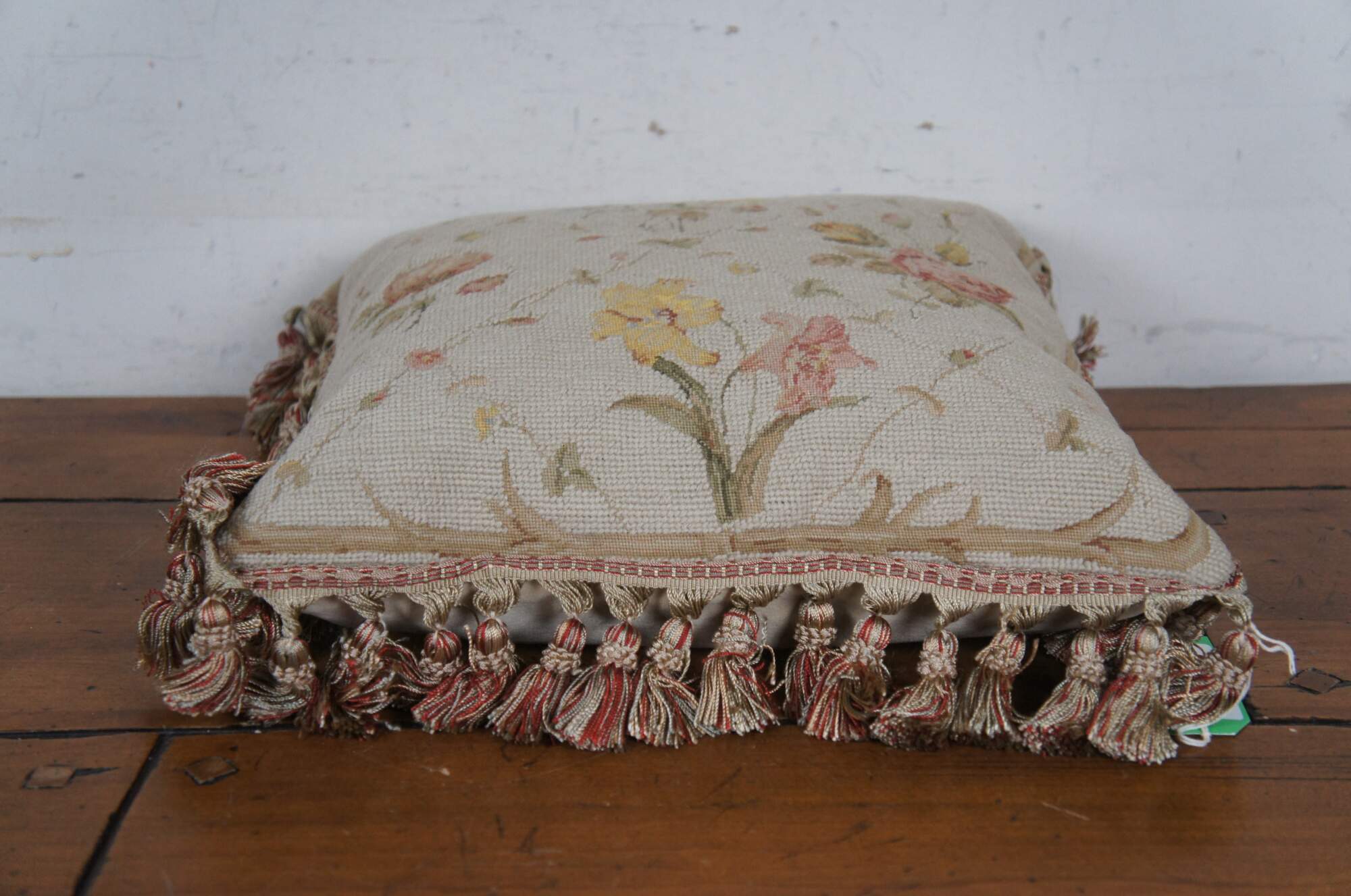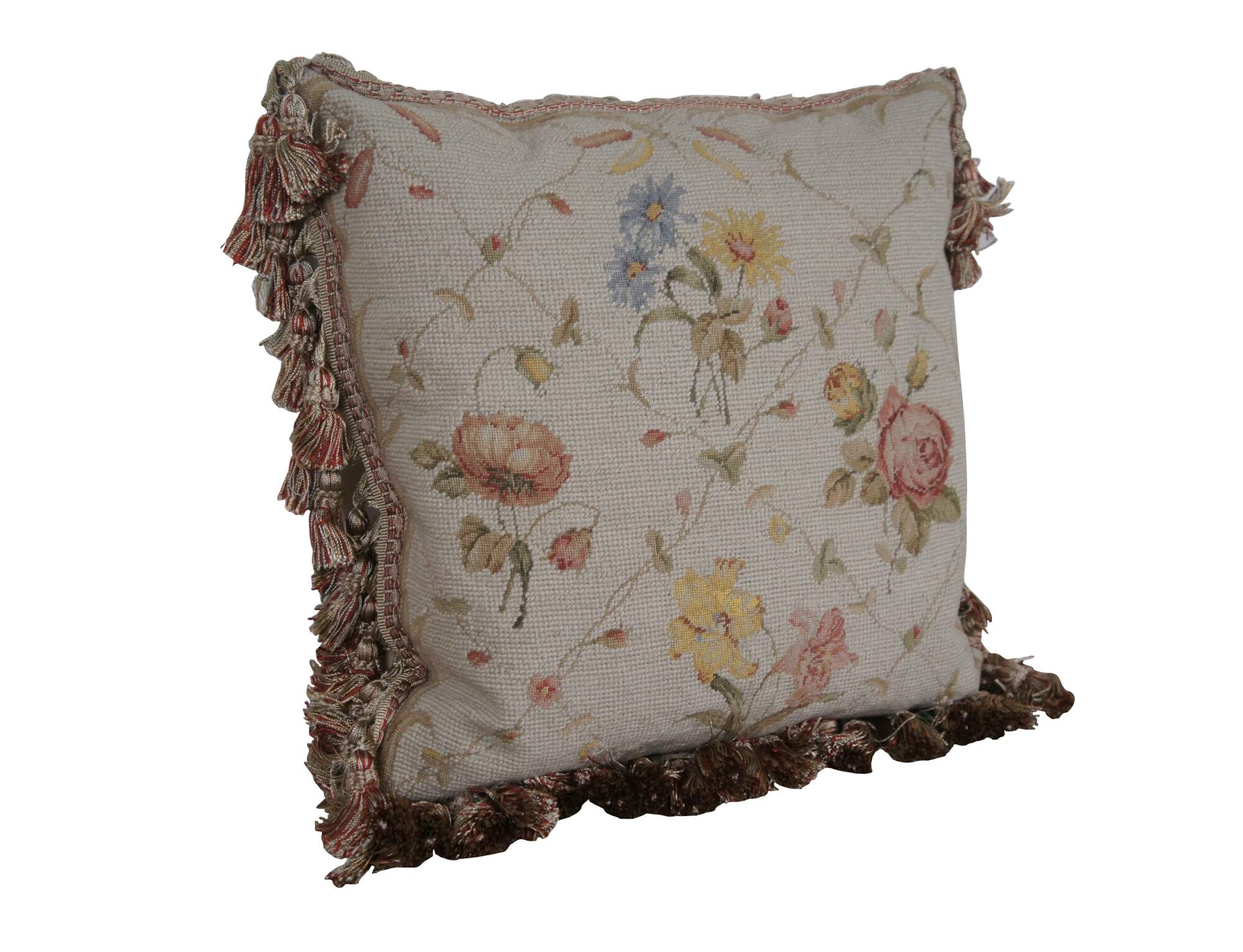 20th century square needlepoint throw pillow, hand embroidered with roses, lilies and daisies in pink, blue, and yellow, divided with criss crossing vines. Rust / rose, gold, and beige tassel trim. Beige velour back with zipper closure. Down filled.