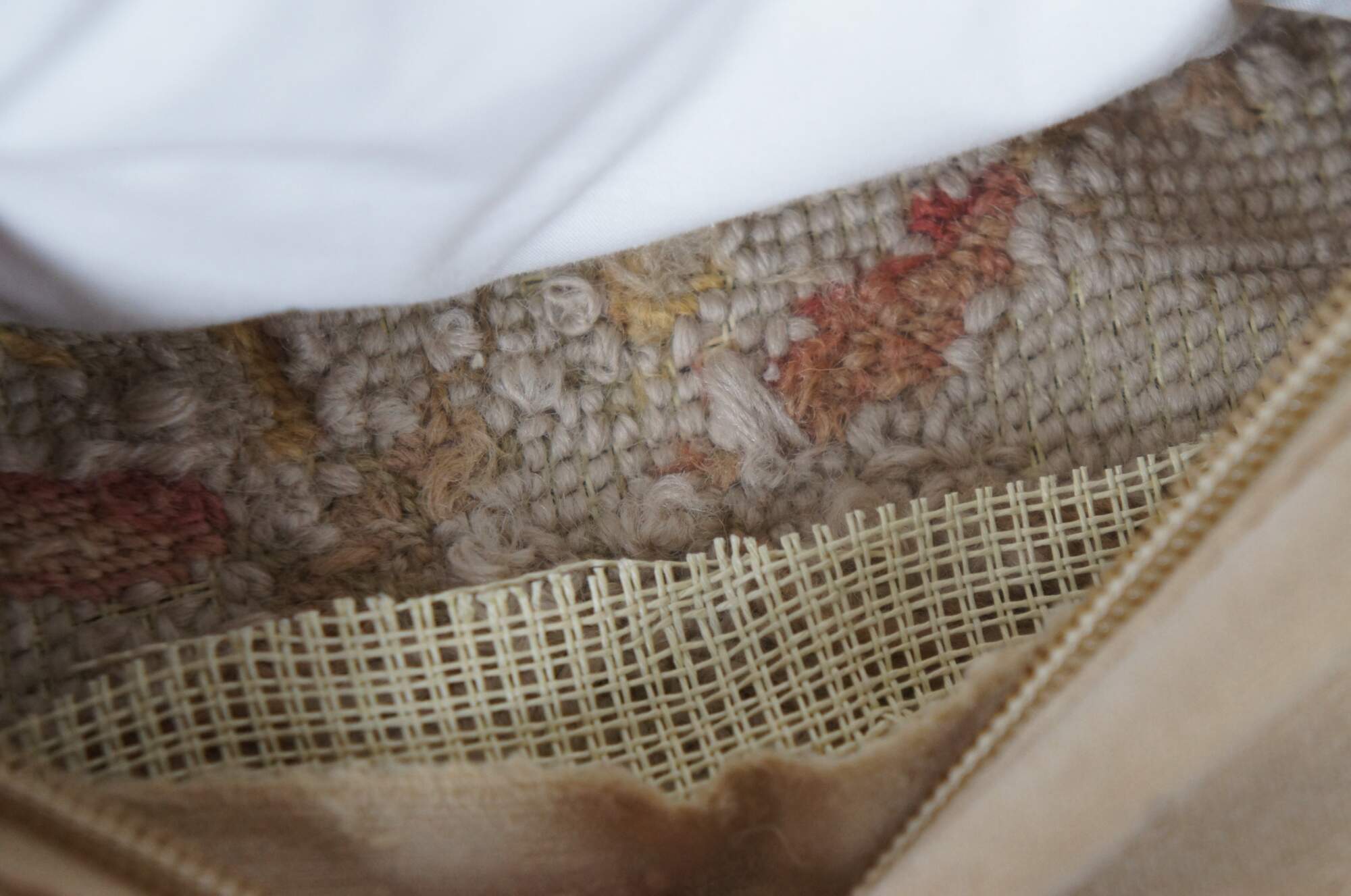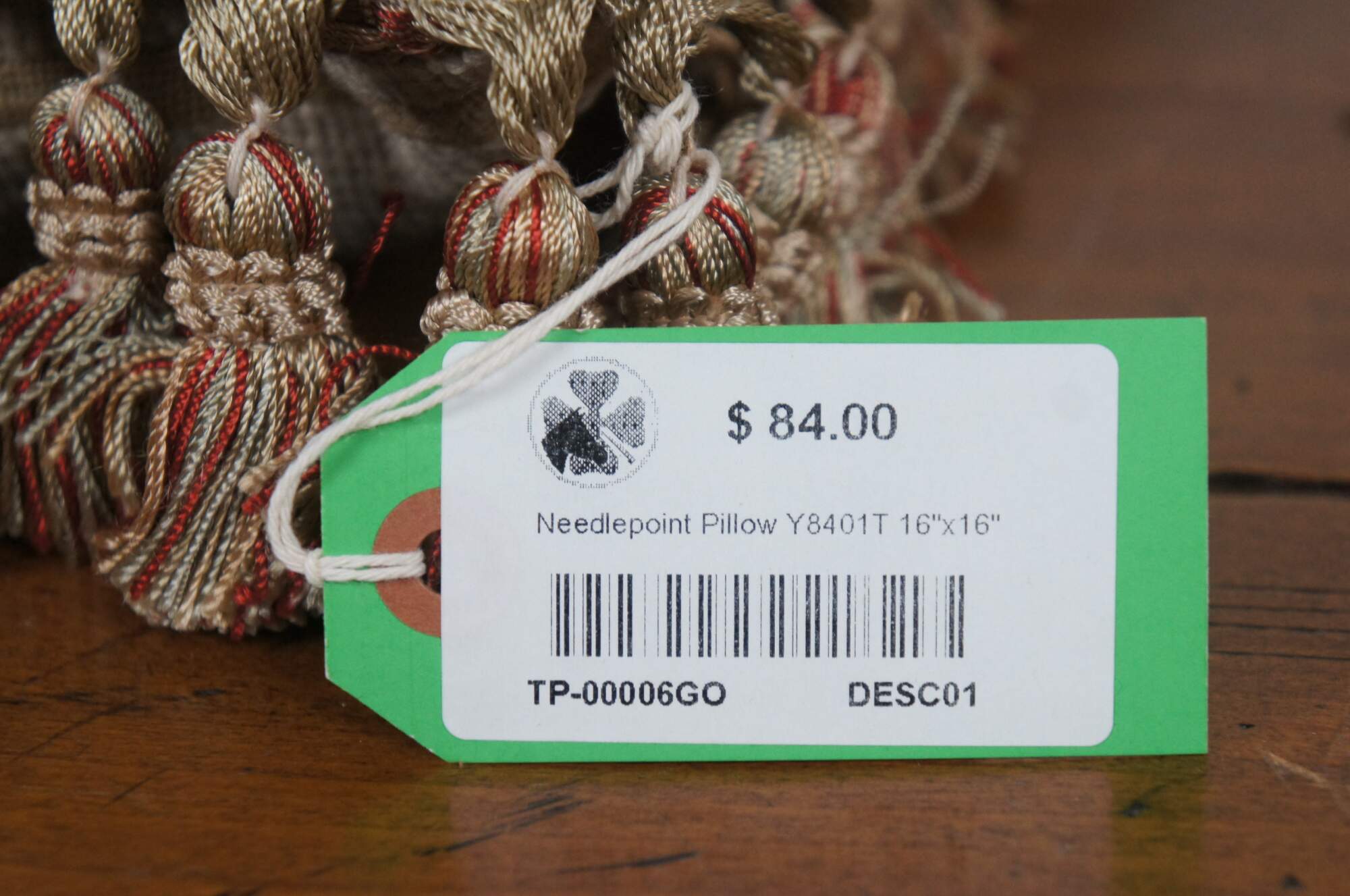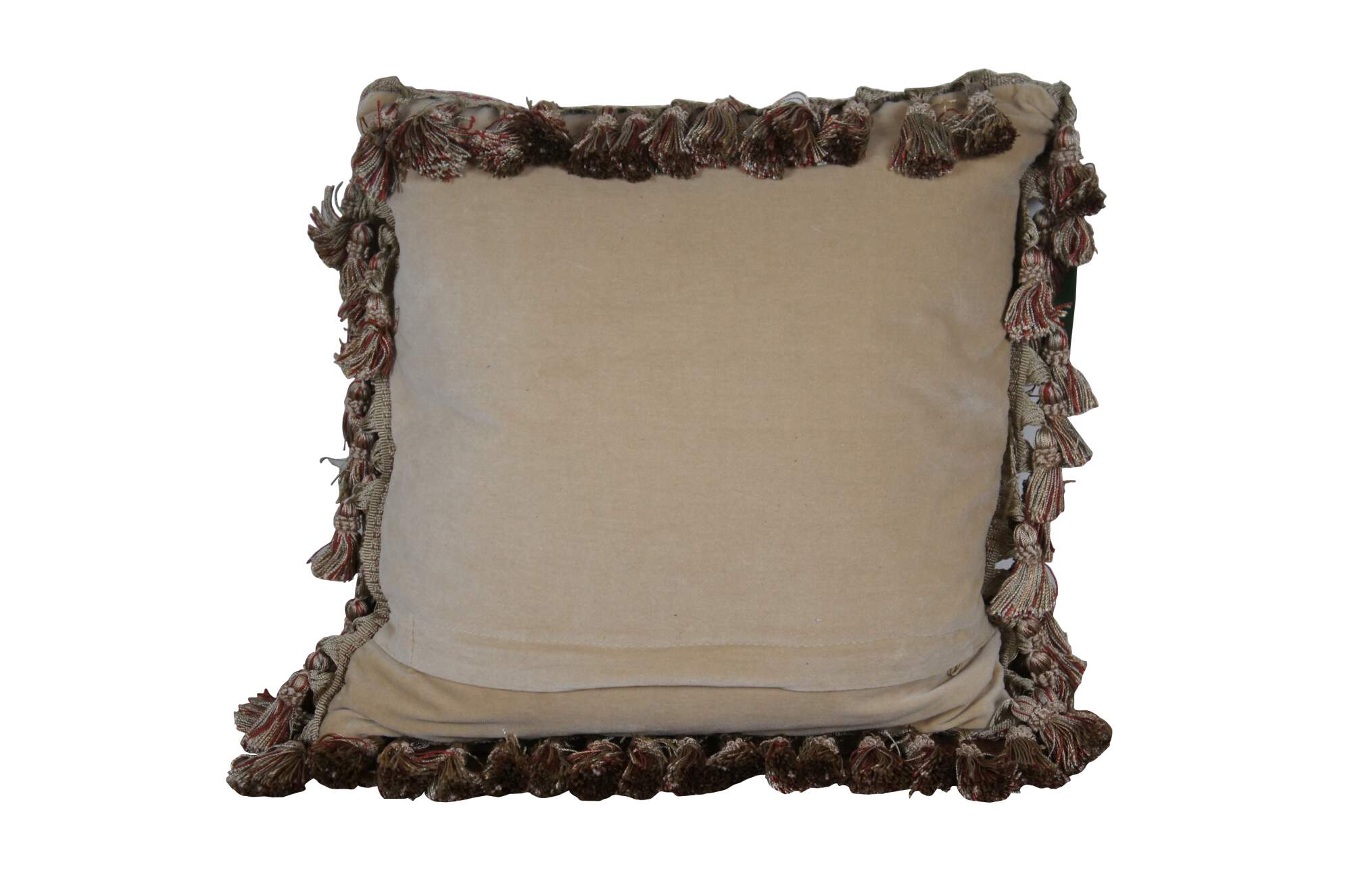20th century square needlepoint throw pillow, hand embroidered with roses, lilies and daisies in pink, blue, and yellow, divided with criss crossing vines. Rust / rose, gold, and beige tassel trim. Beige velour back with zipper closure. Down filled.