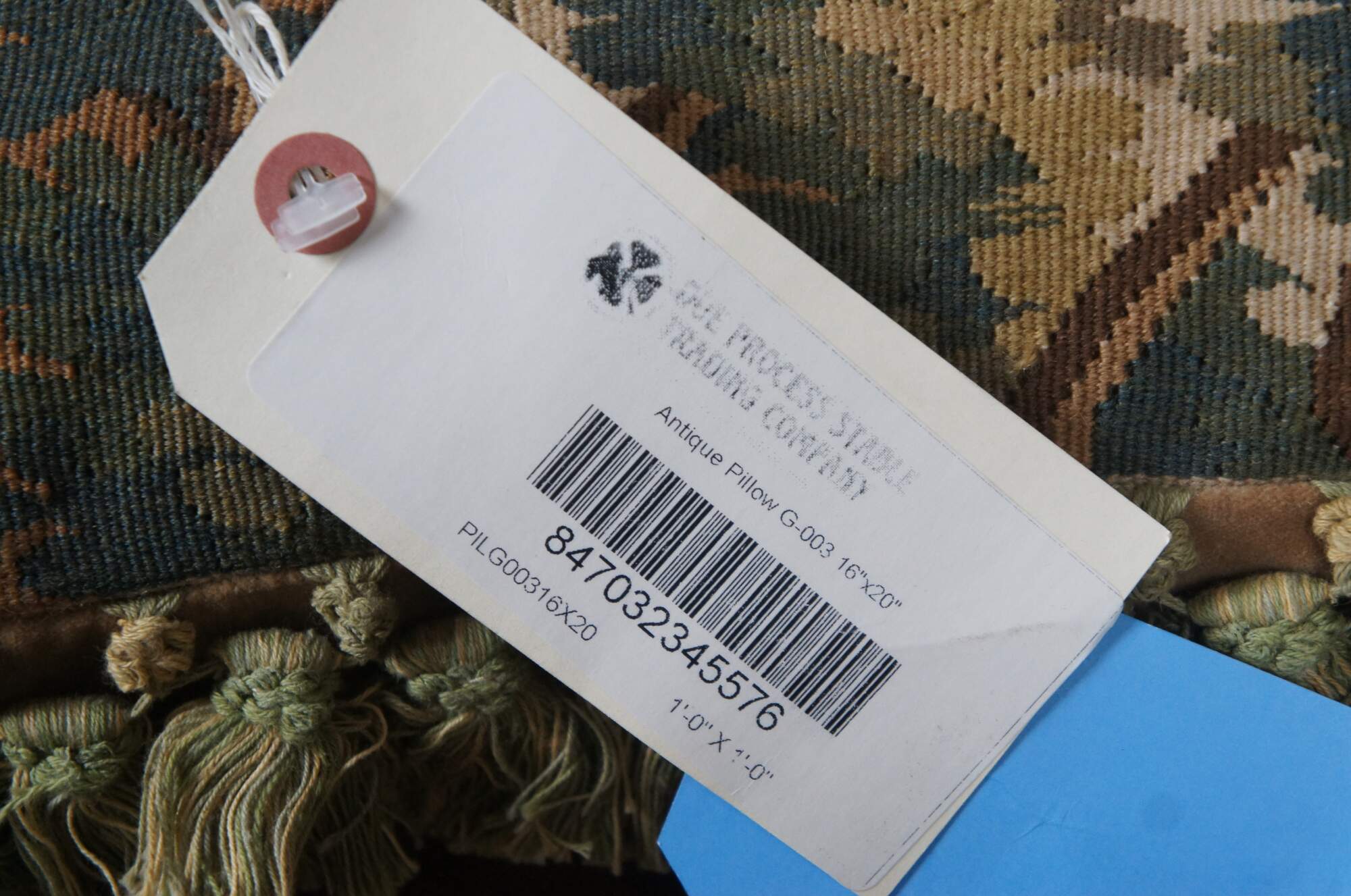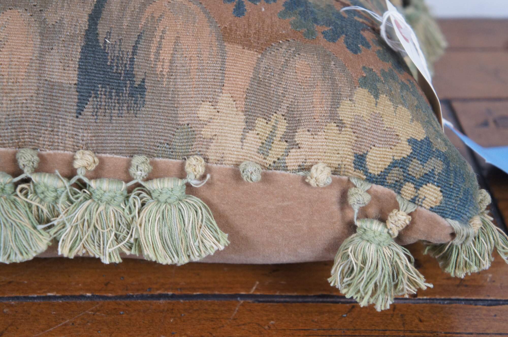 20th century French Aubusson style rectangular lumbar / throw pillow, embroidered with a cottage in a forested landscape, with a castle in the background. Cream and green tassel trim. Light brown velour back with zipper closure. Down filled.