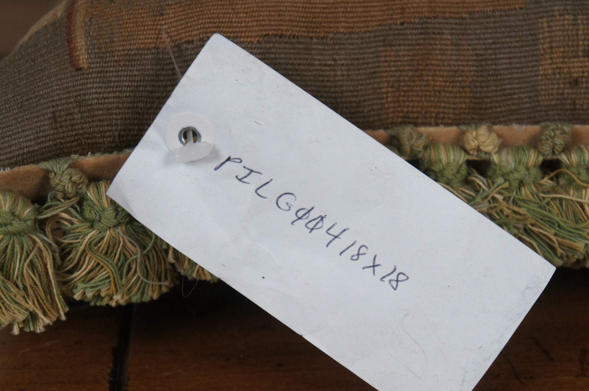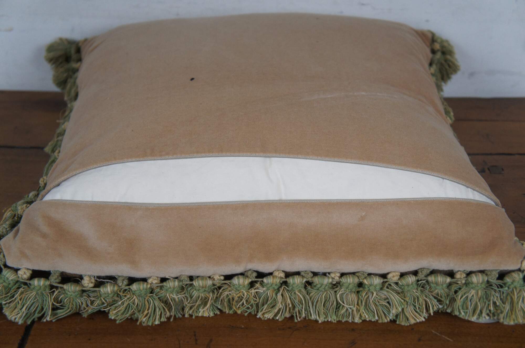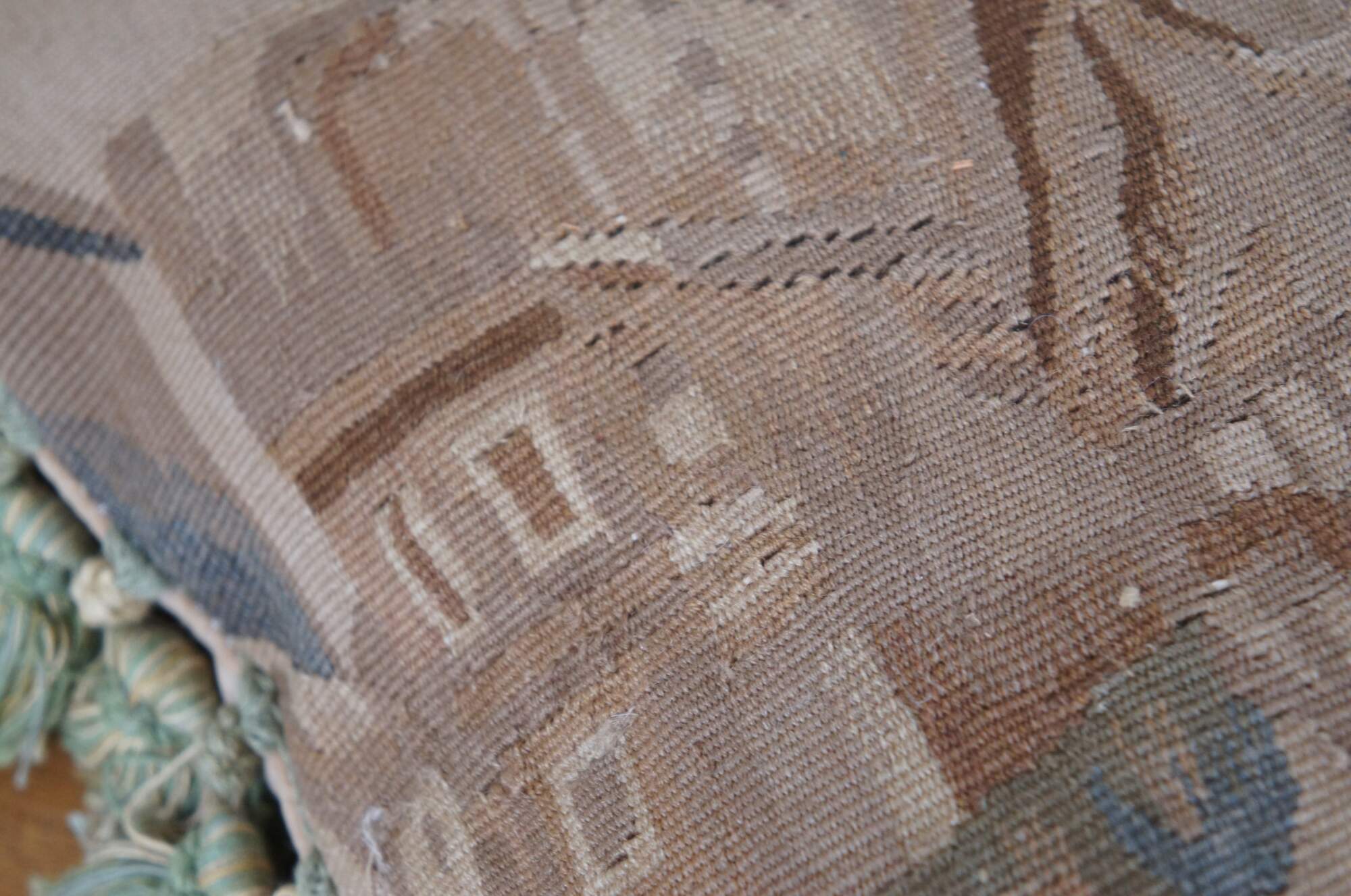 20th century French Aubusson style square throw pillow, embroidered in wool showing a cityscape along a river, framed with rocks and trees. Cream and green tassel trim. Light brown velour back with zipper closure. Down filled.