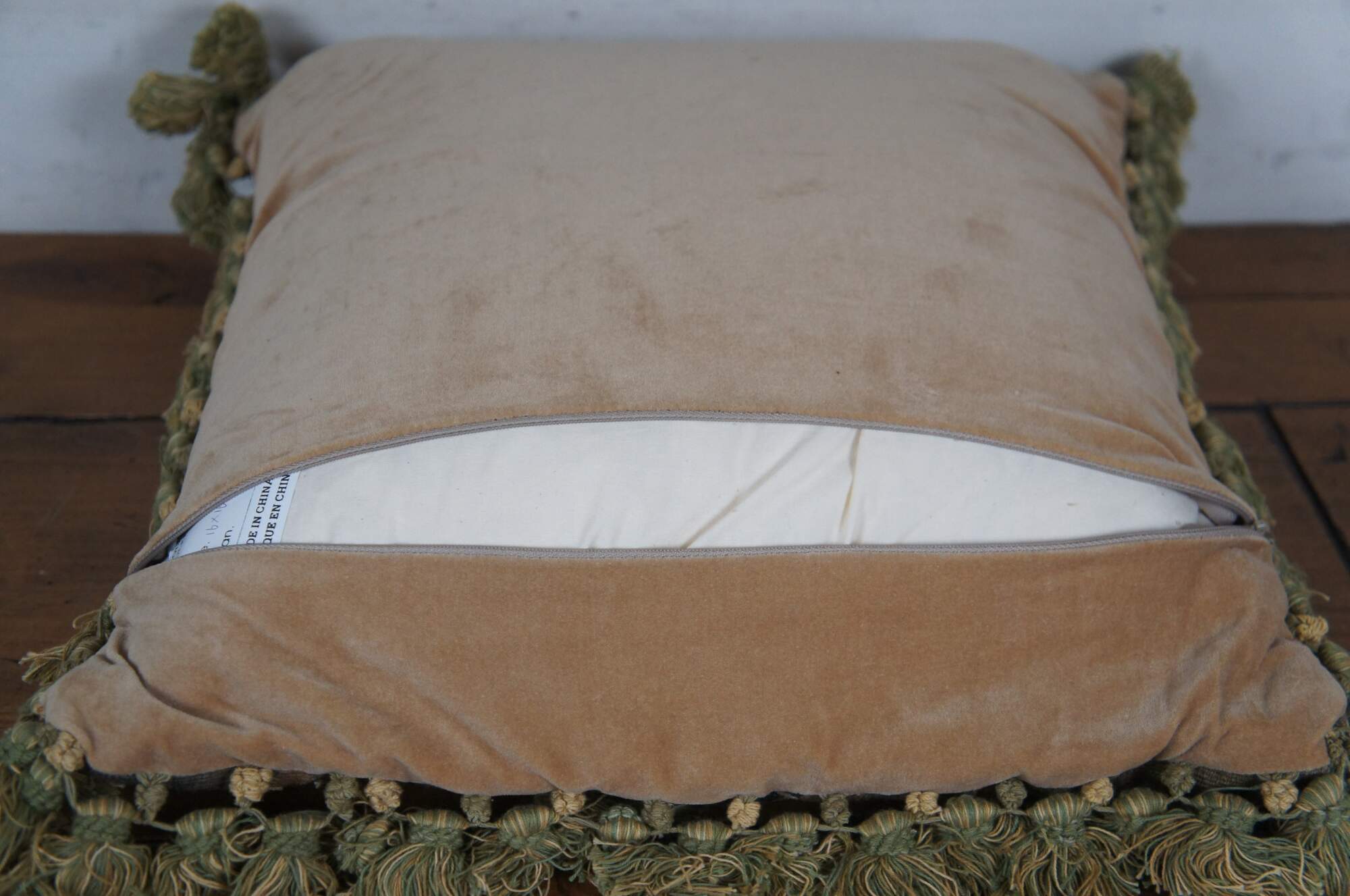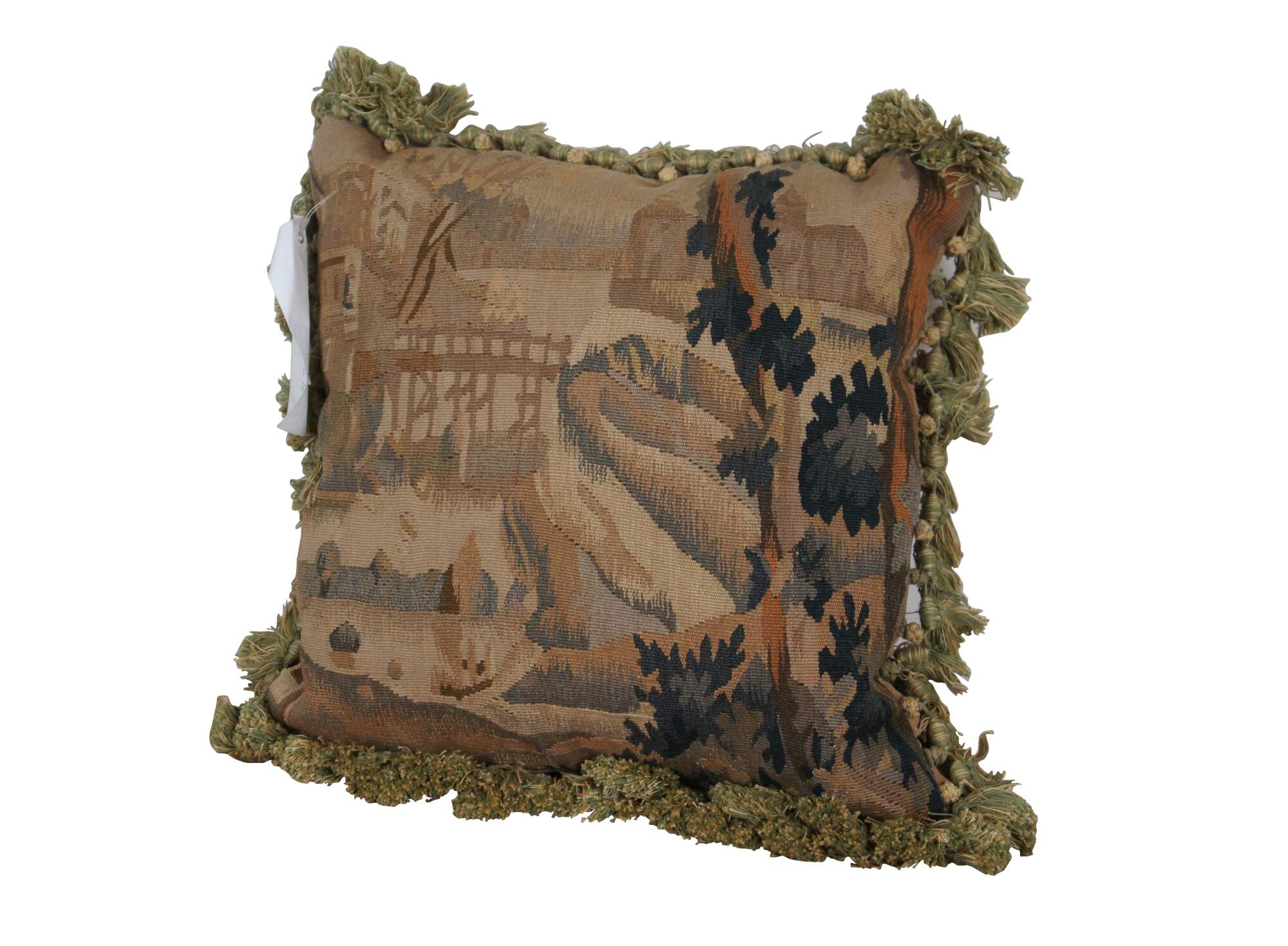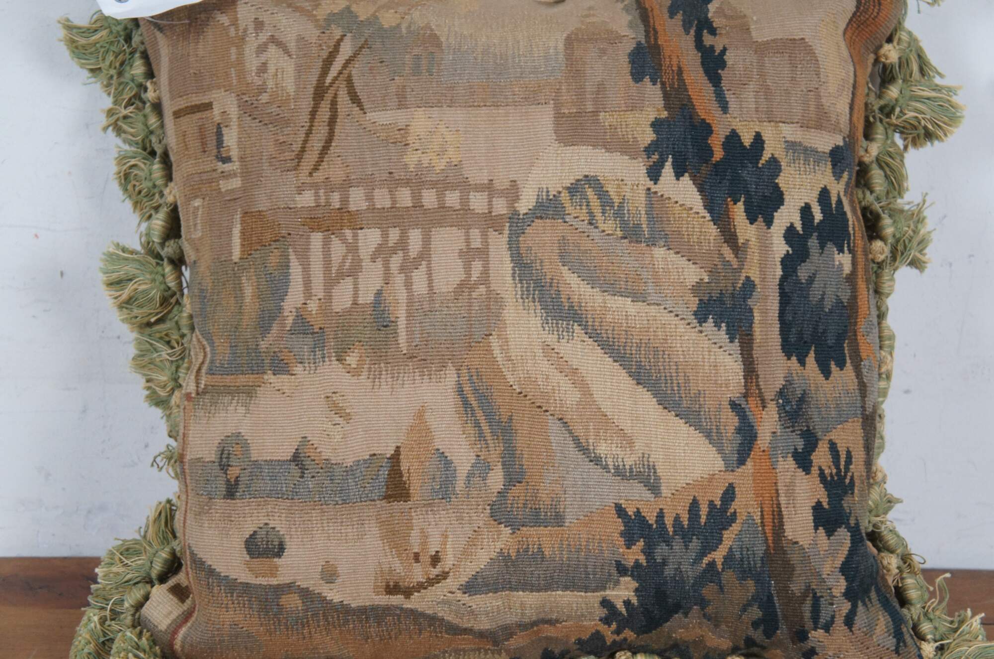 20th century French Aubusson style square throw pillow, embroidered in wool showing a cityscape along a river, framed with rocks and trees. Cream and green tassel trim. Light brown velour back with zipper closure. Down filled.