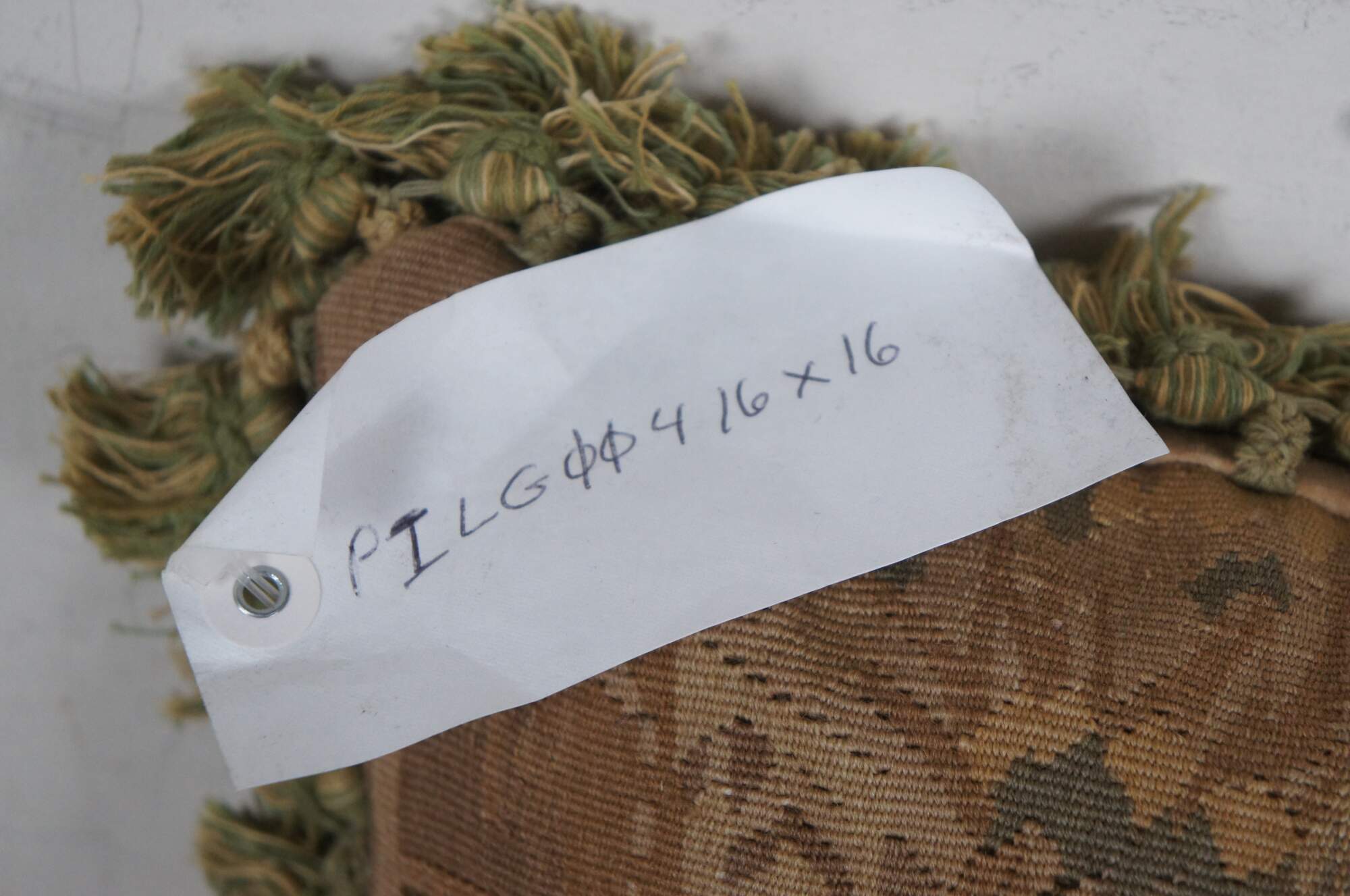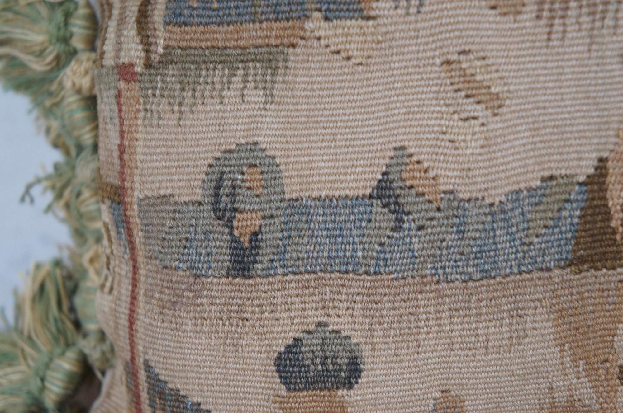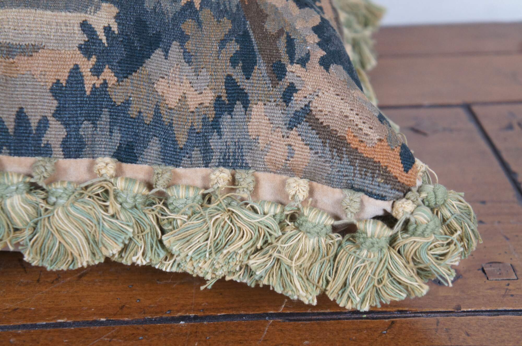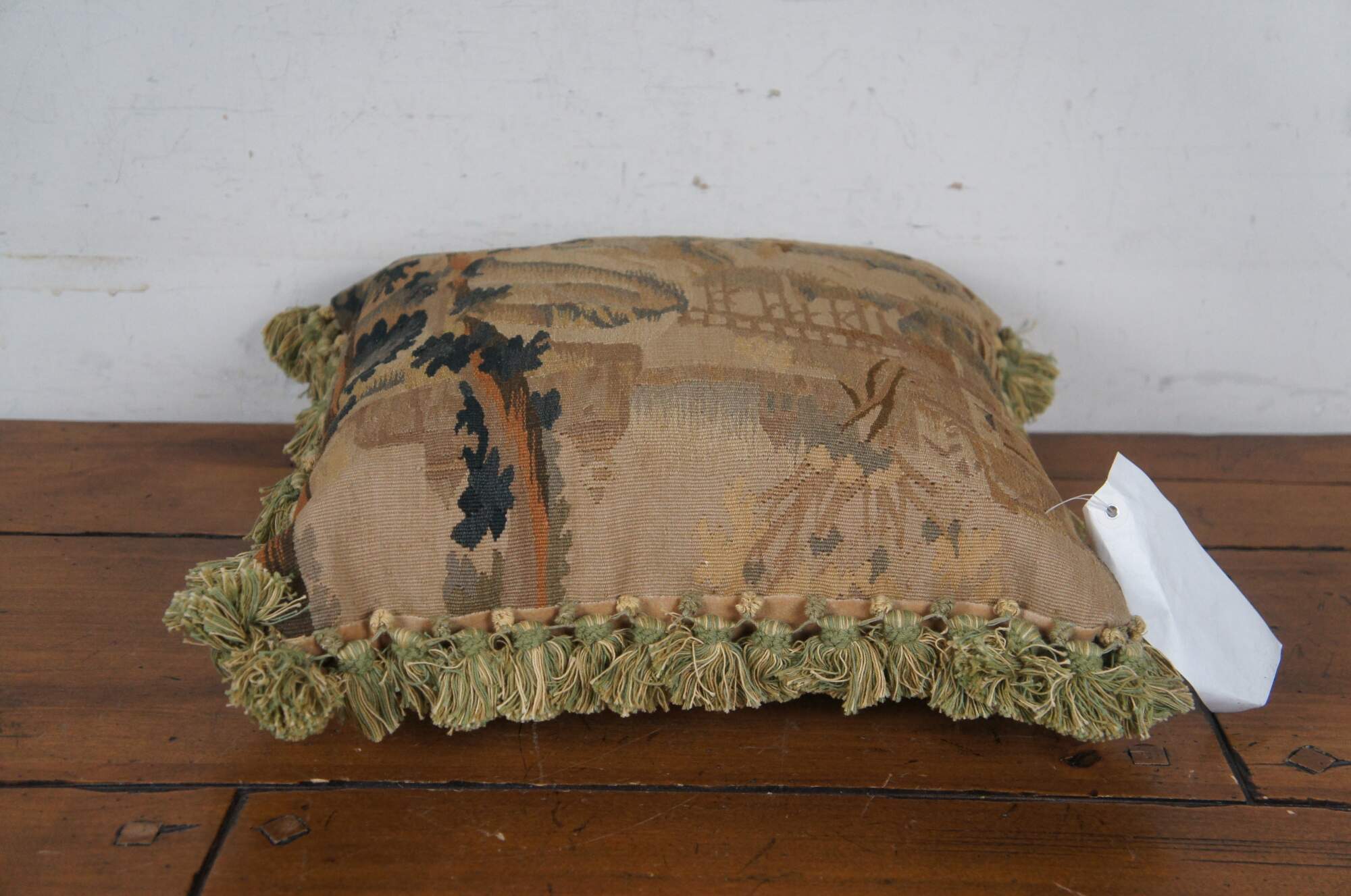 20th century French Aubusson style square throw pillow, embroidered in wool showing a cityscape along a river, framed with rocks and trees. Cream and green tassel trim. Light brown velour back with zipper closure. Down filled.