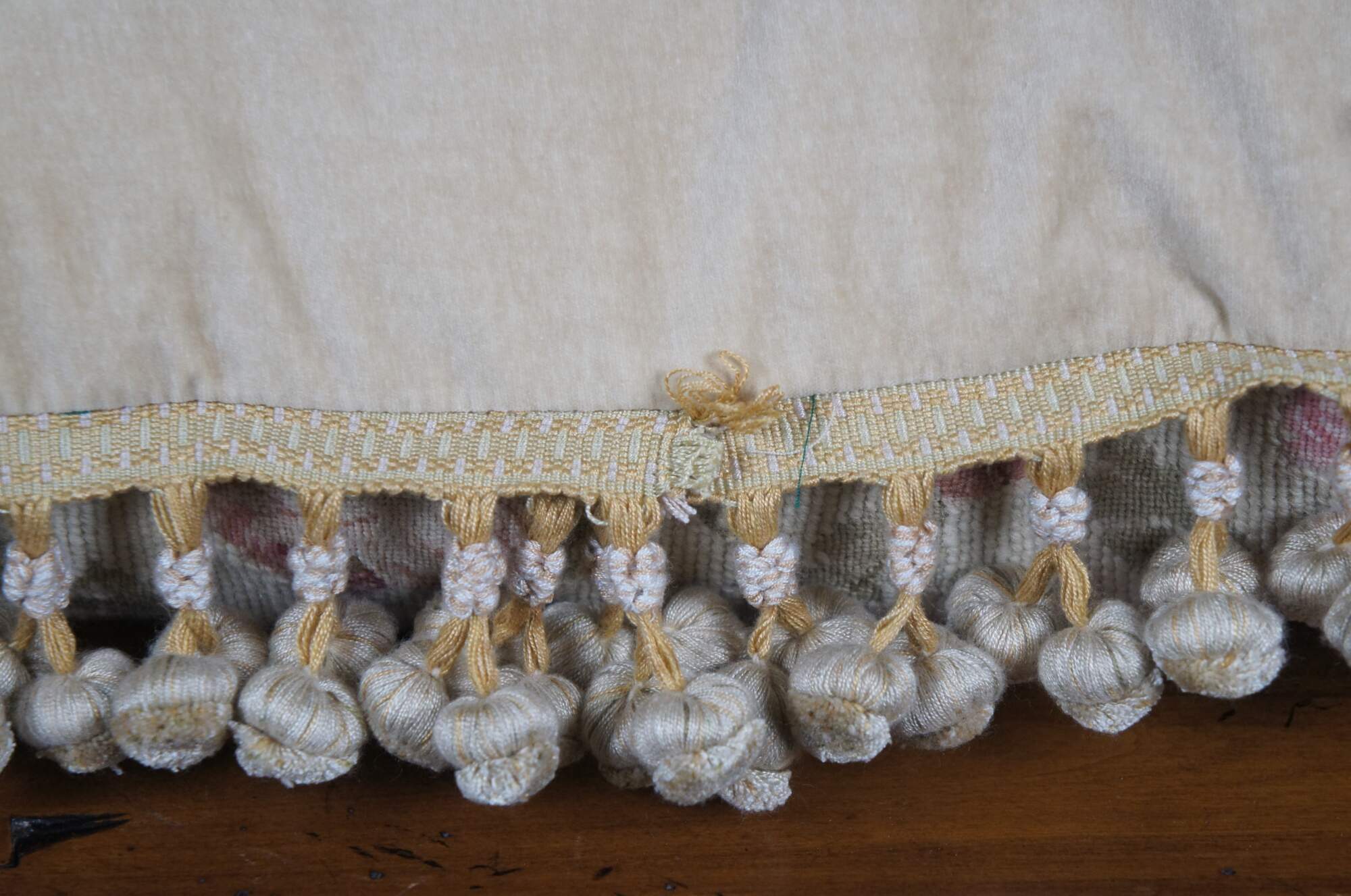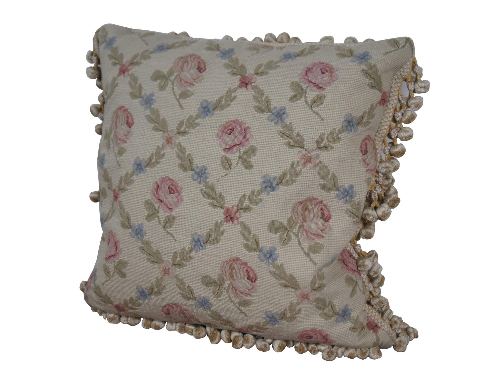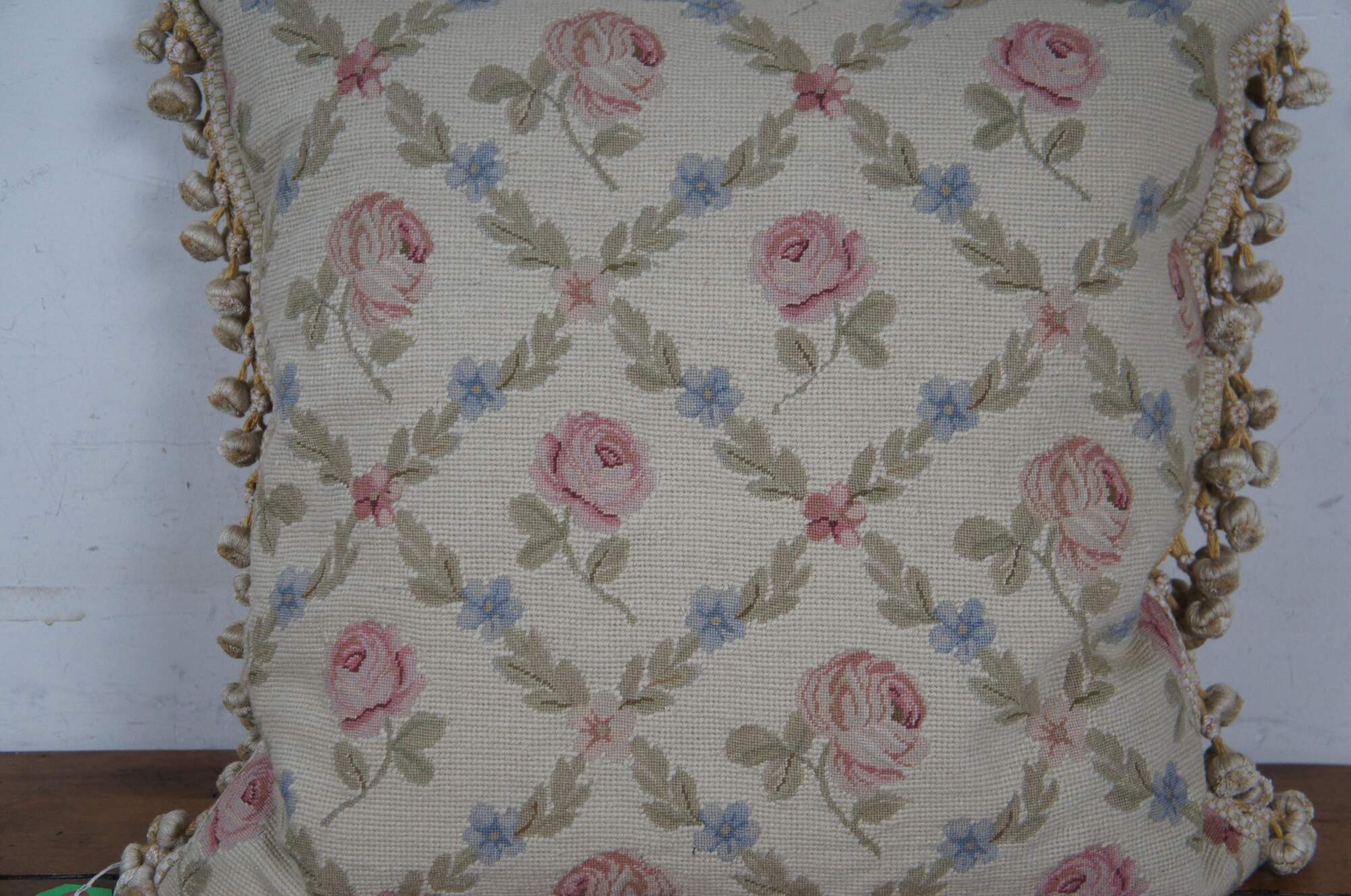 20th century square needlepoint throw pillow, hand embroidered with a pattern of pink roses, divided by criss crossing lines of pink and blue flowers and leaves, on a slightly yellow beige background. Cream and gold ball tassel trim. Cream velour back with zipper closure. Down filled.