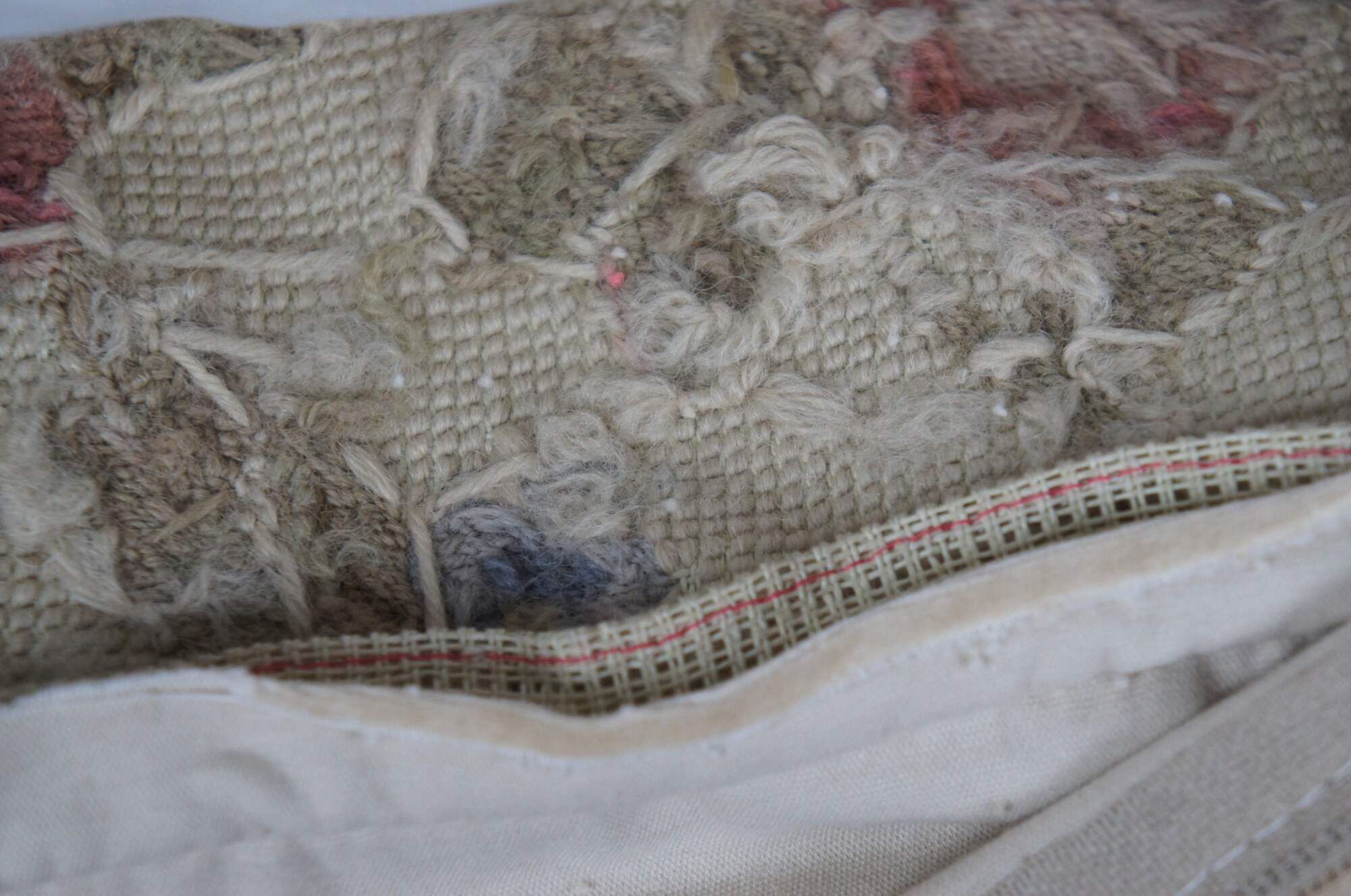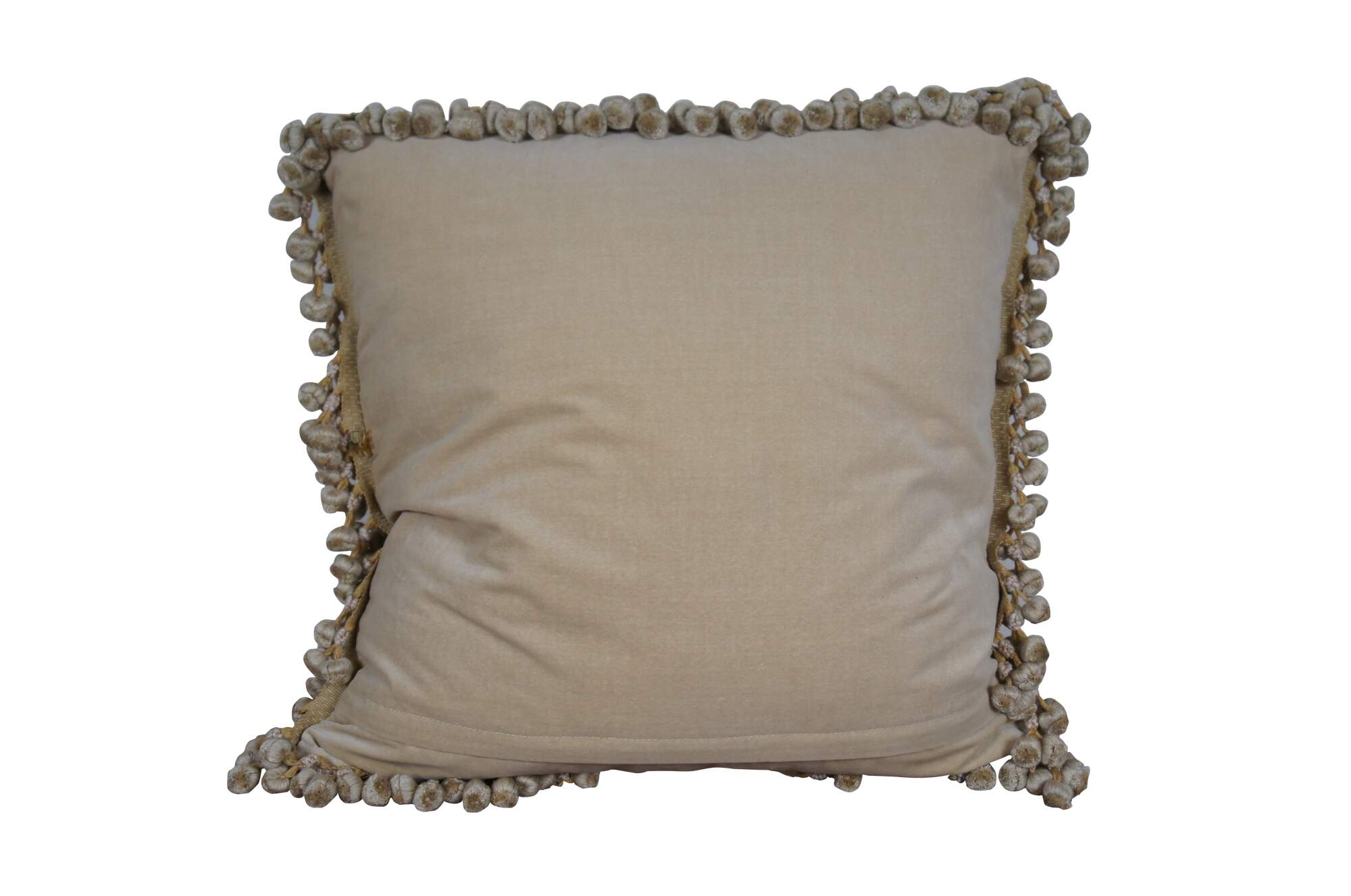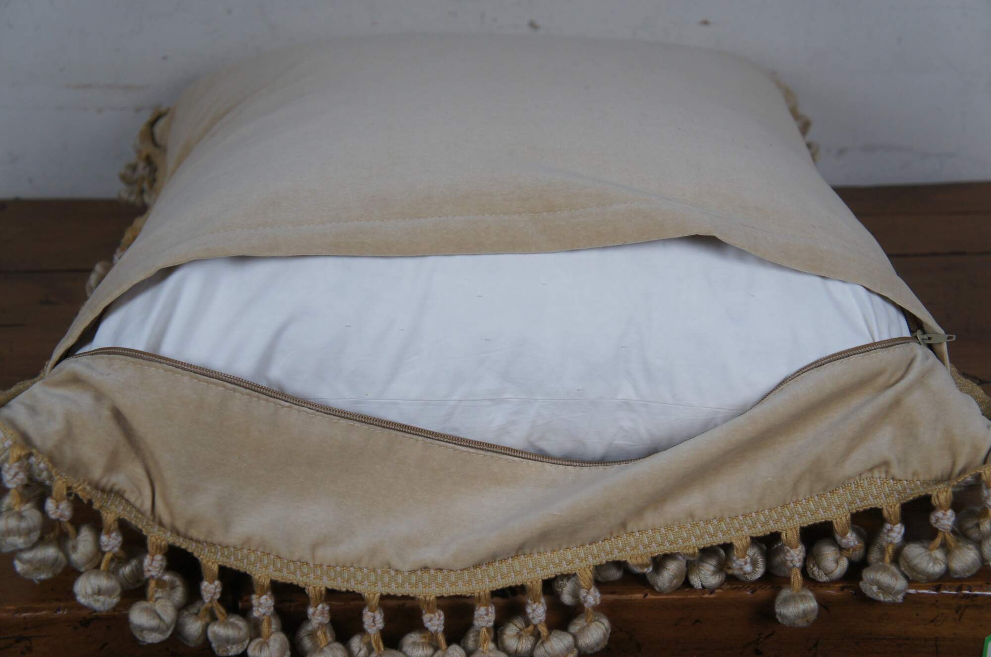 20th century square needlepoint throw pillow, hand embroidered with a pattern of pink roses, divided by criss crossing lines of pink and blue flowers and leaves, on a slightly yellow beige background. Cream and gold ball tassel trim. Cream velour back with zipper closure. Down filled.