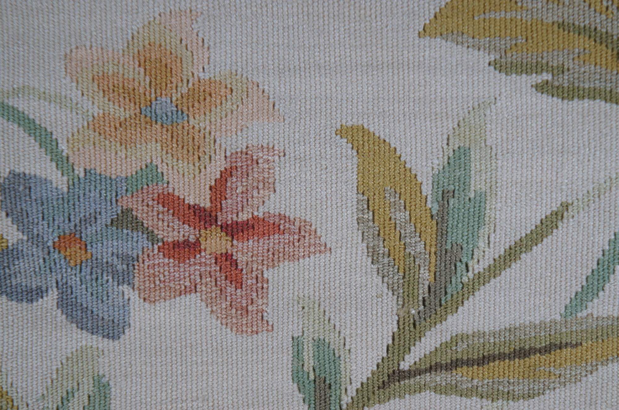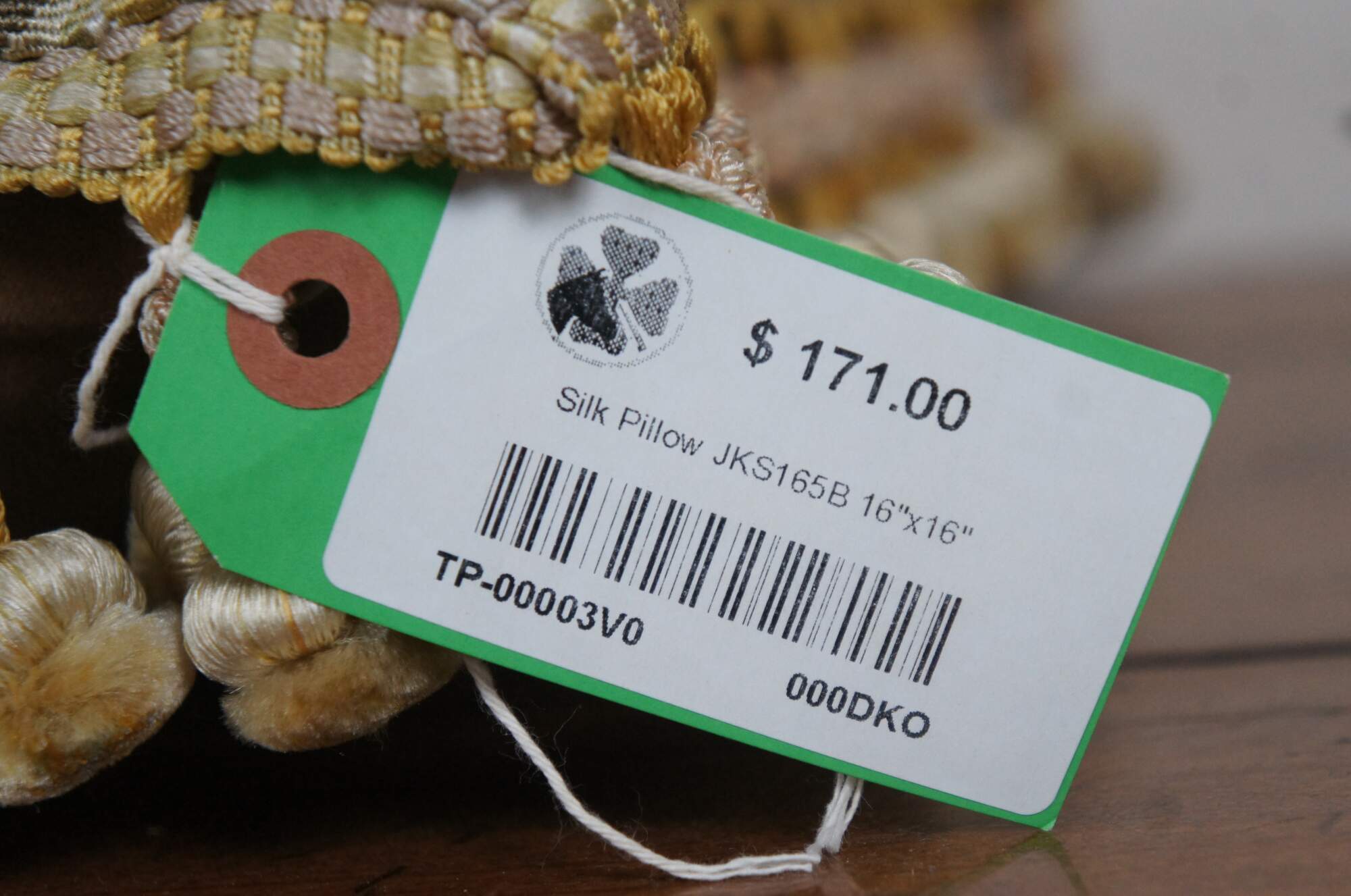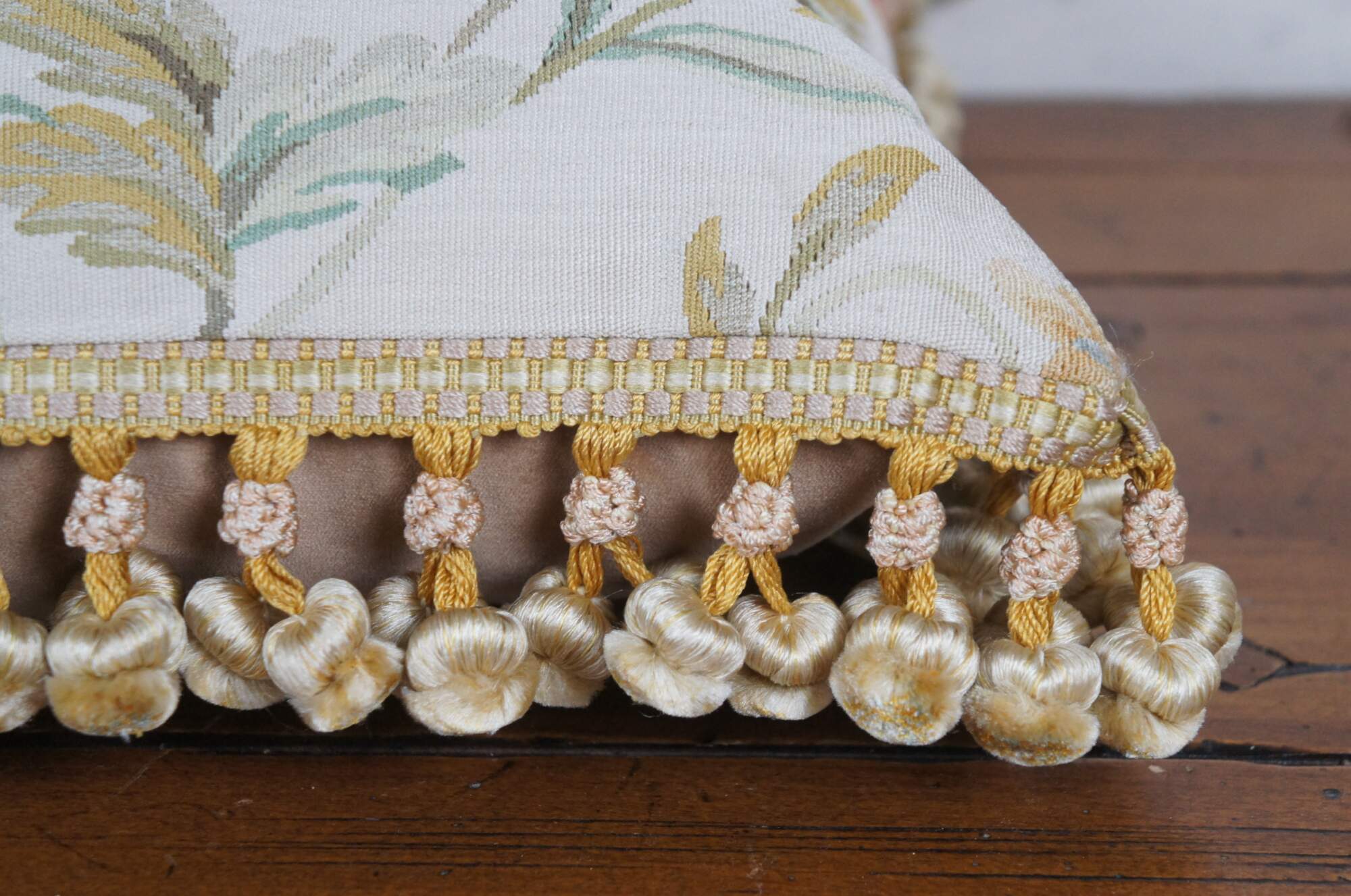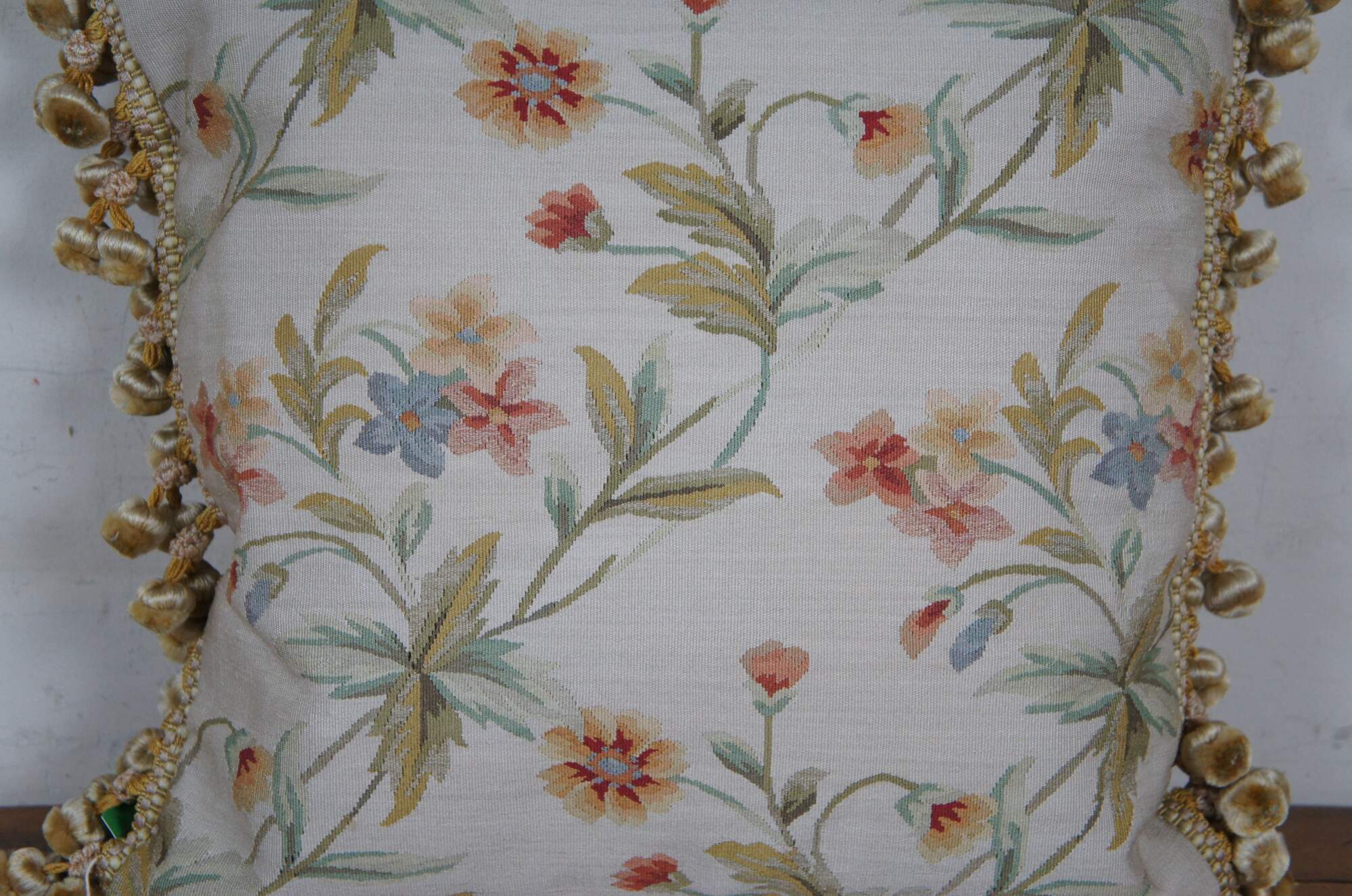 2 Available - 20th century square throw pillow, embroidered in silk with an array of cream, rusty pink, and blue flowers on green leafy stems. Gold and cream tassel trim. Light brown velour back with zipper closure. Down filled.