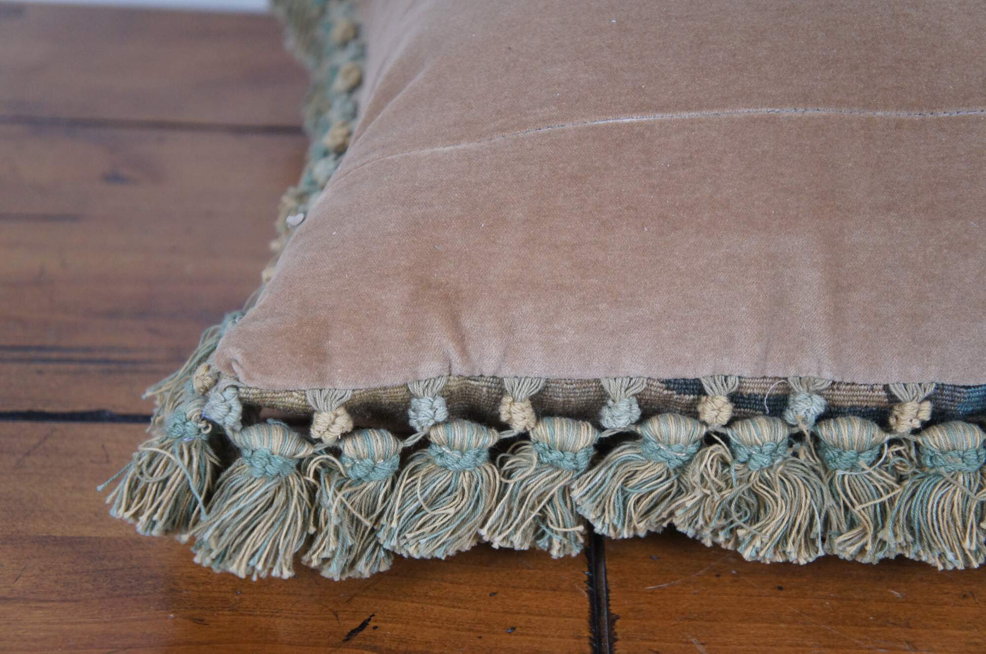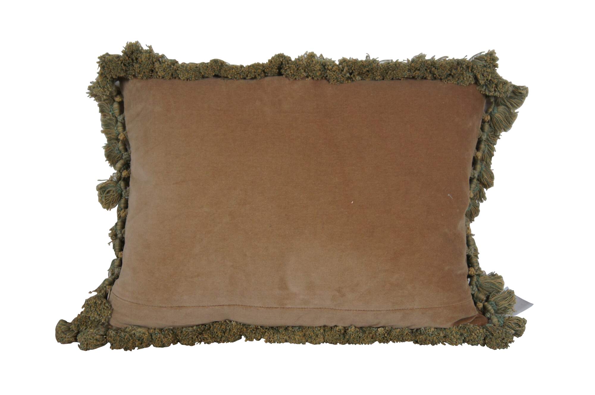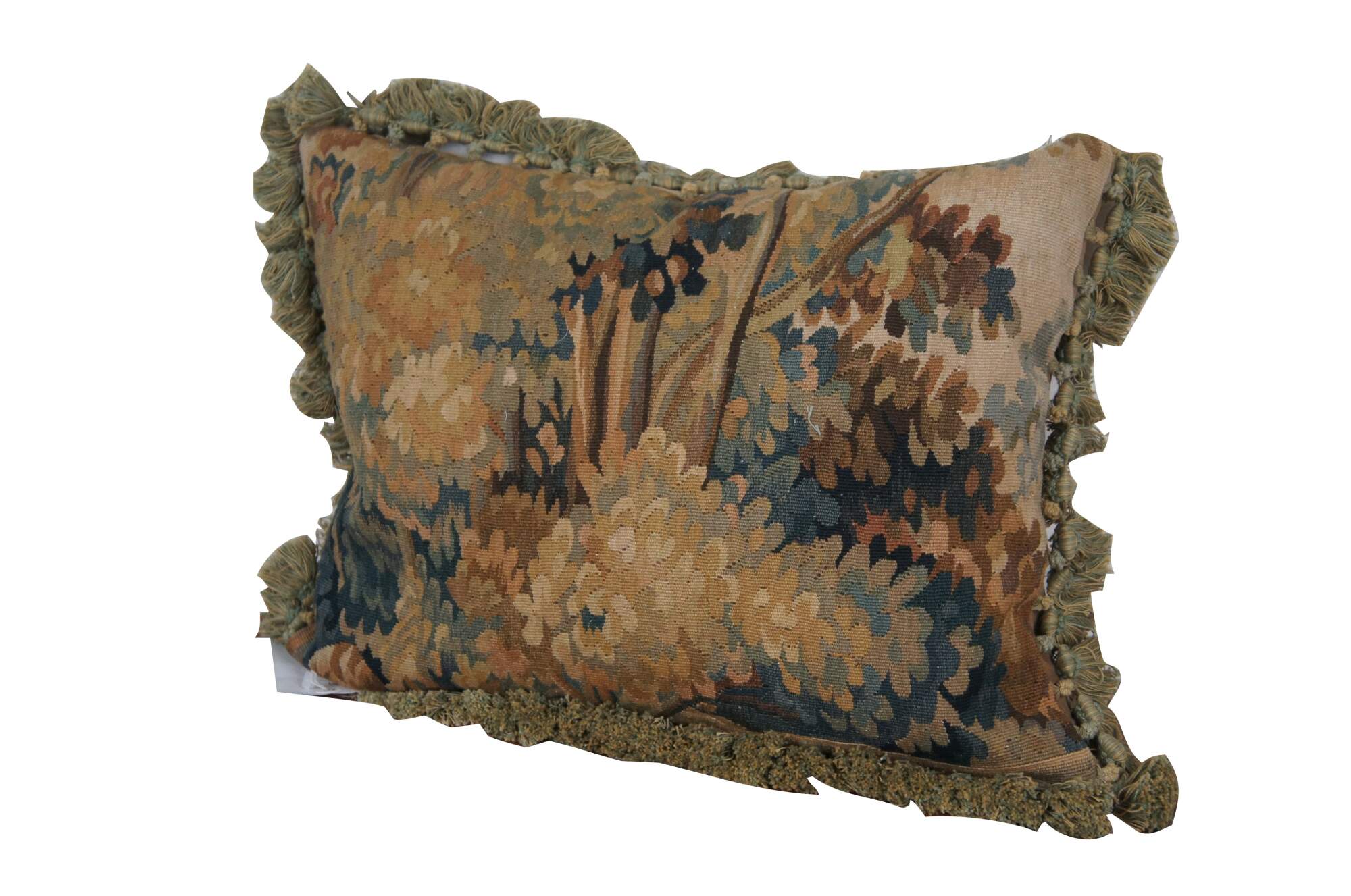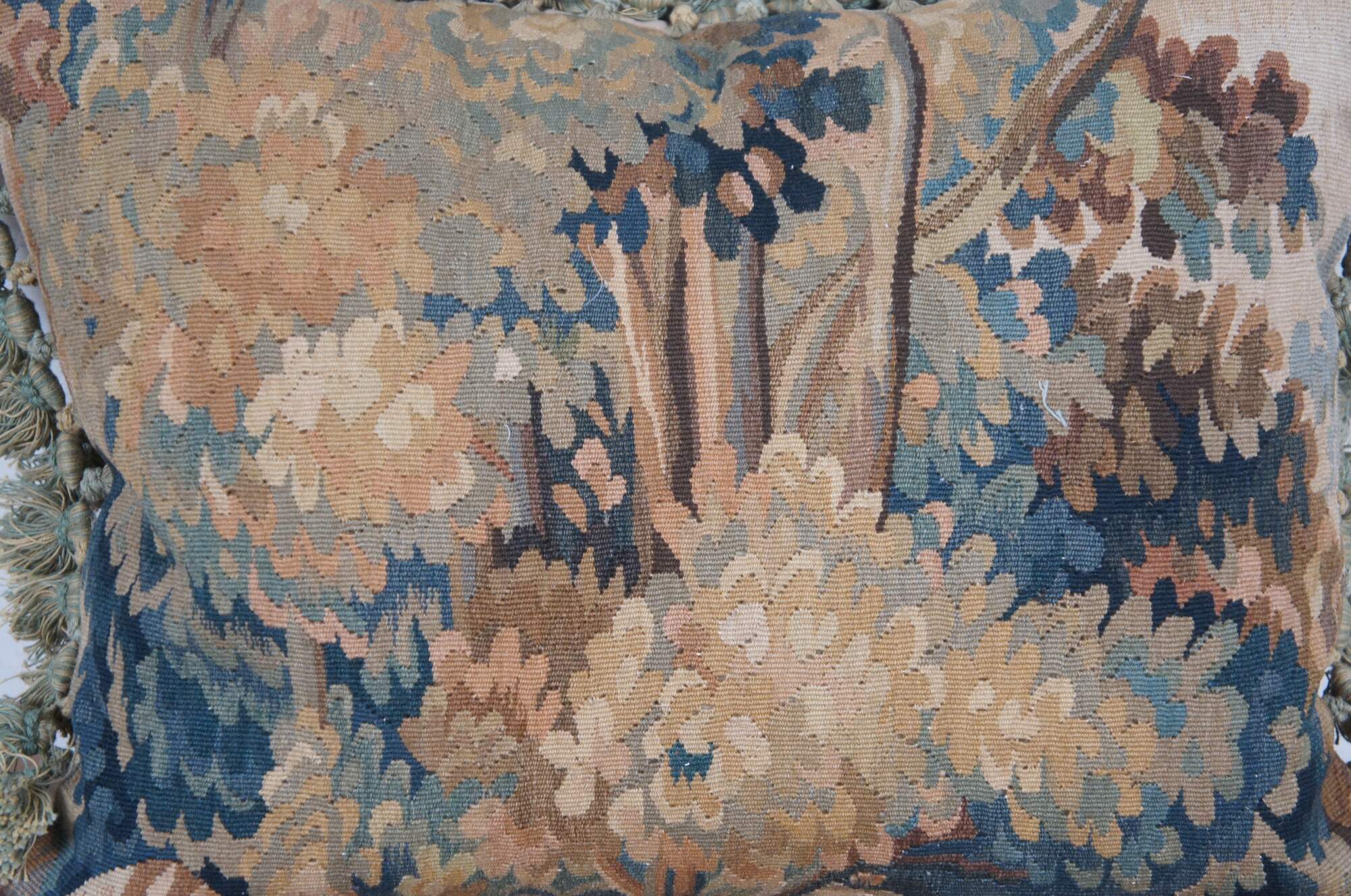 2 Available - 20th century rectangular lumbar / throw pillow, embroidered with an Impressionist forest landscape. Green and beige tassel trim. Beige velour back with zipper closure. Down filled.