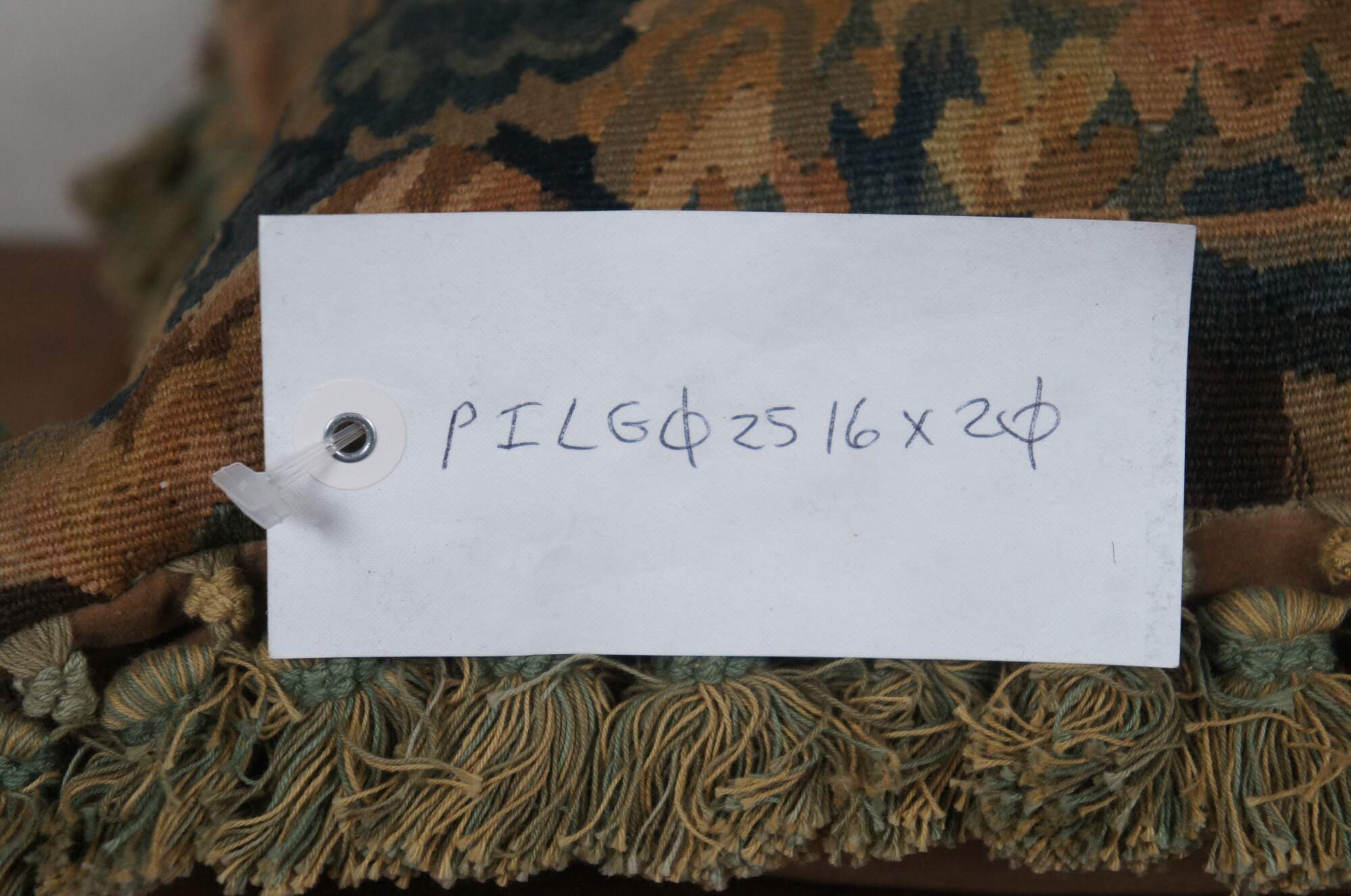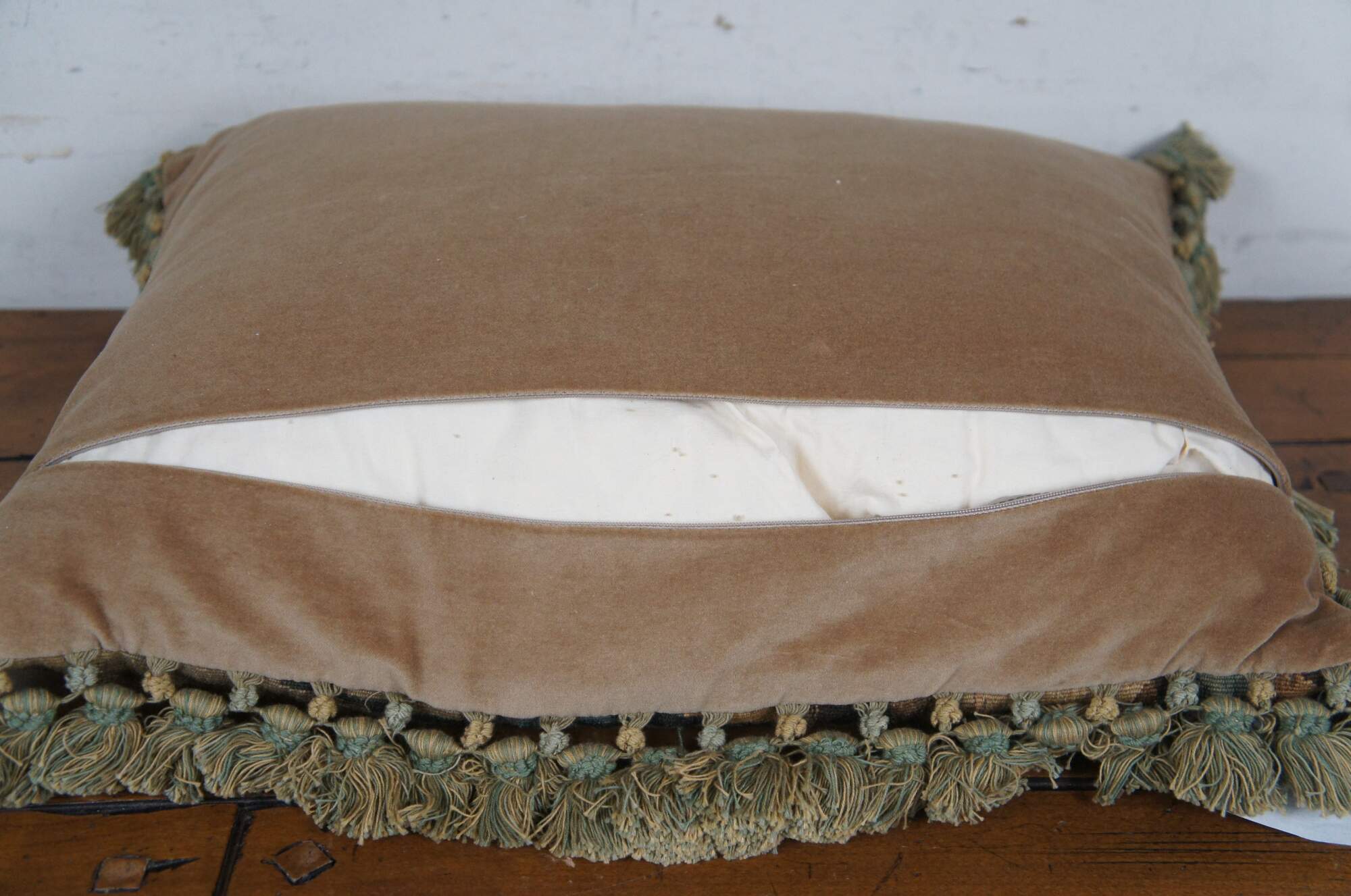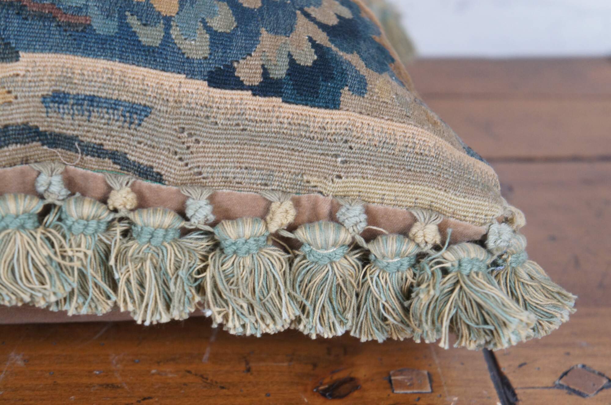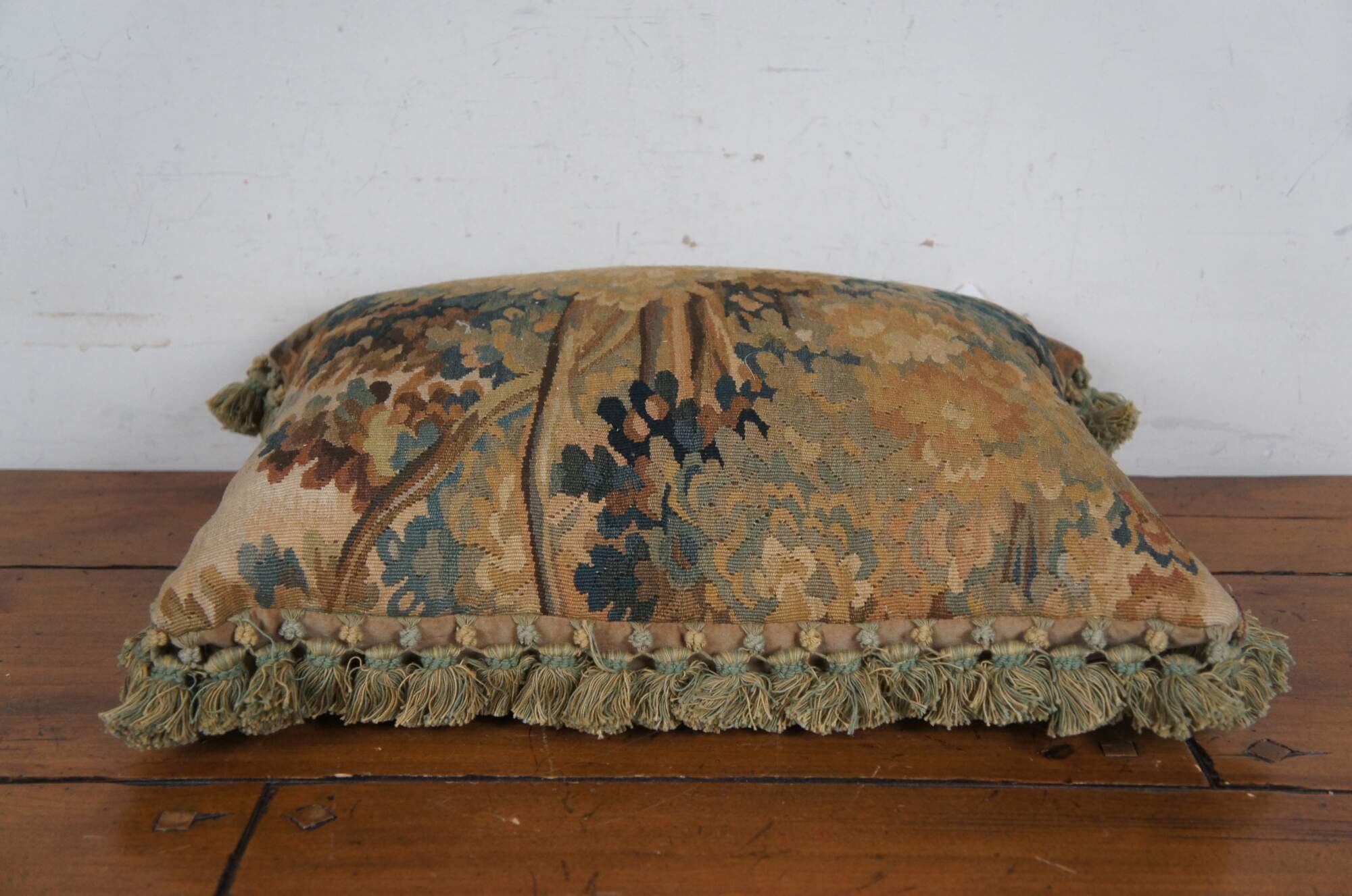 2 Available - 20th century rectangular lumbar / throw pillow, embroidered with an Impressionist forest landscape. Green and beige tassel trim. Beige velour back with zipper closure. Down filled.