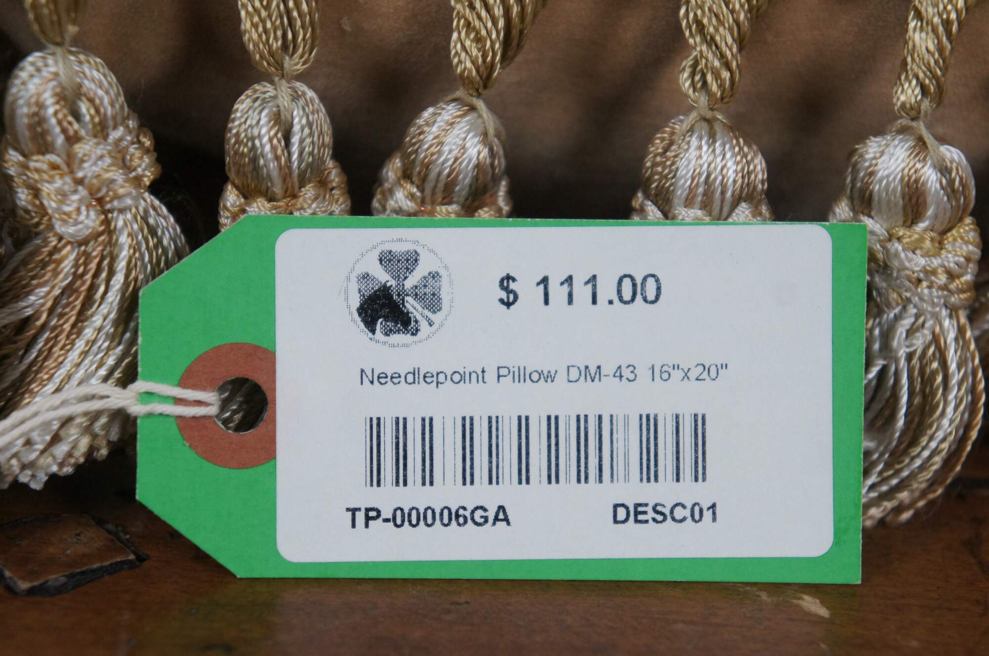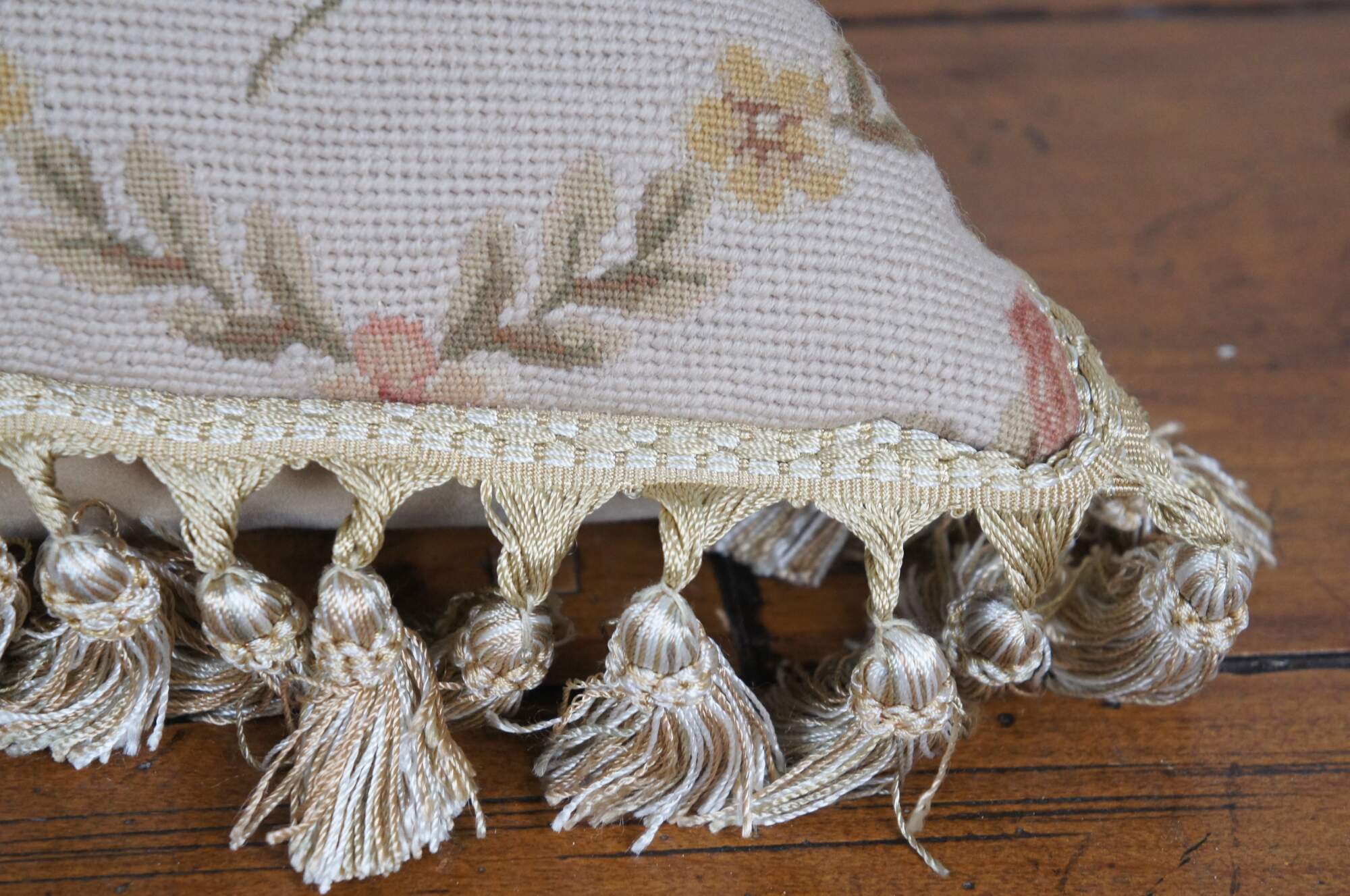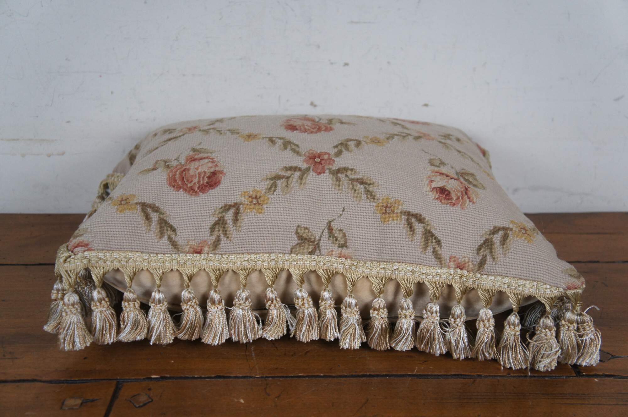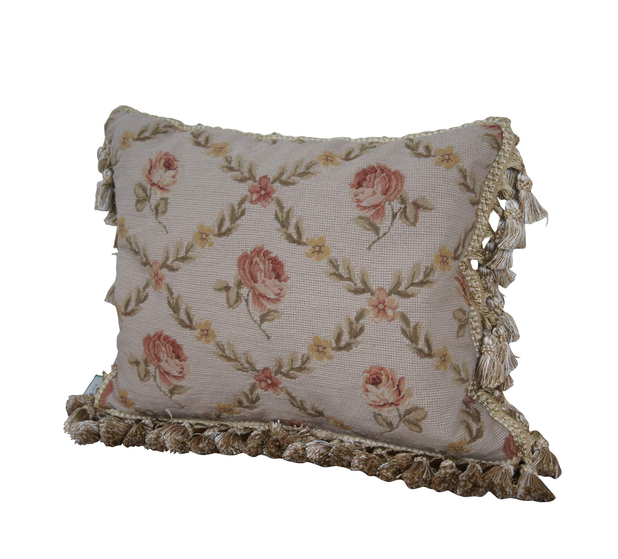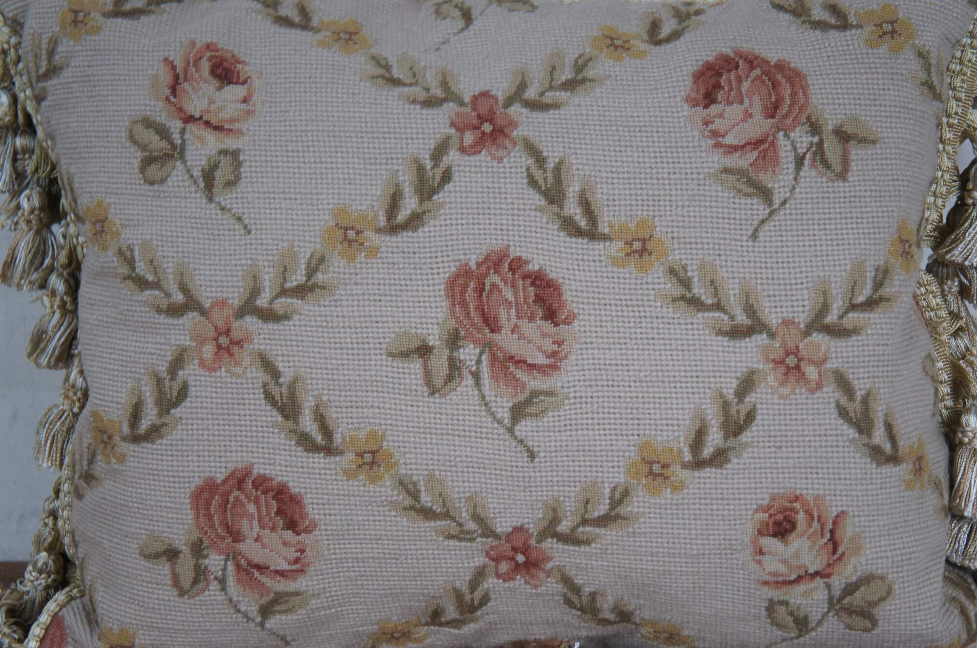2 Available - 20th century square needlepoint throw pillow, hand embroidered with a pattern of pink roses, divided by criss crossing lines of pink and yellow flowers and leaves, on a beige background. Cream and gold tassel trim. Beige velour back with zipper closure. Down filled.
