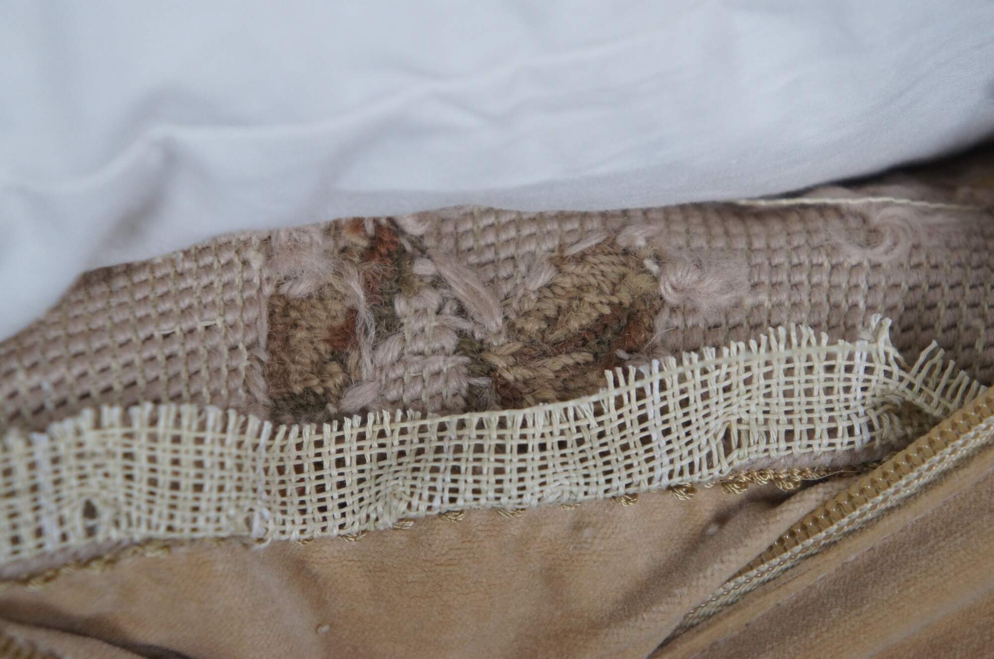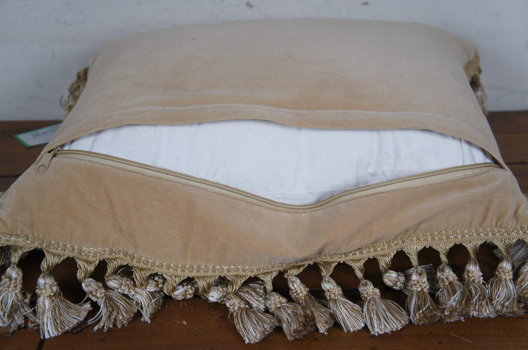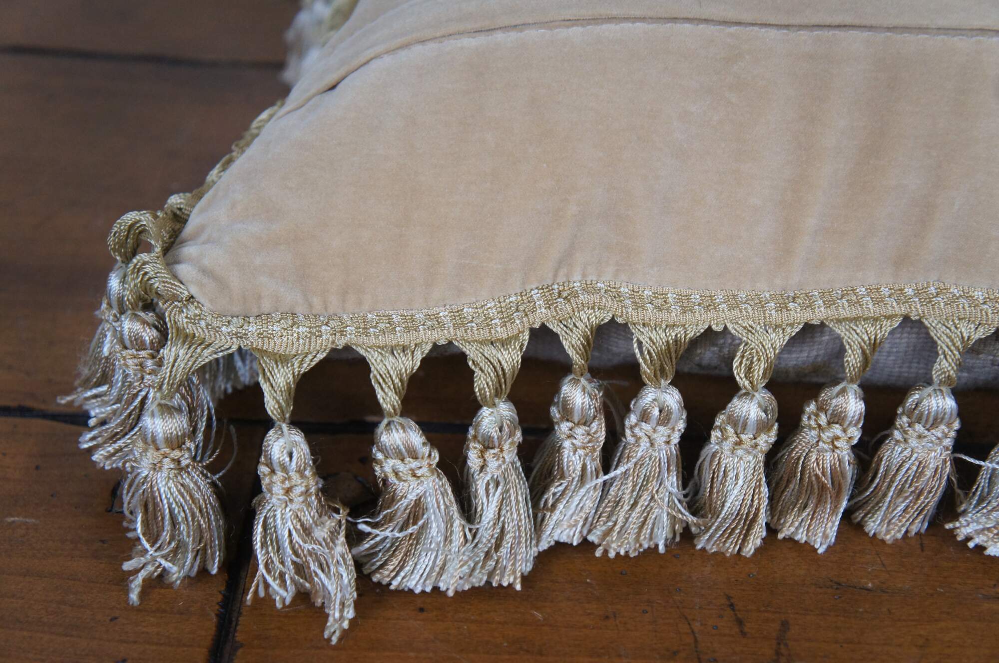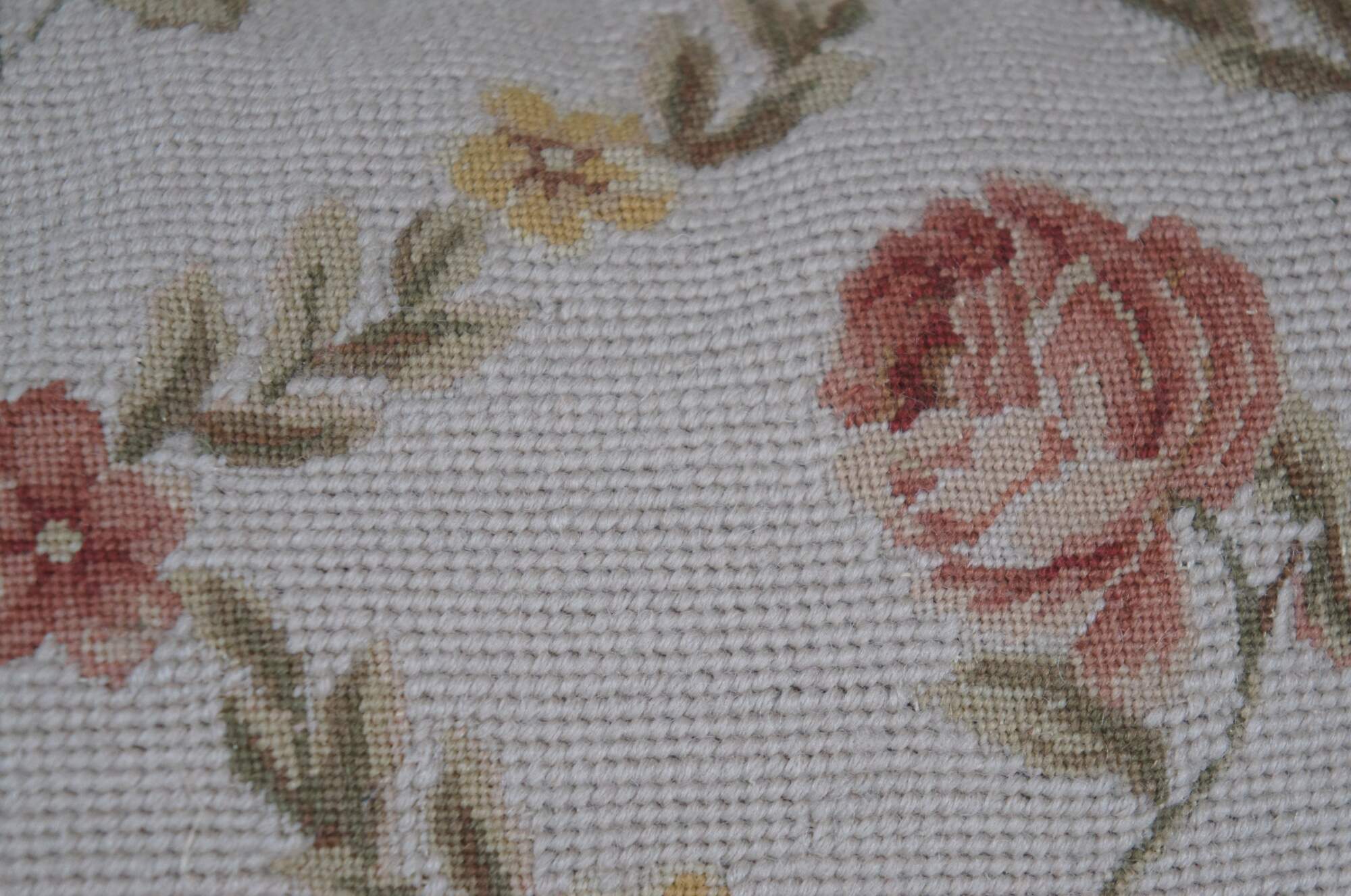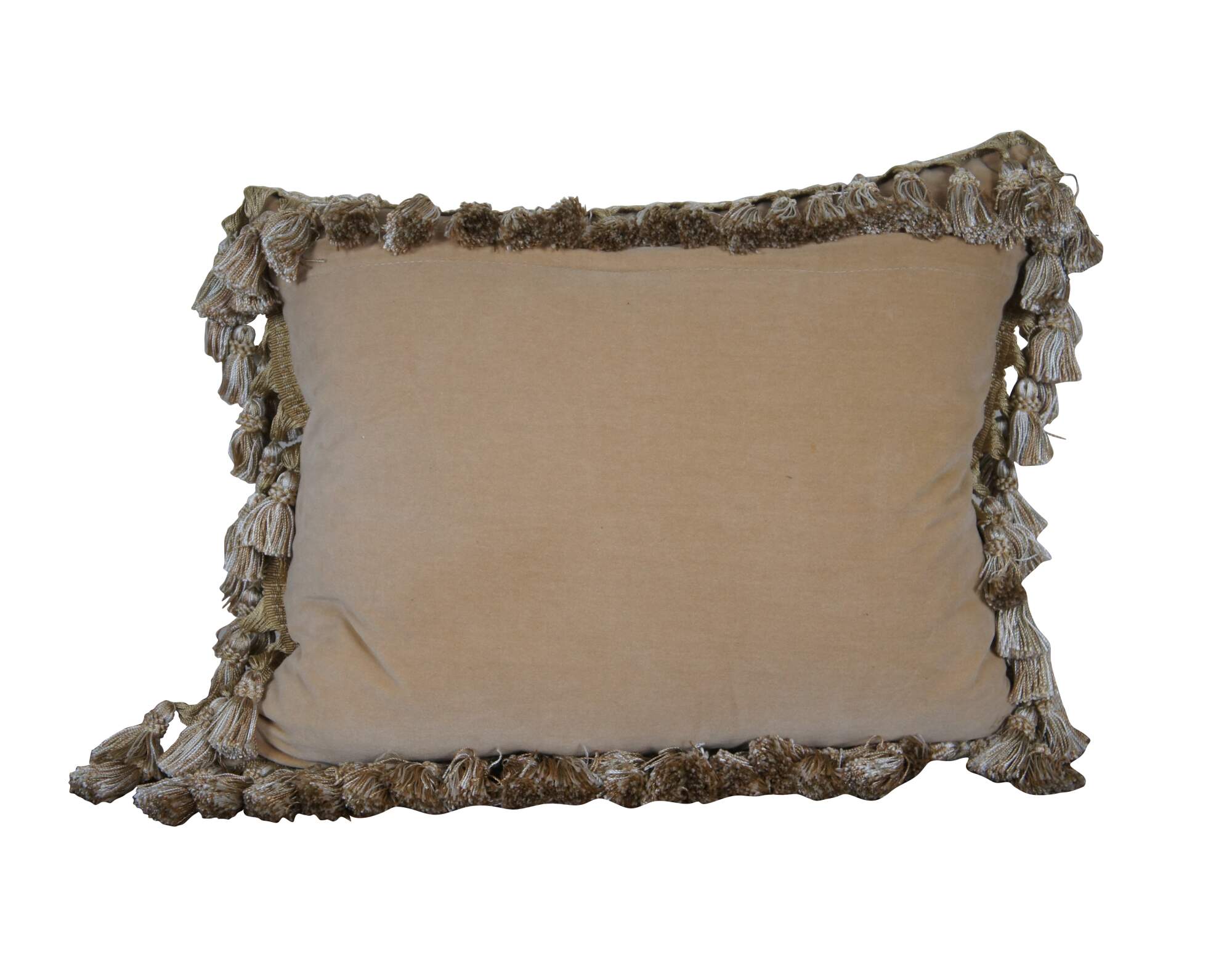 2 Available - 20th century square needlepoint throw pillow, hand embroidered with a pattern of pink roses, divided by criss crossing lines of pink and yellow flowers and leaves, on a beige background. Cream and gold tassel trim. Beige velour back with zipper closure. Down filled.