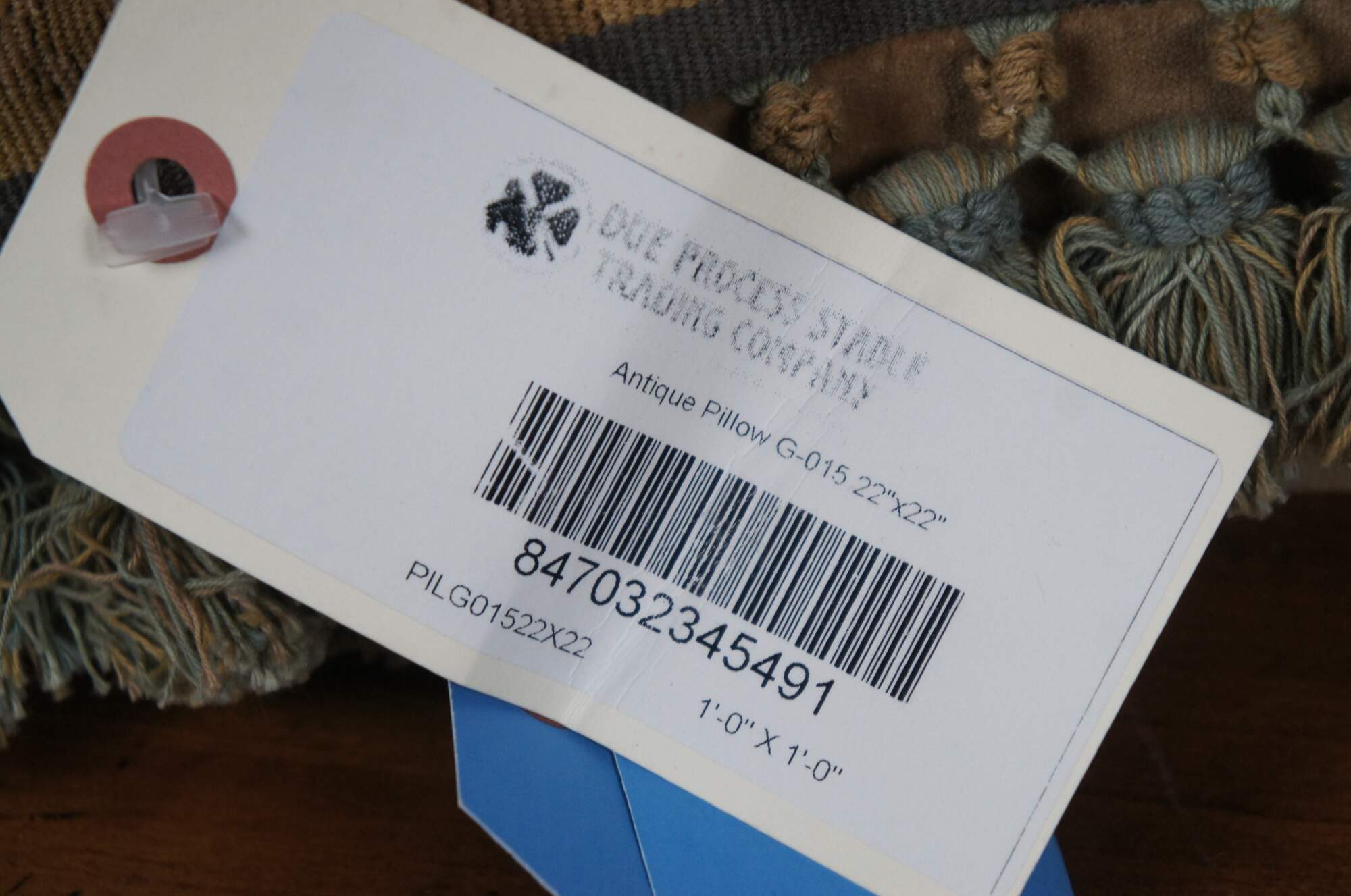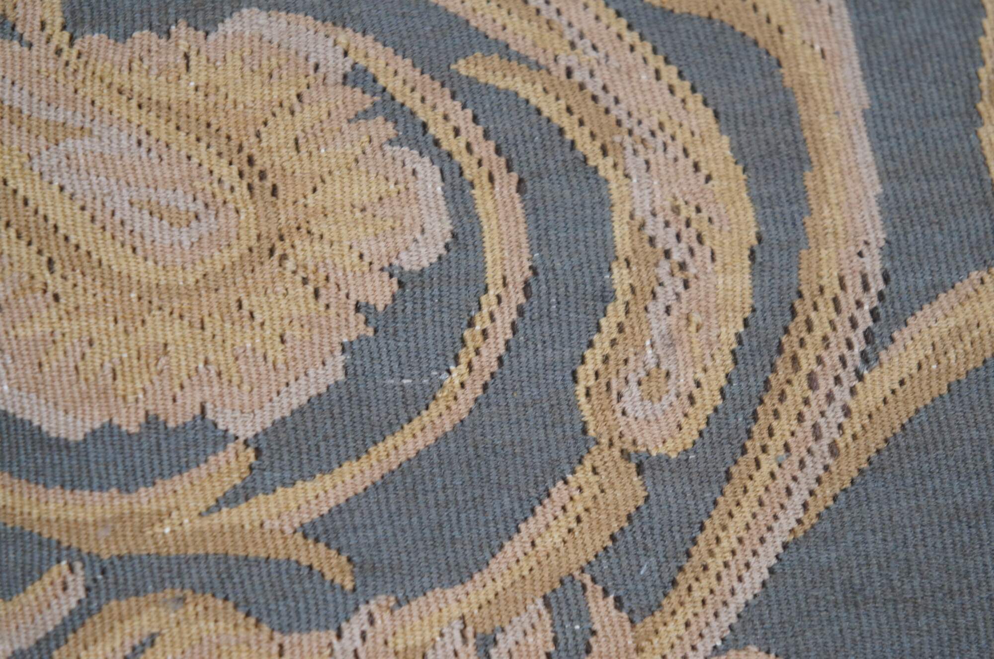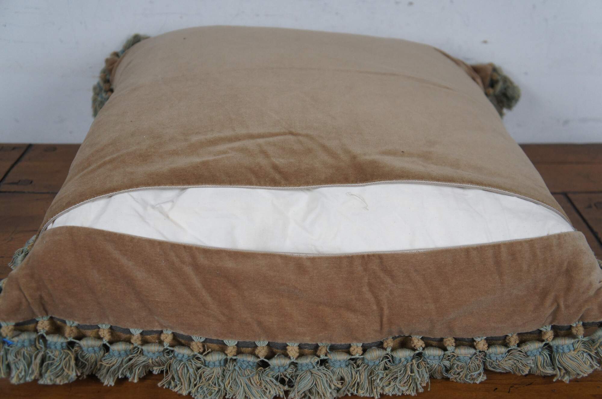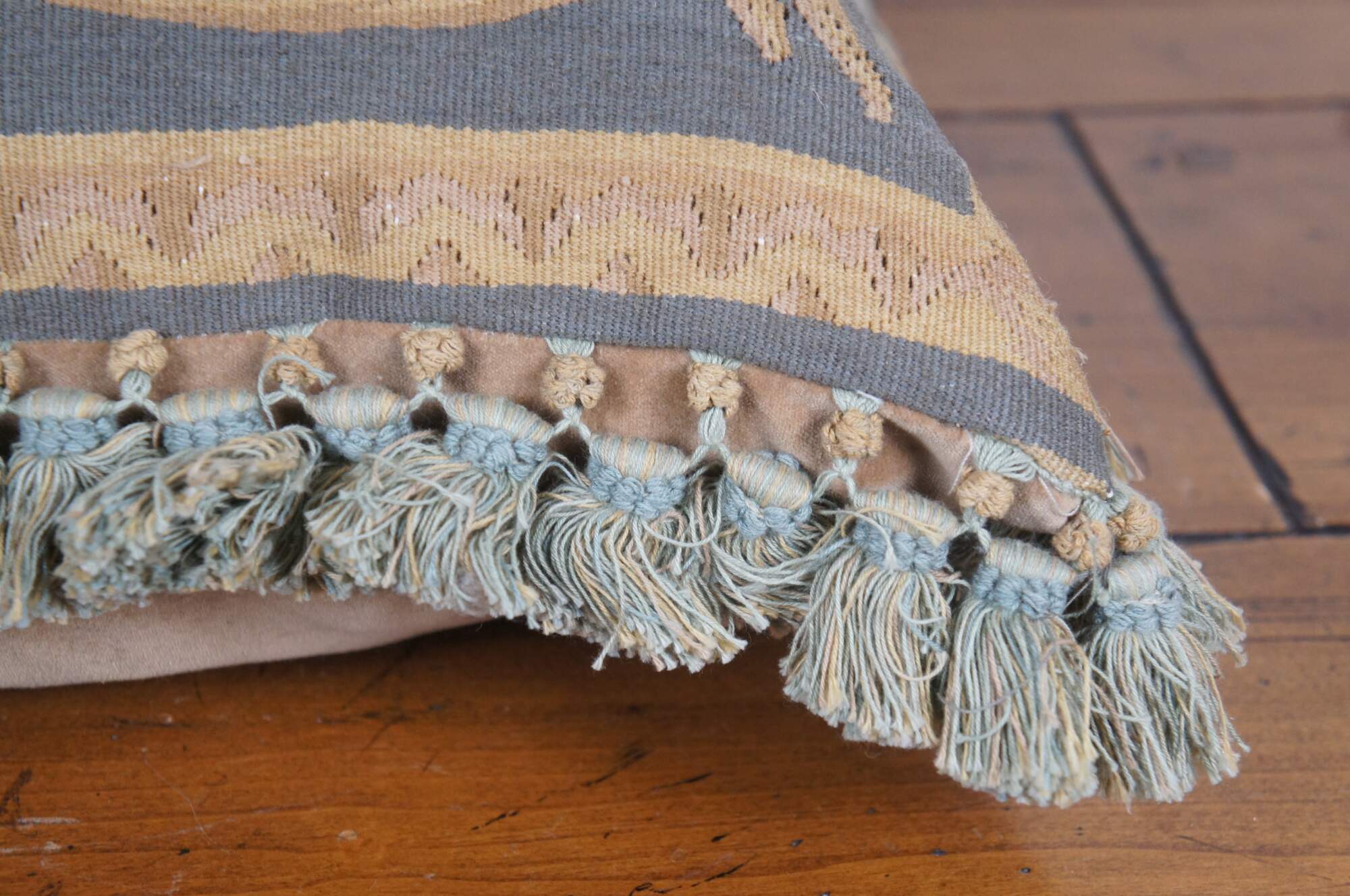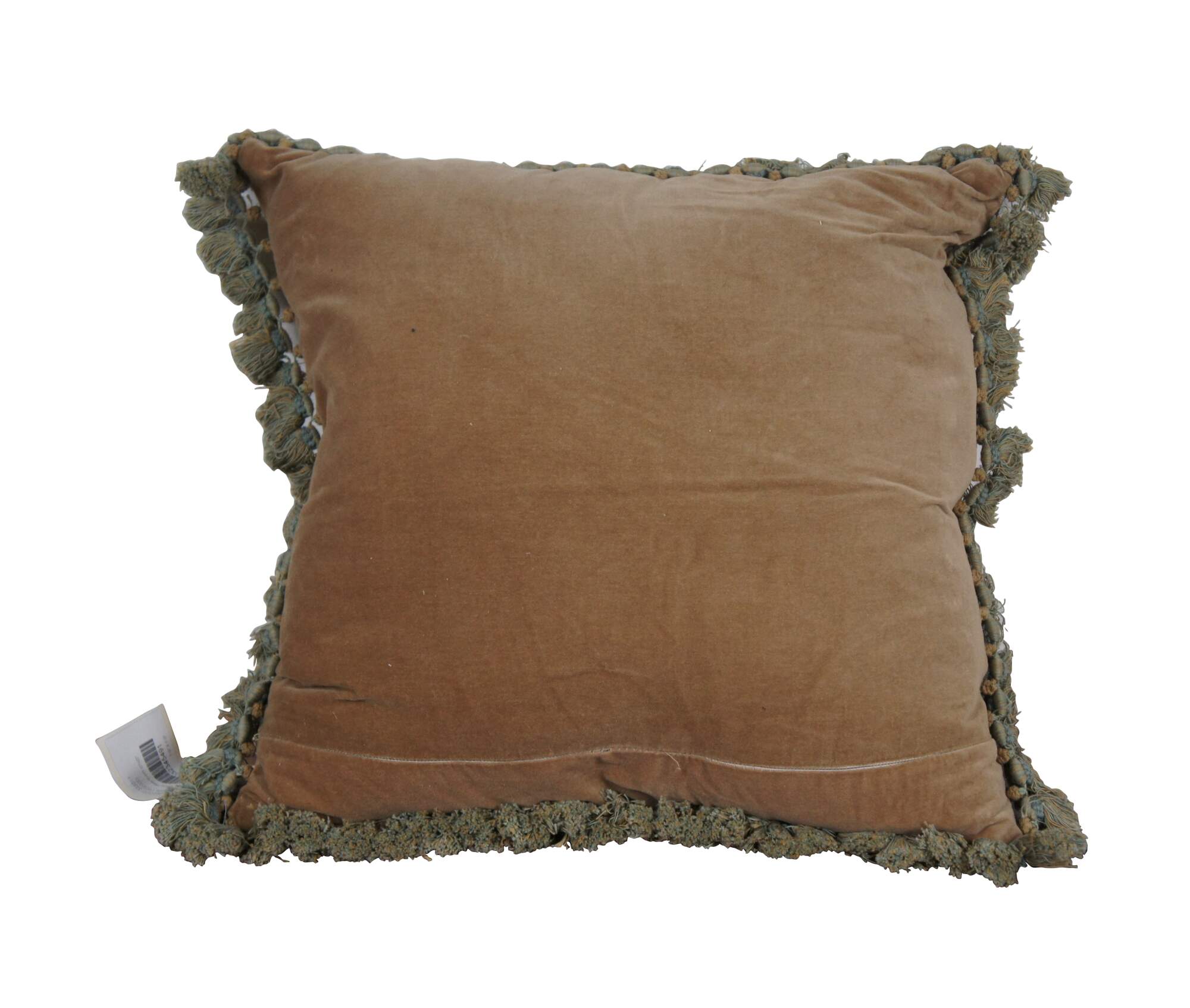 20th century square throw pillow, embroidered with a spiraling gold foliate acanthus design on a gray background. Green and brown tassel trim. Light brown velour back with zipper closure. Down filled.