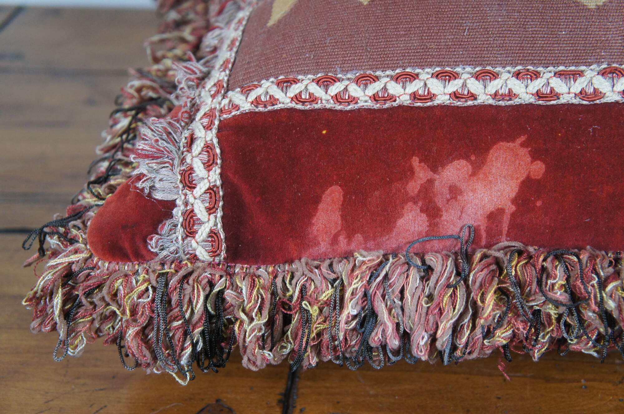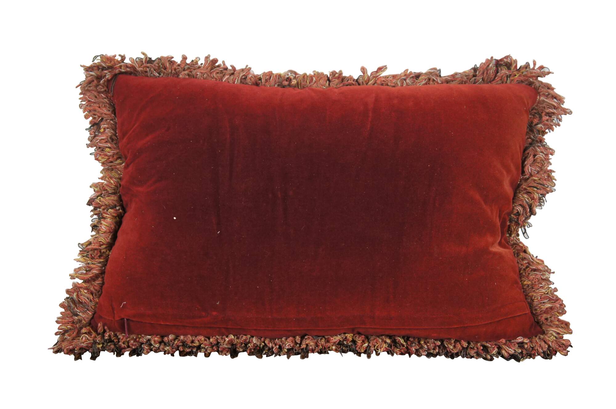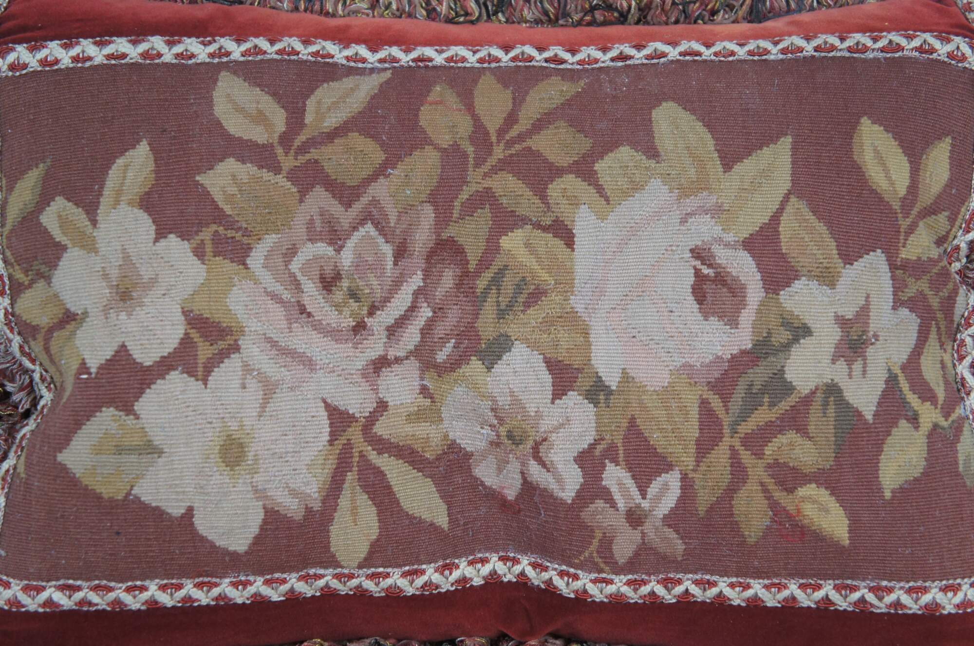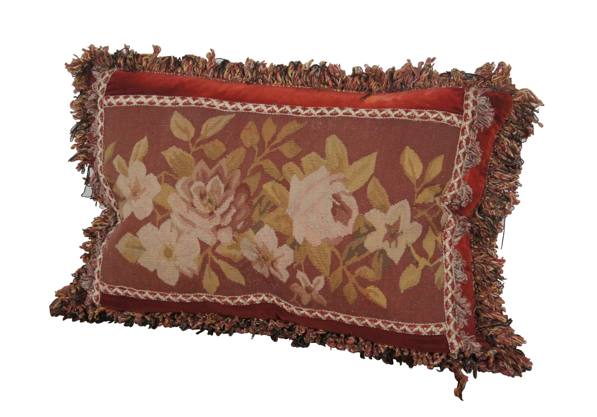 20th century rectangular lumbar / throw pillow, embroidered with an array of roses / flowers in rust red, pink, gold, and cram, framed in cream and red trim. Red, gold, and gray fringe. Red velvet / velour back with zipper closure. Down filled.