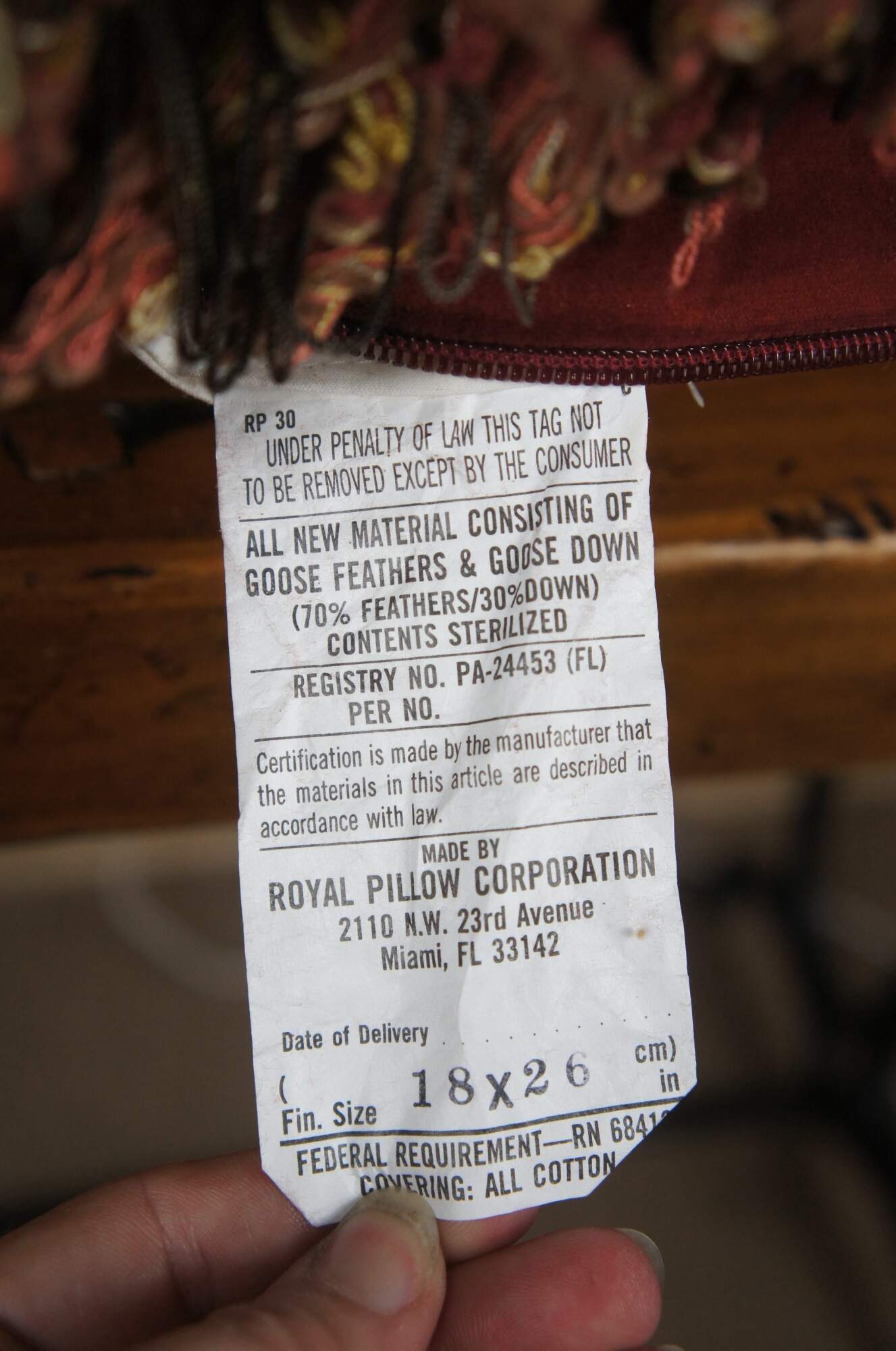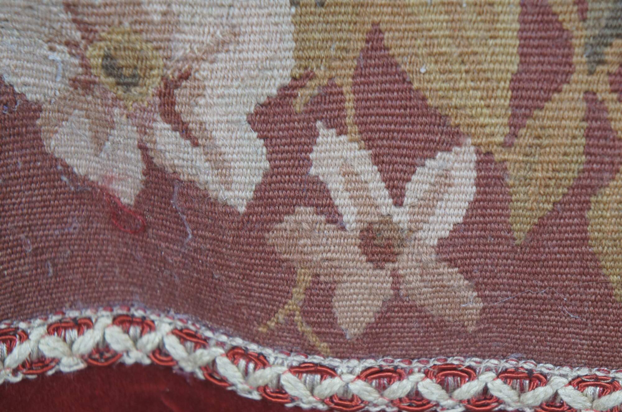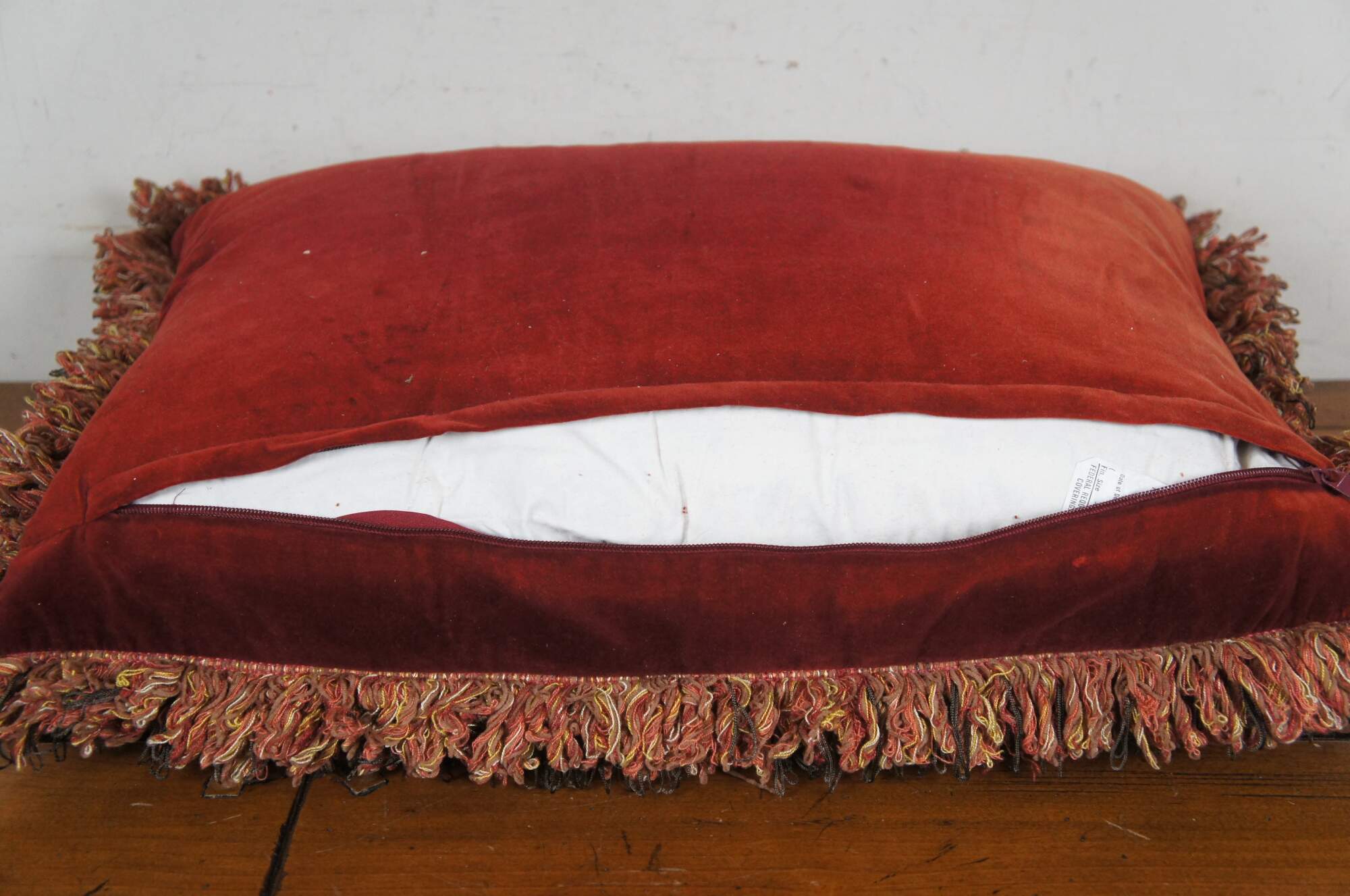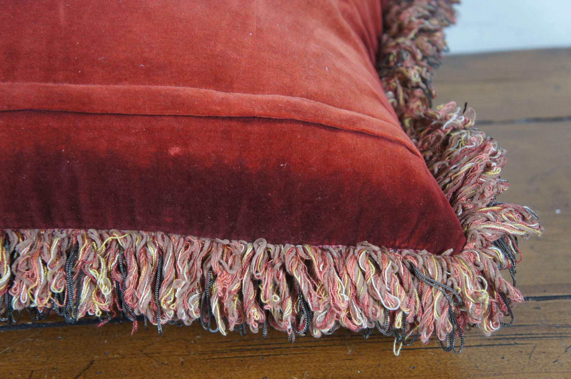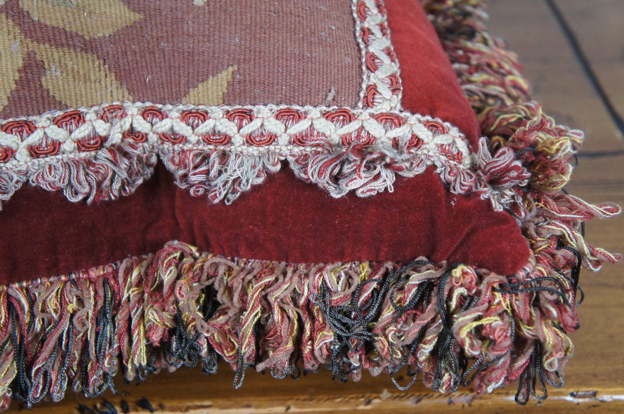 20th century rectangular lumbar / throw pillow, embroidered with an array of roses / flowers in rust red, pink, gold, and cram, framed in cream and red trim. Red, gold, and gray fringe. Red velvet / velour back with zipper closure. Down filled.