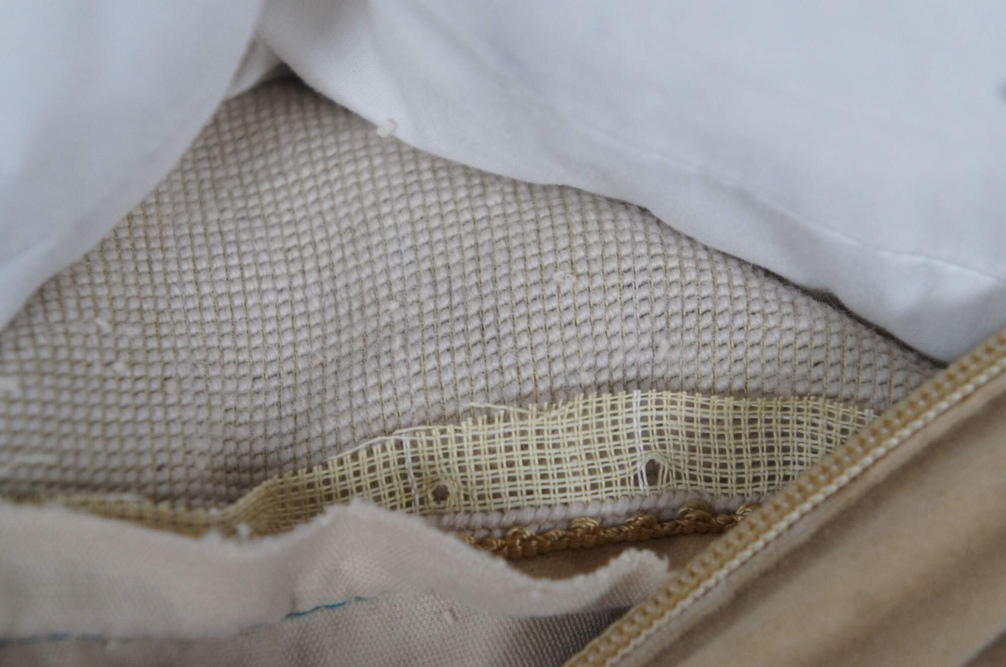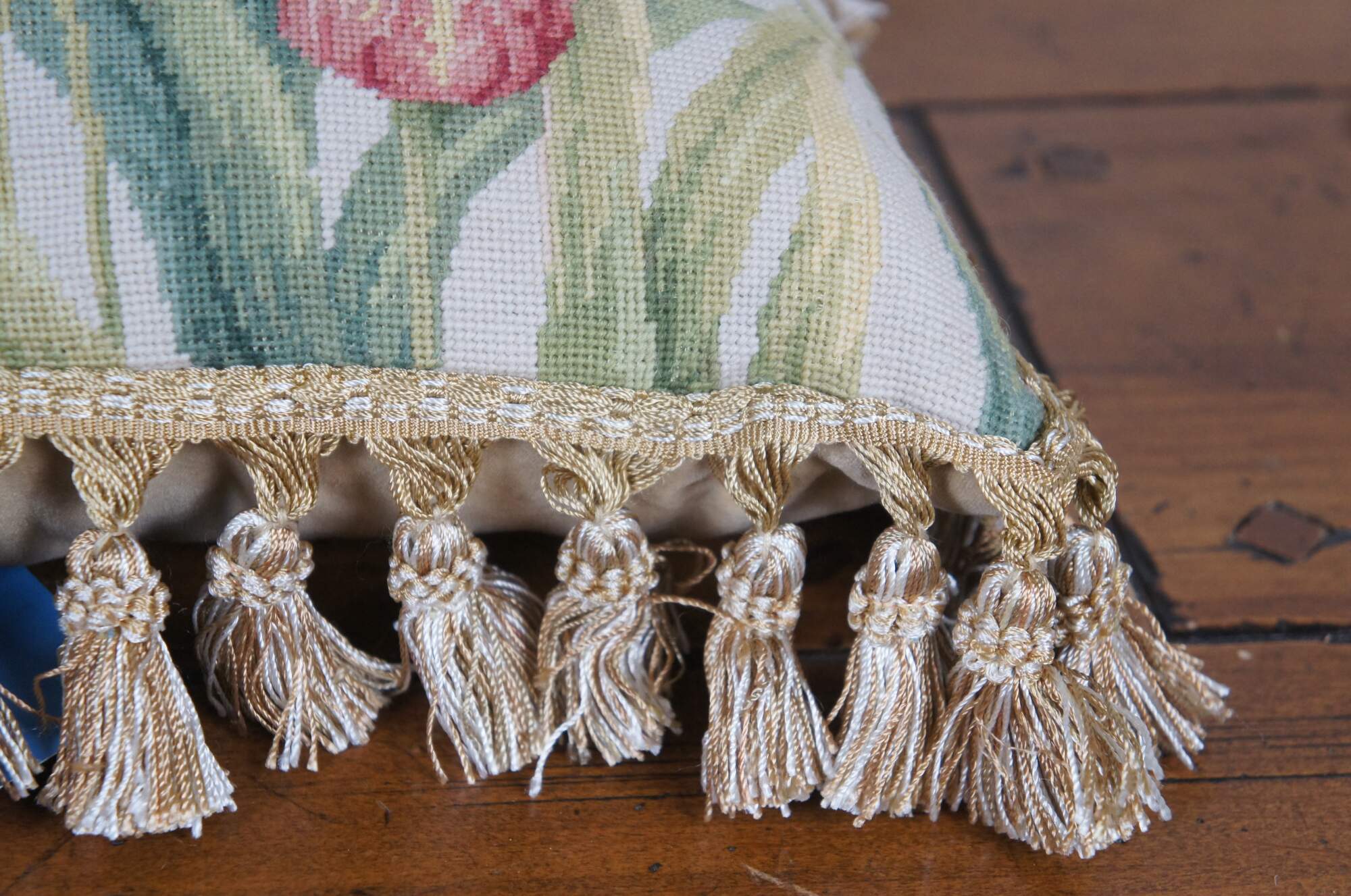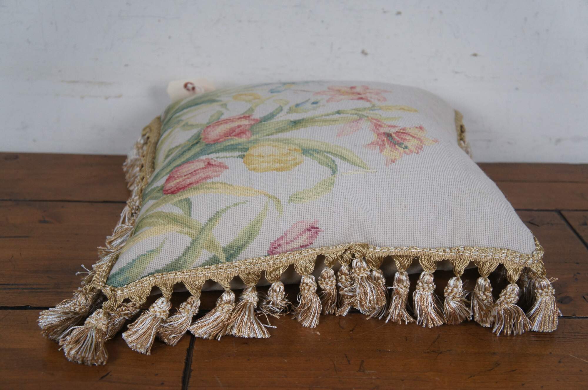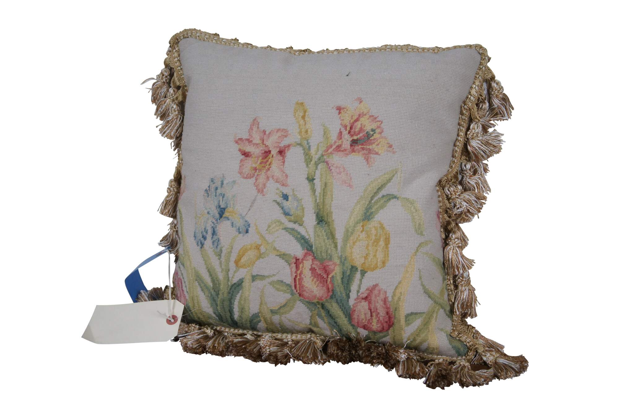 20th century square throw pillow, hand embroidered with a floral garden view of pink, yellow, and blue lilies, tulips, and irises. Beige and white tassel trim. Beige velour back with zipper closure. Down filled.