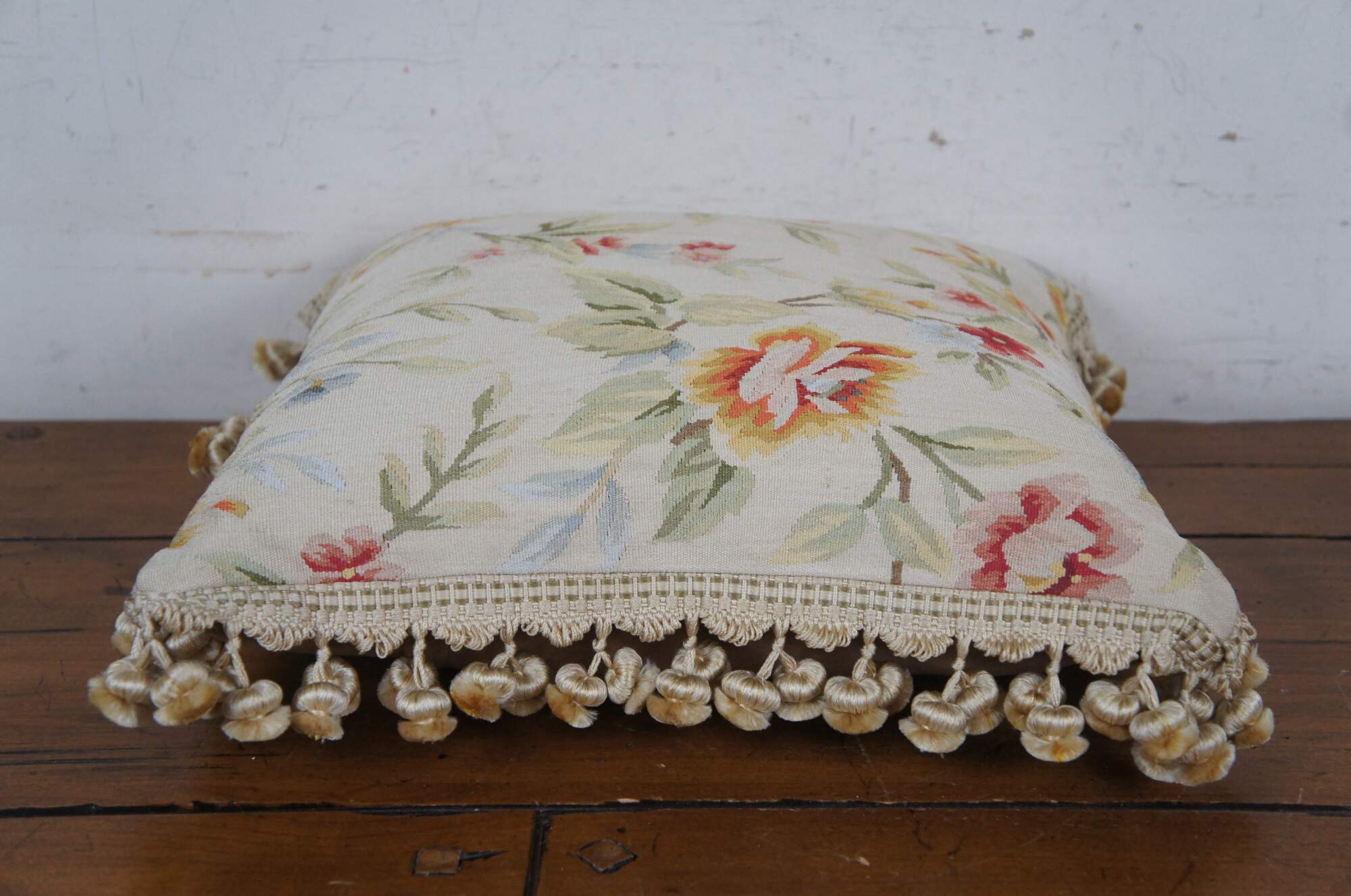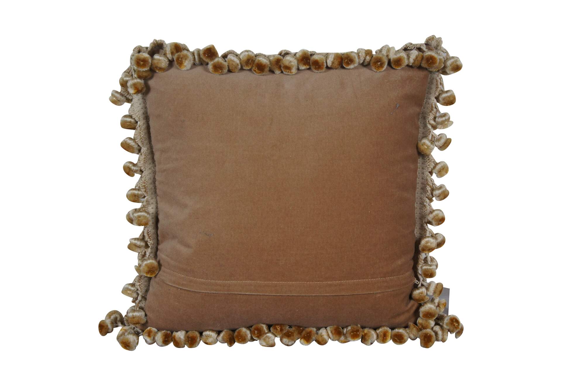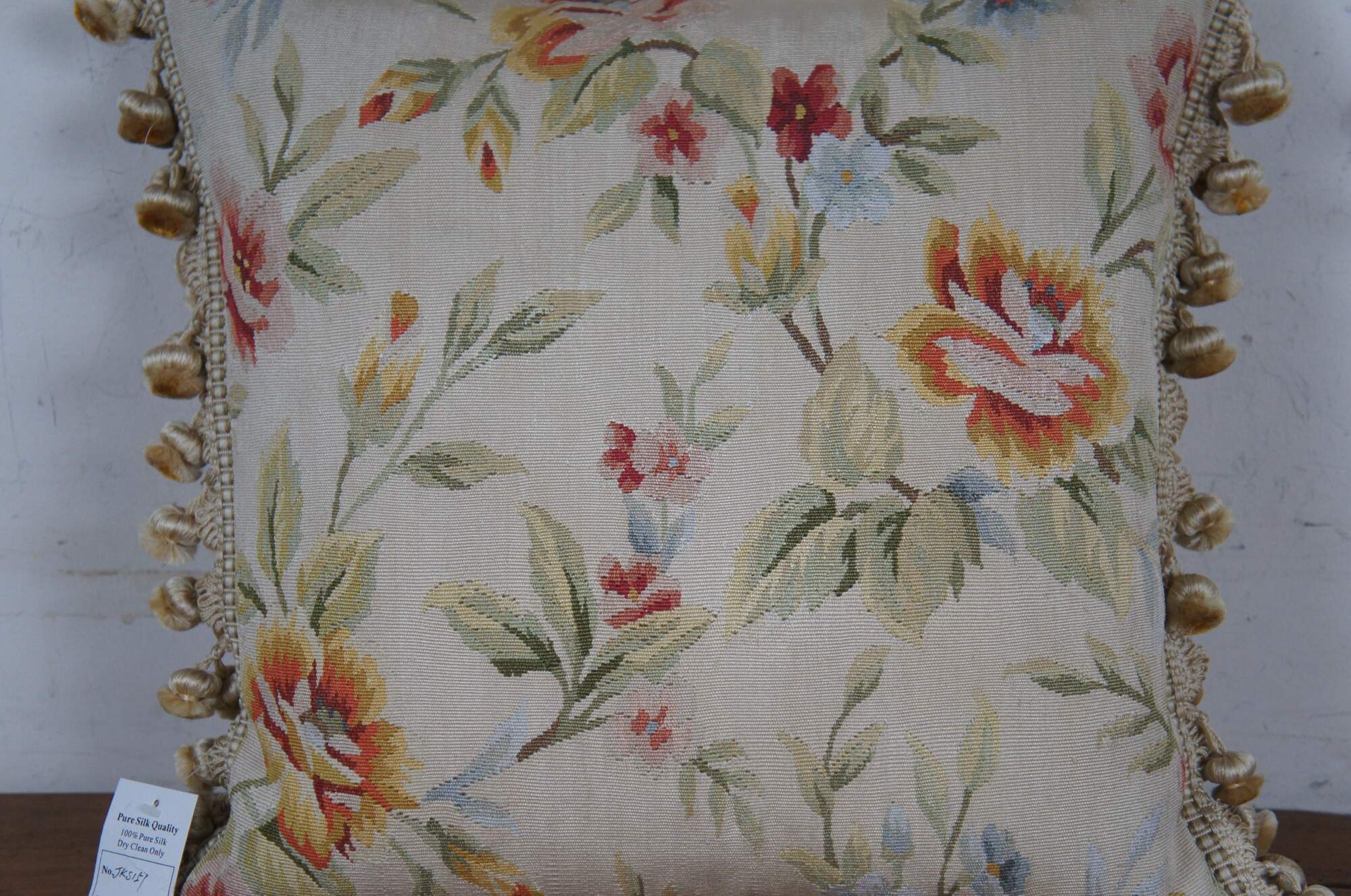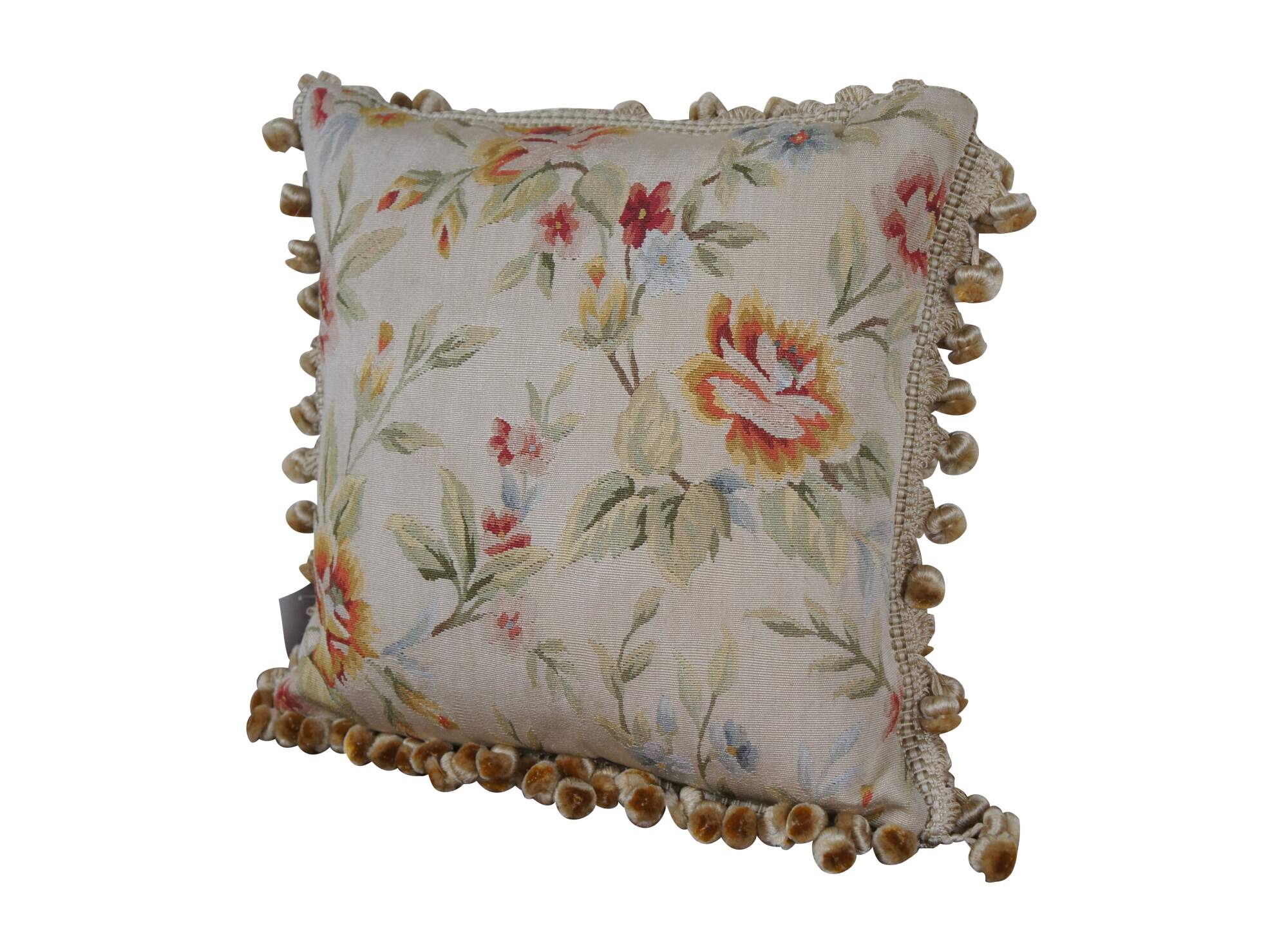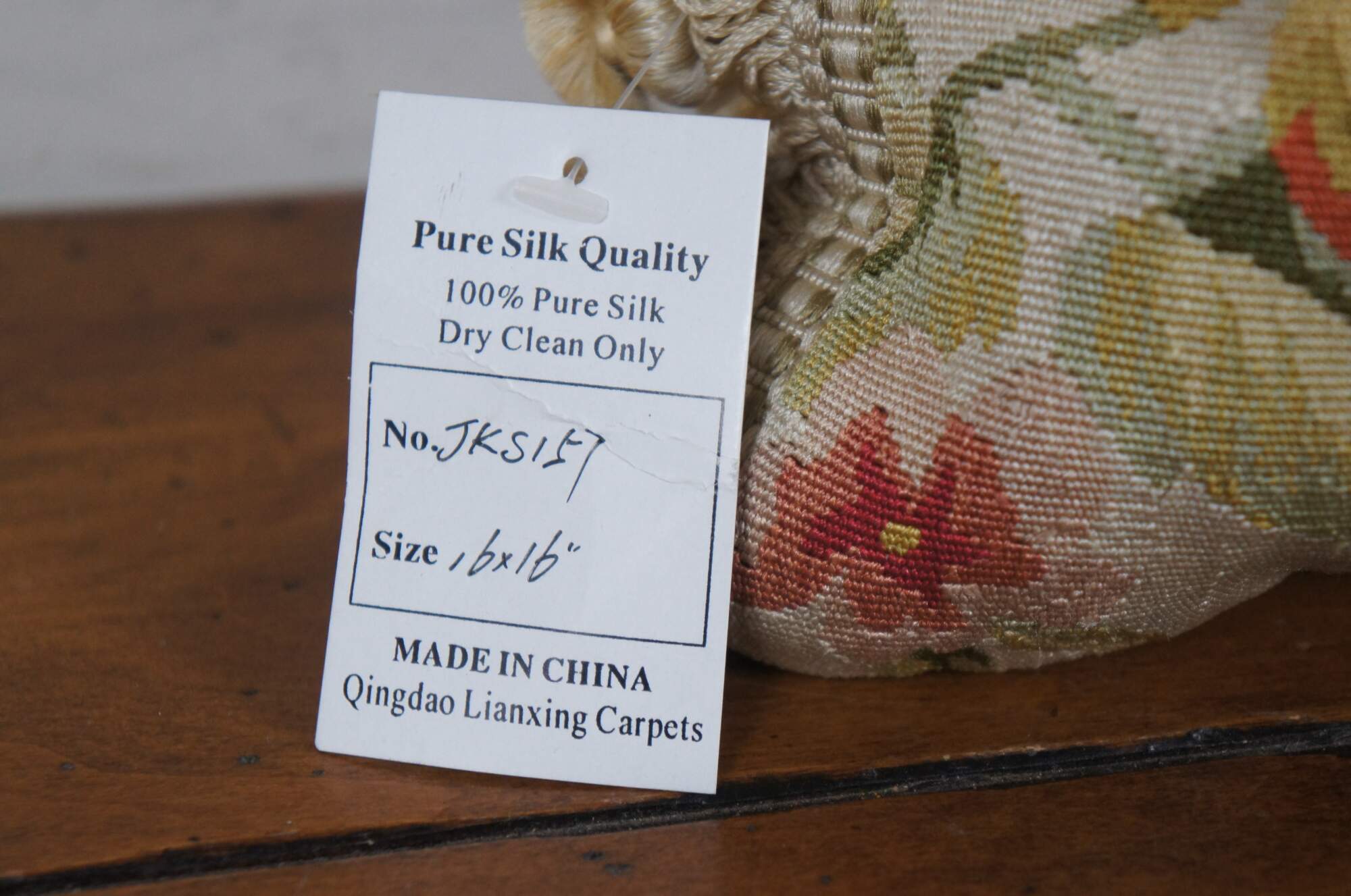 2 Available - 20th century square throw pillow, embroidered in silk with leafy branches of orange, red, and blue flowers. Cream ball tassel trim. Beige velour back with zipper closure. Made in China by Qingdao Lianxing Carpets.