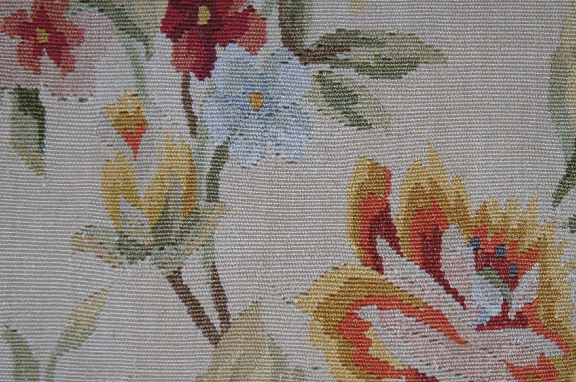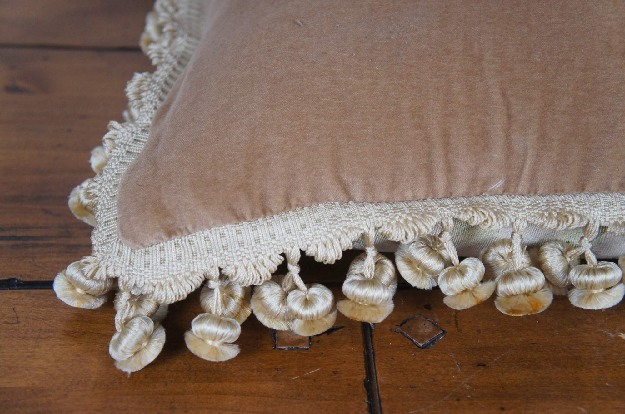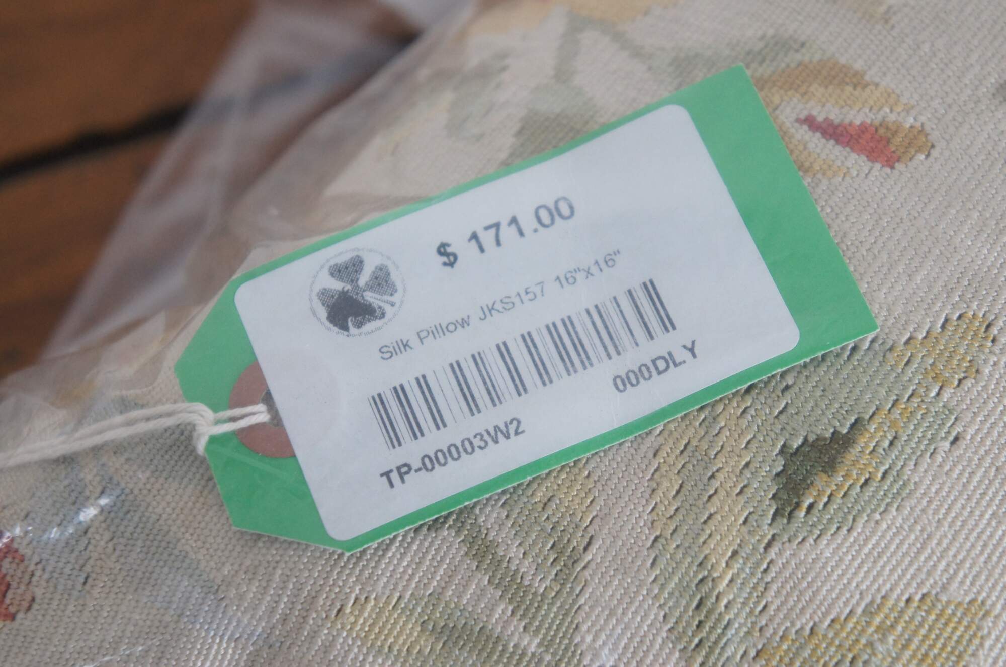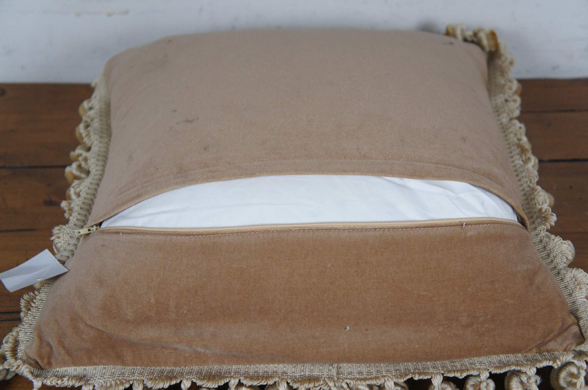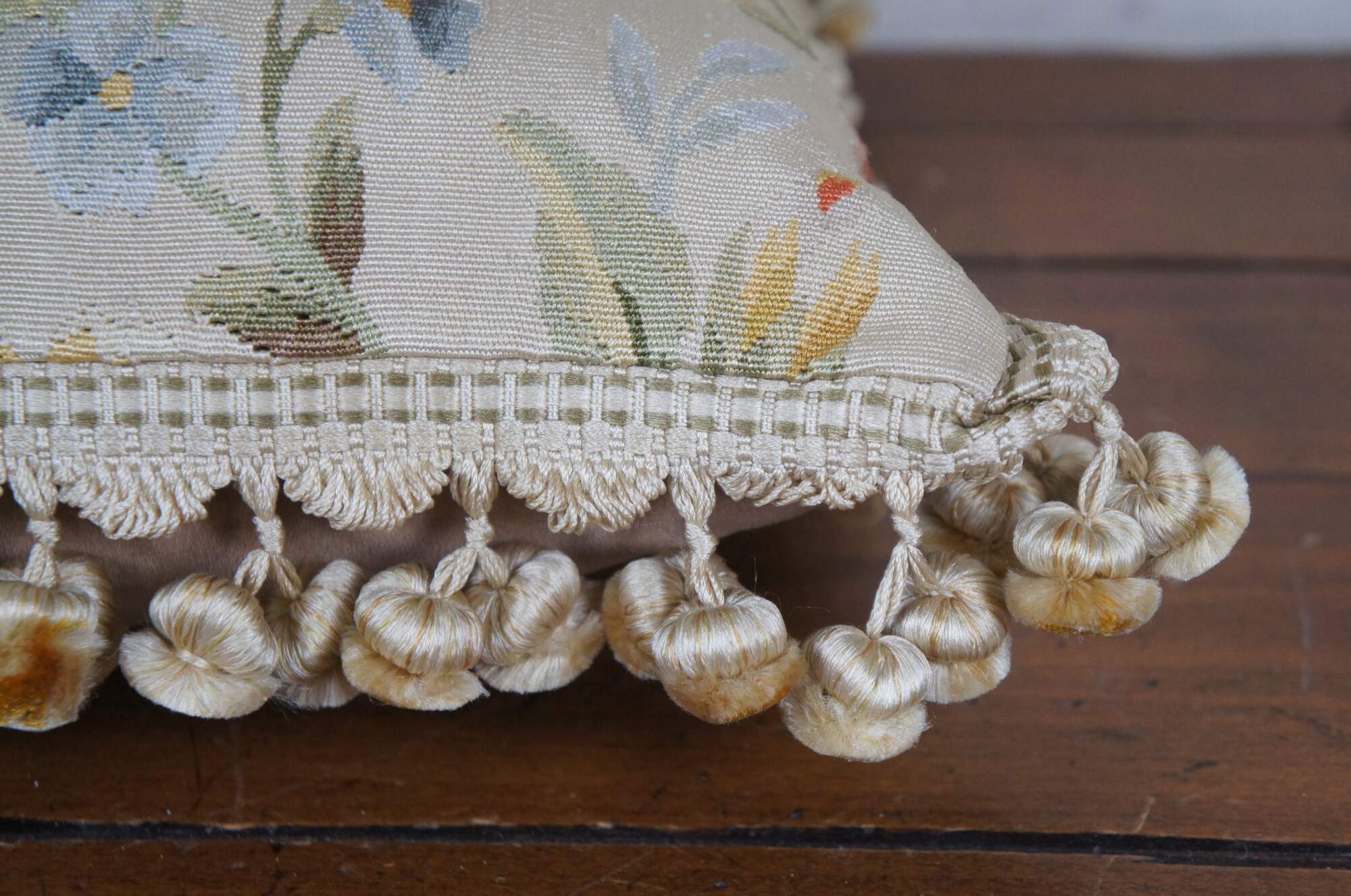 2 Available - 20th century square throw pillow, embroidered in silk with leafy branches of orange, red, and blue flowers. Cream ball tassel trim. Beige velour back with zipper closure. Made in China by Qingdao Lianxing Carpets.