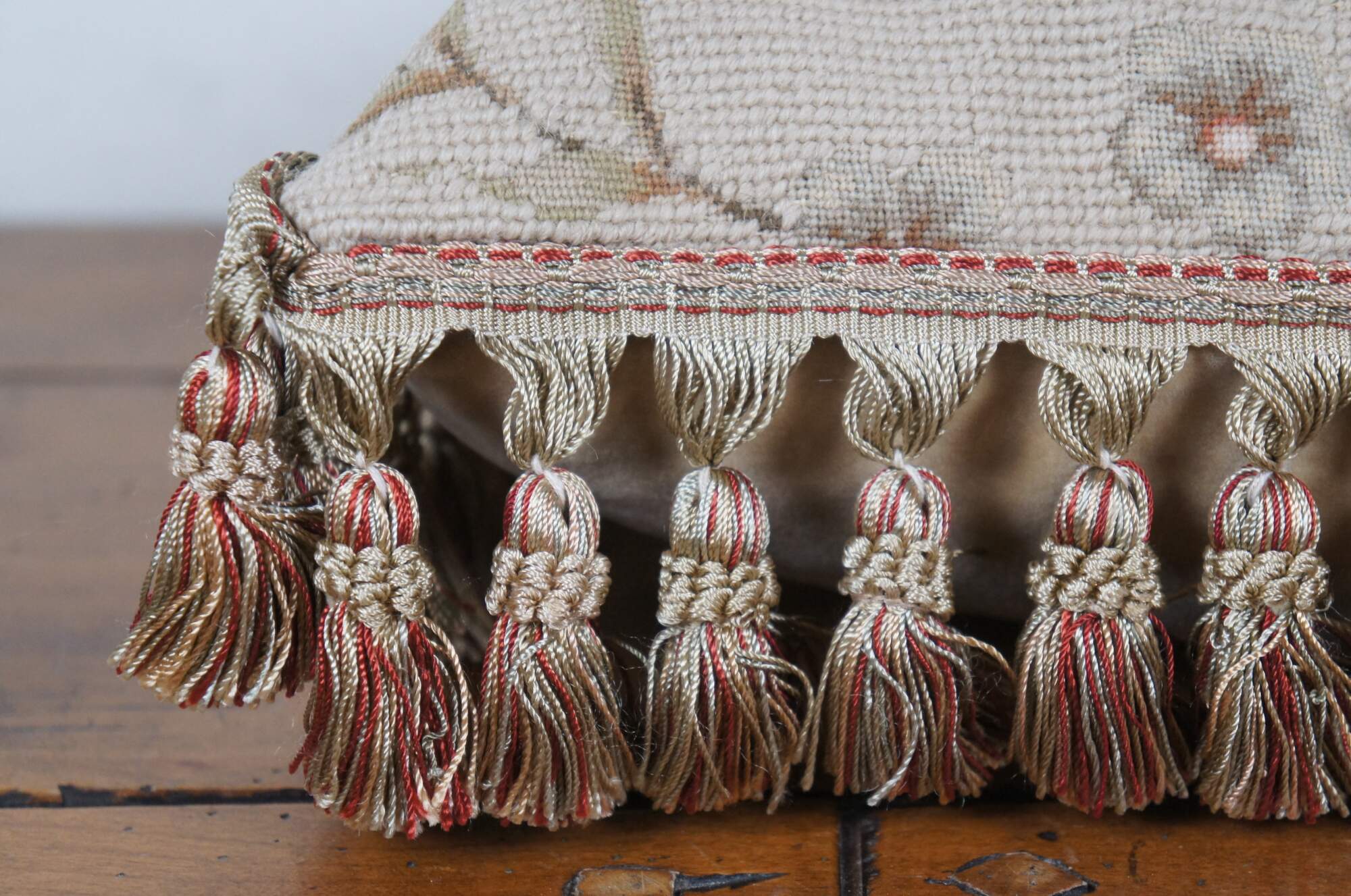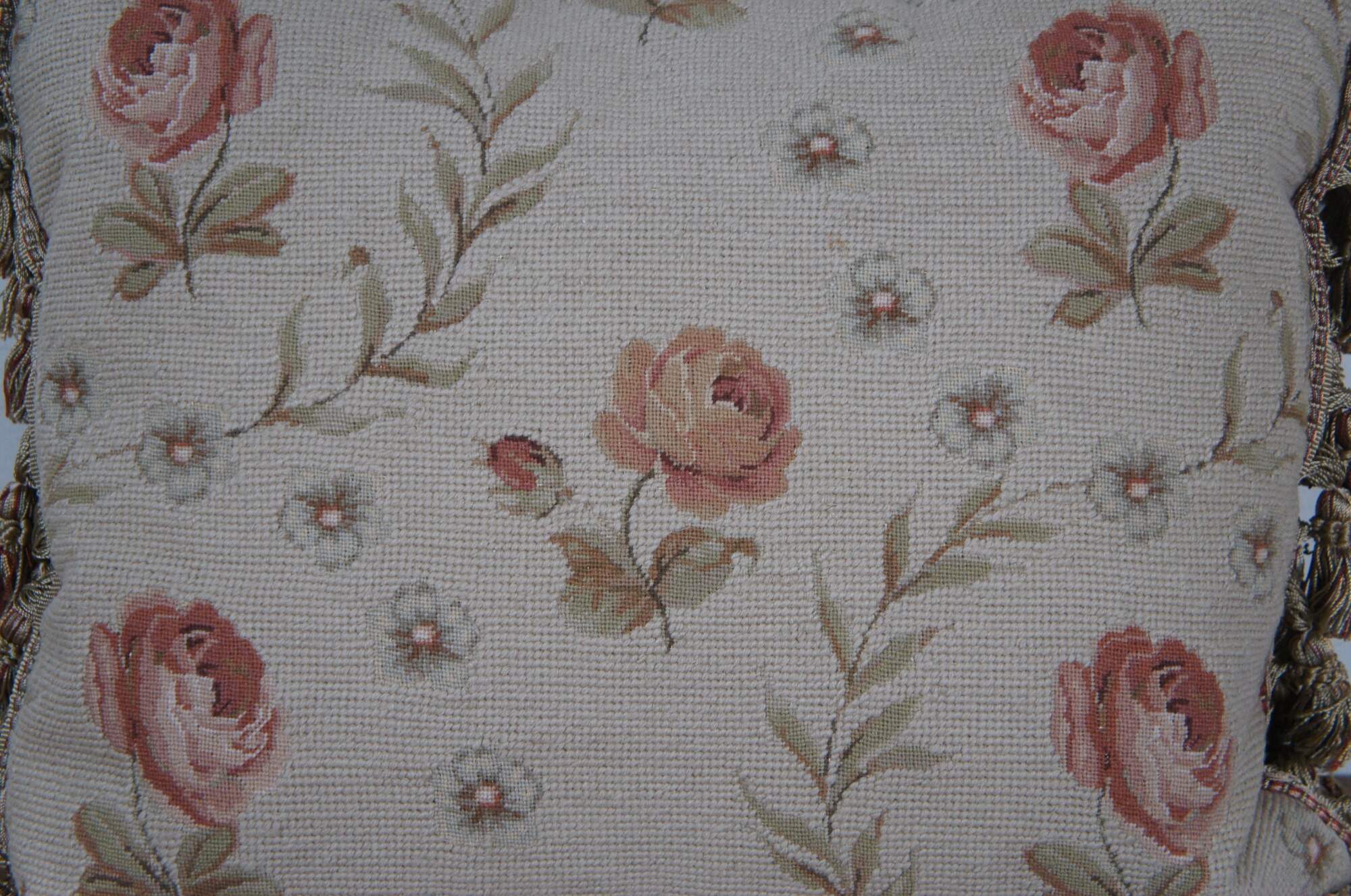 20th century rectangular needlepoint lumbar / throw pillow, hand embroidered with pink roses, separated by arching stems of leaves and light green flowers. Red and beige tassel trim. Beige velour back with zipper closure. Down filled.