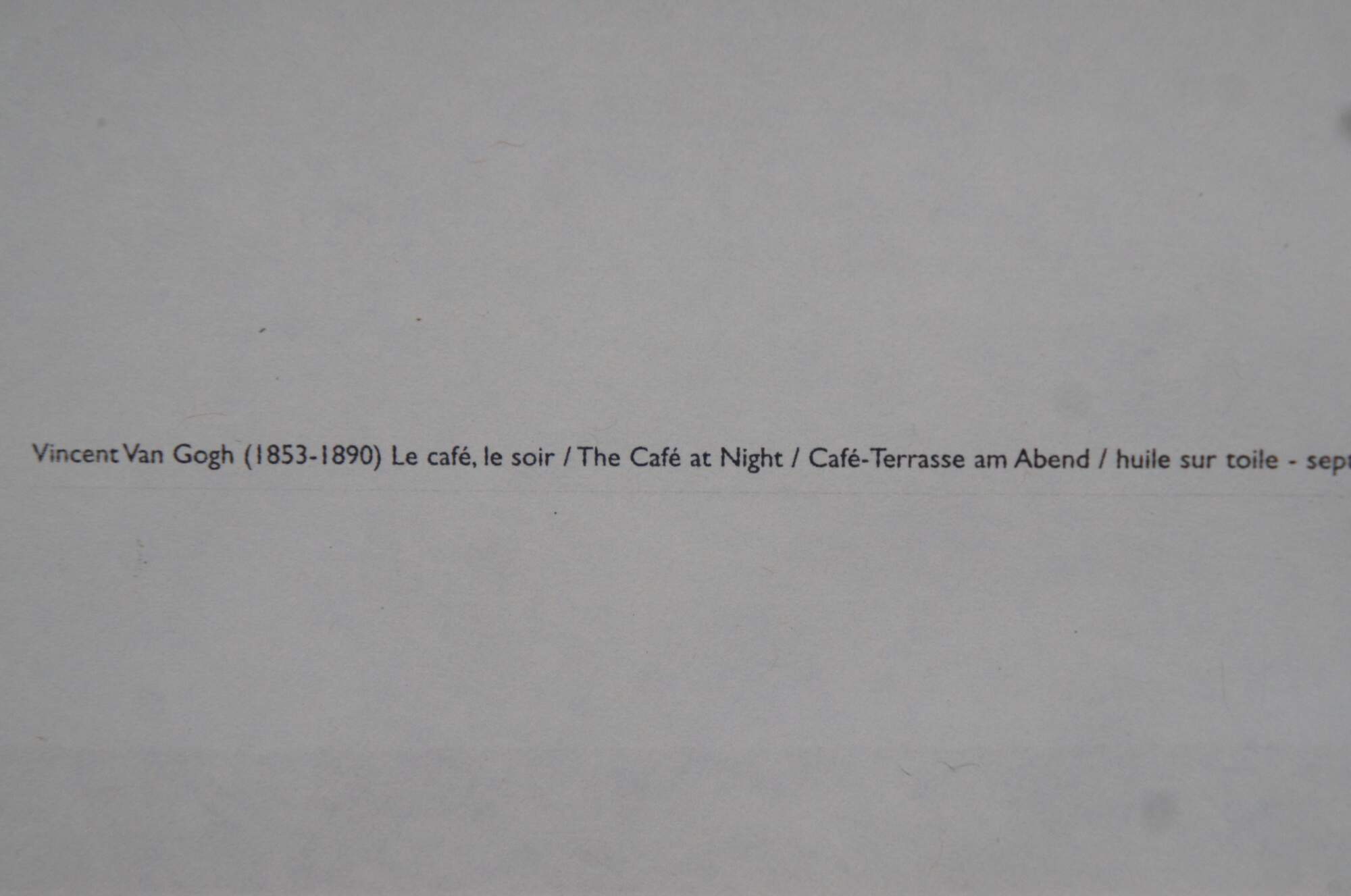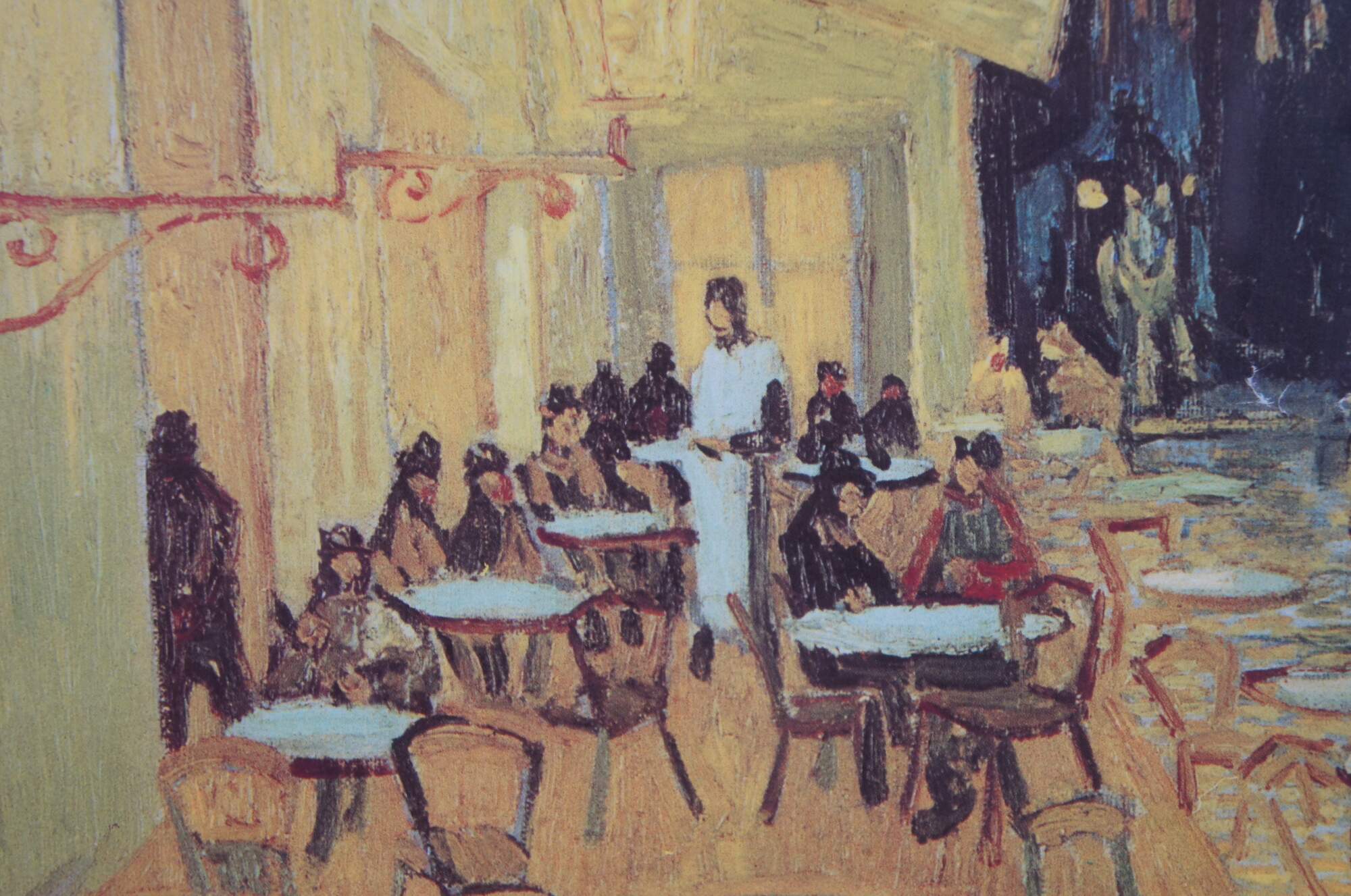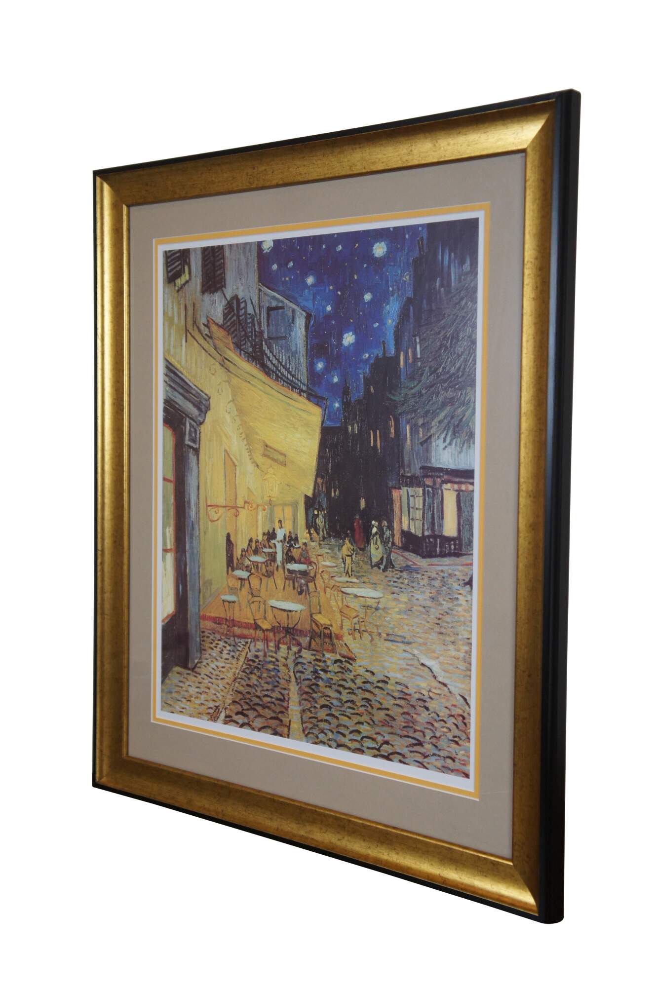 Vintage lithograph print on paper of Vincent Van Gogh's "Le cafe, le soir" aka "The Cafe at Night." Offset printed in France by Nouvelles Images S.A. 1993. Beige and yellow layered mat; gilded frame with black outer edge.