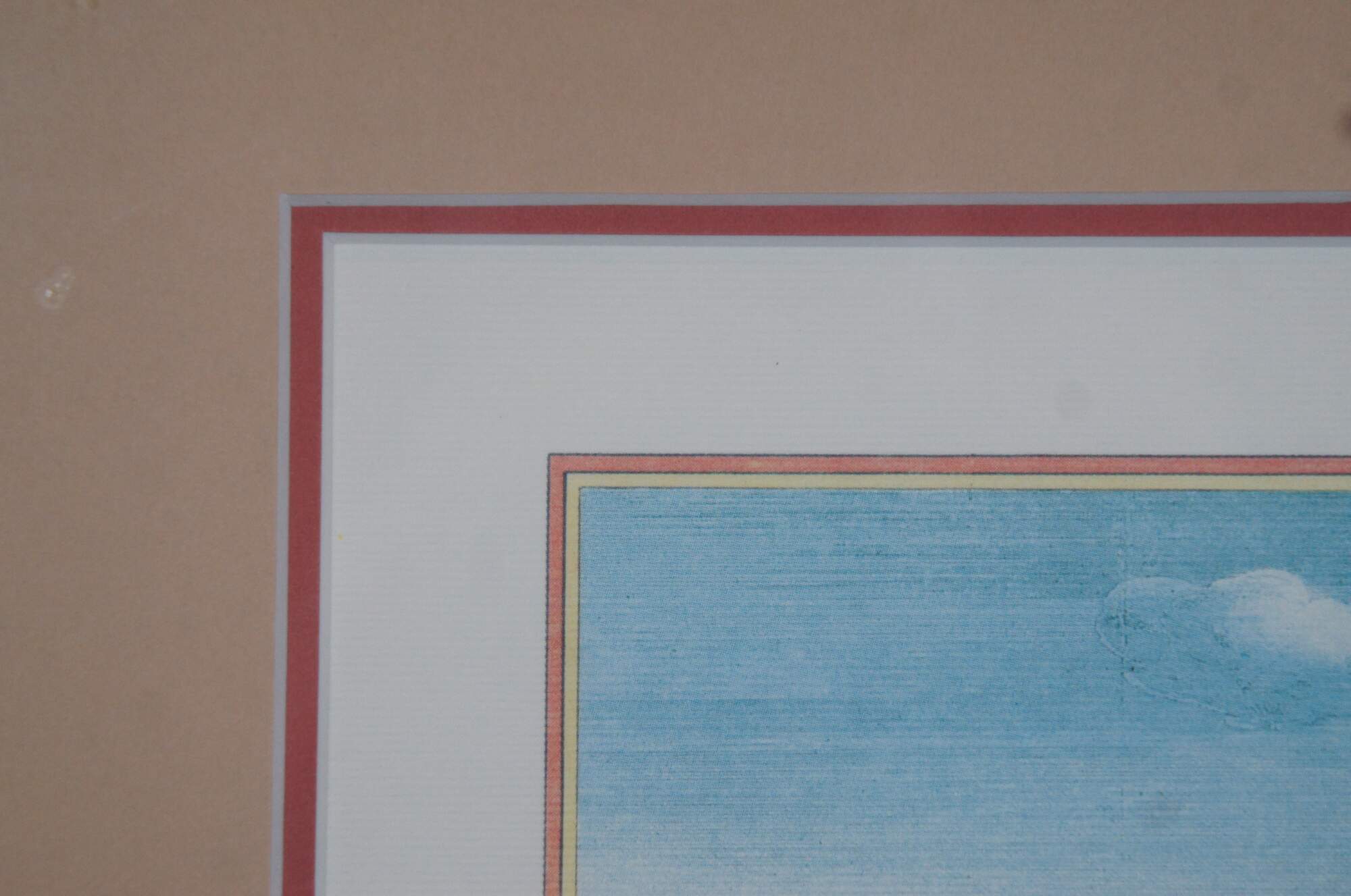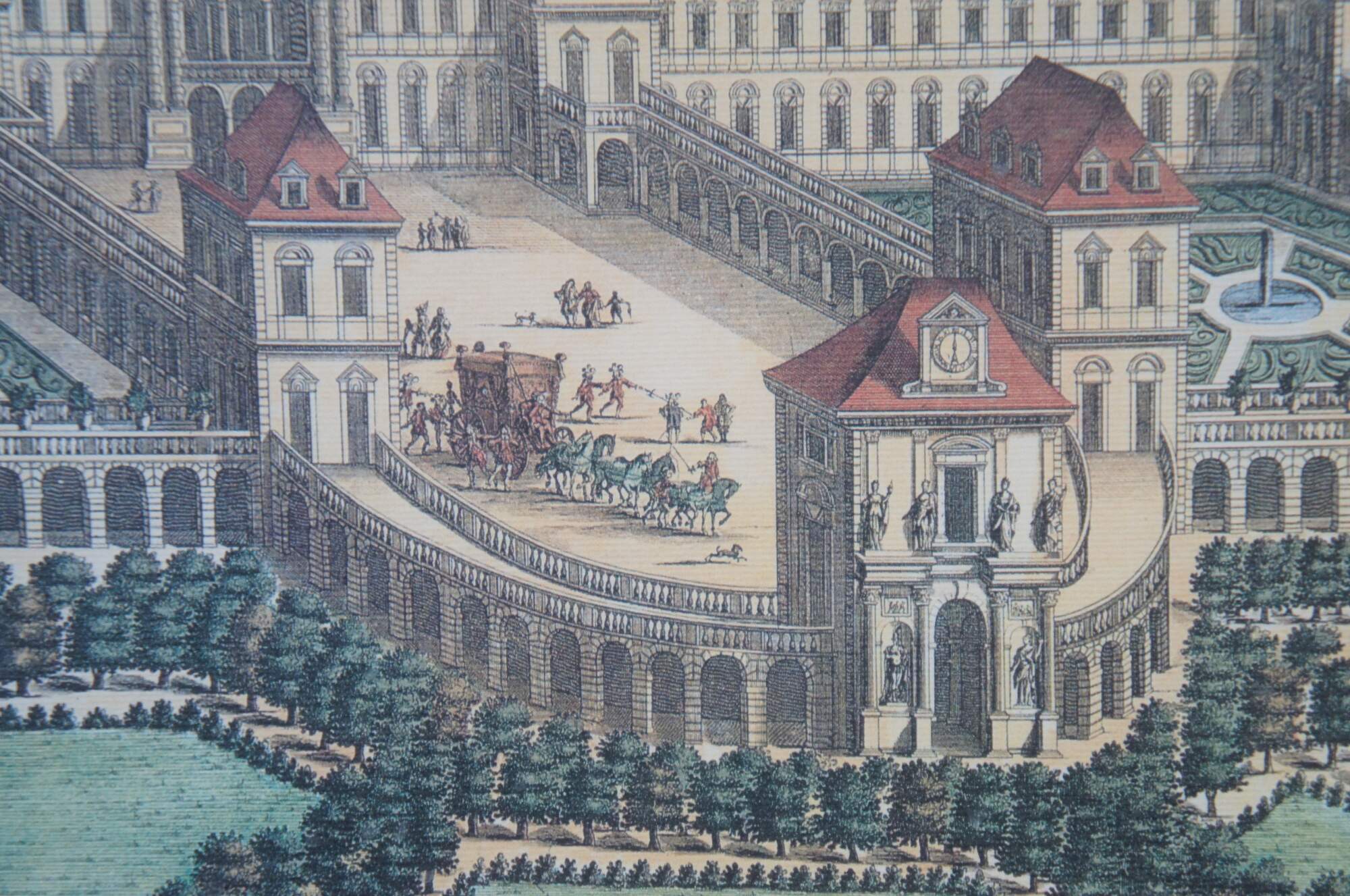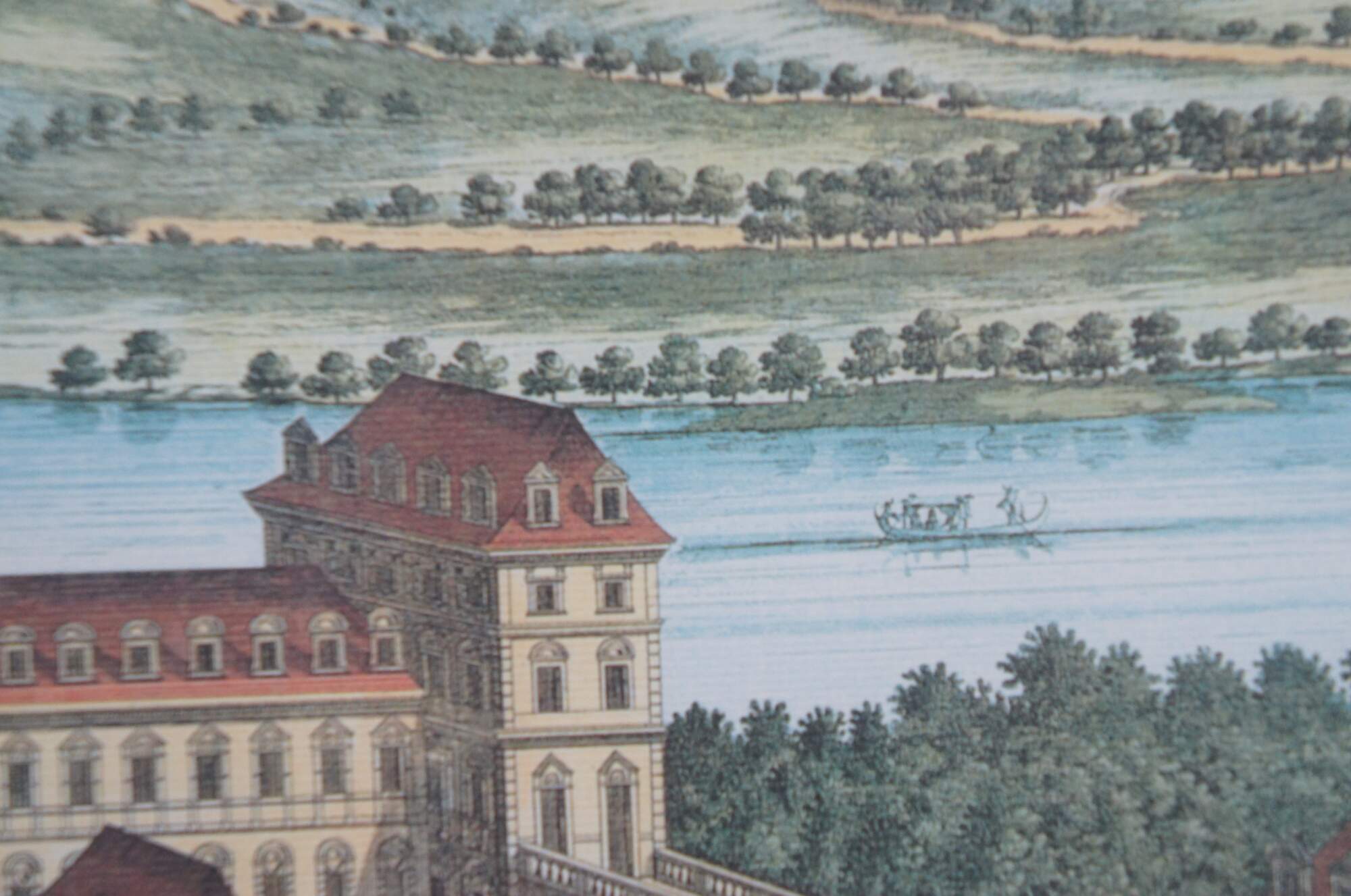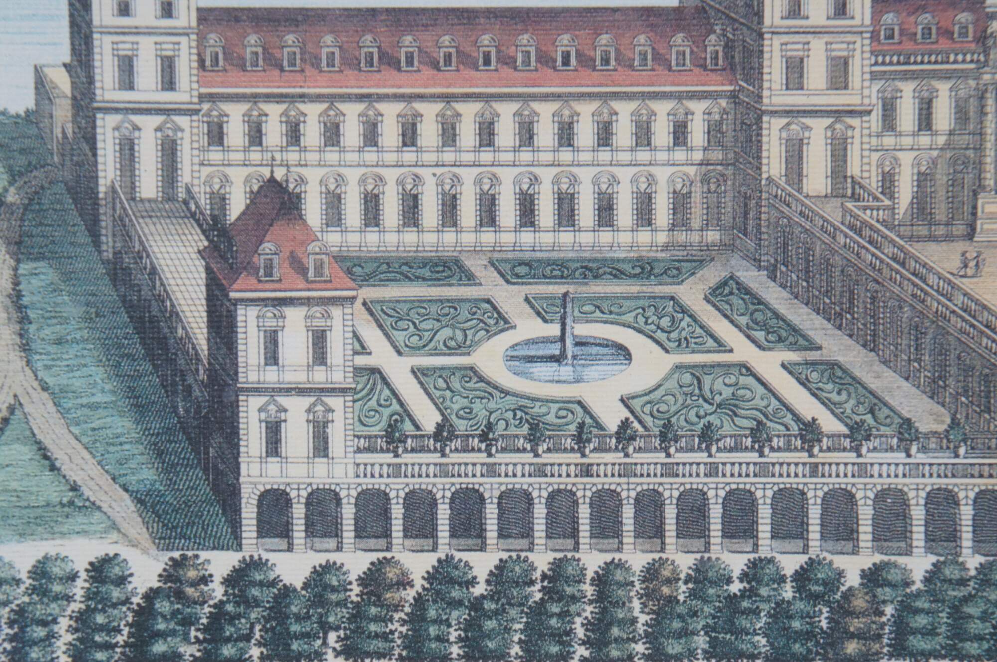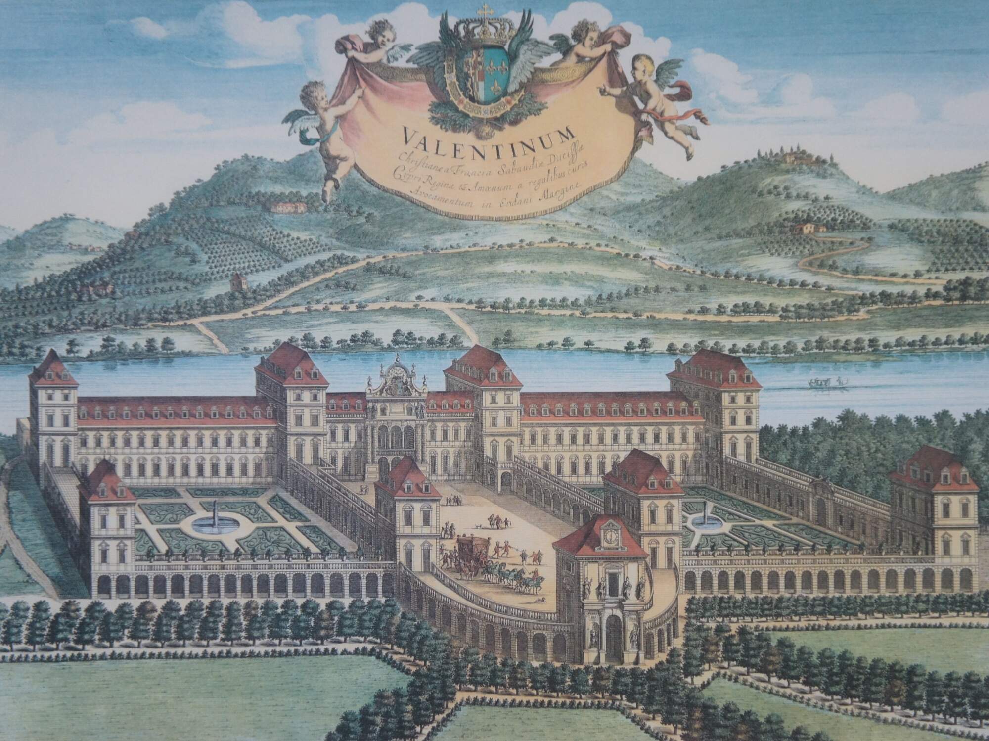 20th century color print of Valentinum / Veduta del Castello del Valentino (1661-68) aka View of the Valentino Castle by Joan Blaeu, showing a bird's eye view of the Italian castle, river and countryside, with identifying banner held aloft by a group of cherubs. Beige and red layered mat; wood frame with bevel edge and rounded rope twist detail.