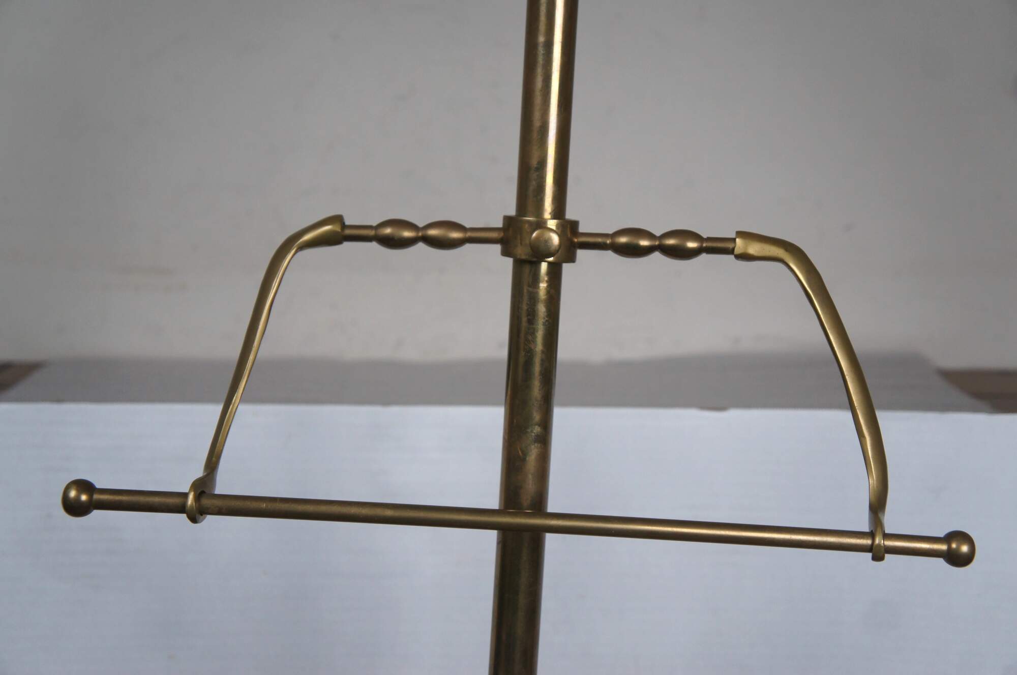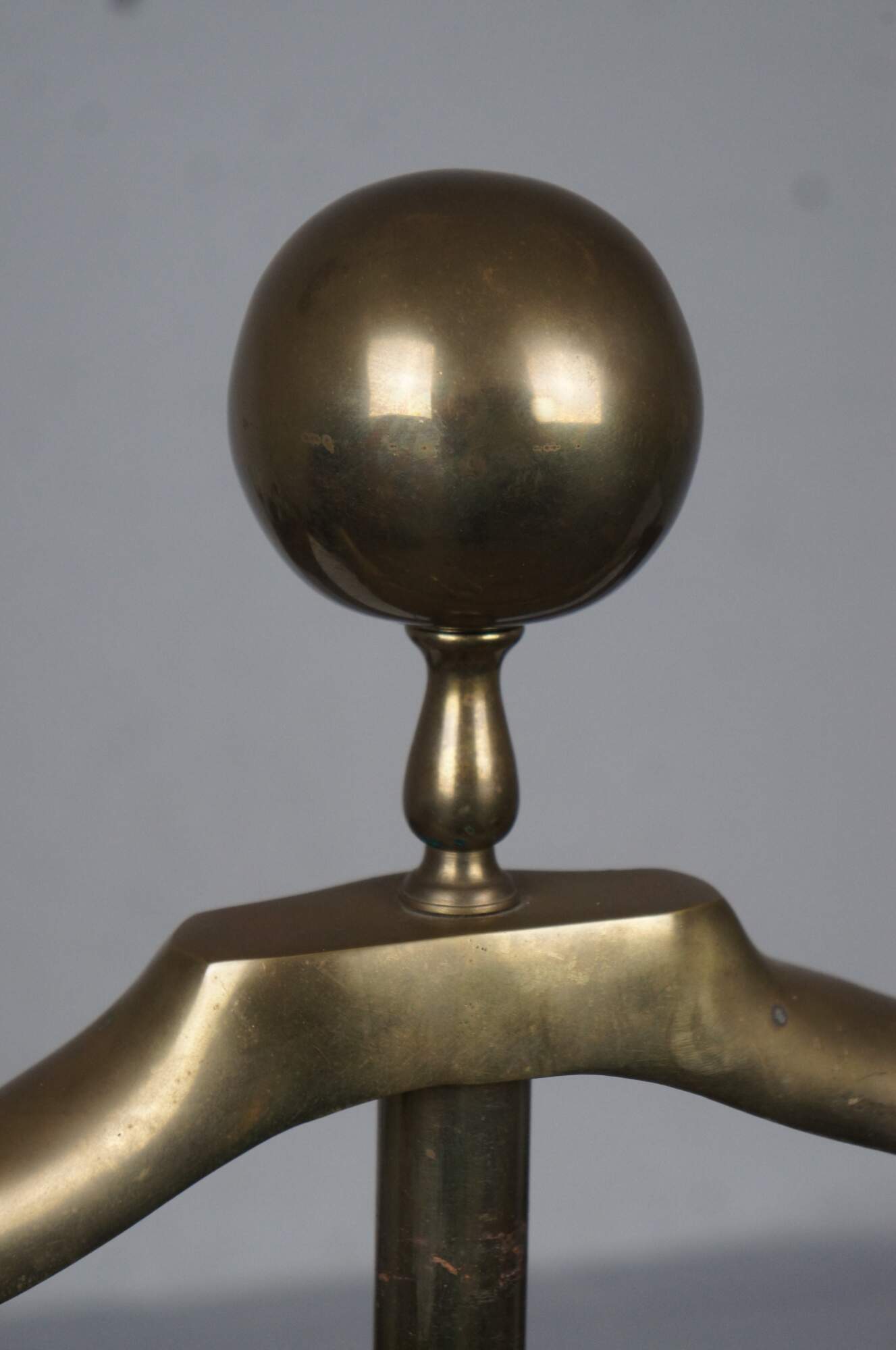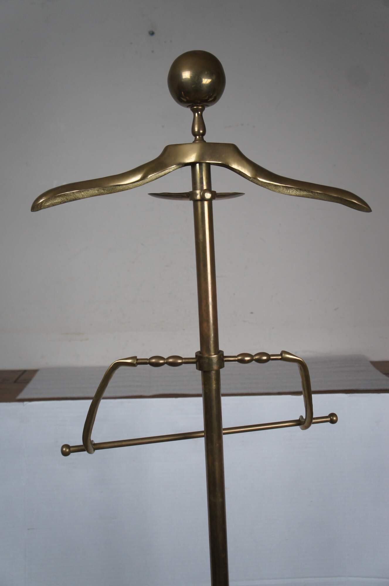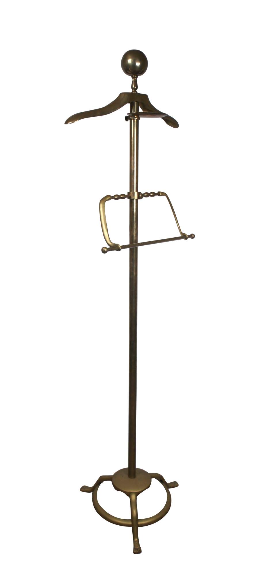 Late mid century brass gentlemen's valet / butler featuring paw foot tripod base, horizontal bar for pants, hangar shaped top for shirt/jacket, tray for accessories such as cuff links and tie bars, and cannonball finial on top. Height of hanging rod and accessory tray adjustable. Made in Korea.