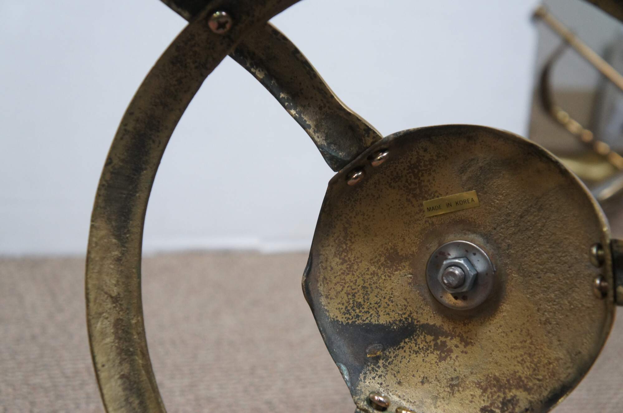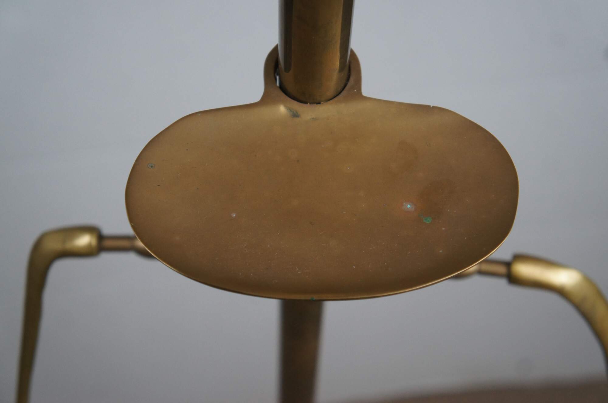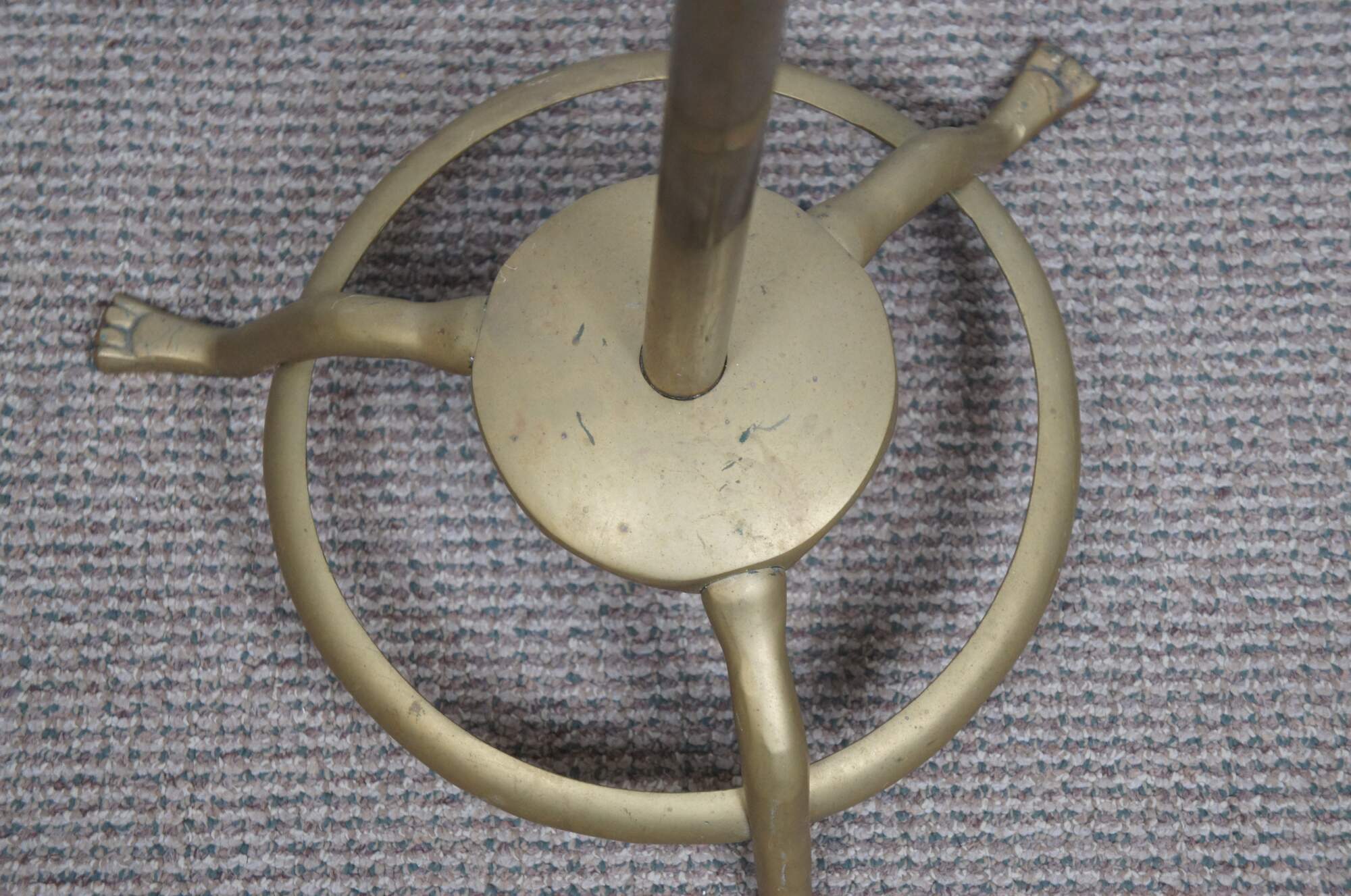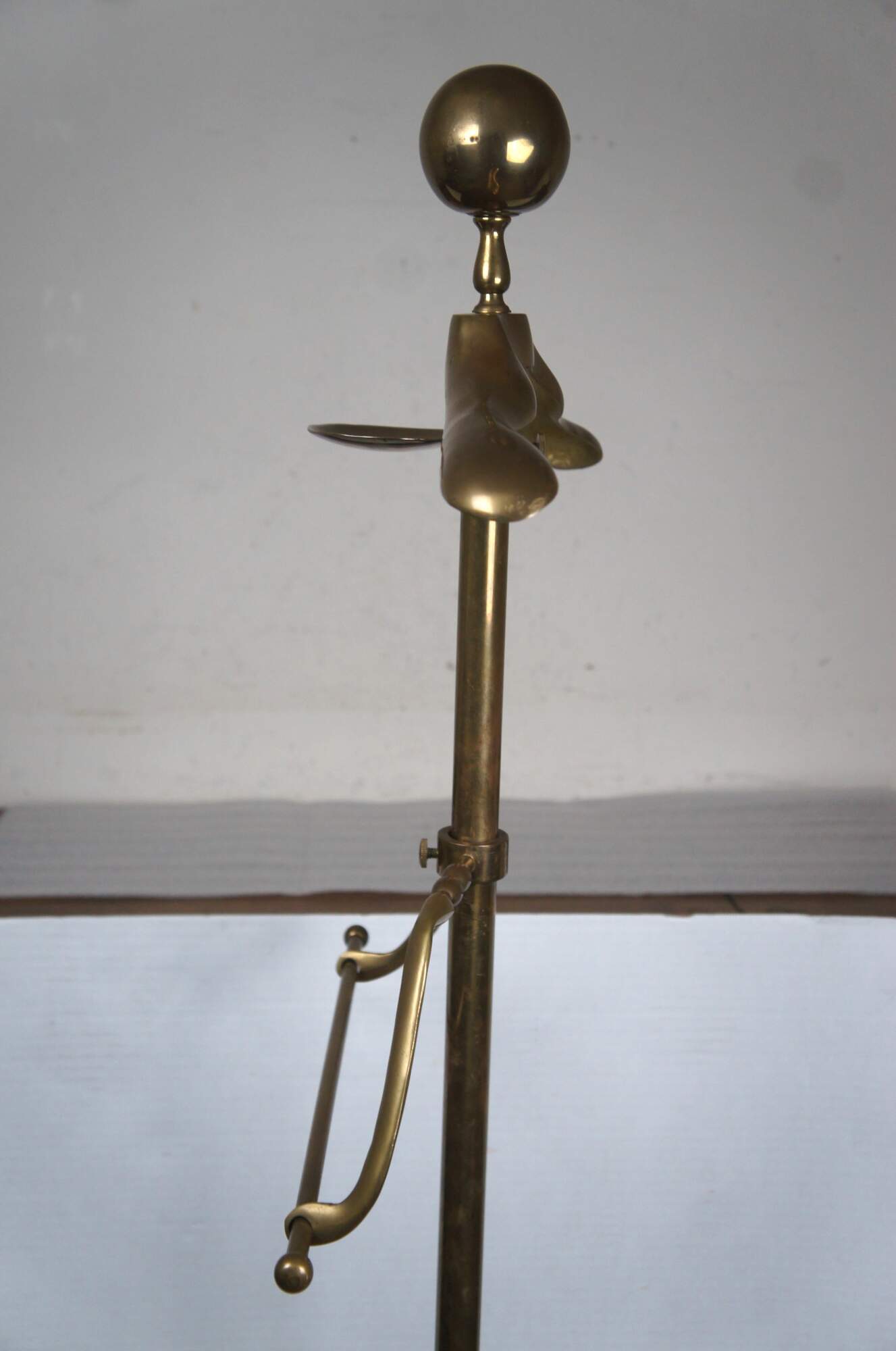 Late mid century brass gentlemen's valet / butler featuring paw foot tripod base, horizontal bar for pants, hangar shaped top for shirt/jacket, tray for accessories such as cuff links and tie bars, and cannonball finial on top. Height of hanging rod and accessory tray adjustable. Made in Korea.