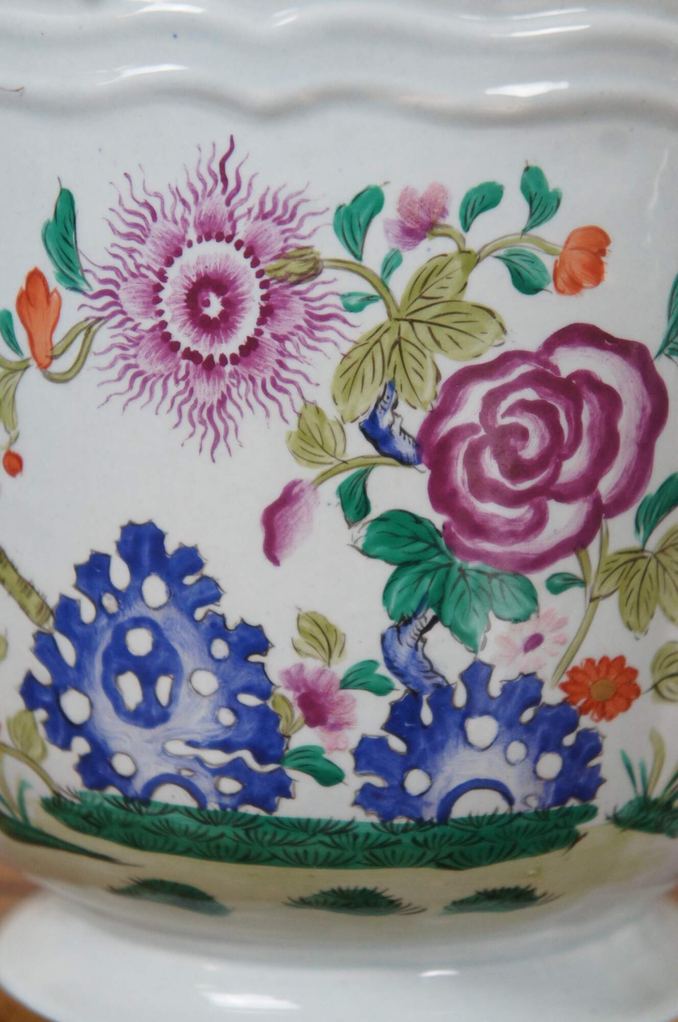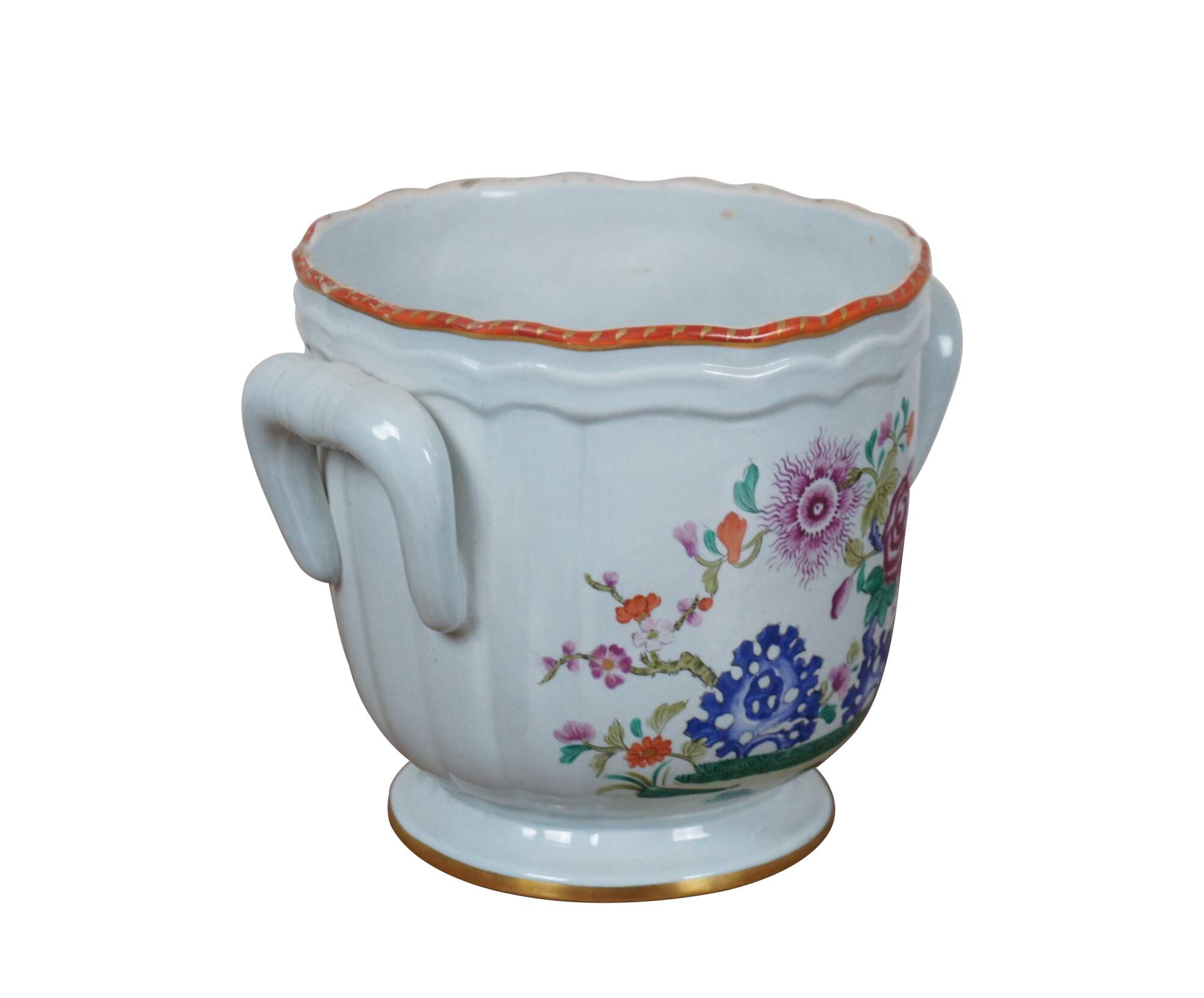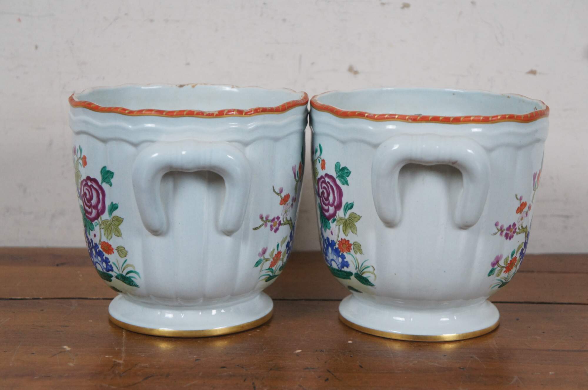 Mid to late 20th century pair of Lowestoft reproduction planters / cachepots, produced by Mottahedeh. Features orange and gold scalloped rim, double handles and Chinese Export style floral design.