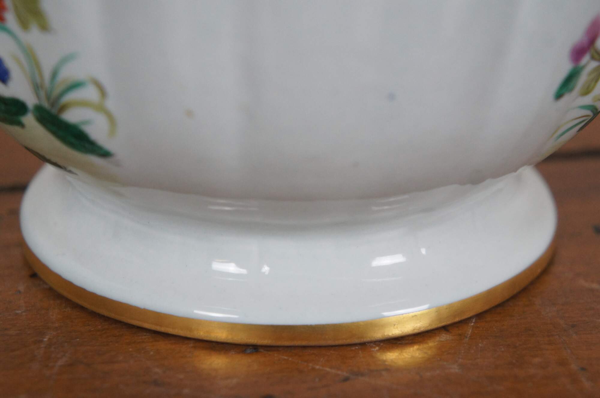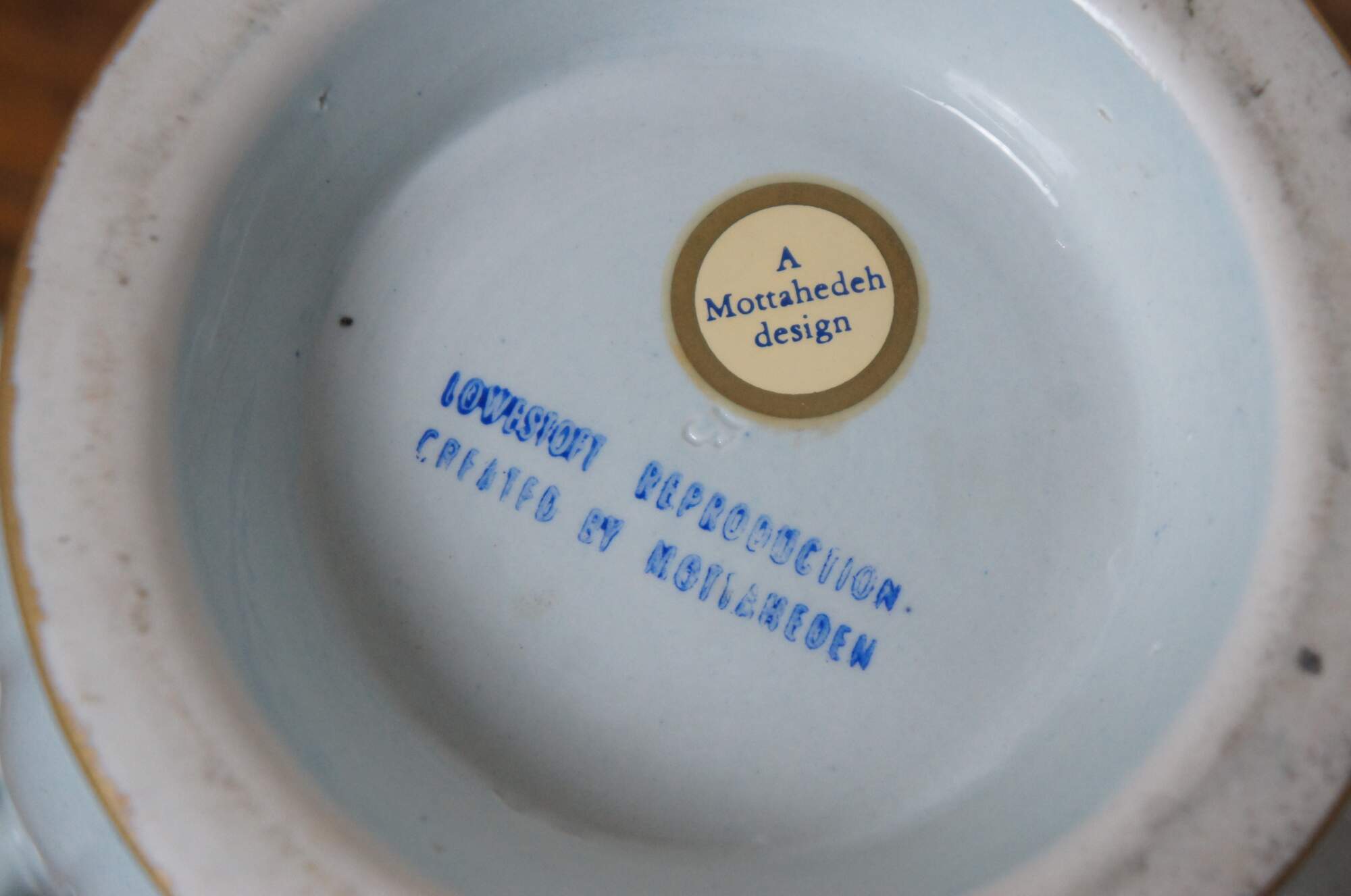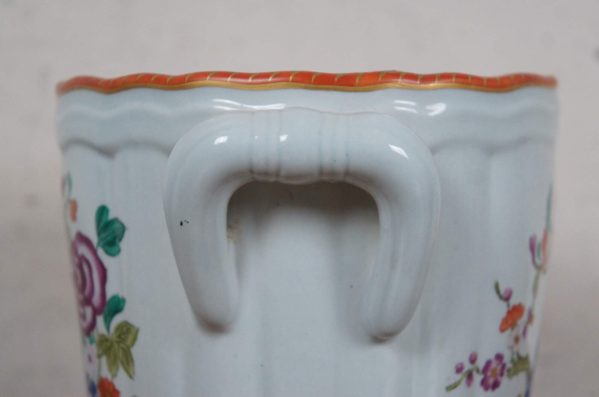 Mid to late 20th century pair of Lowestoft reproduction planters / cachepots, produced by Mottahedeh. Features orange and gold scalloped rim, double handles and Chinese Export style floral design.