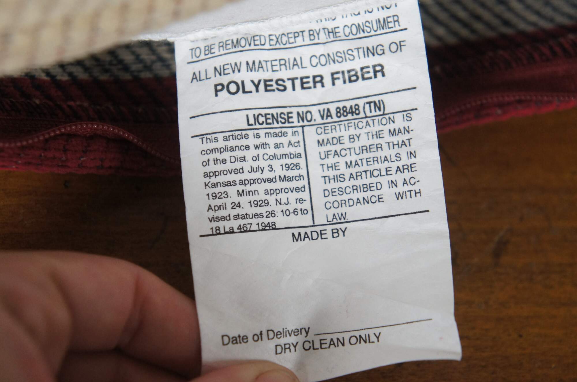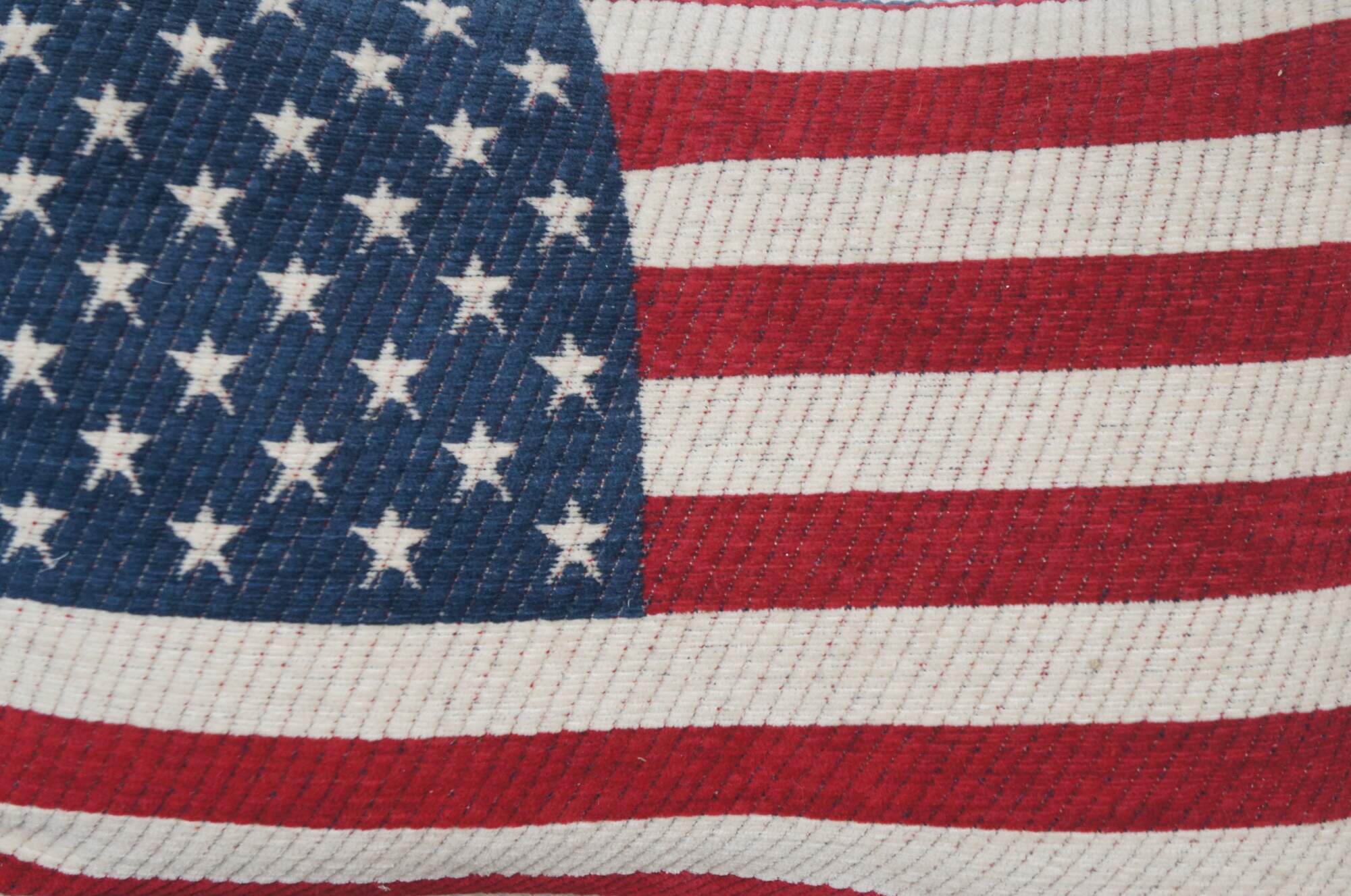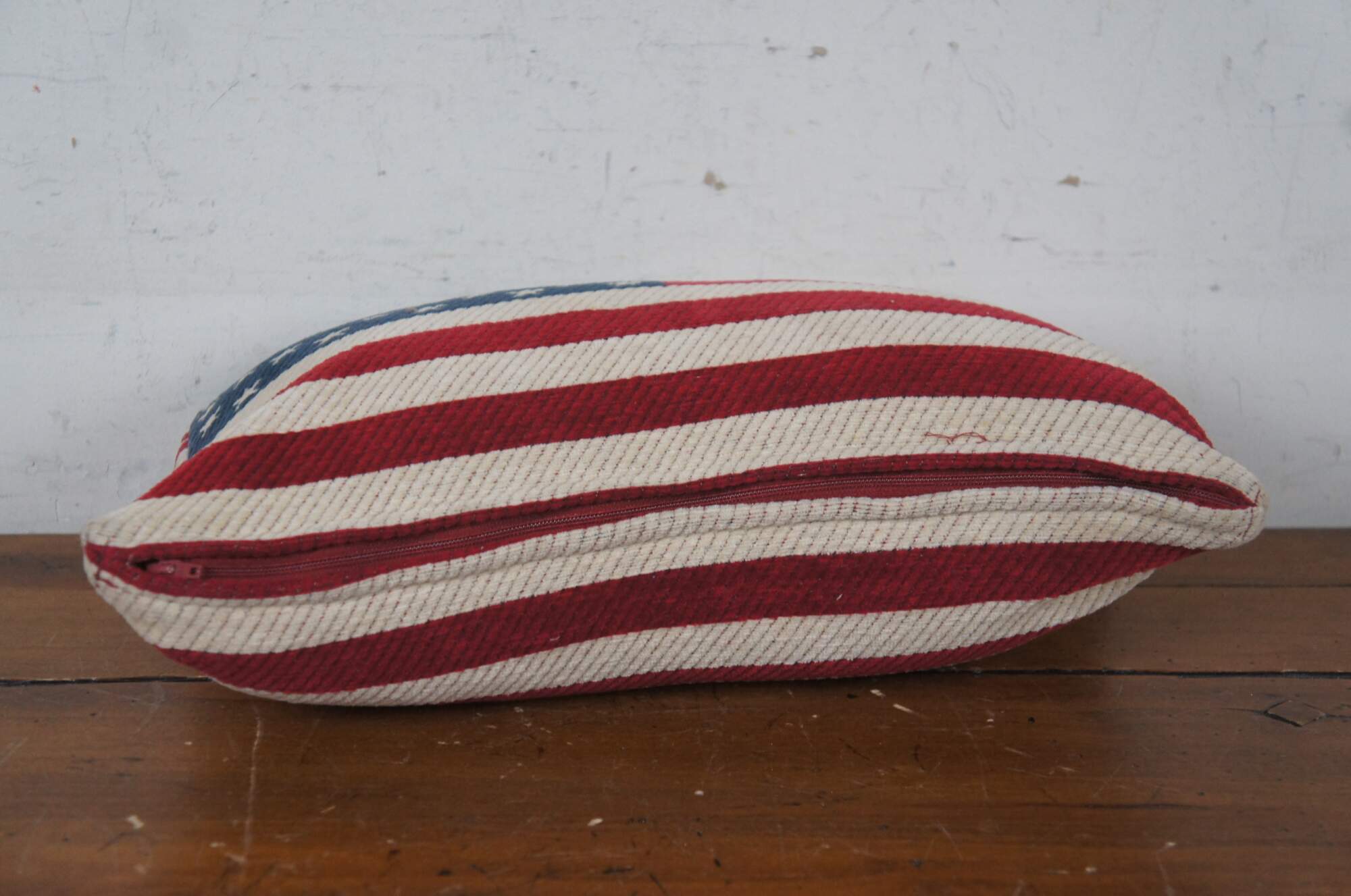 20th century rectangular lumbar / throw pillow in thick ribbed corduroy, printed with the pattern of the American flag. Zipper closure. Fiber filled.