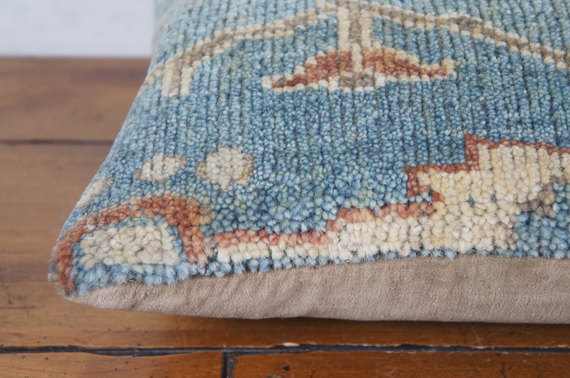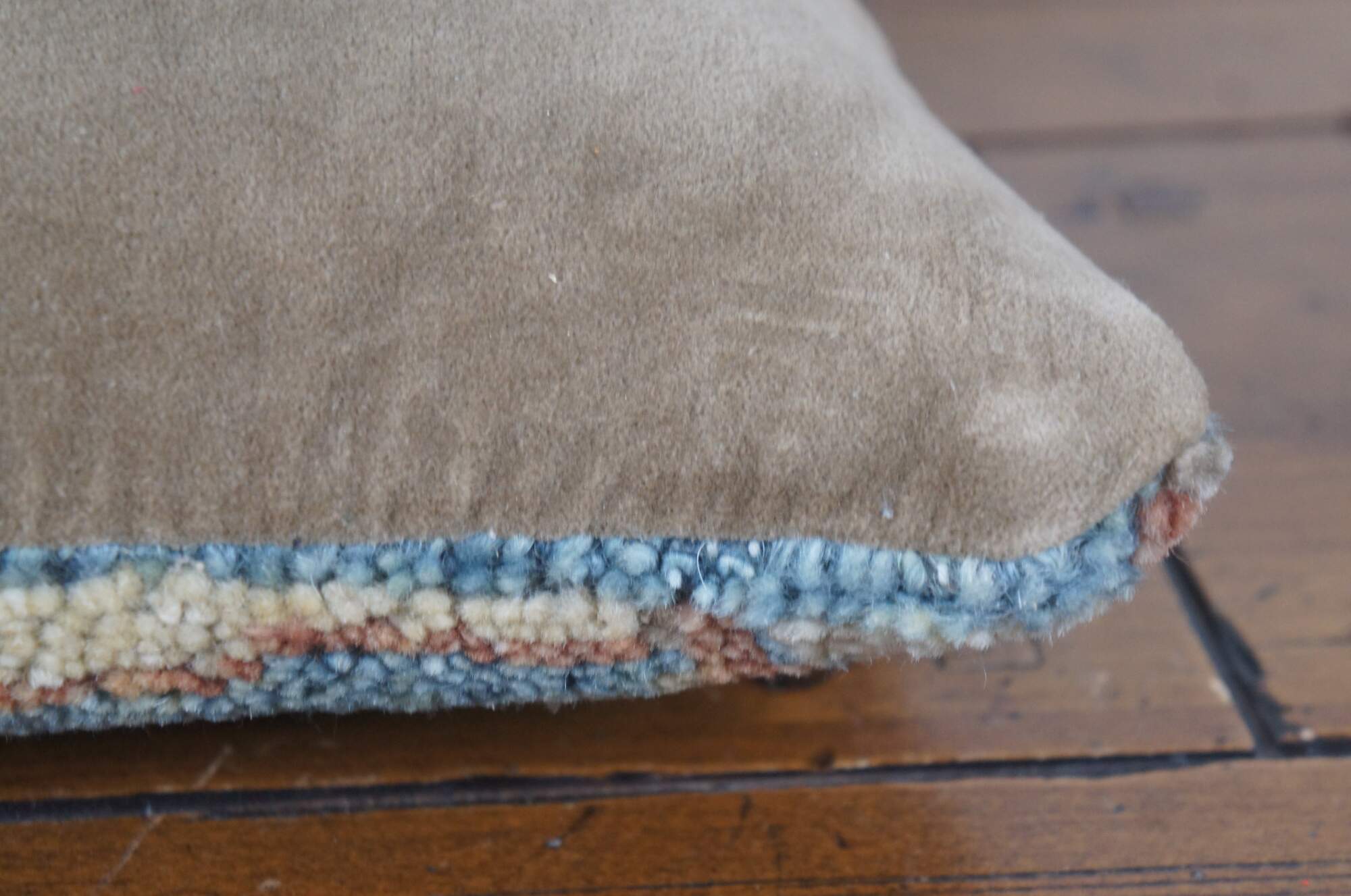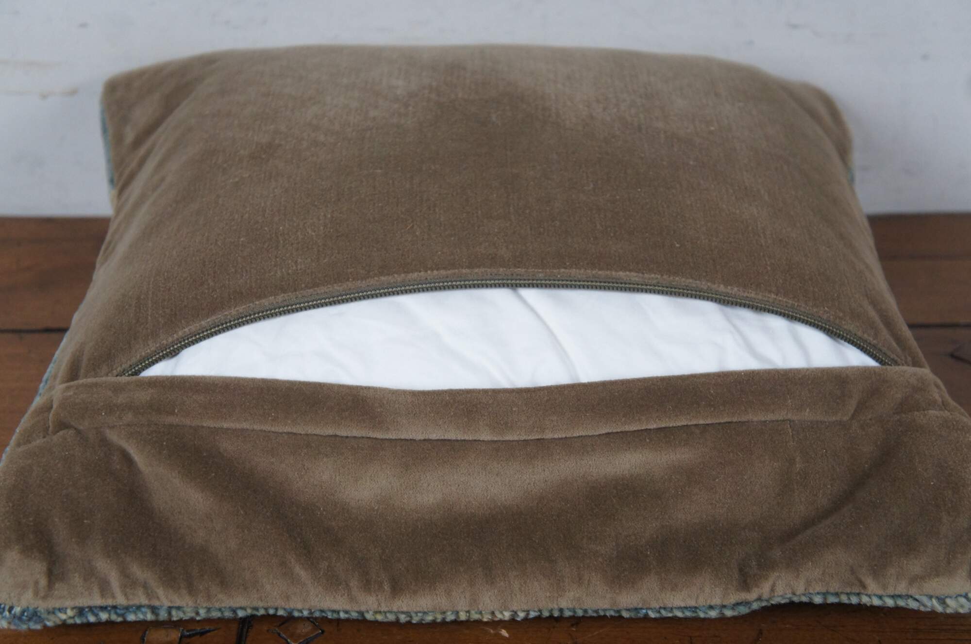Late 20th century square throw pillow by Pottery Barn, featuring a wool and cotton carpet inspired floral design in brown and orange on a blue background. Brown cotton velour back with zipper closure. Down filled. Made in India.