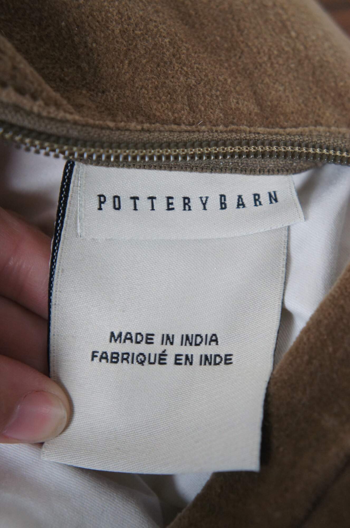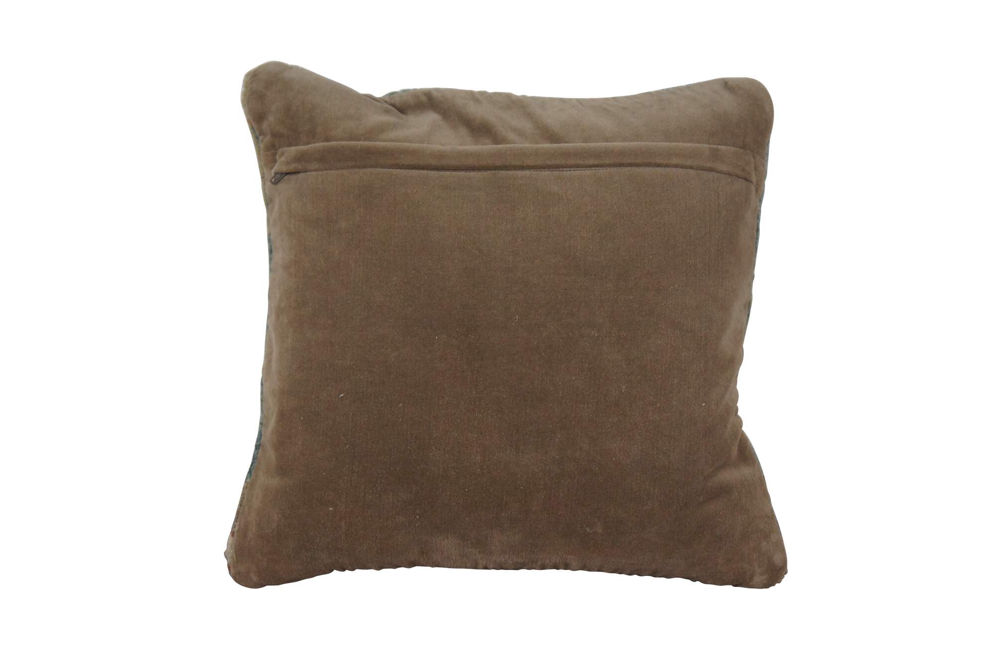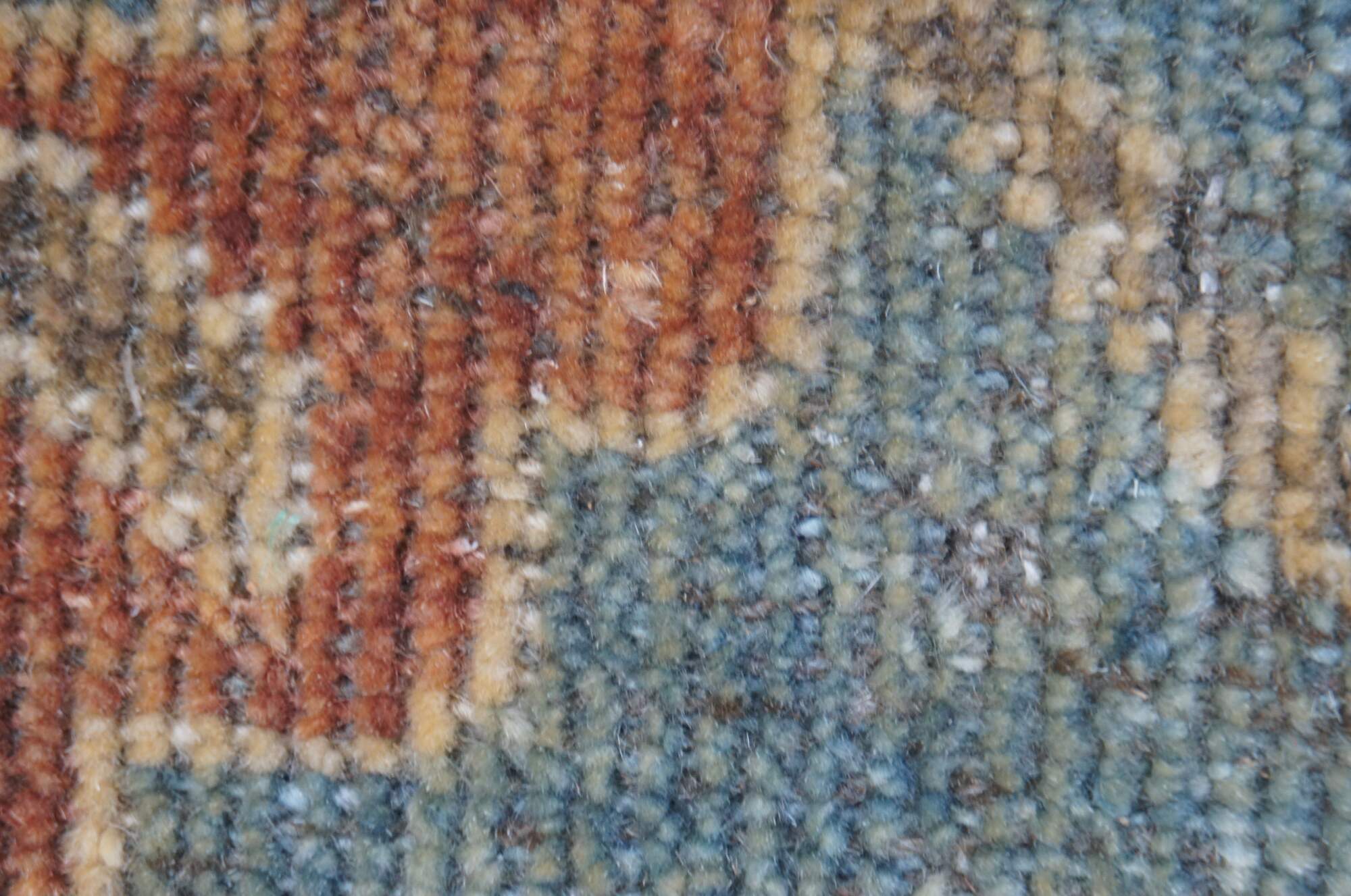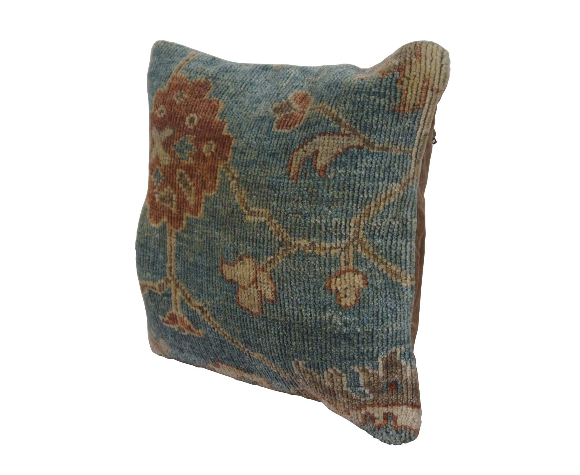 Late 20th century square throw pillow by Pottery Barn, featuring a wool and cotton carpet inspired floral design in brown and orange on a blue background. Brown cotton velour back with zipper closure. Down filled. Made in India.