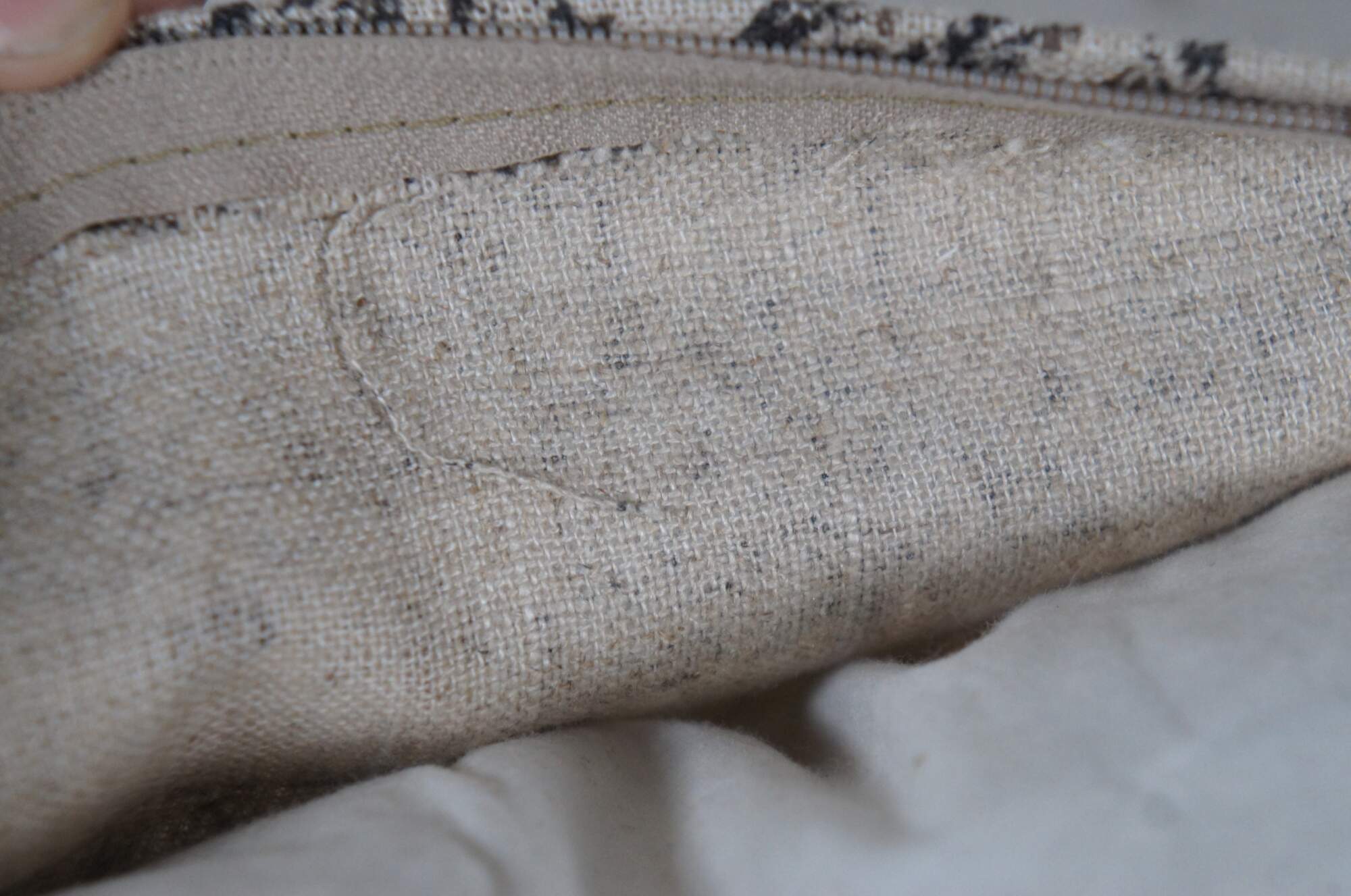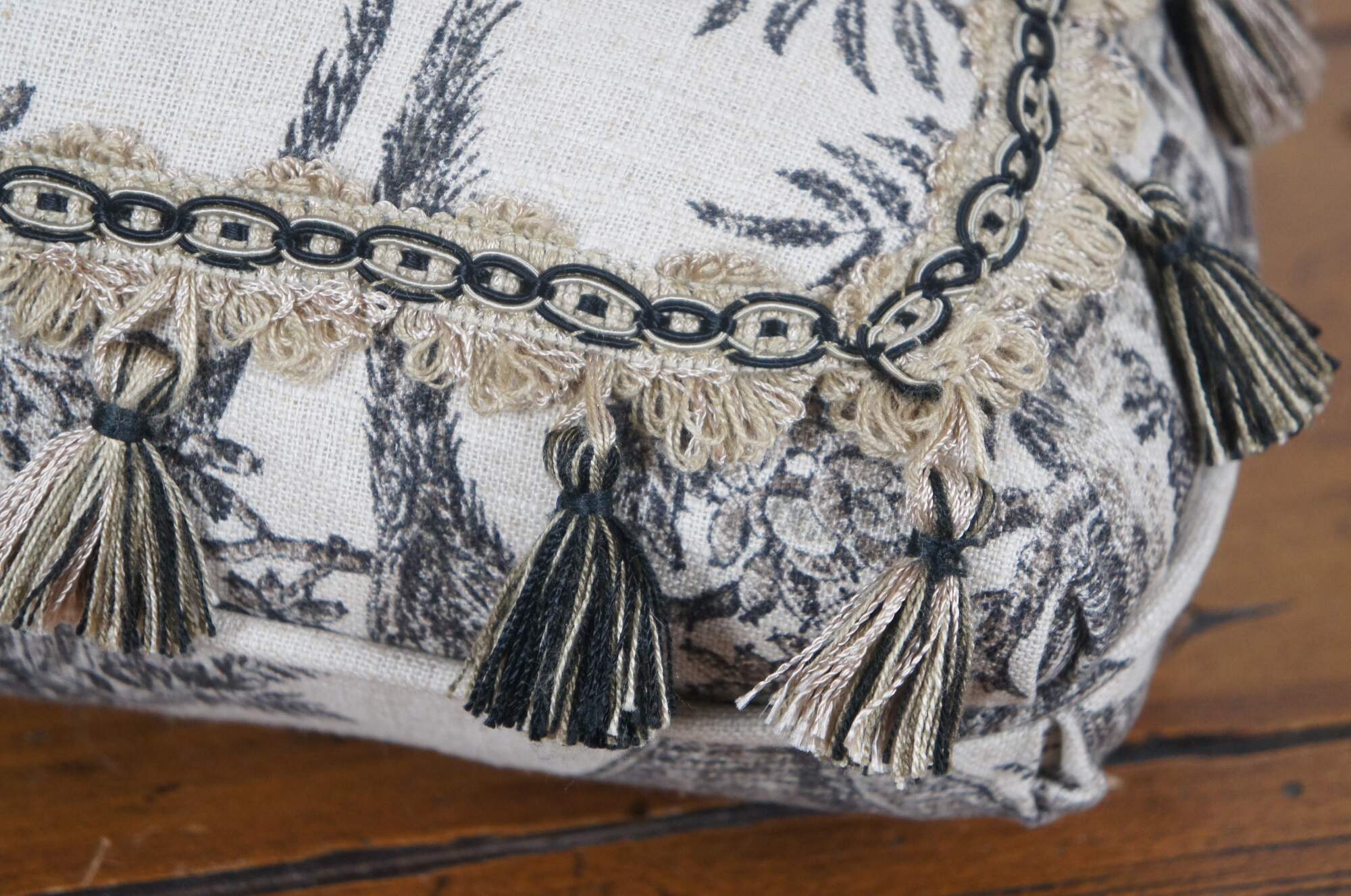 Late 20th century rectangular lumbar / throw pillow, featuring a black and white Chinoiserie toile style print on linen of a garden landscape with pagoda and geisha figures, bordered with cream and black braided trim and tassels. Zipper closure. Down filled.