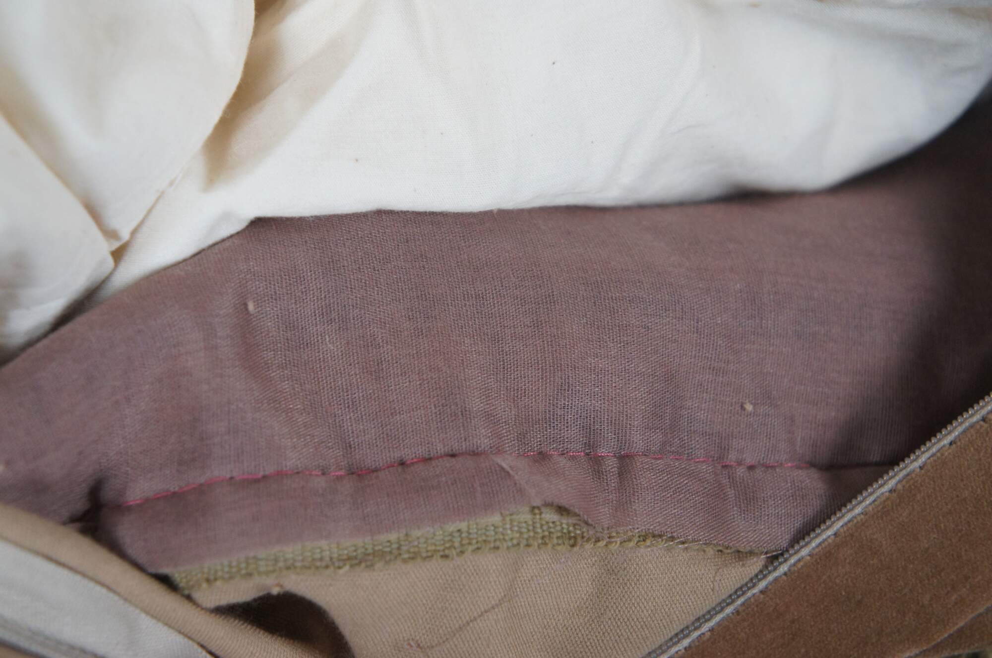 20th century square throw pillow, embroidered with blue flowers and pink roses on leafy stems, surrounding a golden bar tied with a blue ribbon / bow, all on a deep navy blue background. Olive green and gold tassel trim. Brown velour back with zipper closure. Down filled.